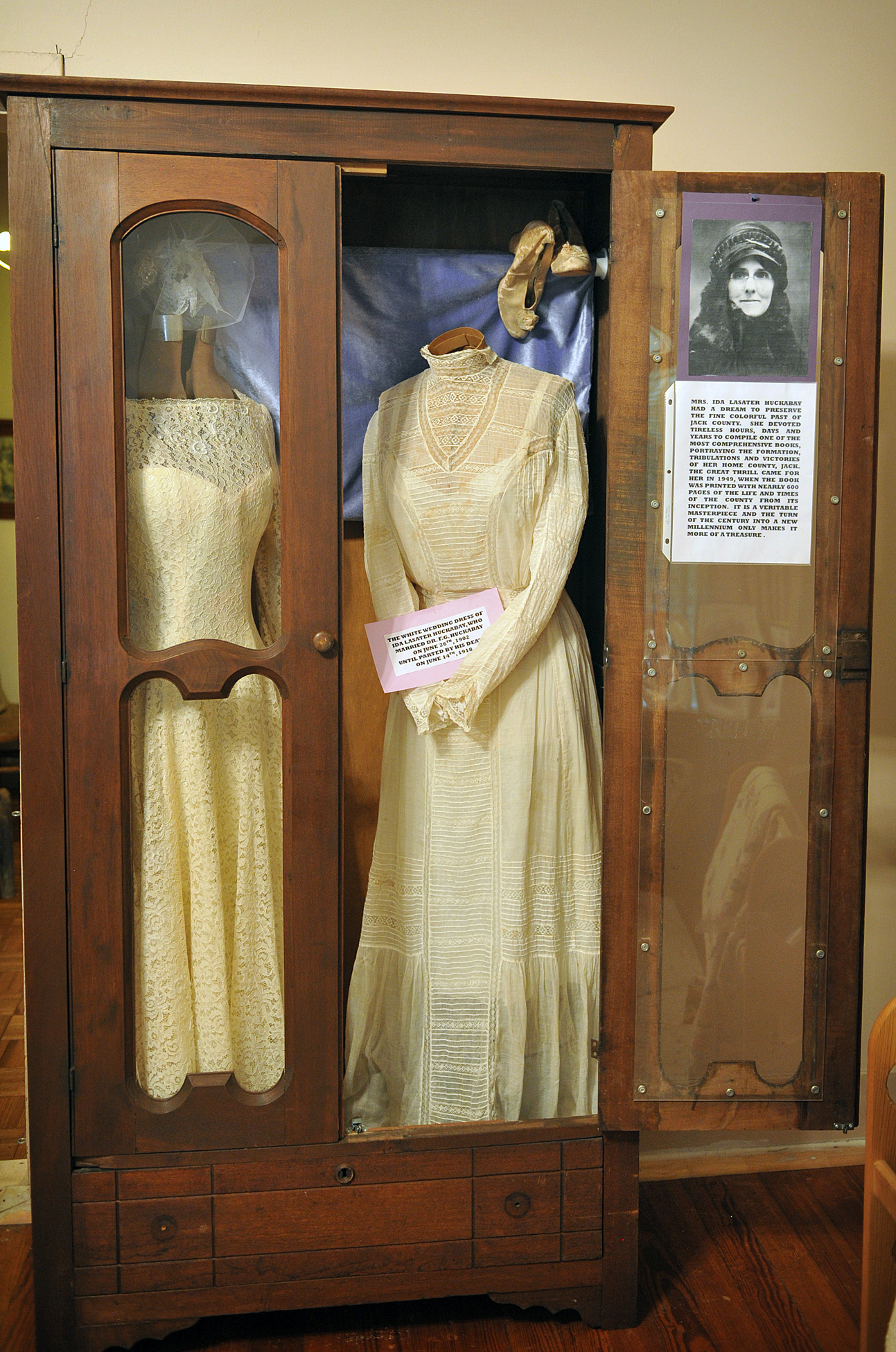 Another famous Jack County native with a dedicated display is Ida Lasater Huckabay. She would go on to become a noted local historian and wrote a 600-page book that chronicles the origins and development of Jack County. Her wedding dress from June 1902, when she married Dr. F.G. Huckabay, was donated to the museum.