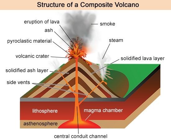 Composite volcanoes are very explosive when they erupt. Because these volcanoes can be about 10 miles wide and thousands of feet high, the ash they spray out can cover huge areas of air and land.