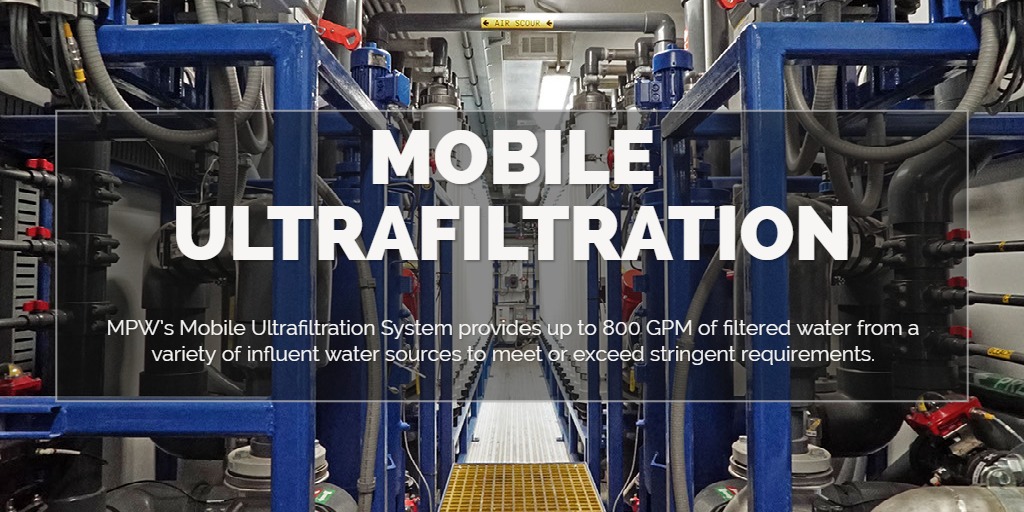 Each trailer-enclosed system is capable of delivering 800 GPM of filtered water from a variety of influent water sources. MPW’s UF System comes fully automated with continuous monitoring instrumentation to ensure optimal operation. MPW’s field service technicians assist with site evaluation, set-up, commissioning and operation.