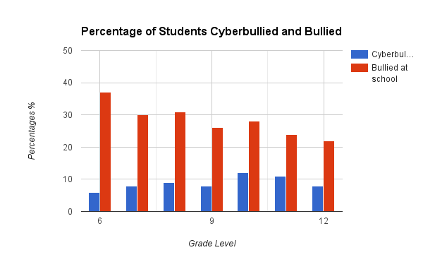 The graph above shows the results for the percentage of students who were either bullied and what grade they were in and the percentage of students who were cyberbullied and what grade level they were in. Looking at the graph, you can see that the blue bars are for the students who were cyberbullied and the red bars indicate the students who were bullied at school. The percentages of students who were cyberbullied are within a very small range with the highest bar only going to 12% while the percentages for the students who were bullied at school were much higher with the highest bar going to 38%.