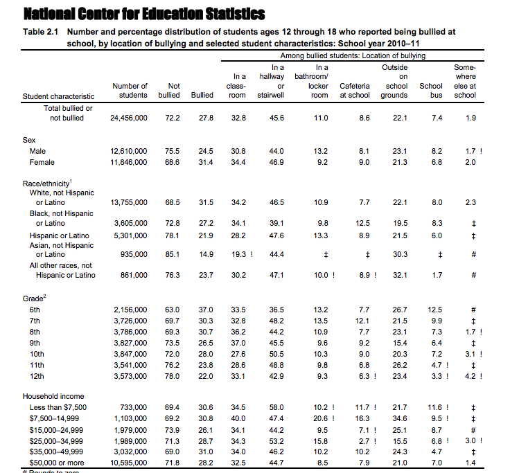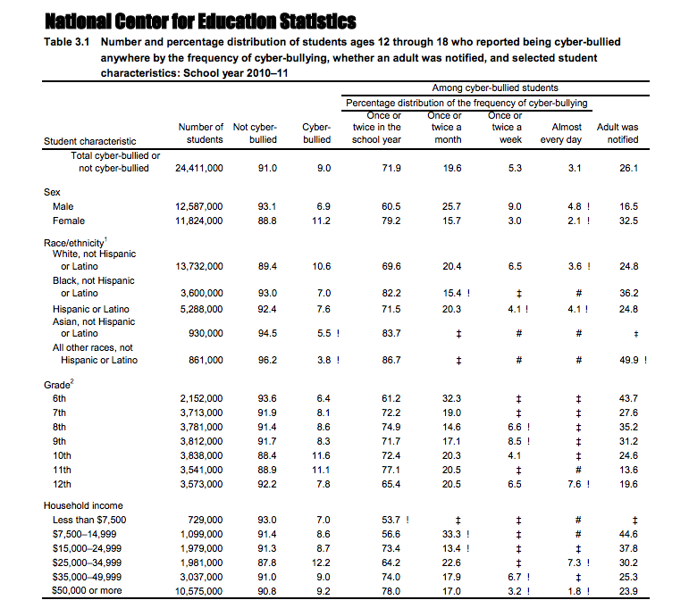 The National Crime Victimization survey (NVCS) was conducted to get data to see the extent to which students with different personal characteristics report cyberbullying and bullying. The estimates included responses by student characteristics like gender, race/ethnicity, grade, and also household income. Not only that, but school characteristics were also included like public or private schools, level, enrollment size, student to teacher ratio, percentages of combined races and ethnicities; and last but not least, the percentage of students who were eligible for free or reduced-priced lunch. The data was showing the relationship between bullying and cyberbullying victimization as well as other crime-related variable like the reported presence of guns, gangs, drugs, and alcohol at school. A few other things included were the selected school security measures, fighting, and weapon carrying to school. In this report, the data has been taken to find out if bullying or cyberbullying has anything to do with what grade level a student is in from grades 6-12.