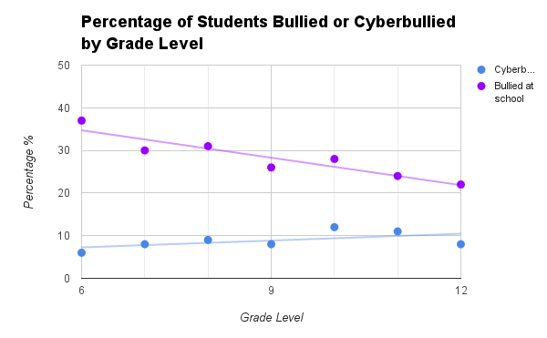 The blue line for cyberbullying indicates that there is a slight positive correlation because after calculations, the correlation coefficient (r) was 0.56857353268418 and since the line of best fit is directed or going upwards, it has a positive slope. The strength for this piece of data is slight because in order for it to be strong, (r) has to be close to positive one. All of this basically means that there is a slight positive relationship between the X (grade levels) and Y (Percentages) variables. As for the purple line for the students bullied at school, you can tell there is a strong negative correlation because the correlation coefficient (r) was -0.9276 which is very close to one and because the line of best fit is directed downwards, there is a negative slope.
