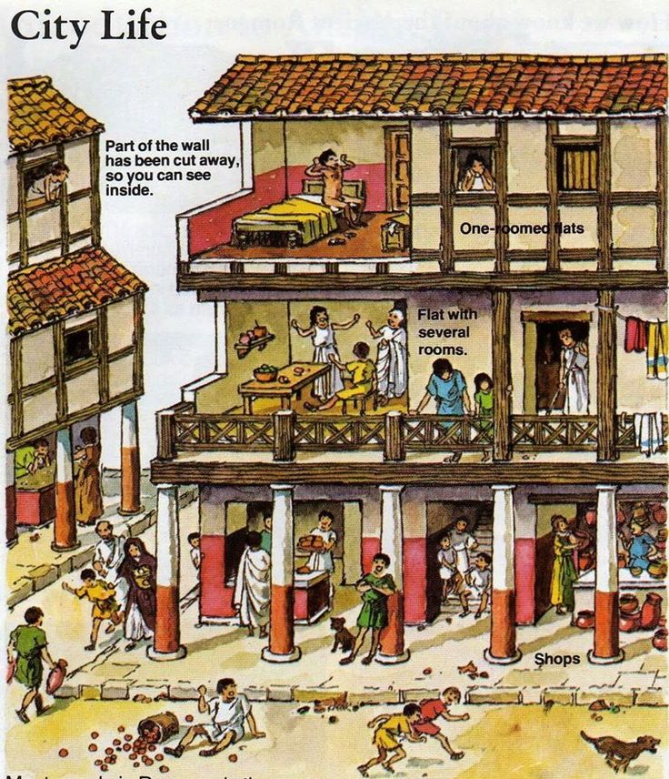 Look closely at the design of these insula. The ground floor is shops. Above the shops, the first, second, third and fourth floors have the tiny one or two-room flats. Many of our newest appartment blocks also have shops on the ground floor. All the floors above the ground floor have the flats although they are somewhat larger than a poor man's Roman flat. Sometimes our apartment blocks have condos above the shops.