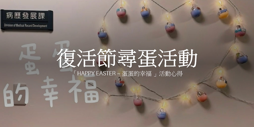 病歷發展課:病歷發展課第一次參加院內舉辦的尋復活蛋活動,在籌備過程中,大家齊一心志發揮創意與巧思參與活動,感覺很新奇有趣,也深深感受耶穌的愛,期望大家心中有愛、人生無礙。也感謝耶和華我們的主,為我們帶來希望與新生,讓我們拋去不好的過去,迎向美好的未來。