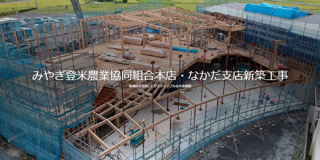 大規模な建物を木造で実現するには、集成材(小さな木材を束ねて大きく長い材料にしたもの)を使うのが一般的ですが、この建物は集成材を使用せず、登米産(一部南三陸産)の杉の製材(丸太から切り出した無垢の木材)のみでつくられています。