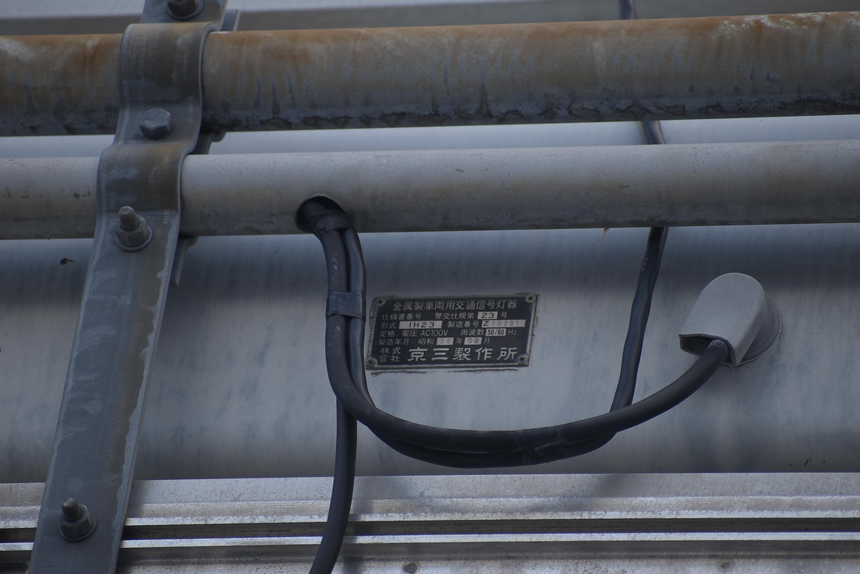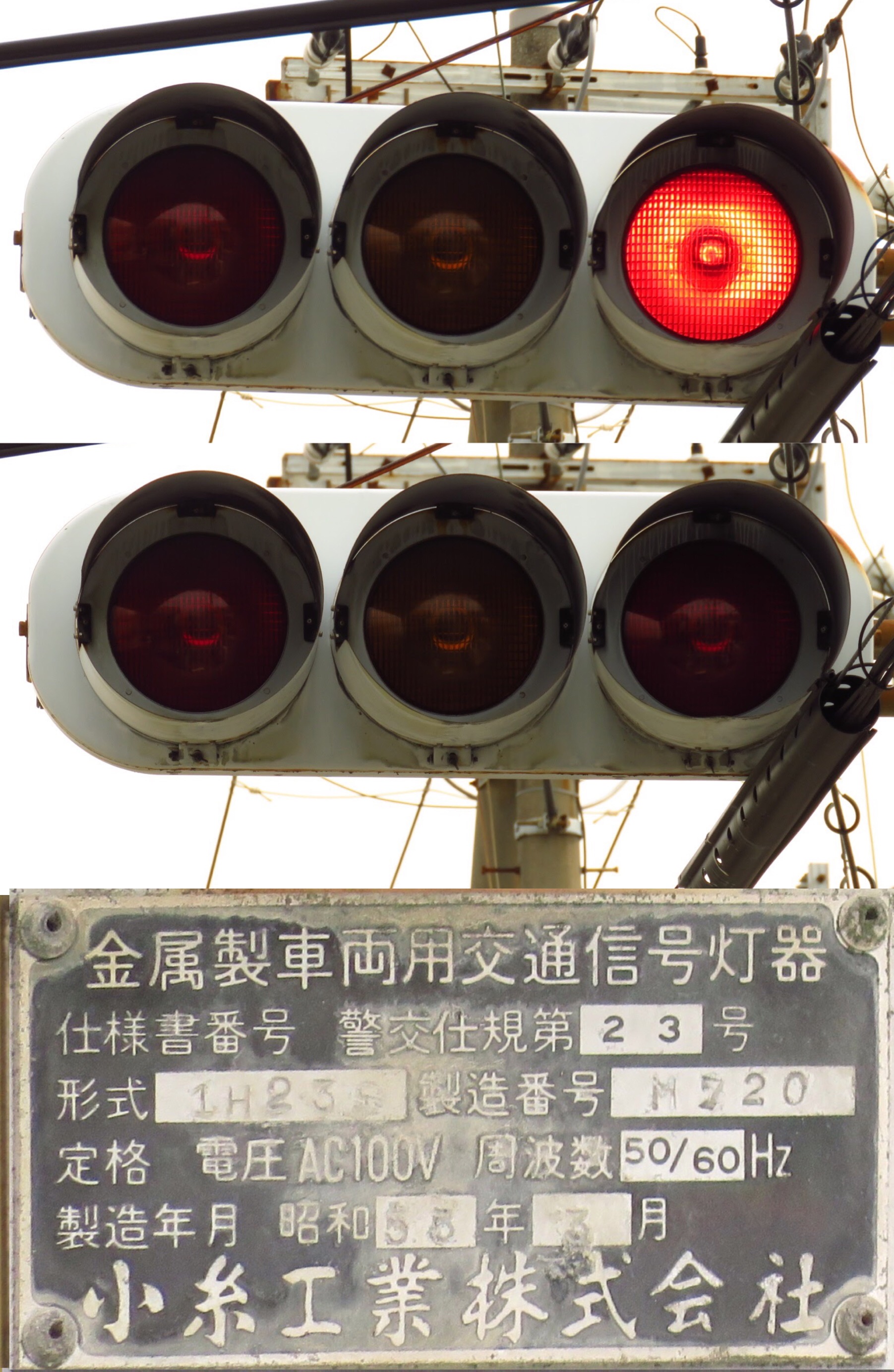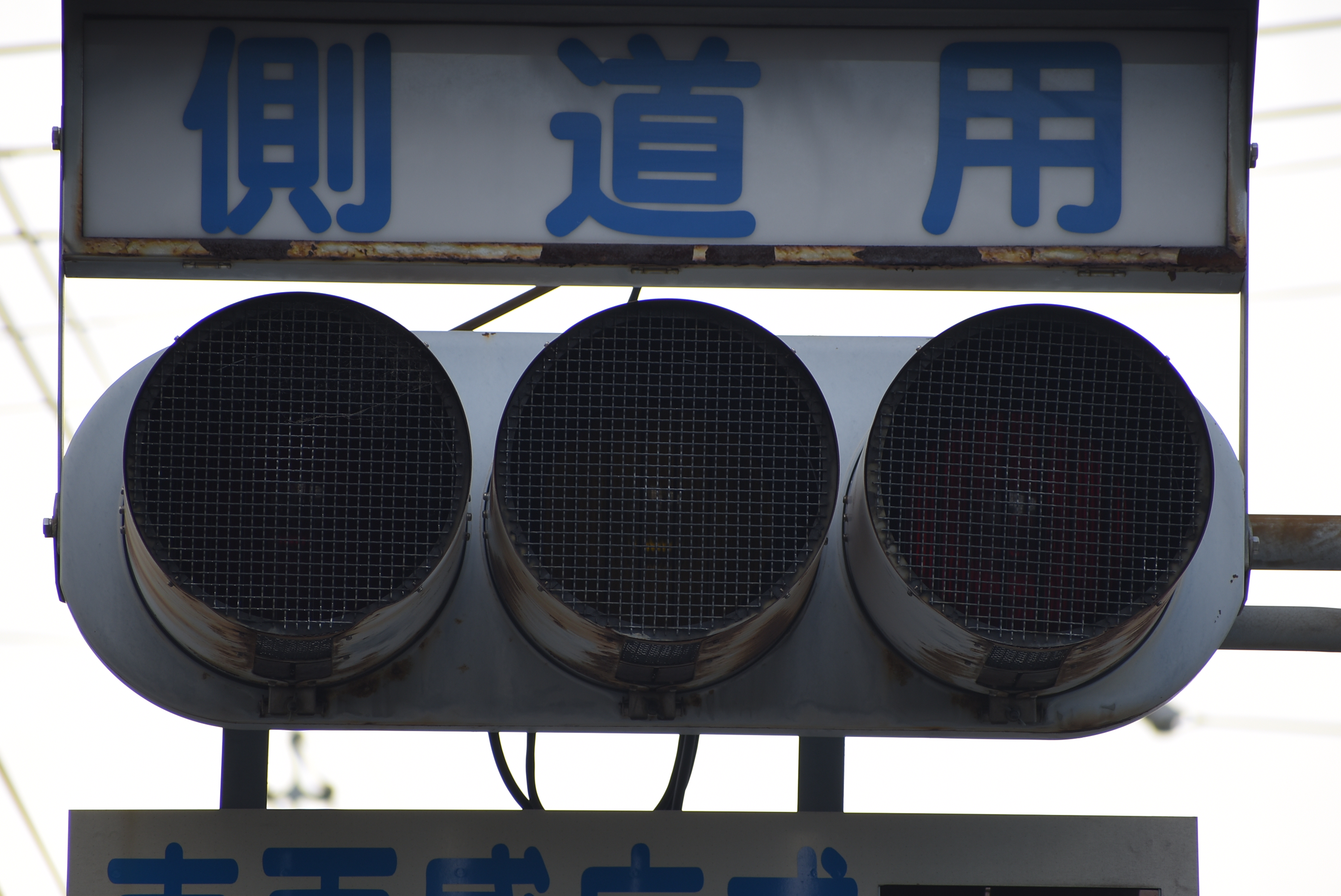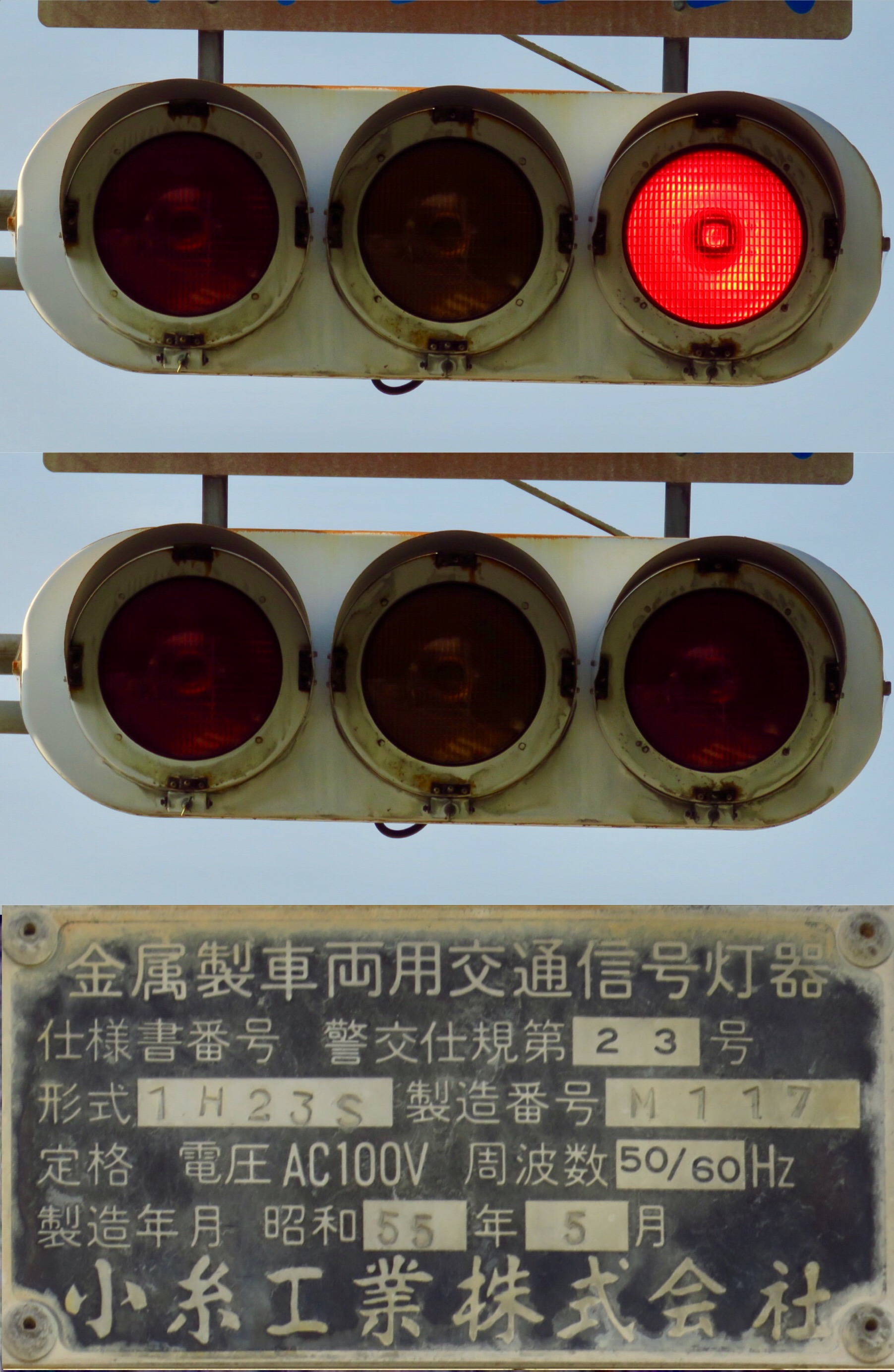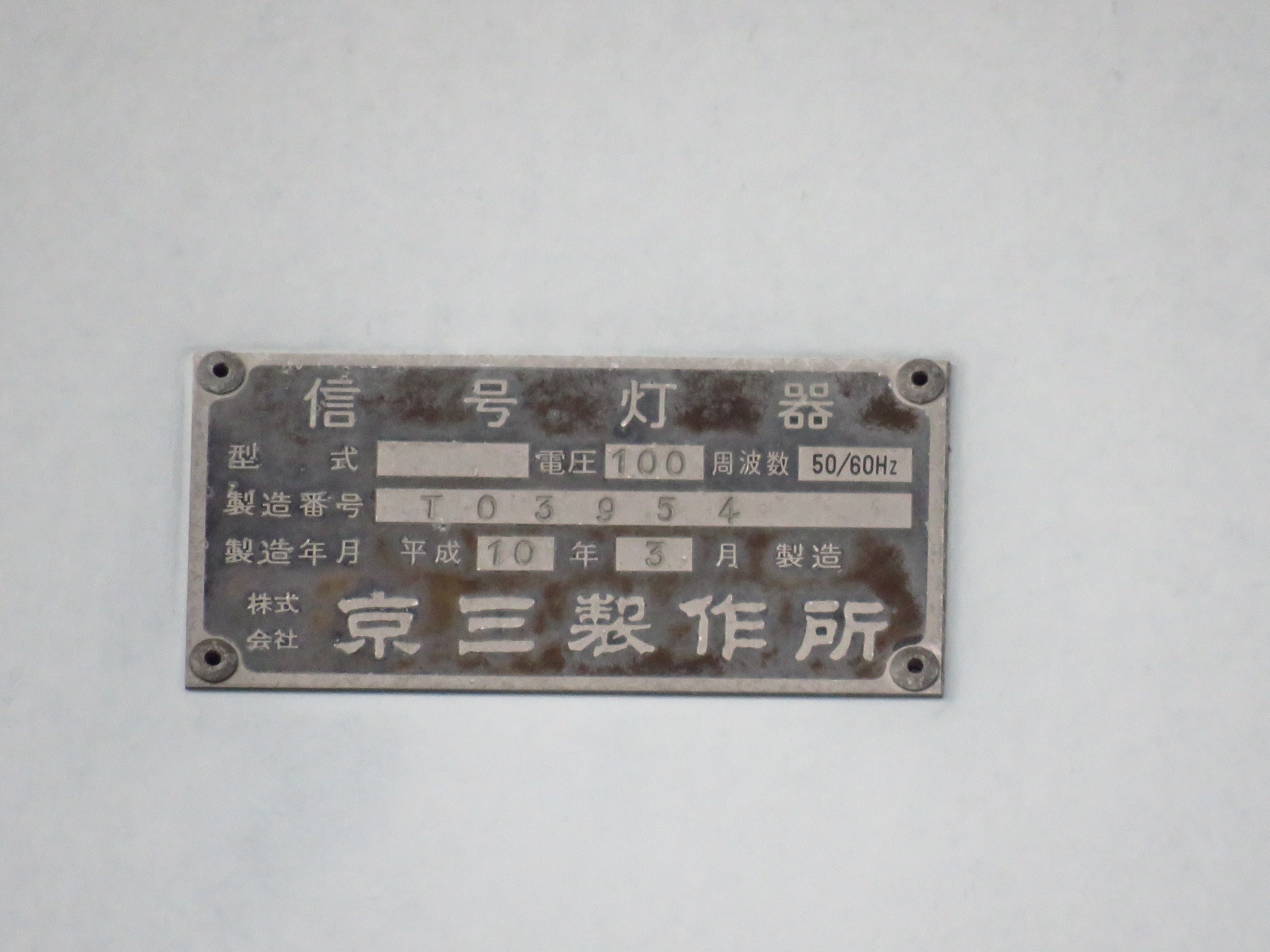 以前までは大阪府全土で見られていた3位灯を使用した「止まれ」灯器ですが、更新が進んでしまい府内ではついにこの一箇所だけになってしまいました。他のものが黄色塗装で「止まれ」表記だったのに対し、こちらはグレー塗装で「止マレ」表記になっています。