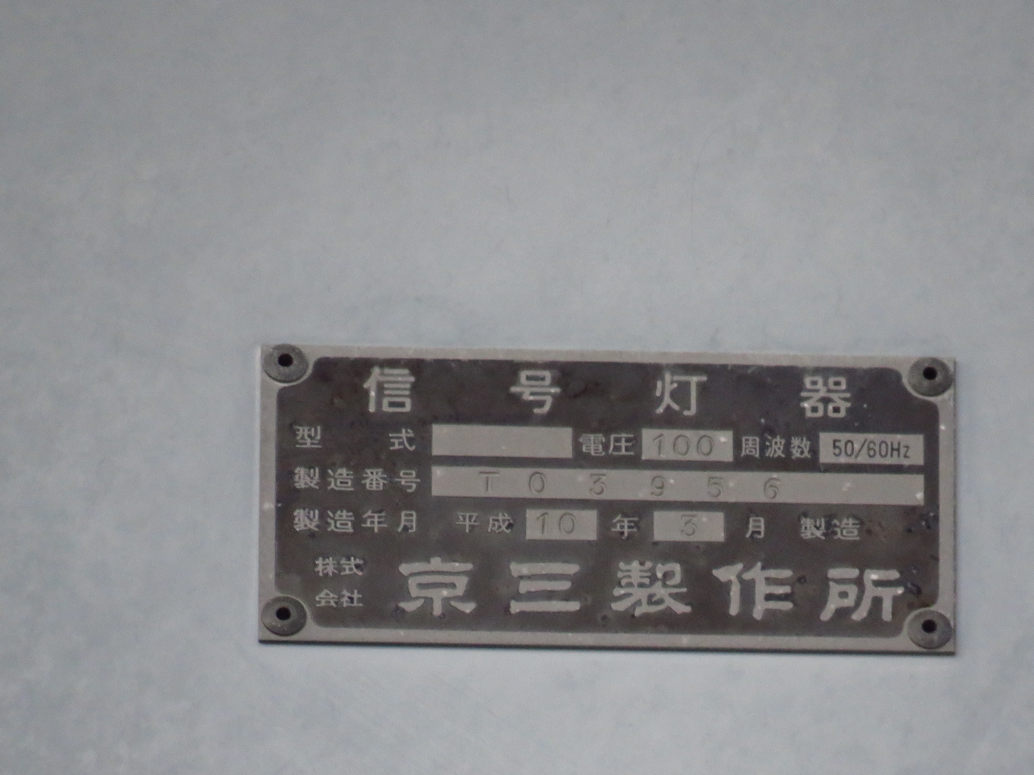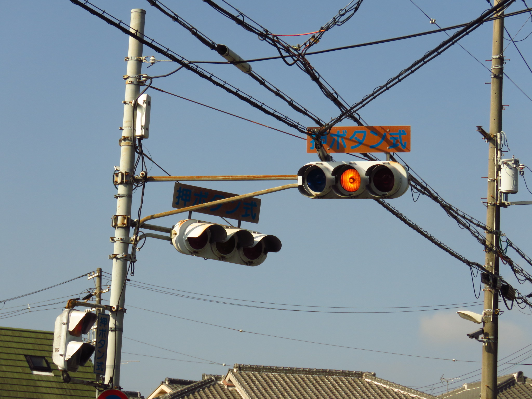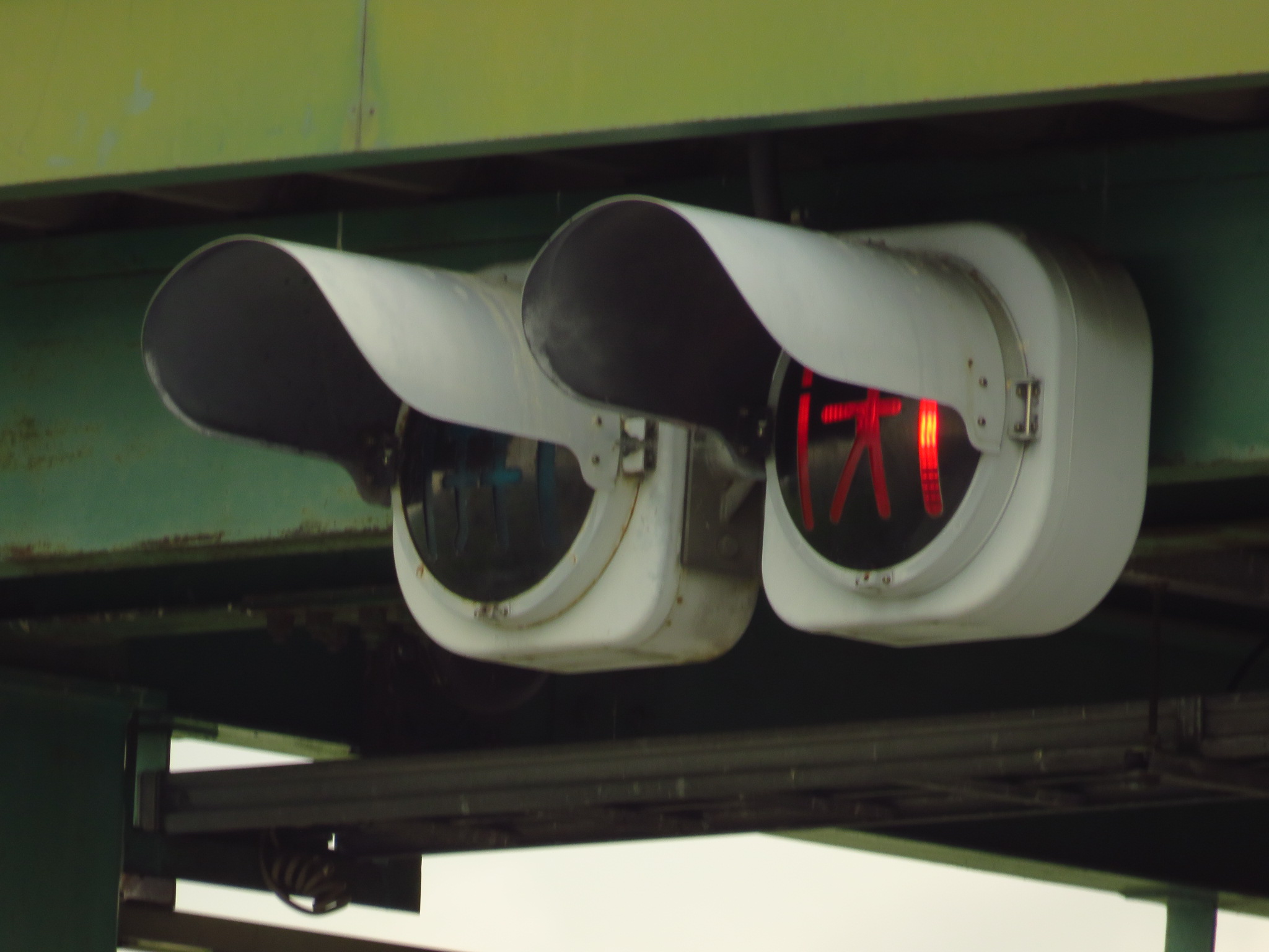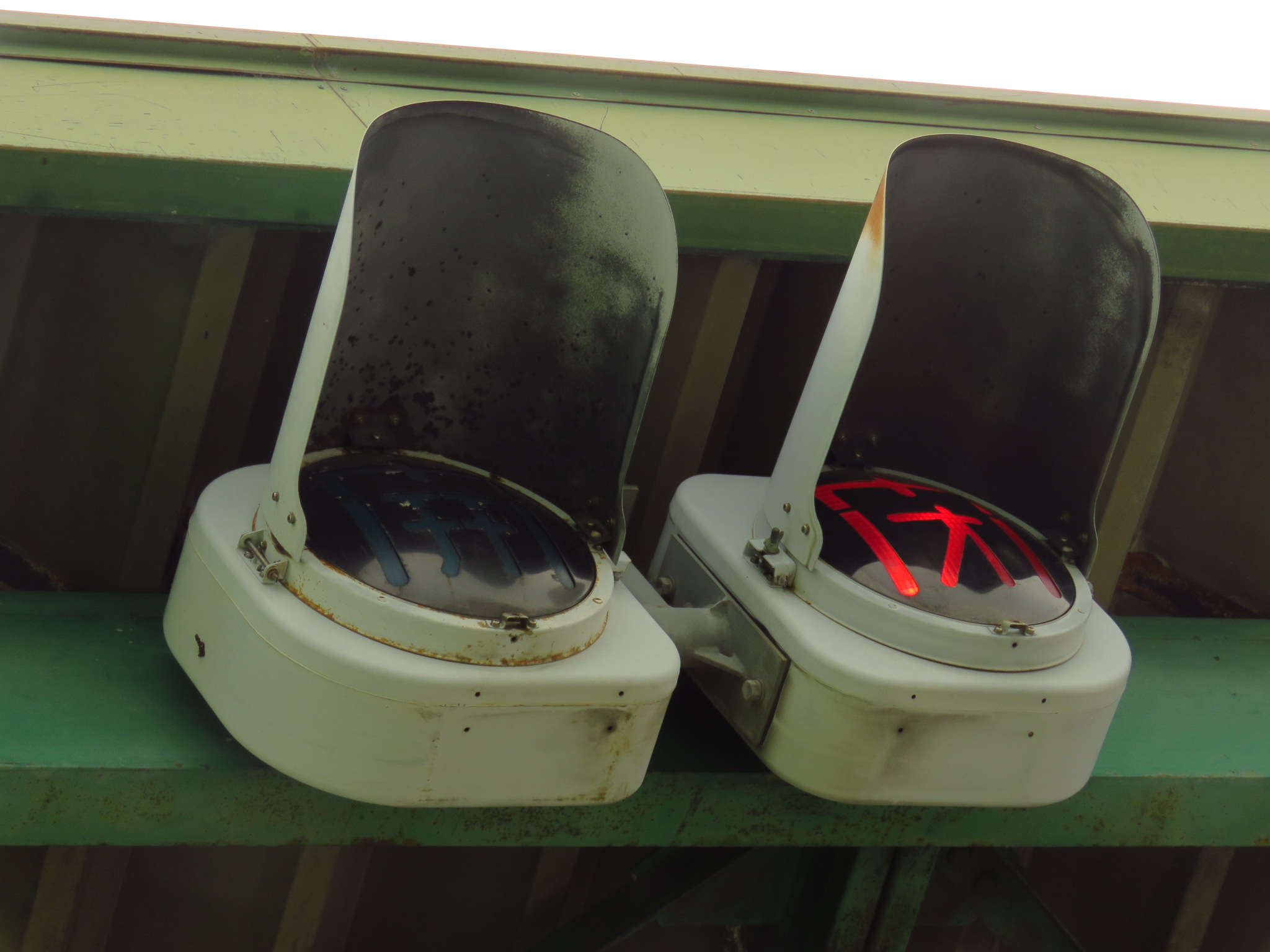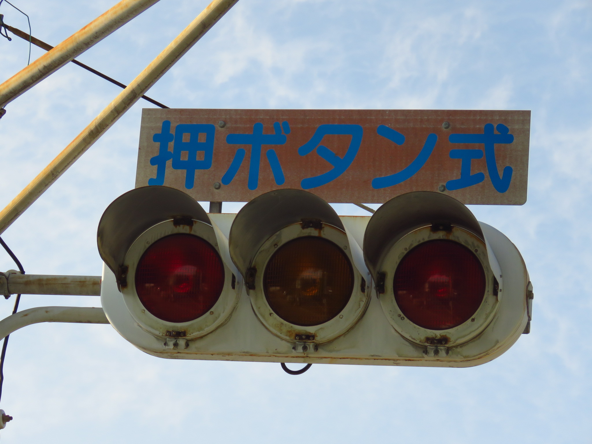 以前までは大阪府全土で見られていた3位灯を使用した「止まれ」灯器ですが、更新が進んでしまい府内ではついにこの一箇所だけになってしまいました。他のものが黄色塗装で「止まれ」表記だったのに対し、こちらはグレー塗装で「止マレ」表記になっています。