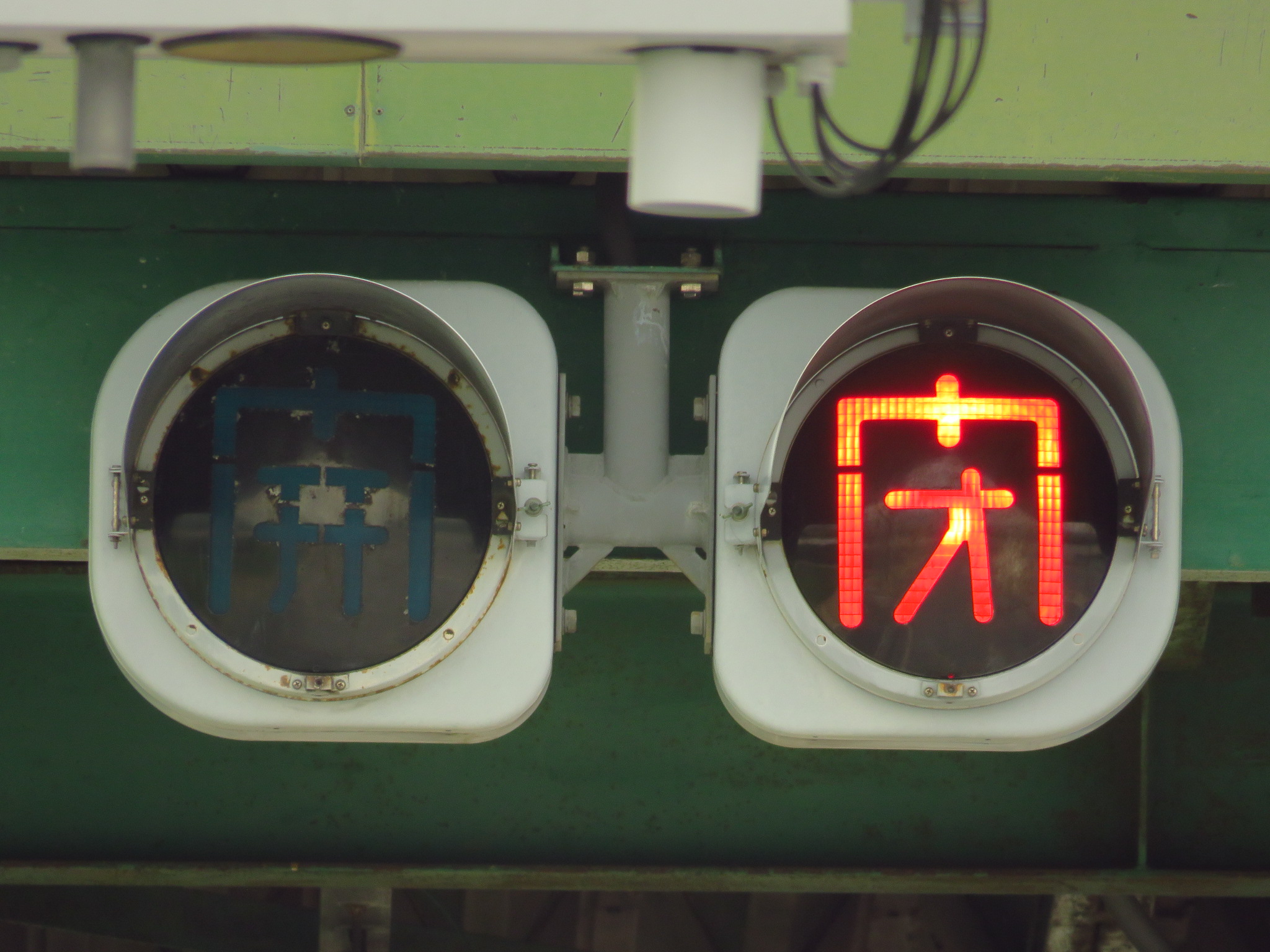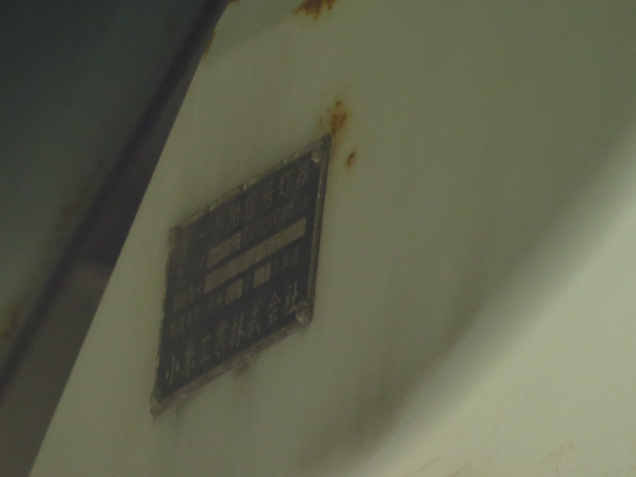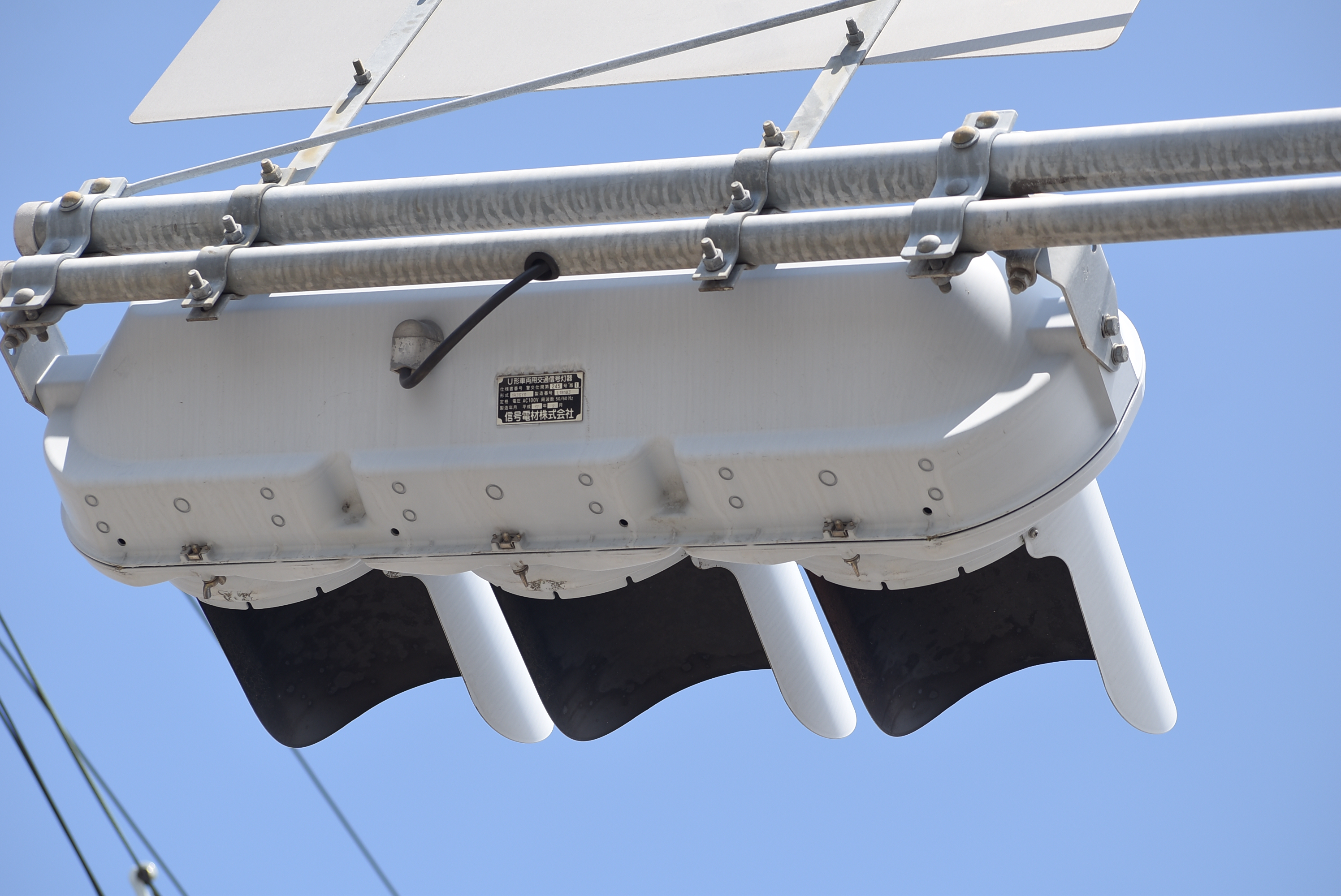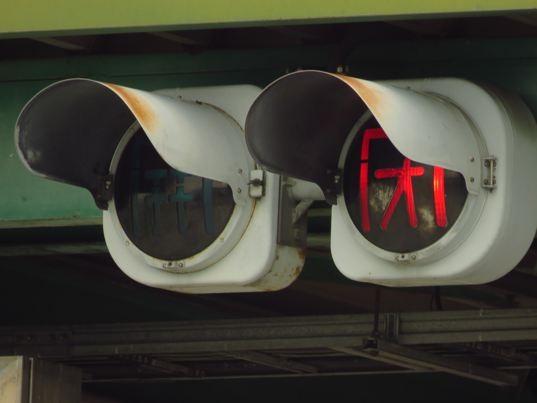以前までは大阪府全土で見られていた3位灯を使用した「止まれ」灯器ですが、更新が進んでしまい府内ではついにこの一箇所だけになってしまいました。他のものが黄色塗装で「止まれ」表記だったのに対し、こちらはグレー塗装で「止マレ」表記になっています。
