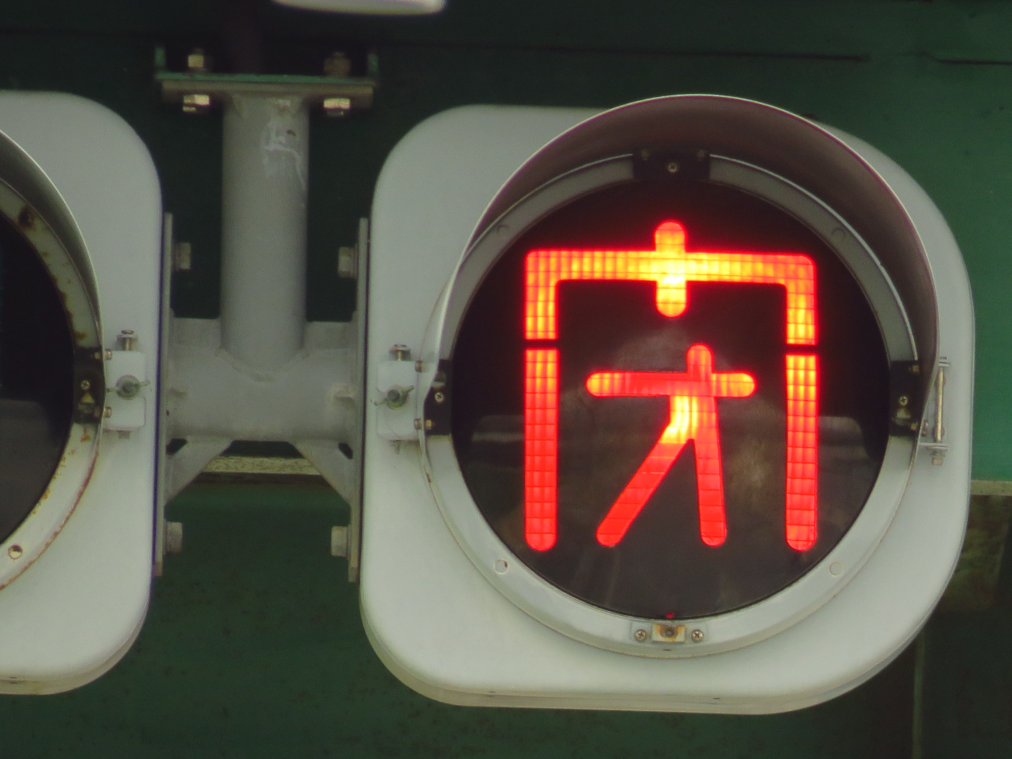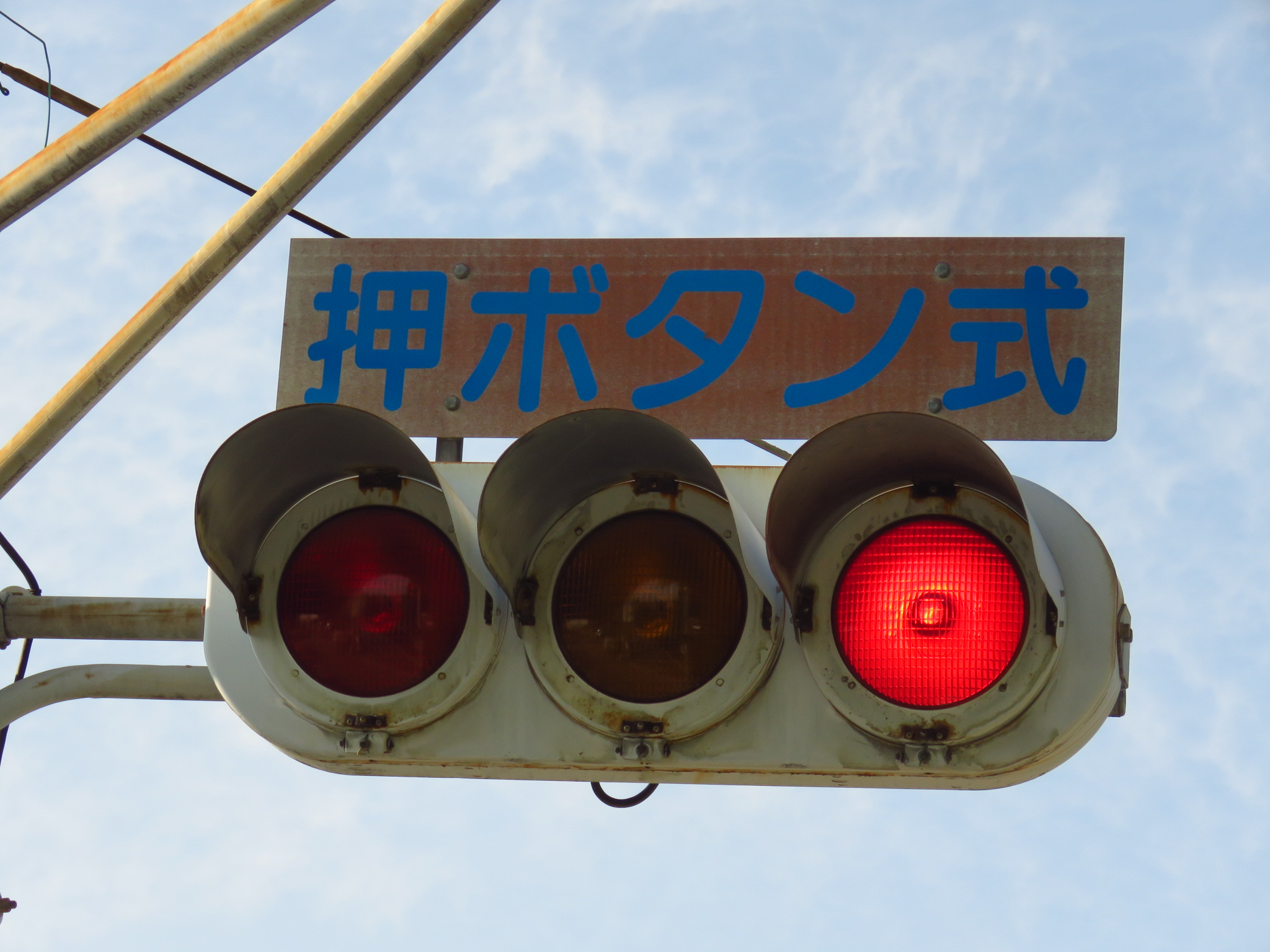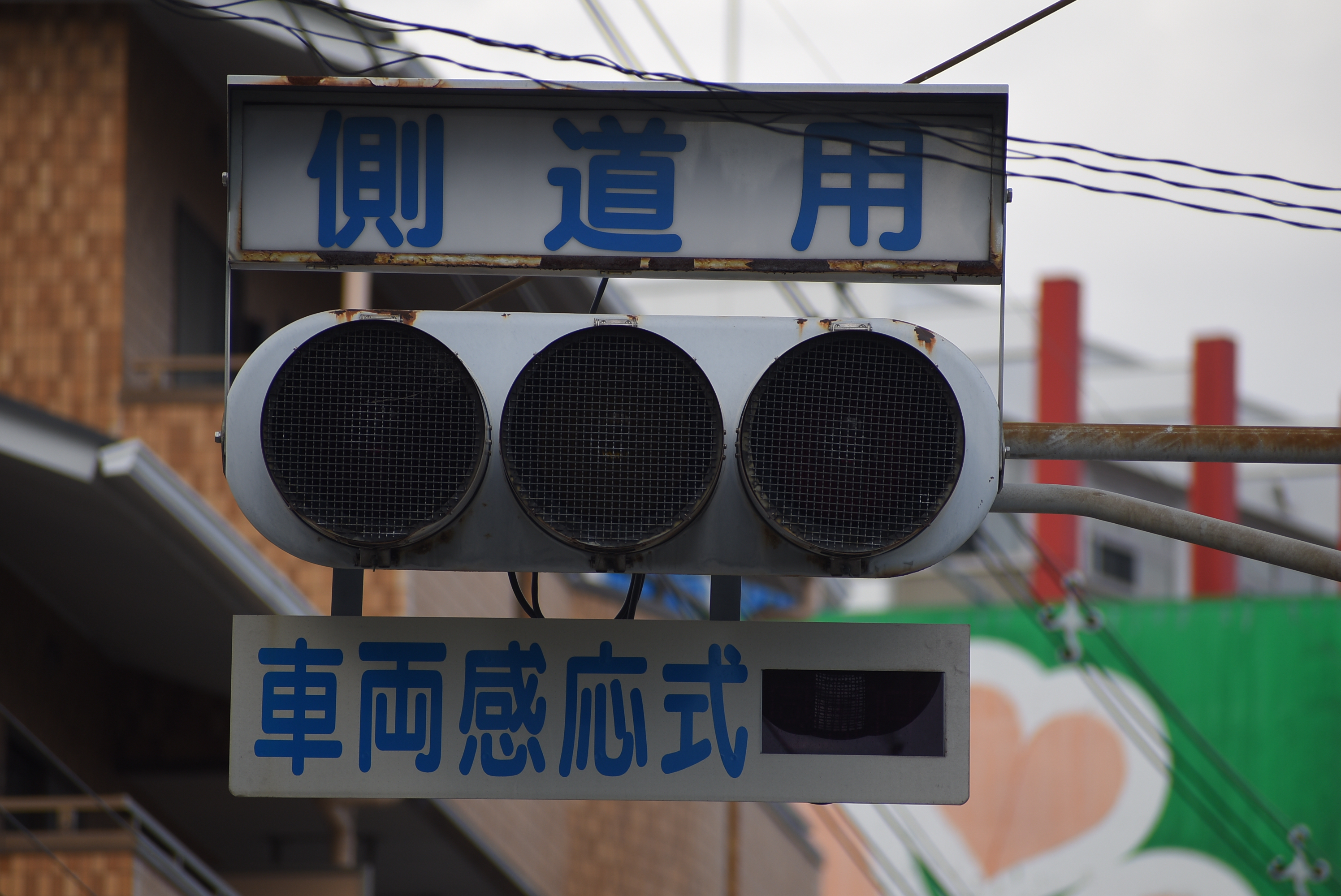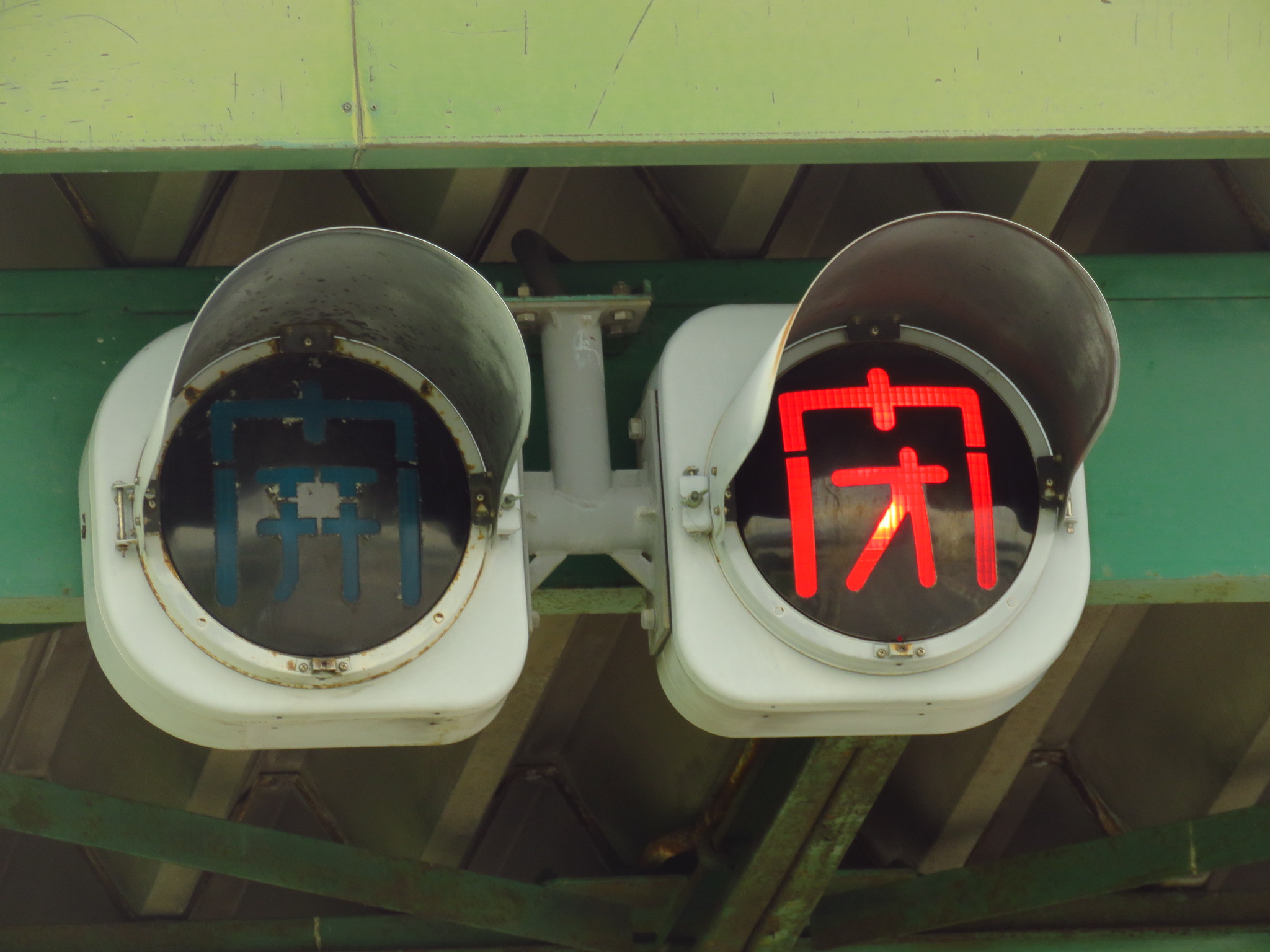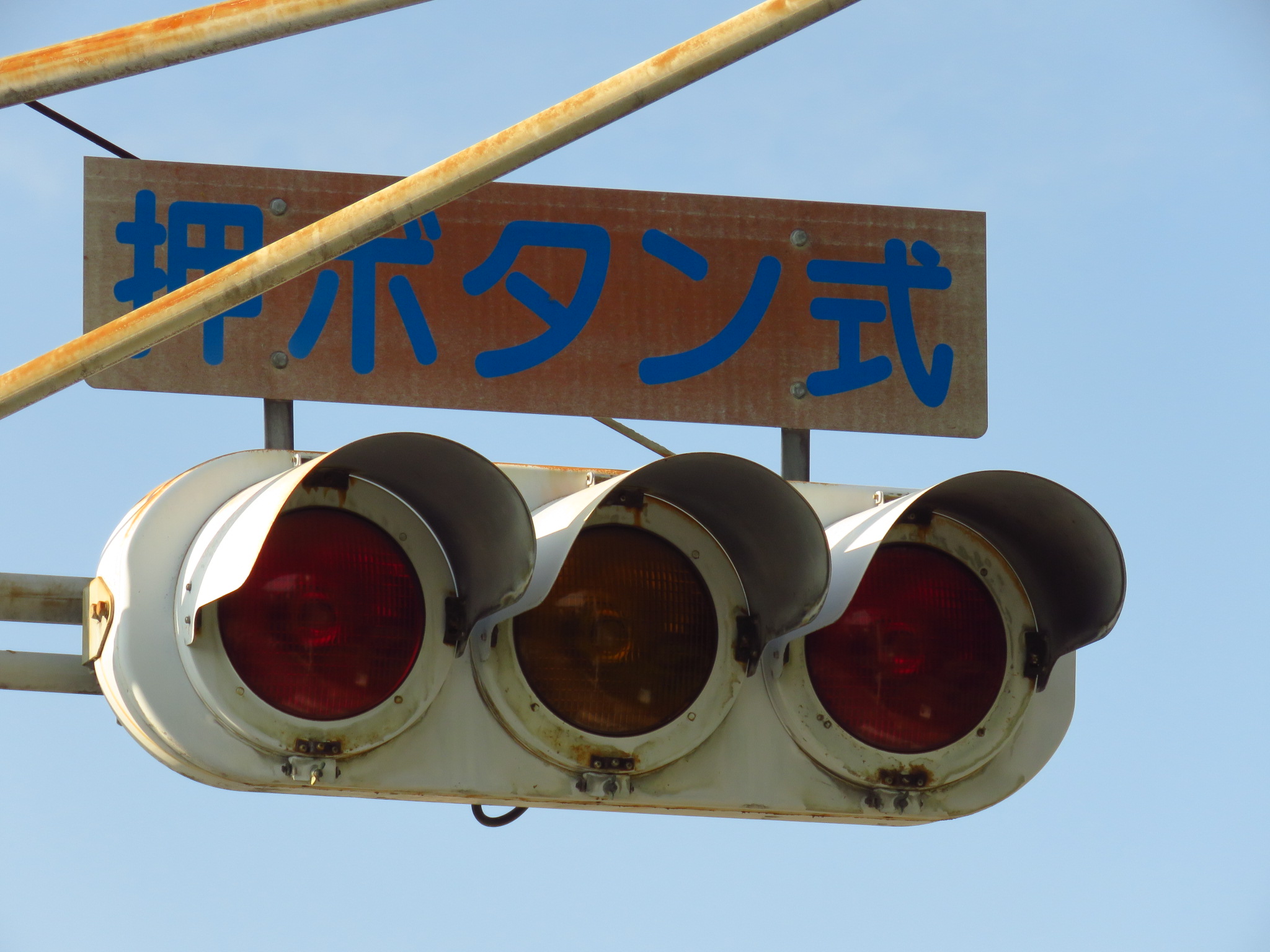 以前までは大阪府全土で見られていた3位灯を使用した「止まれ」灯器ですが、更新が進んでしまい府内ではついにこの一箇所だけになってしまいました。他のものが黄色塗装で「止まれ」表記だったのに対し、こちらはグレー塗装で「止マレ」表記になっています。
