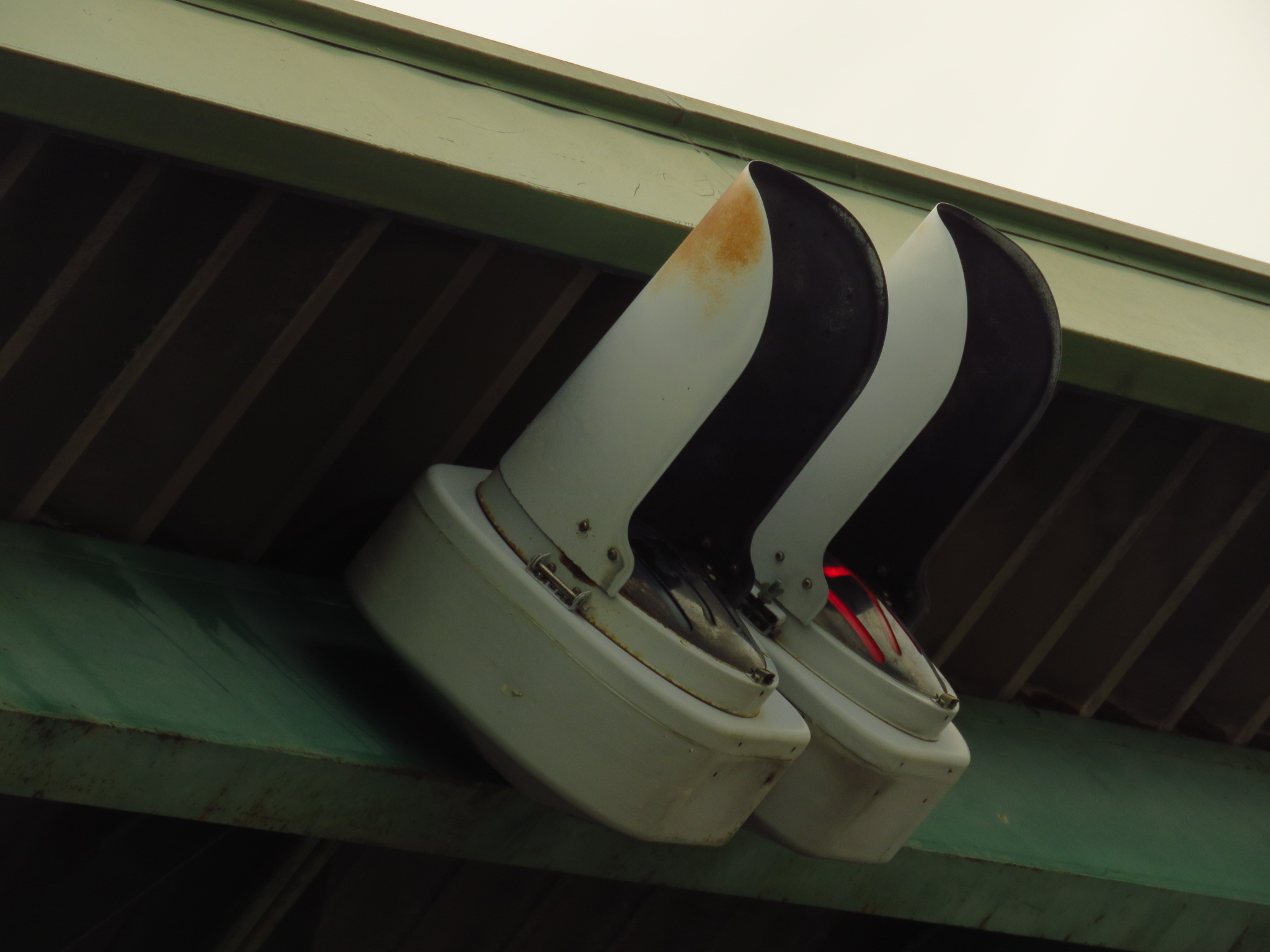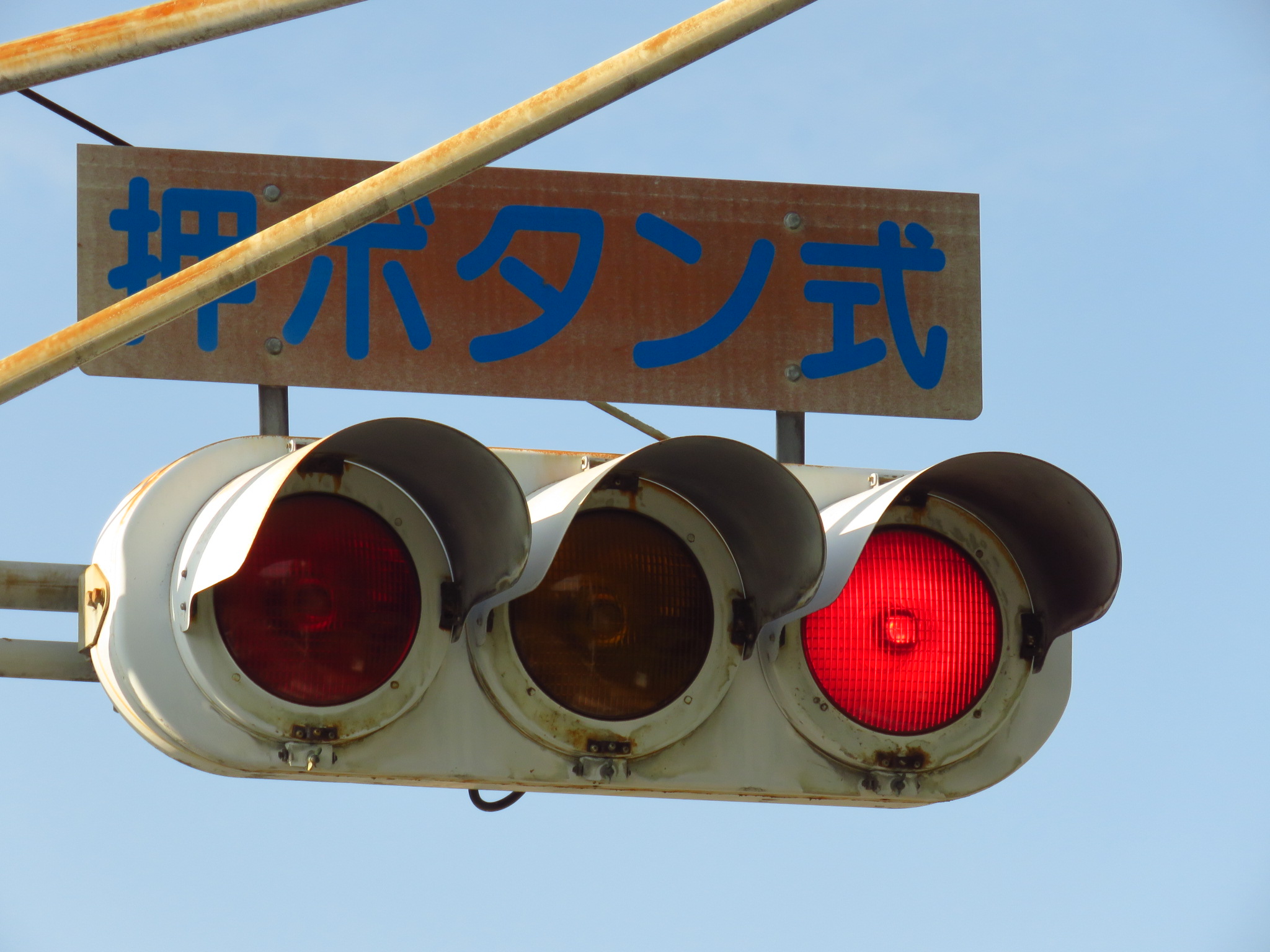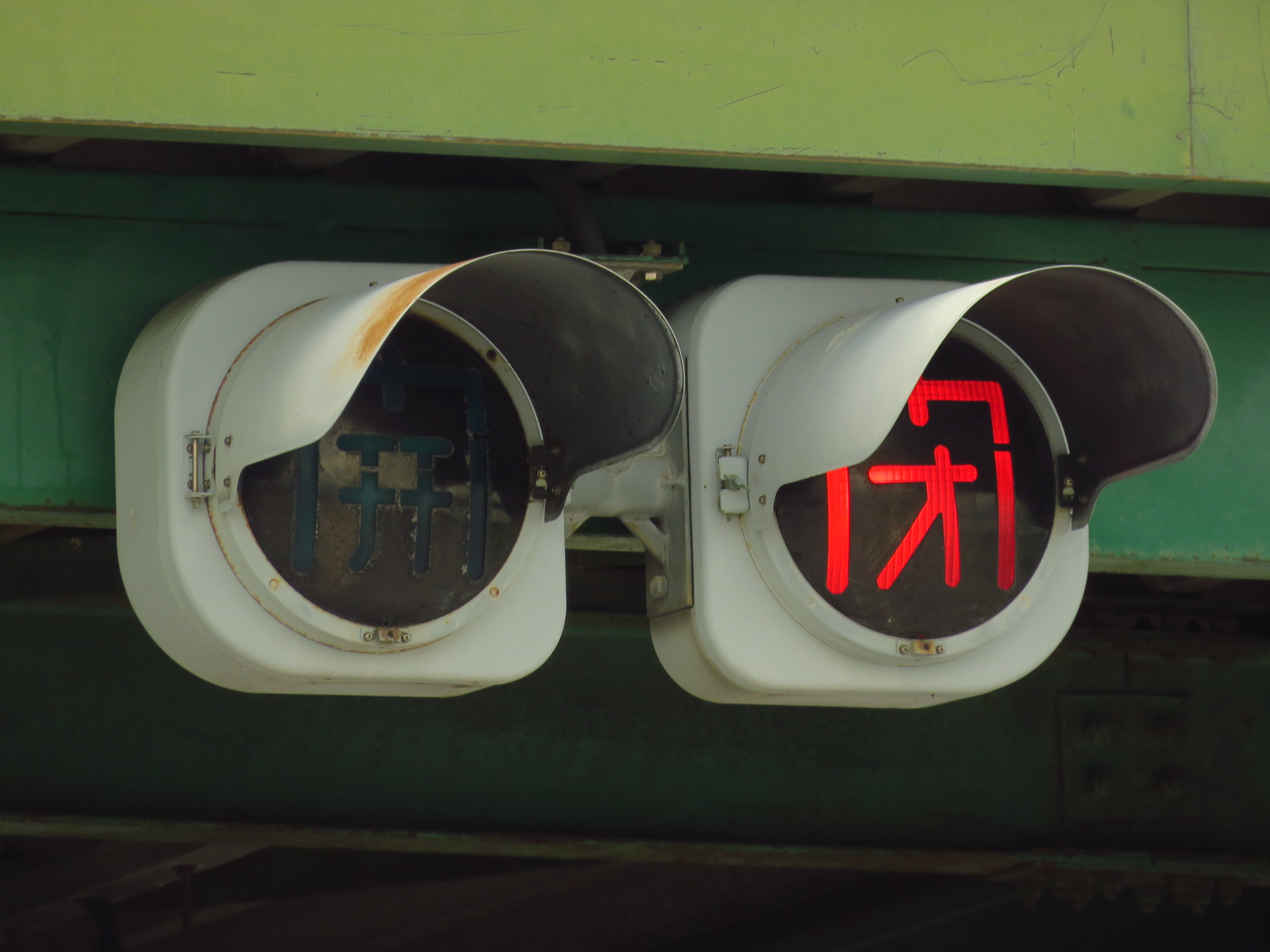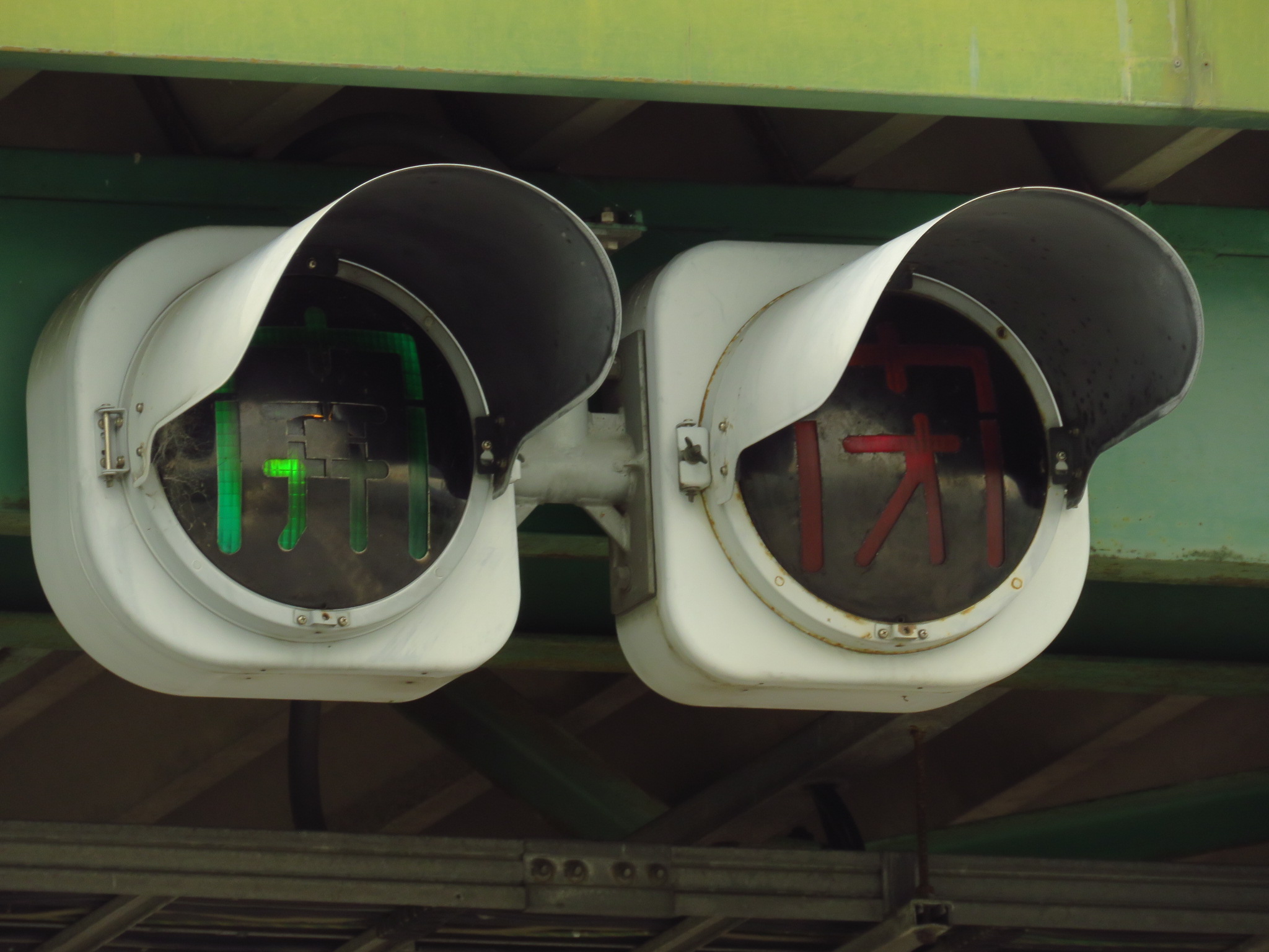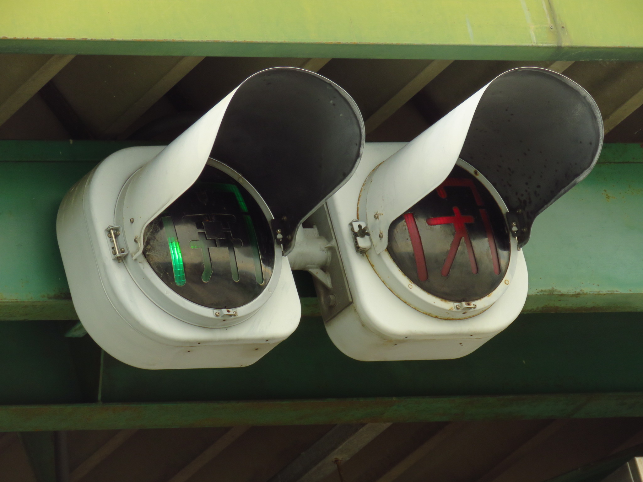 以前までは大阪府全土で見られていた3位灯を使用した「止まれ」灯器ですが、更新が進んでしまい府内ではついにこの一箇所だけになってしまいました。他のものが黄色塗装で「止まれ」表記だったのに対し、こちらはグレー塗装で「止マレ」表記になっています。