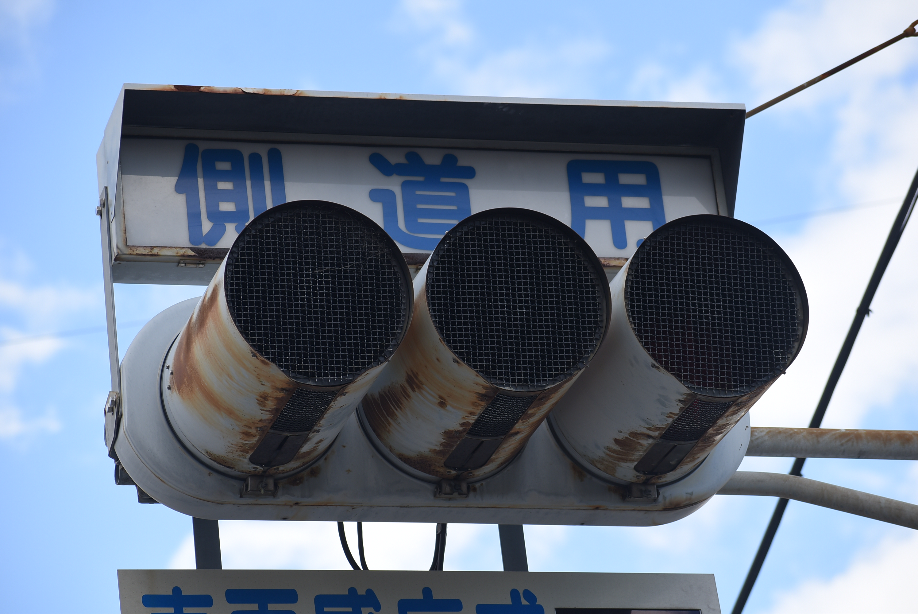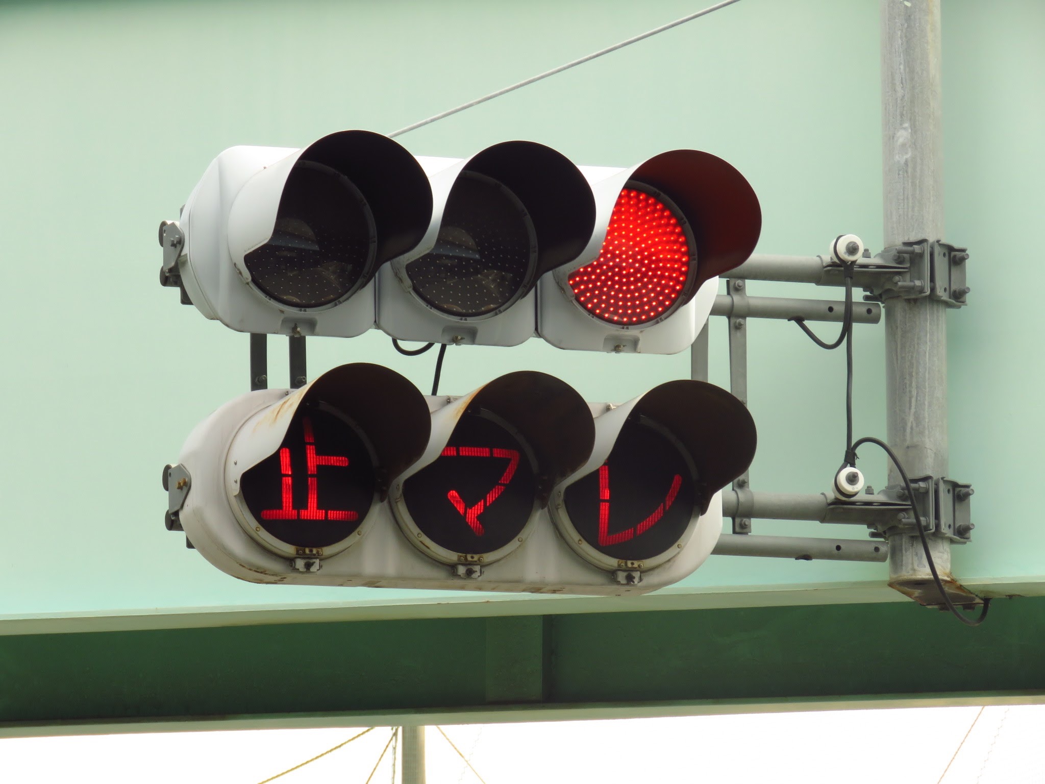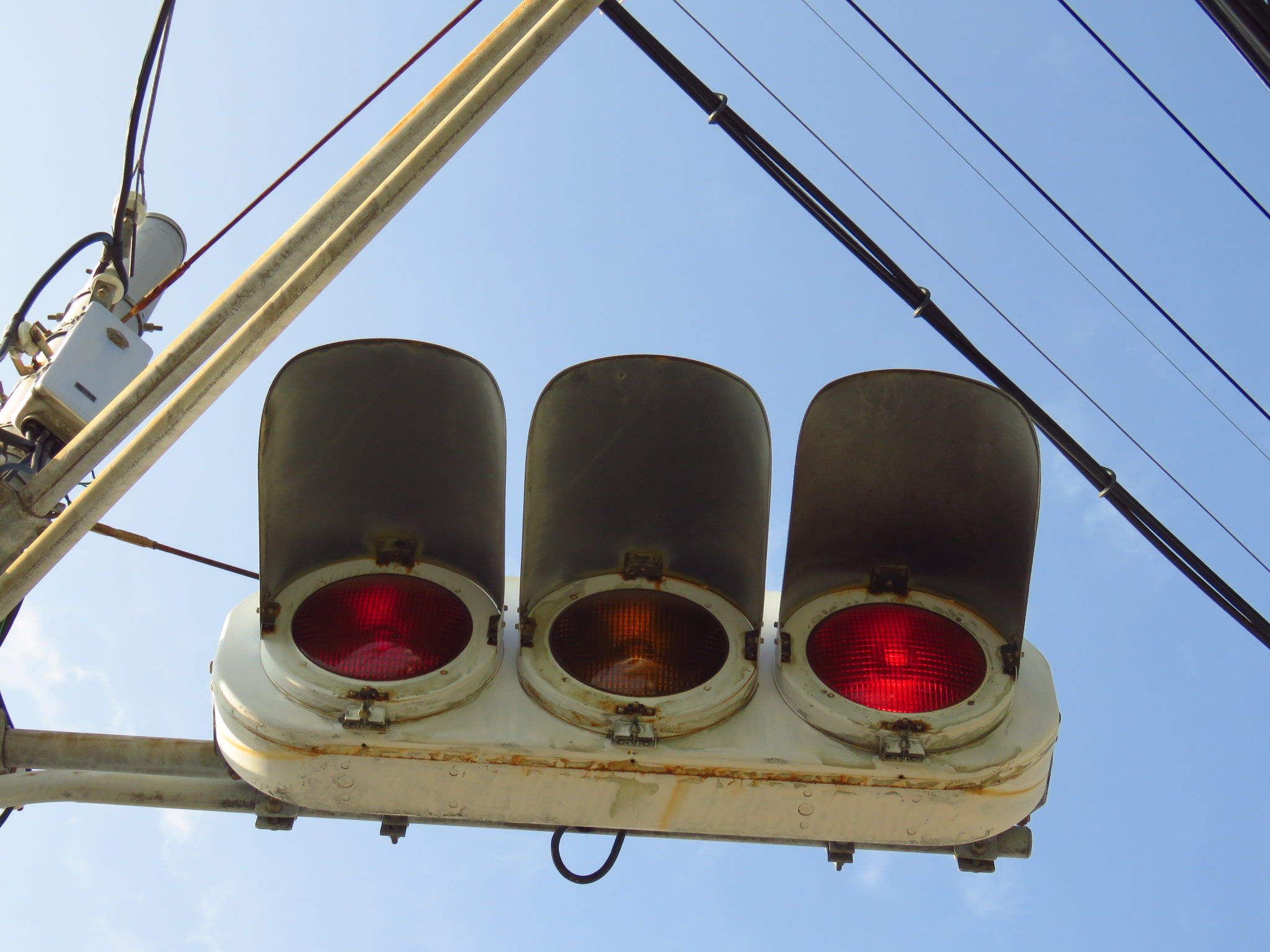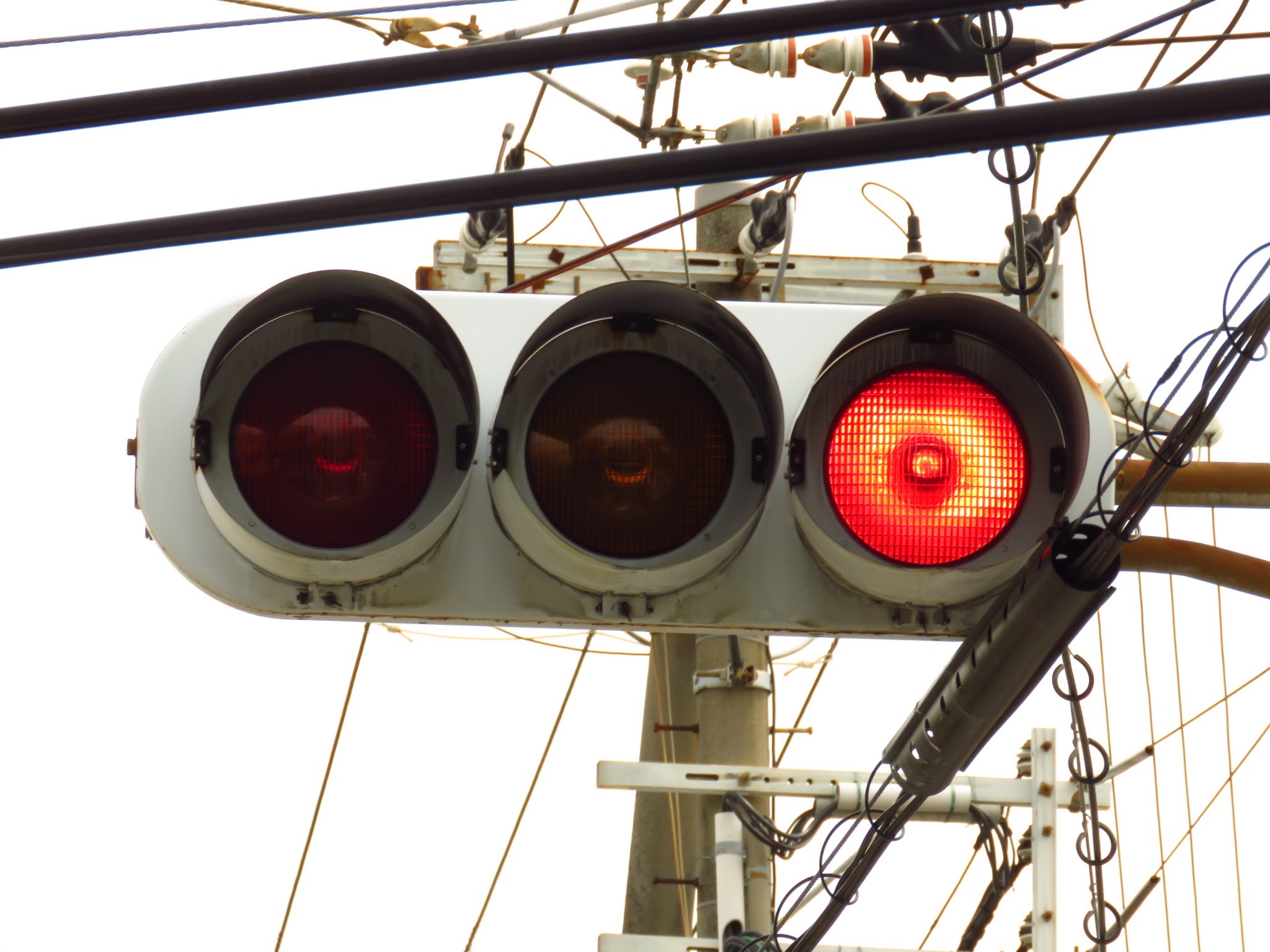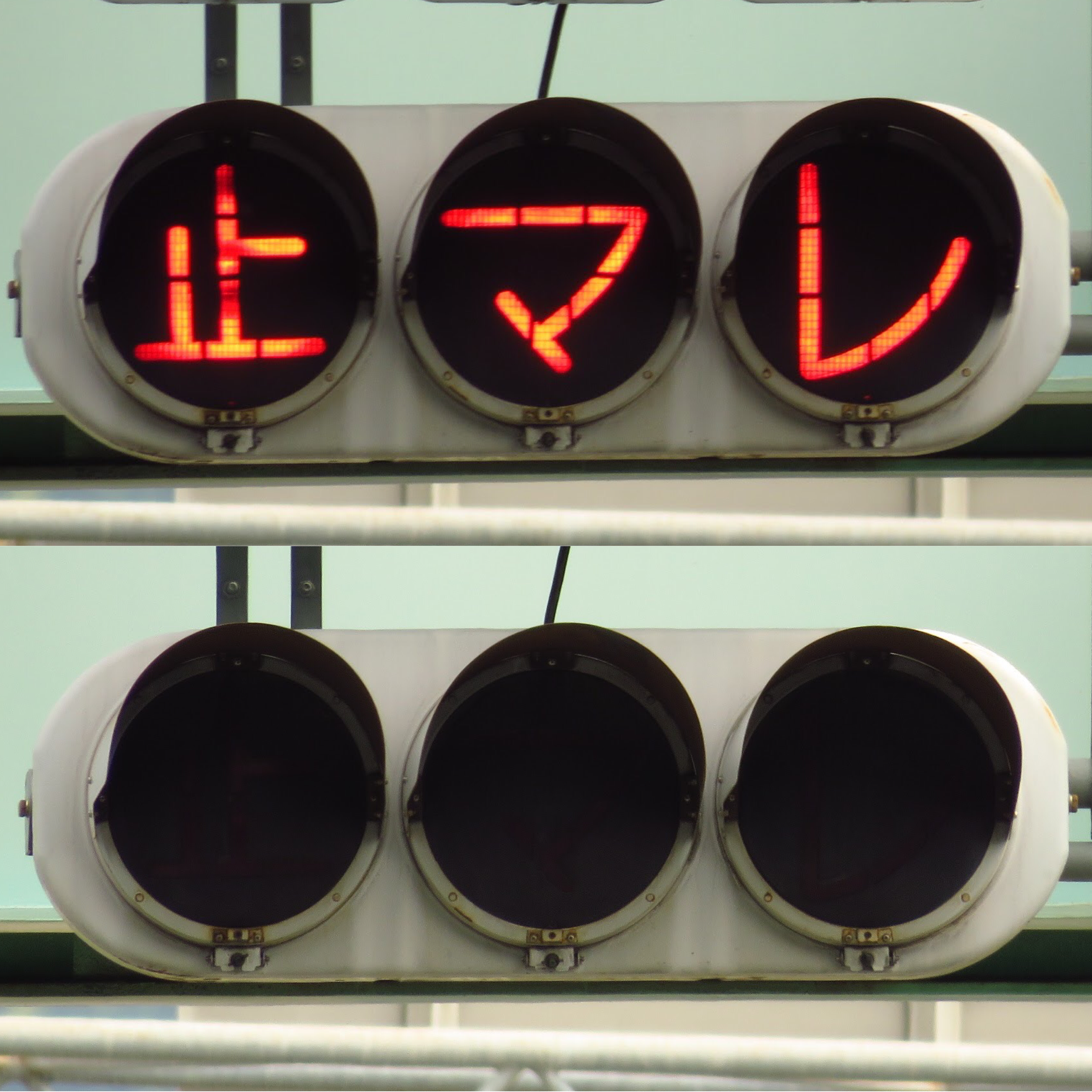 以前までは大阪府全土で見られていた3位灯を使用した「止まれ」灯器ですが、更新が進んでしまい府内ではついにこの一箇所だけになってしまいました。他のものが黄色塗装で「止まれ」表記だったのに対し、こちらはグレー塗装で「止マレ」表記になっています。