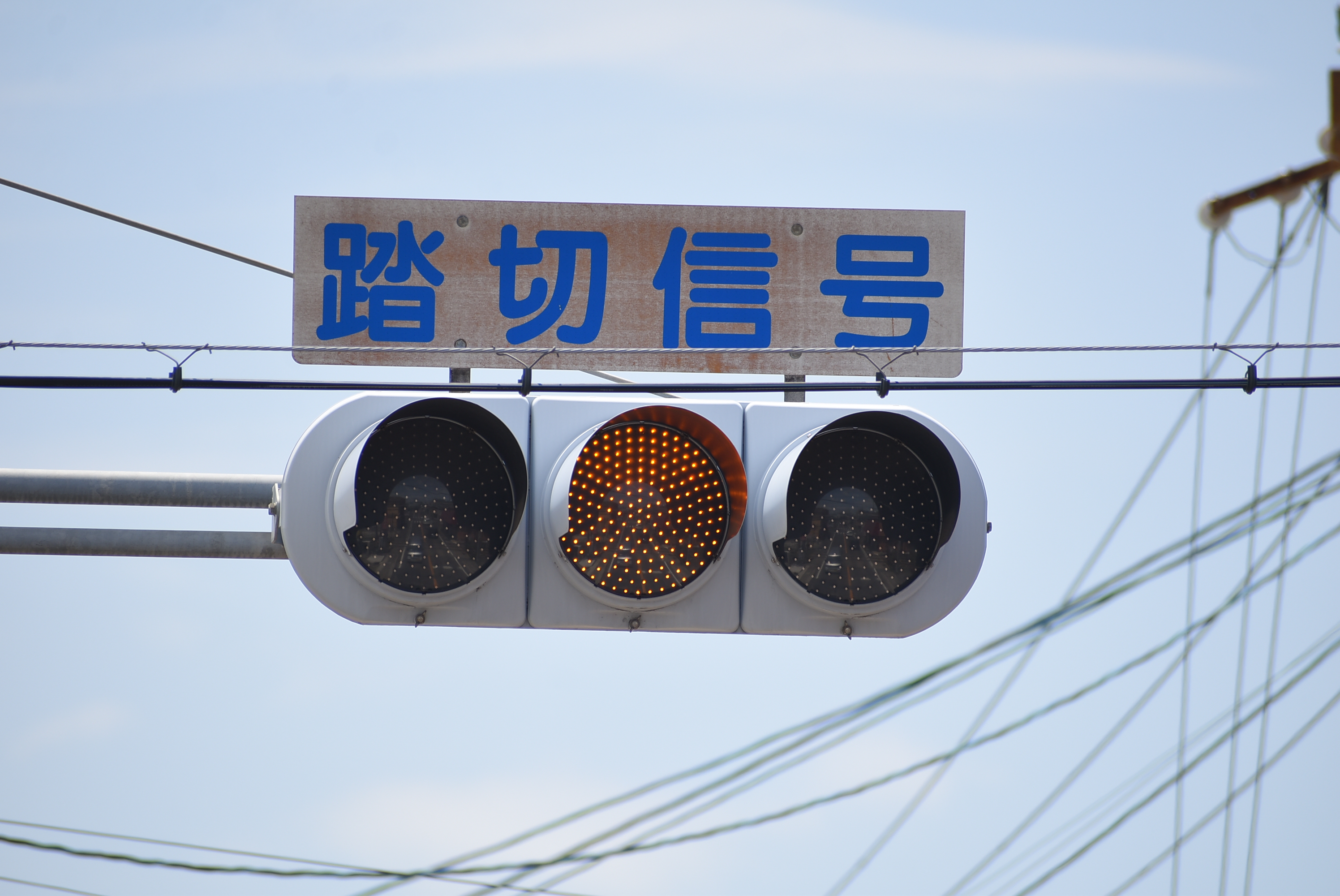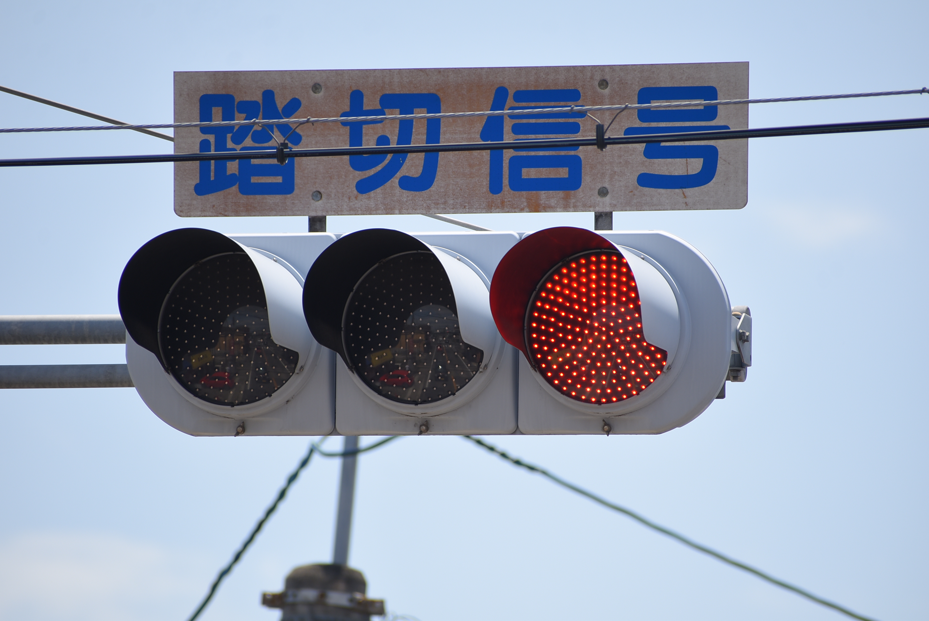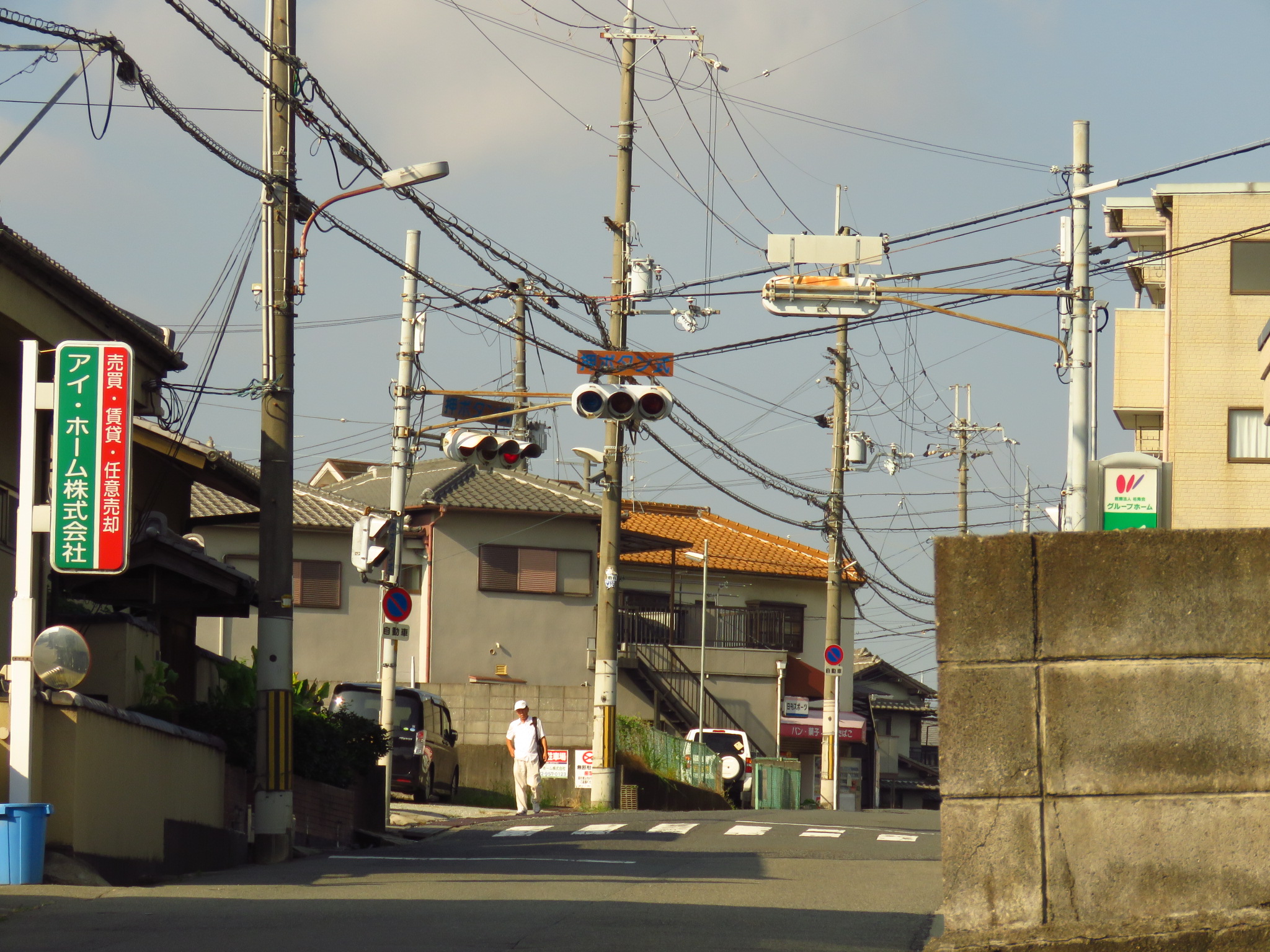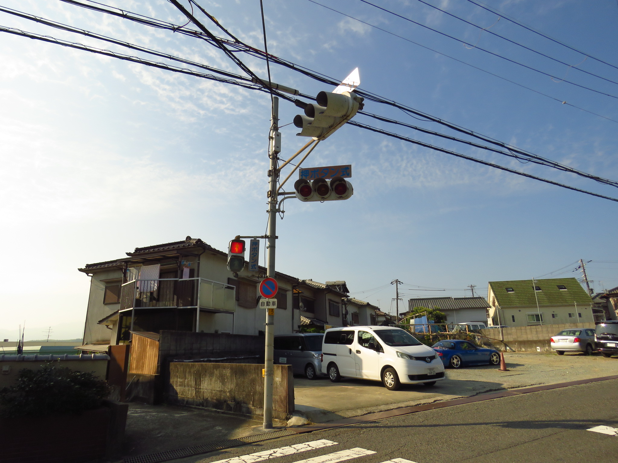 以前までは大阪府全土で見られていた3位灯を使用した「止まれ」灯器ですが、更新が進んでしまい府内ではついにこの一箇所だけになってしまいました。他のものが黄色塗装で「止まれ」表記だったのに対し、こちらはグレー塗装で「止マレ」表記になっています。
