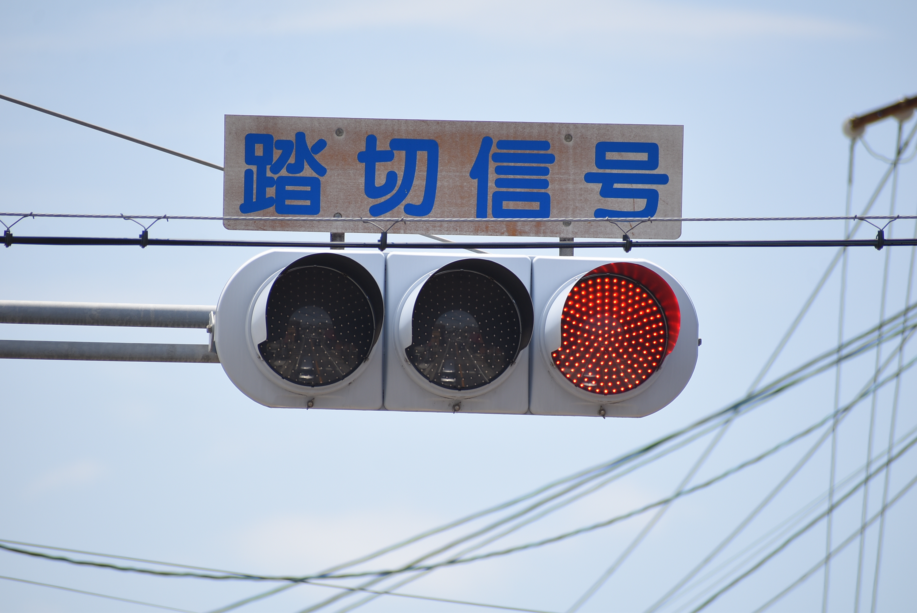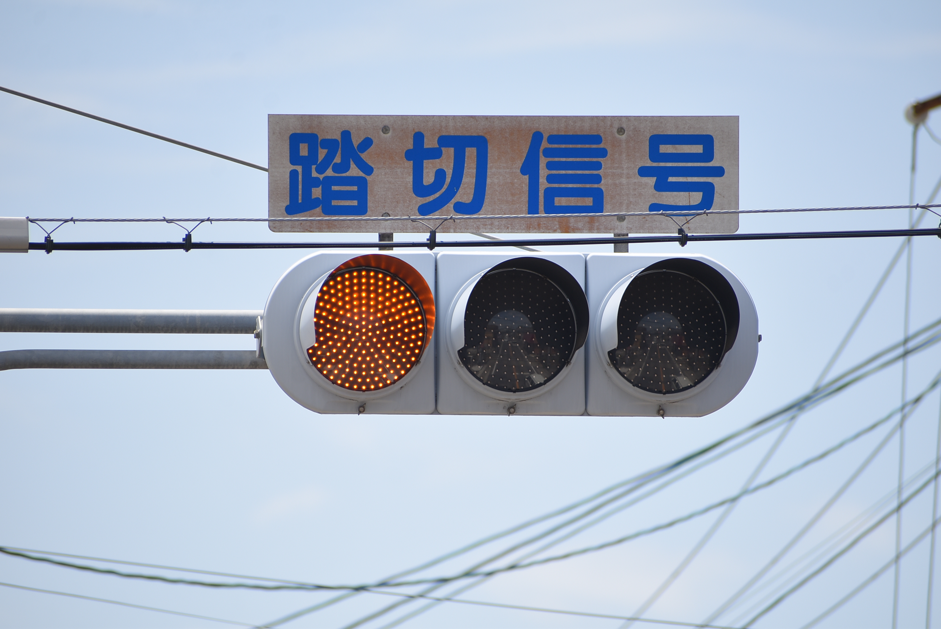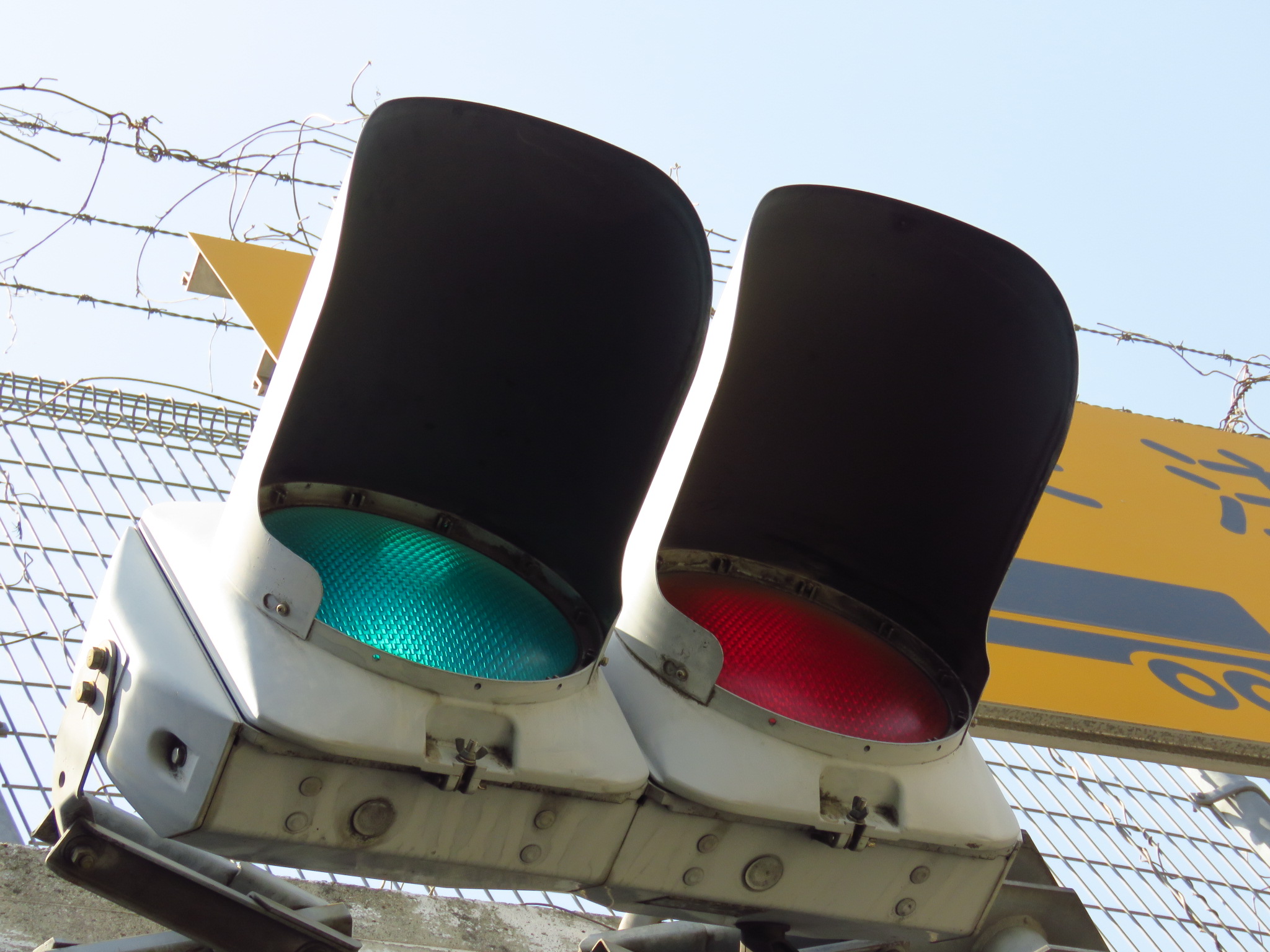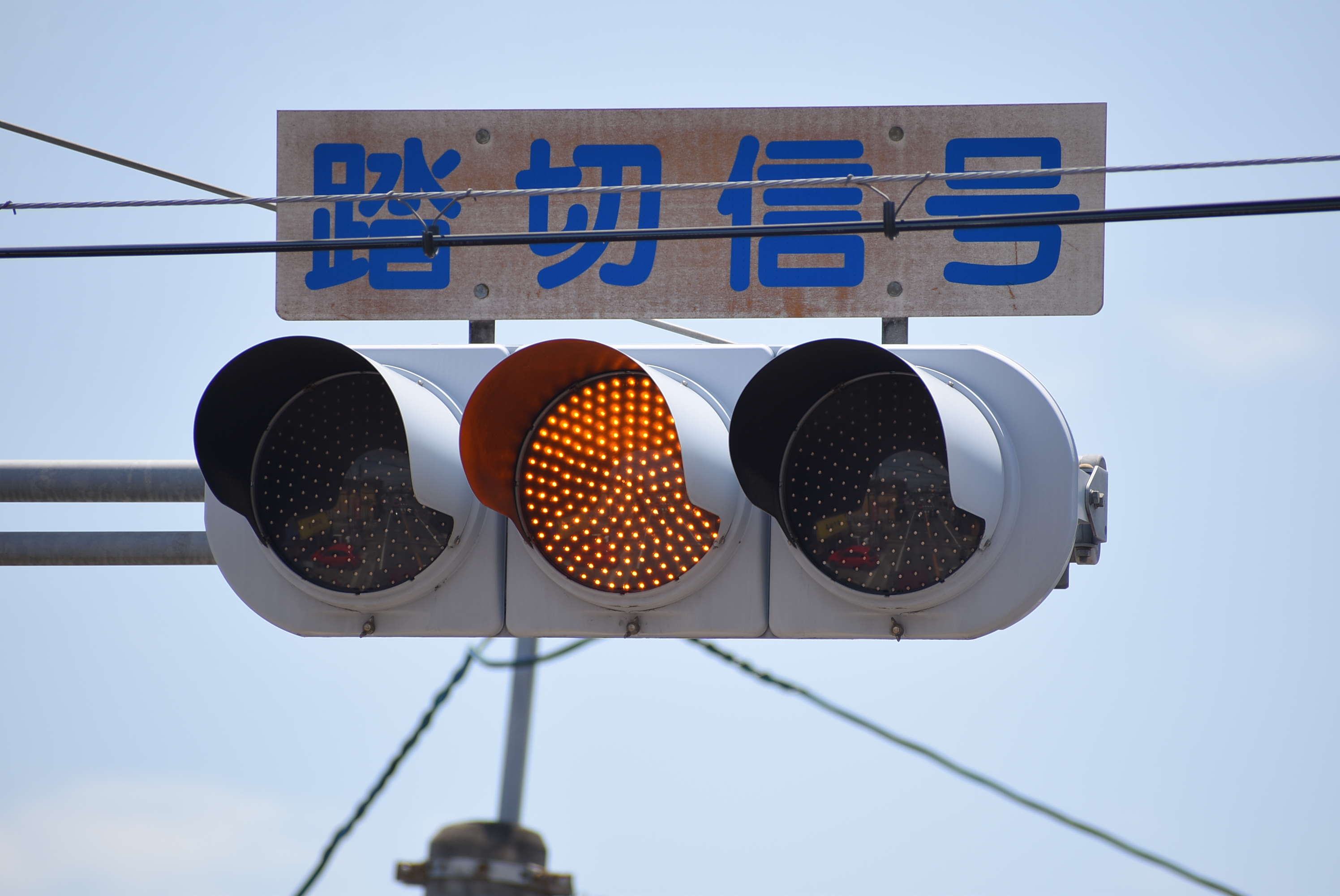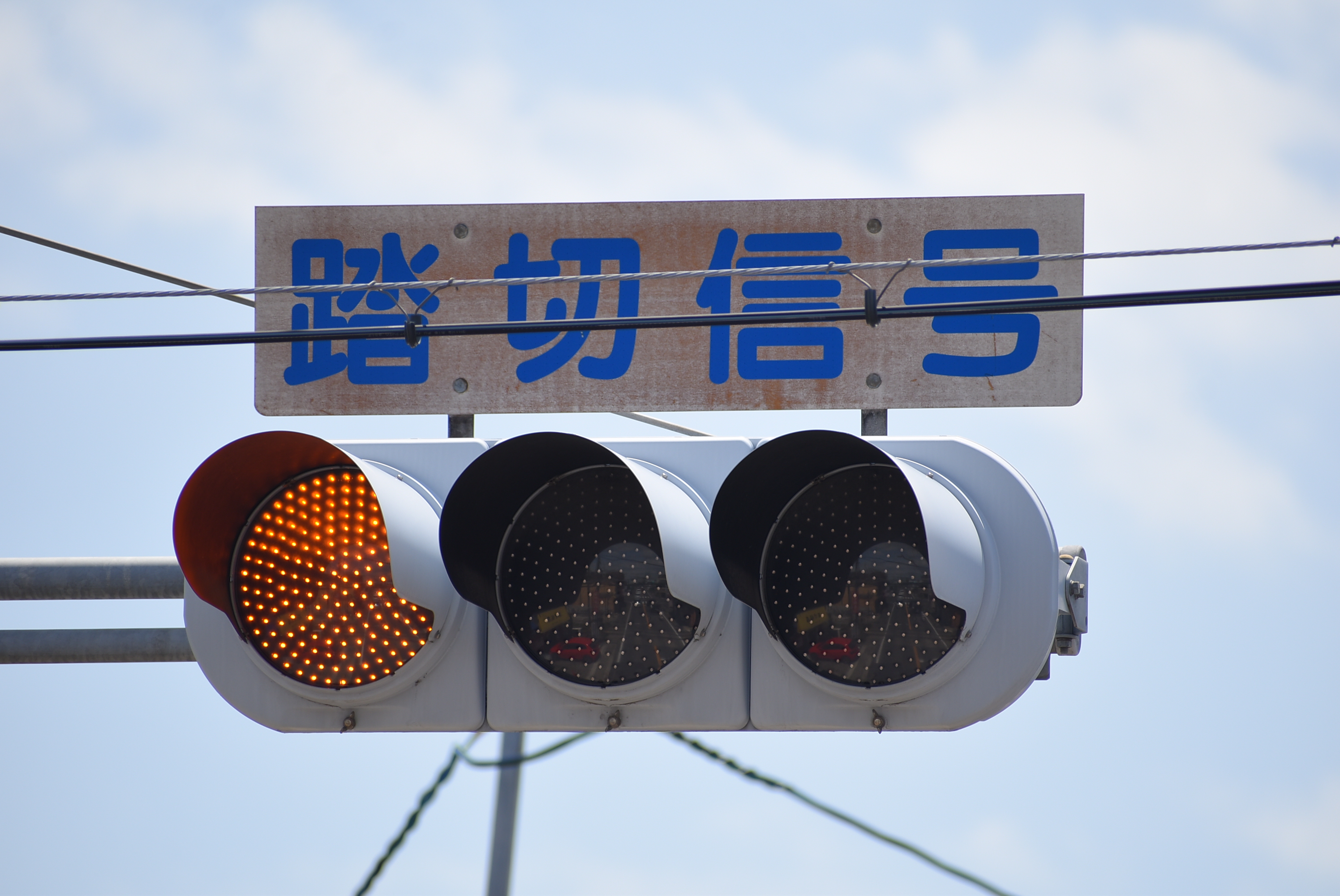 以前までは大阪府全土で見られていた3位灯を使用した「止まれ」灯器ですが、更新が進んでしまい府内ではついにこの一箇所だけになってしまいました。他のものが黄色塗装で「止まれ」表記だったのに対し、こちらはグレー塗装で「止マレ」表記になっています。