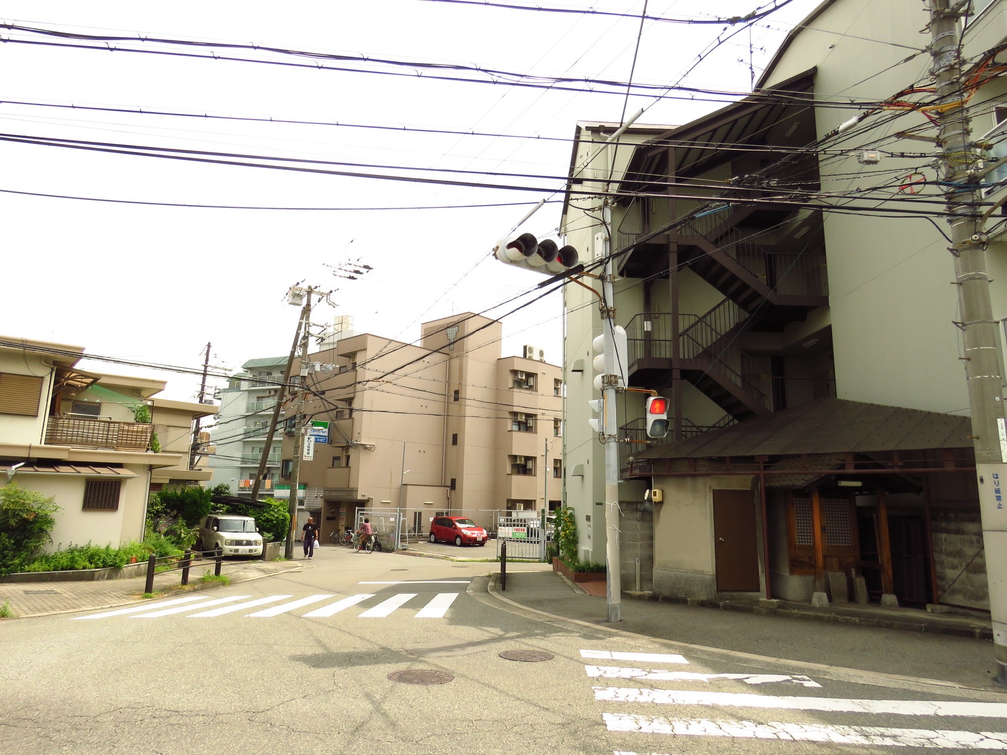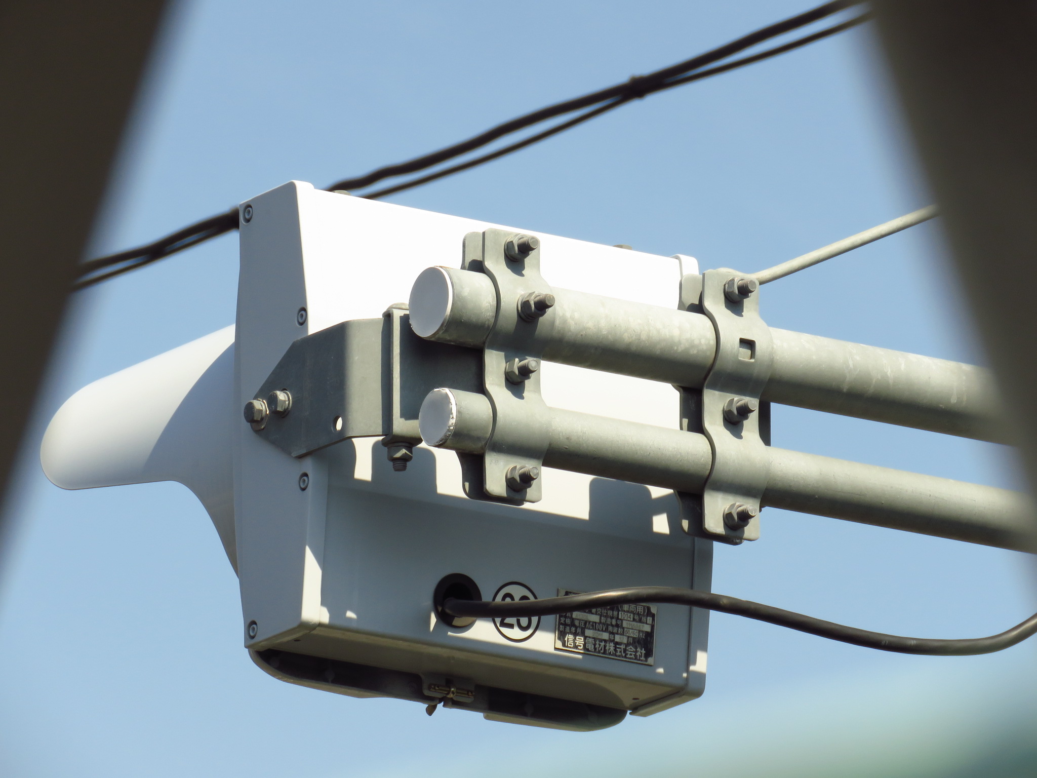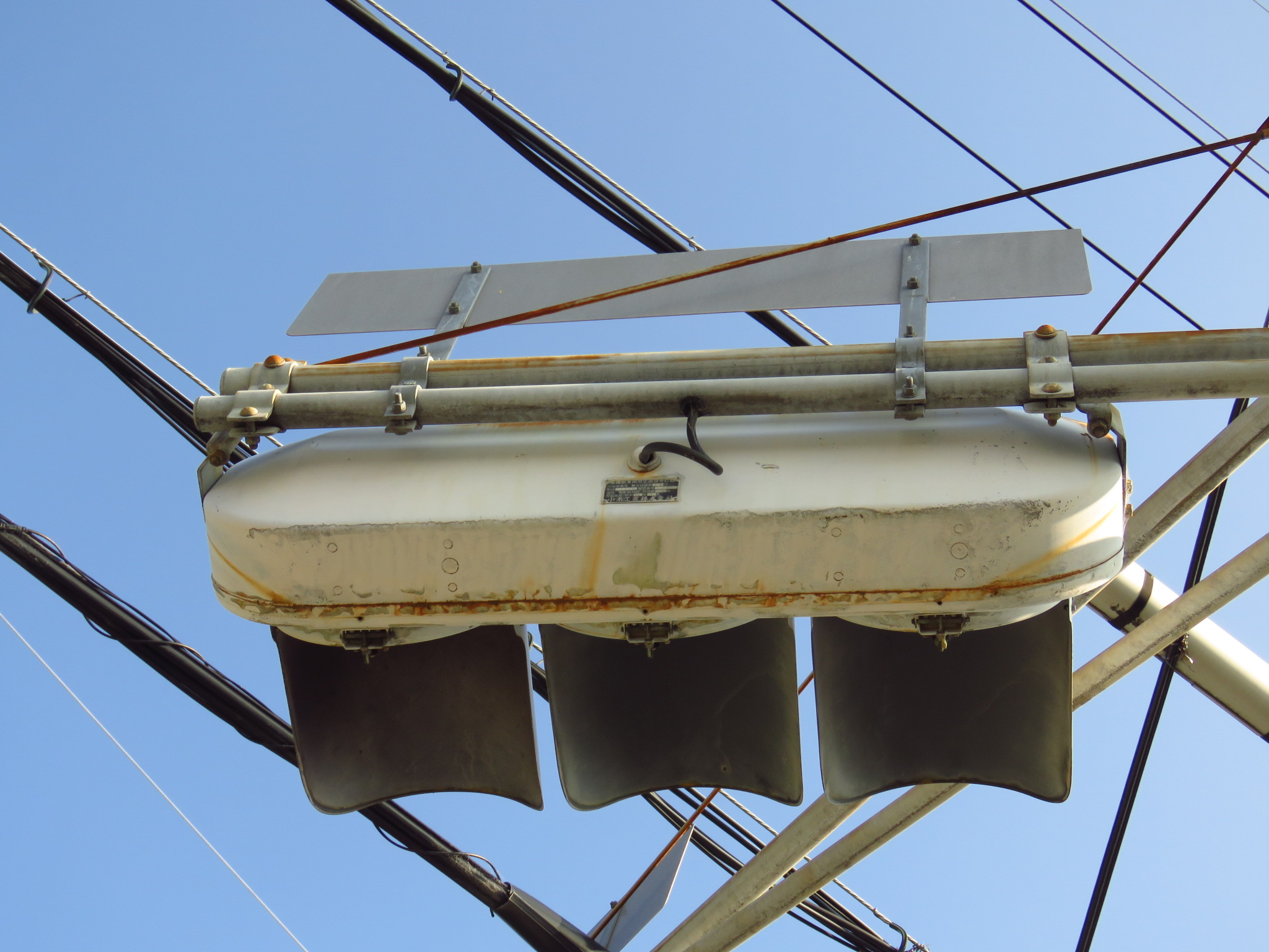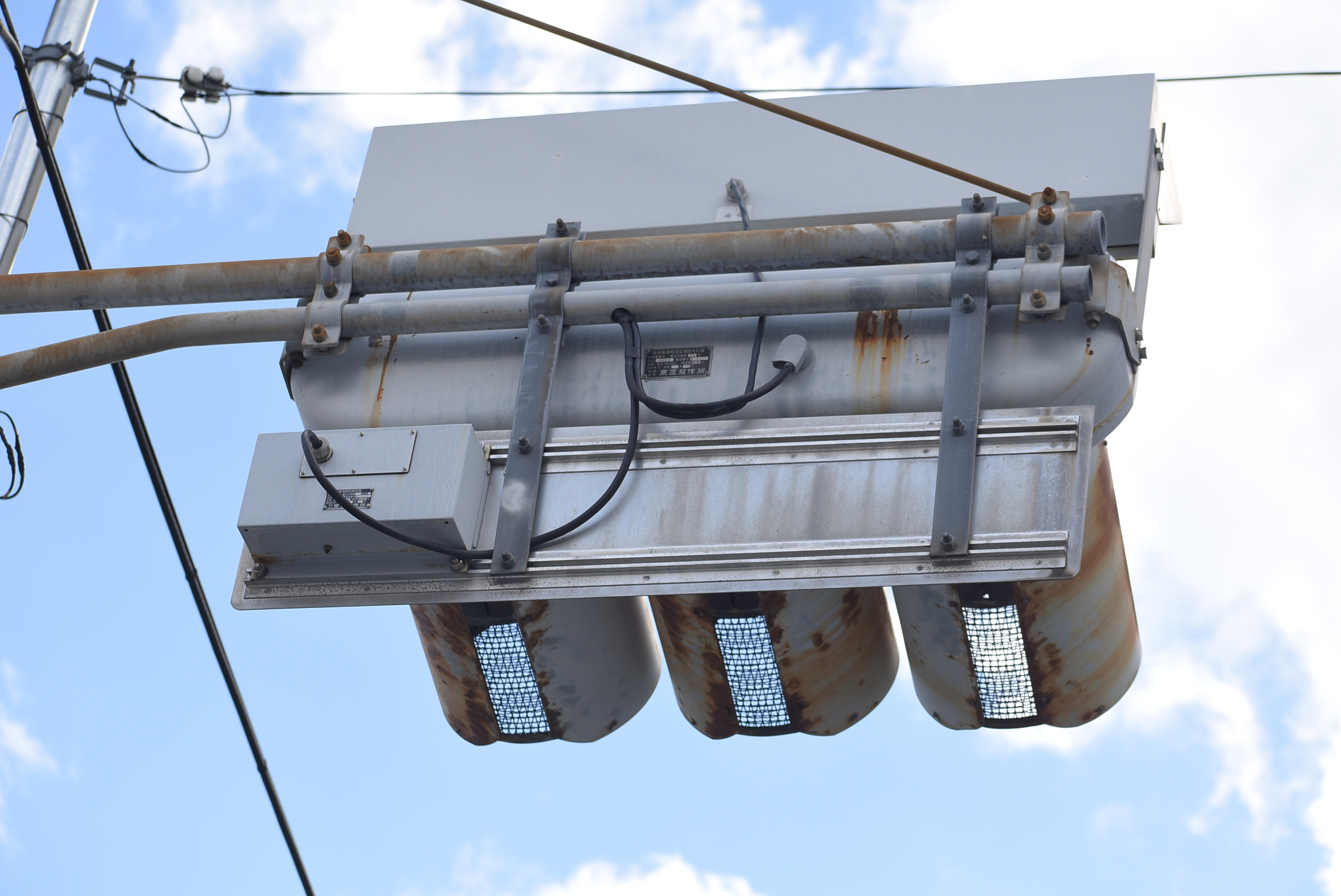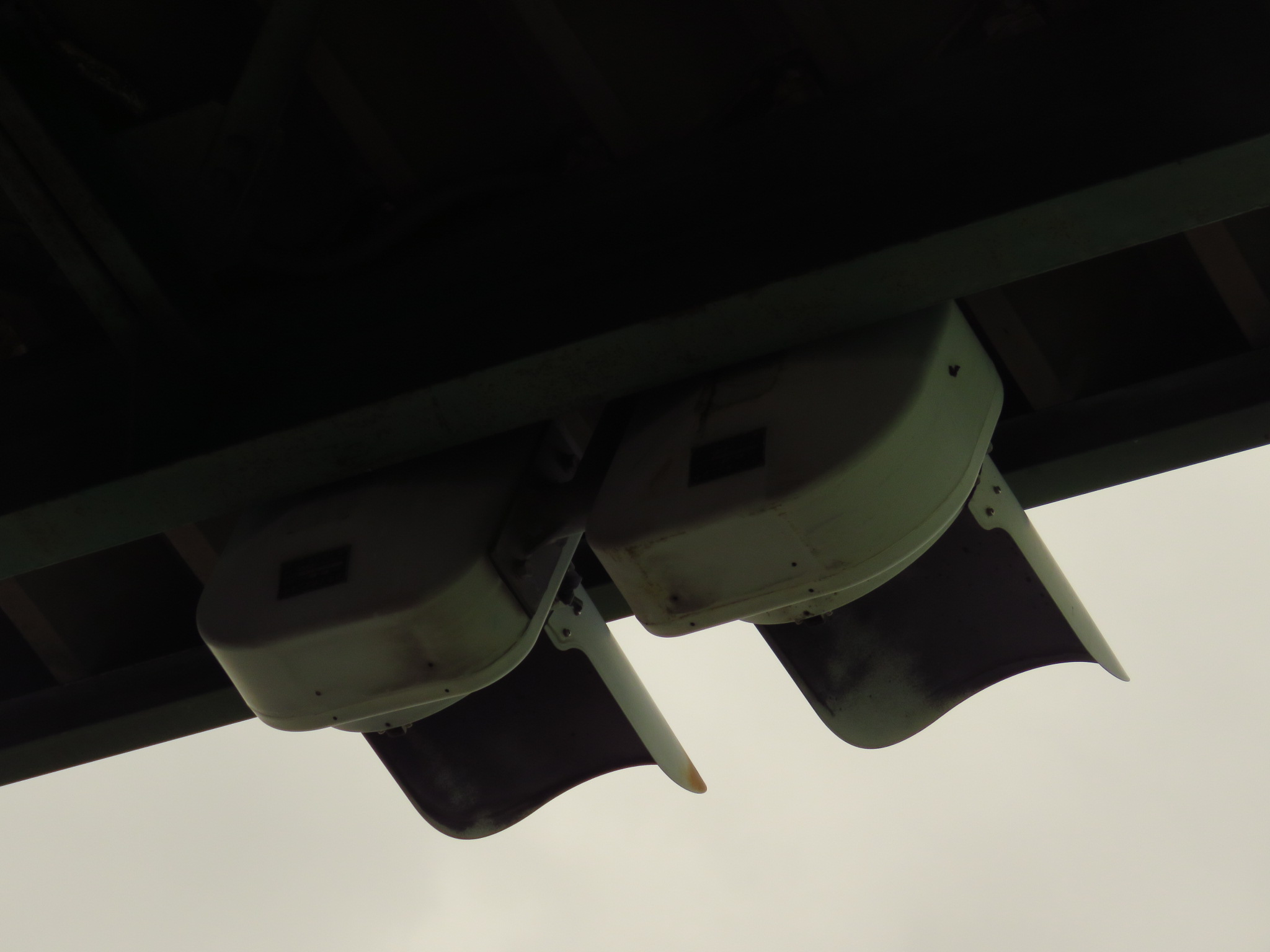 以前までは大阪府全土で見られていた3位灯を使用した「止まれ」灯器ですが、更新が進んでしまい府内ではついにこの一箇所だけになってしまいました。他のものが黄色塗装で「止まれ」表記だったのに対し、こちらはグレー塗装で「止マレ」表記になっています。