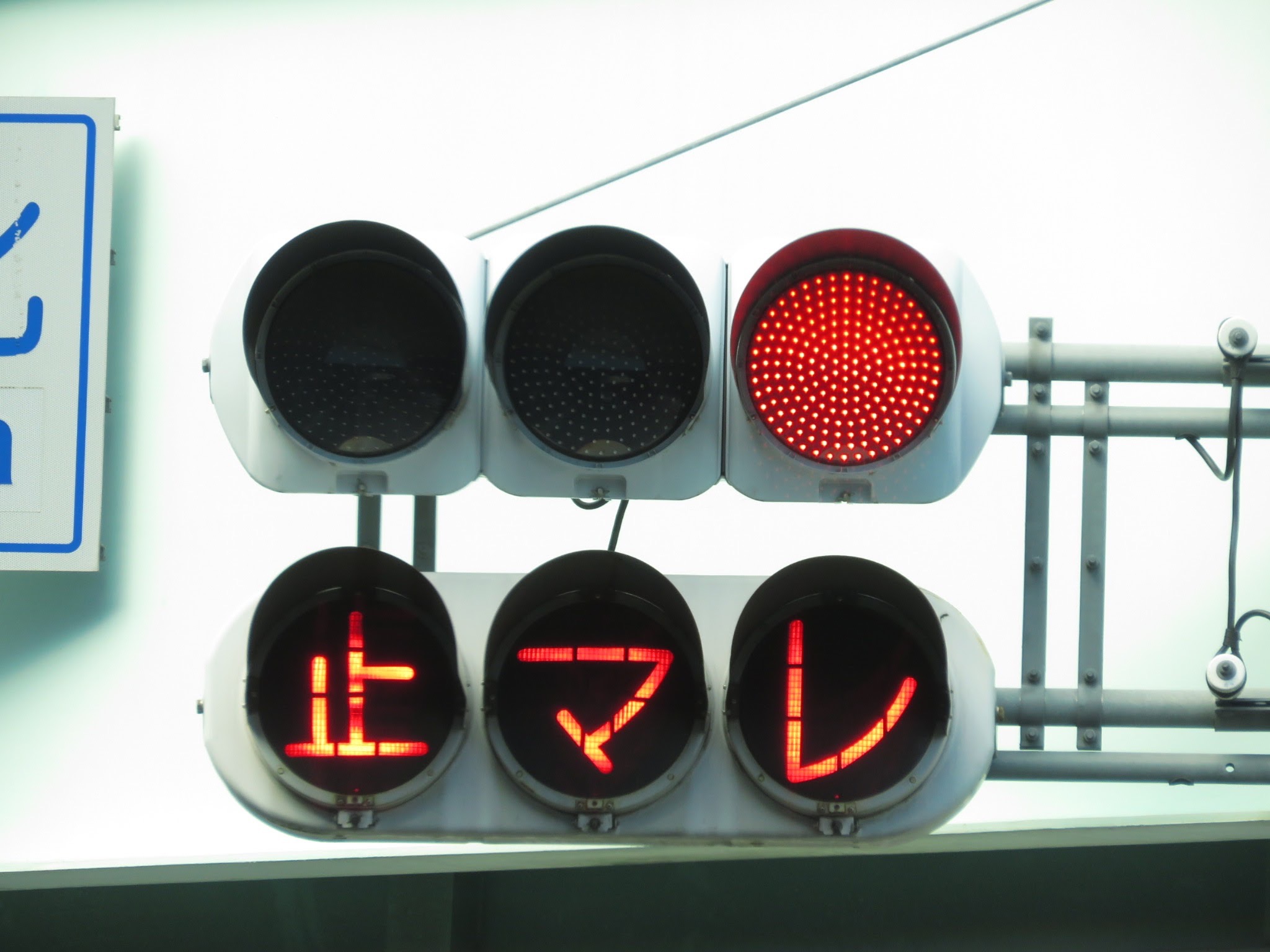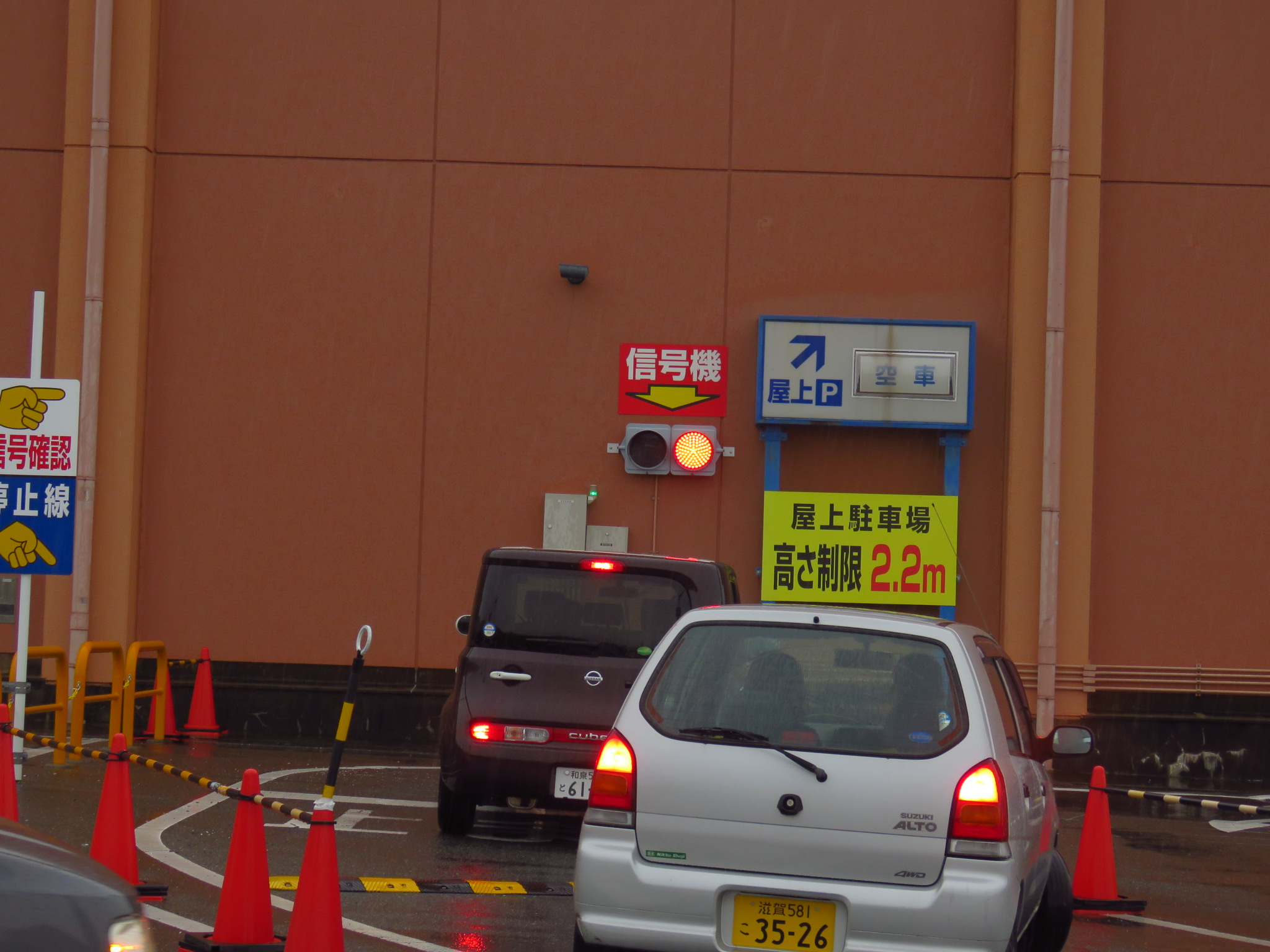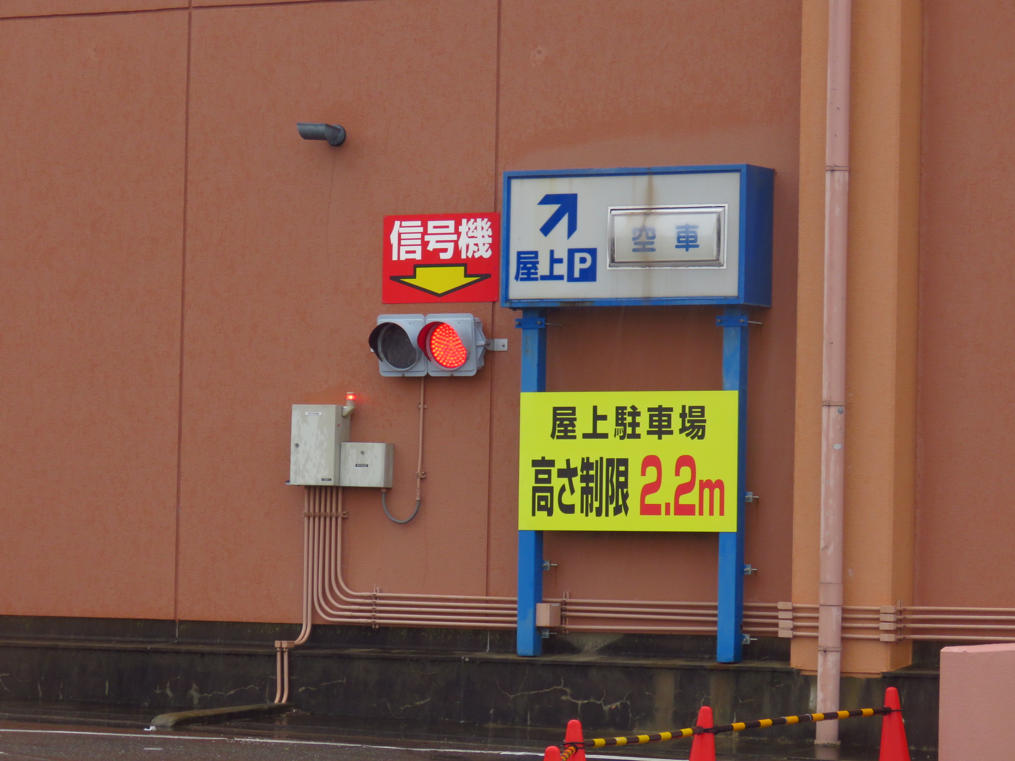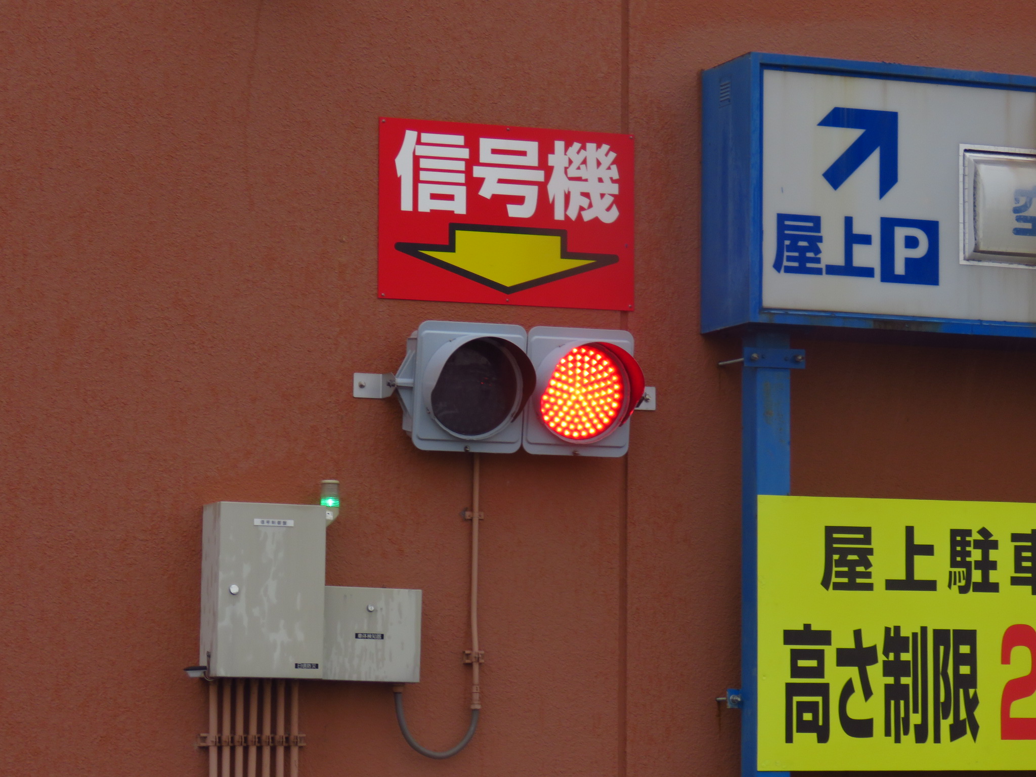 ショッピング施設用駐車場の構内信号として設置されています。青⇄赤サイクルで交互交通になっています。(屋上に上がるまでの道が狭いため)