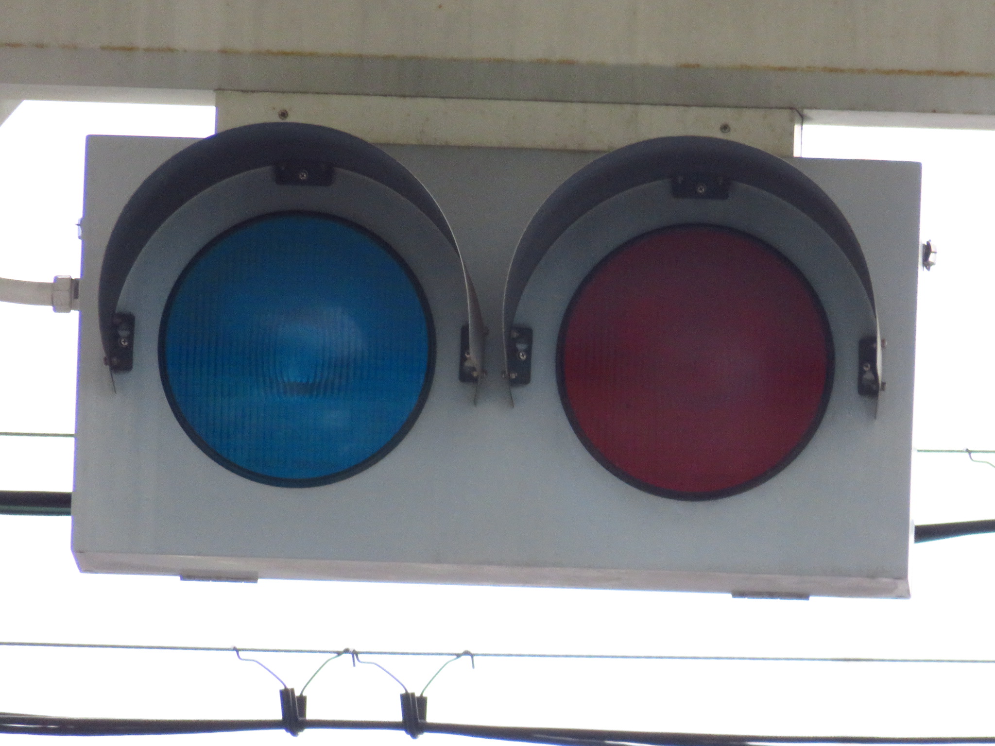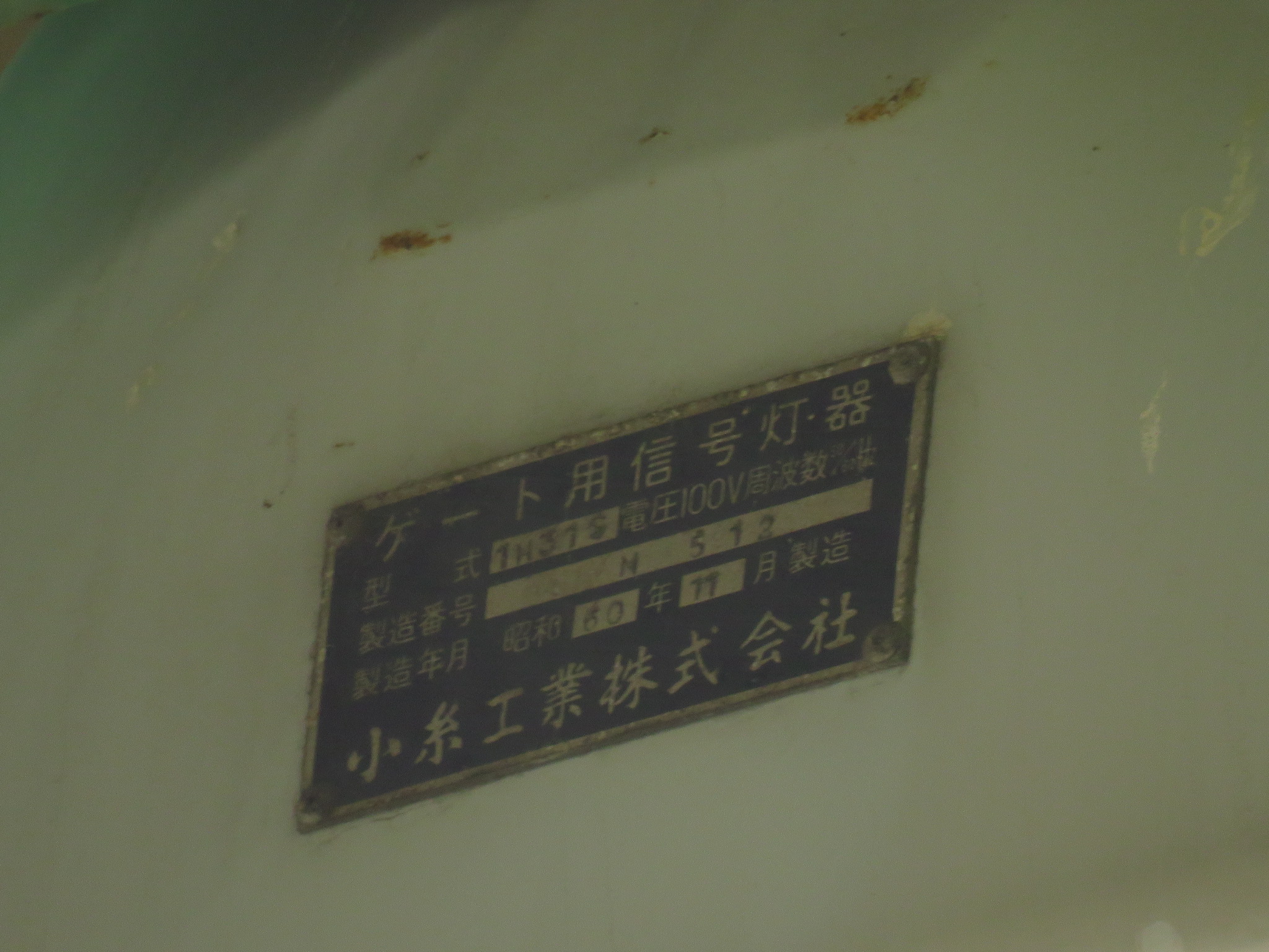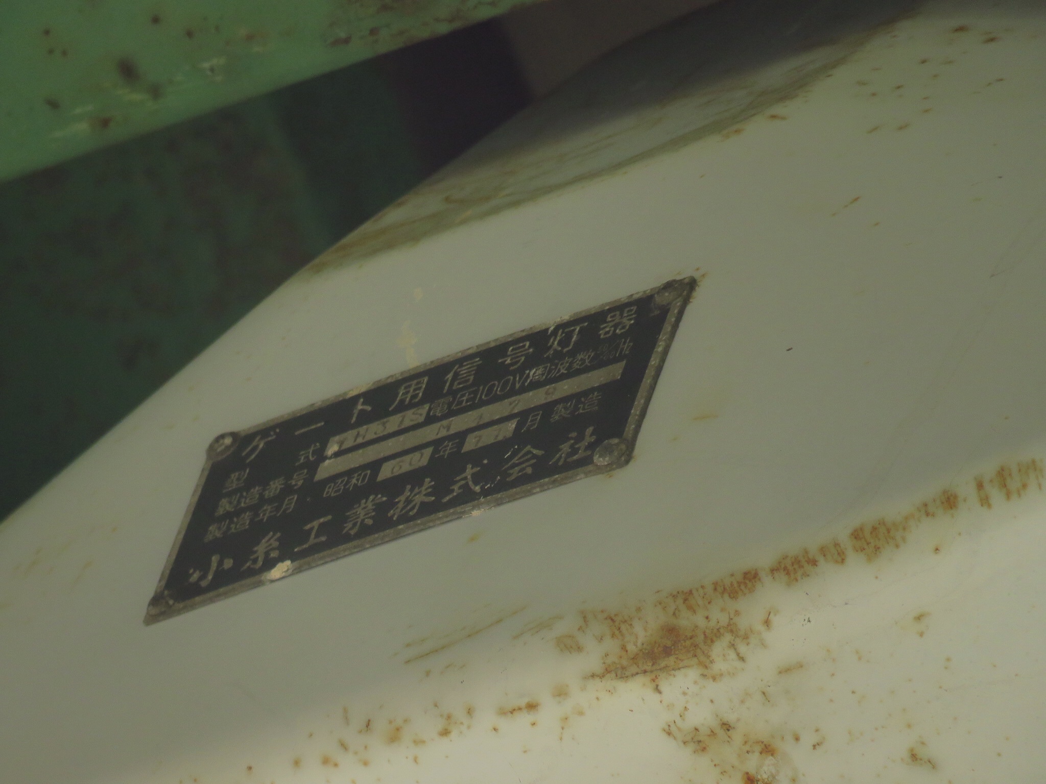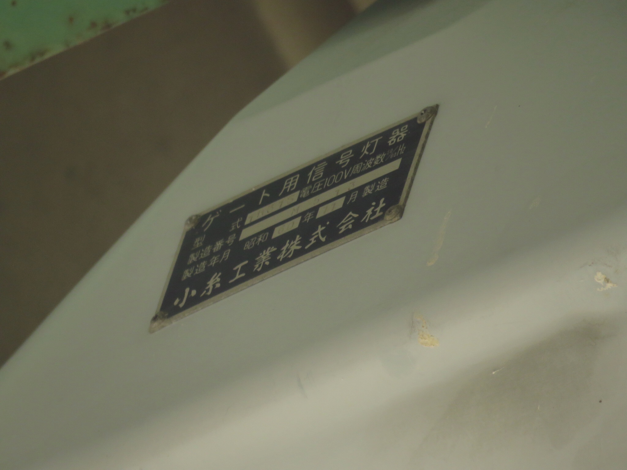 有料道路料金所の信号灯として小糸鉄板灯器が使用されています。青レンズに「開」、赤レンズに「閉」のマスクがつけられています。それぞれの方向に3機ずつ設置されていて、両サイドが赤、真ん中が青点灯になっています。銘板も「ゲート用信号灯器」という珍しい病気になっています。