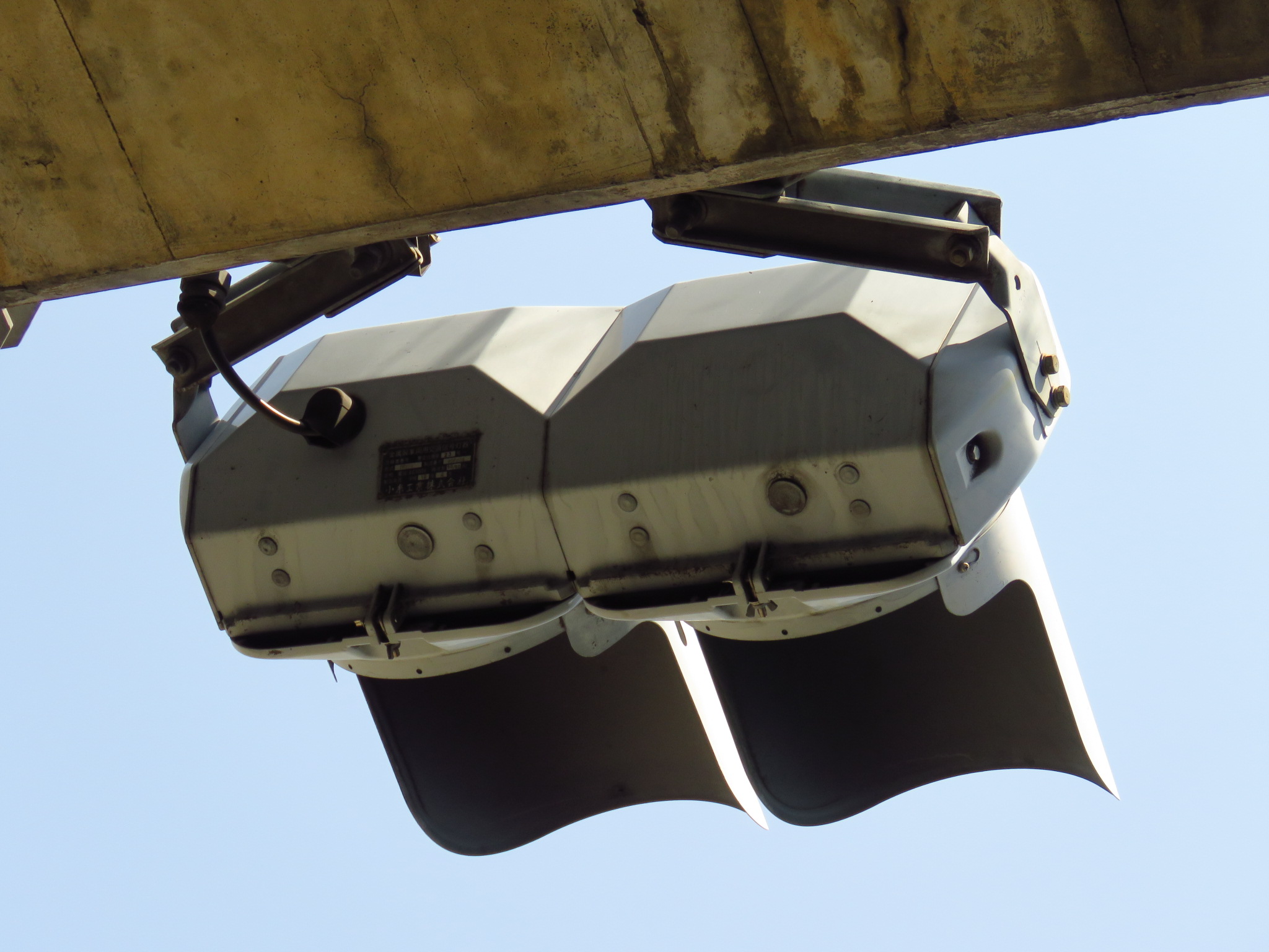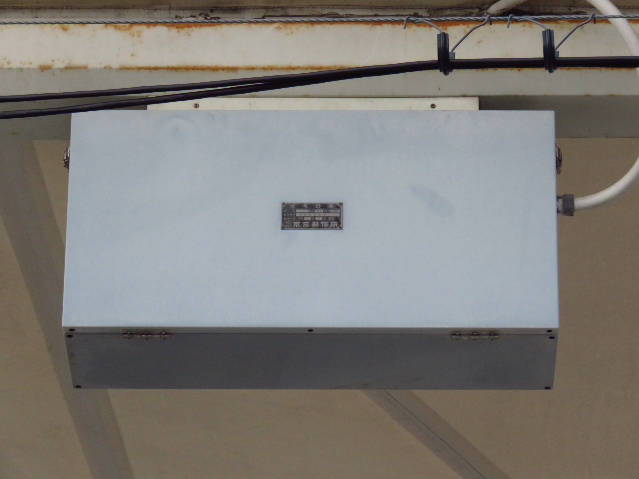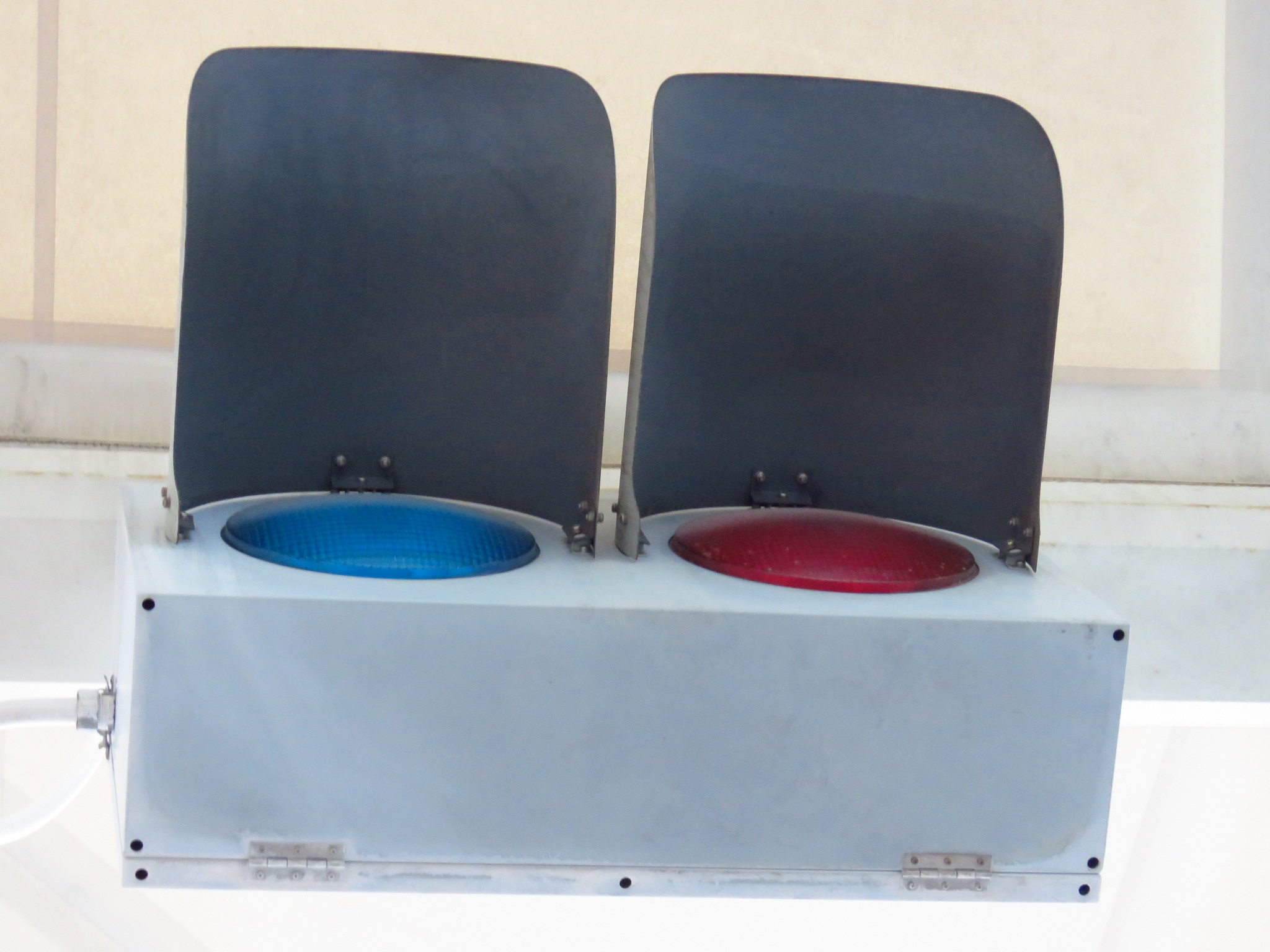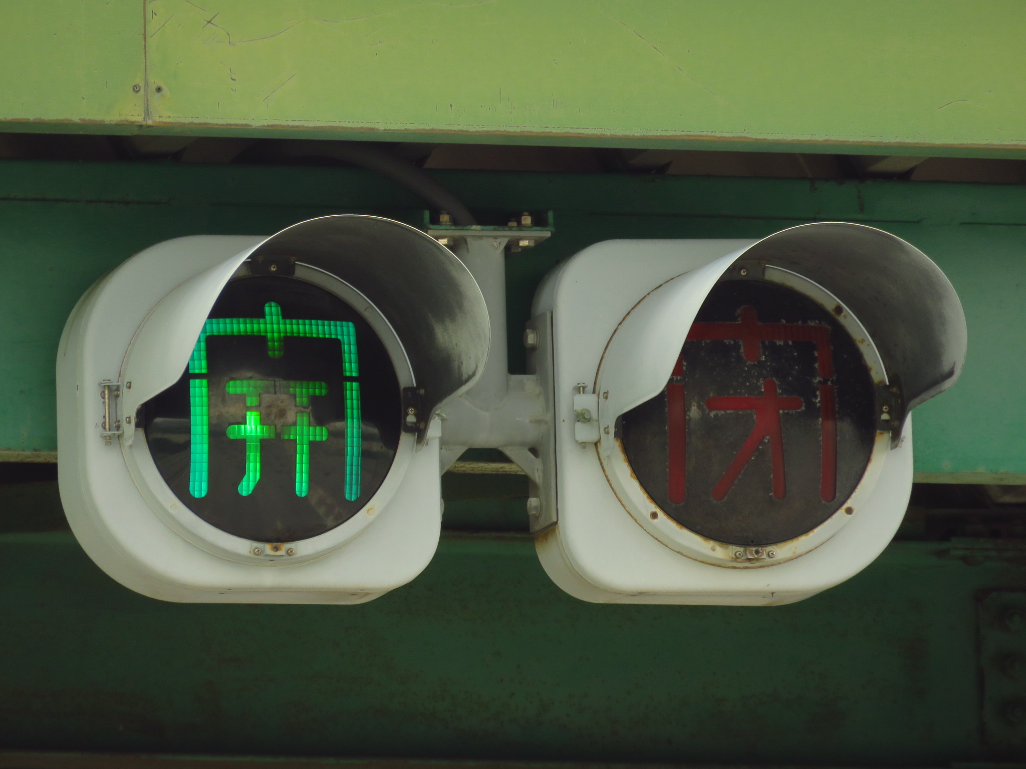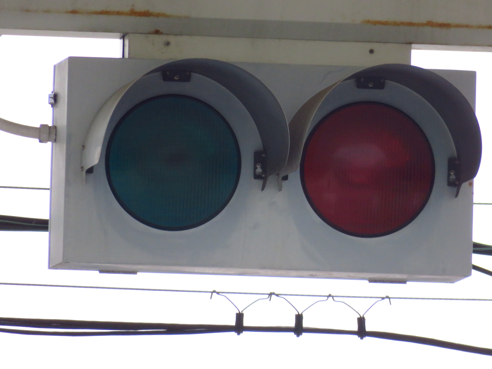 有料道路料金所の信号灯として小糸鉄板灯器が使用されています。青レンズに「開」、赤レンズに「閉」のマスクがつけられています。それぞれの方向に3機ずつ設置されていて、両サイドが赤、真ん中が青点灯になっています。銘板も「ゲート用信号灯器」という珍しい病気になっています。