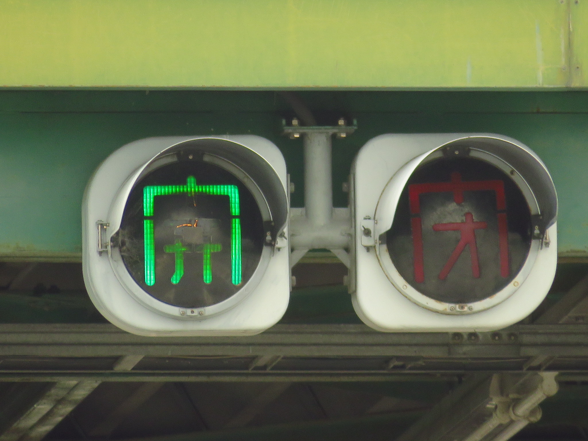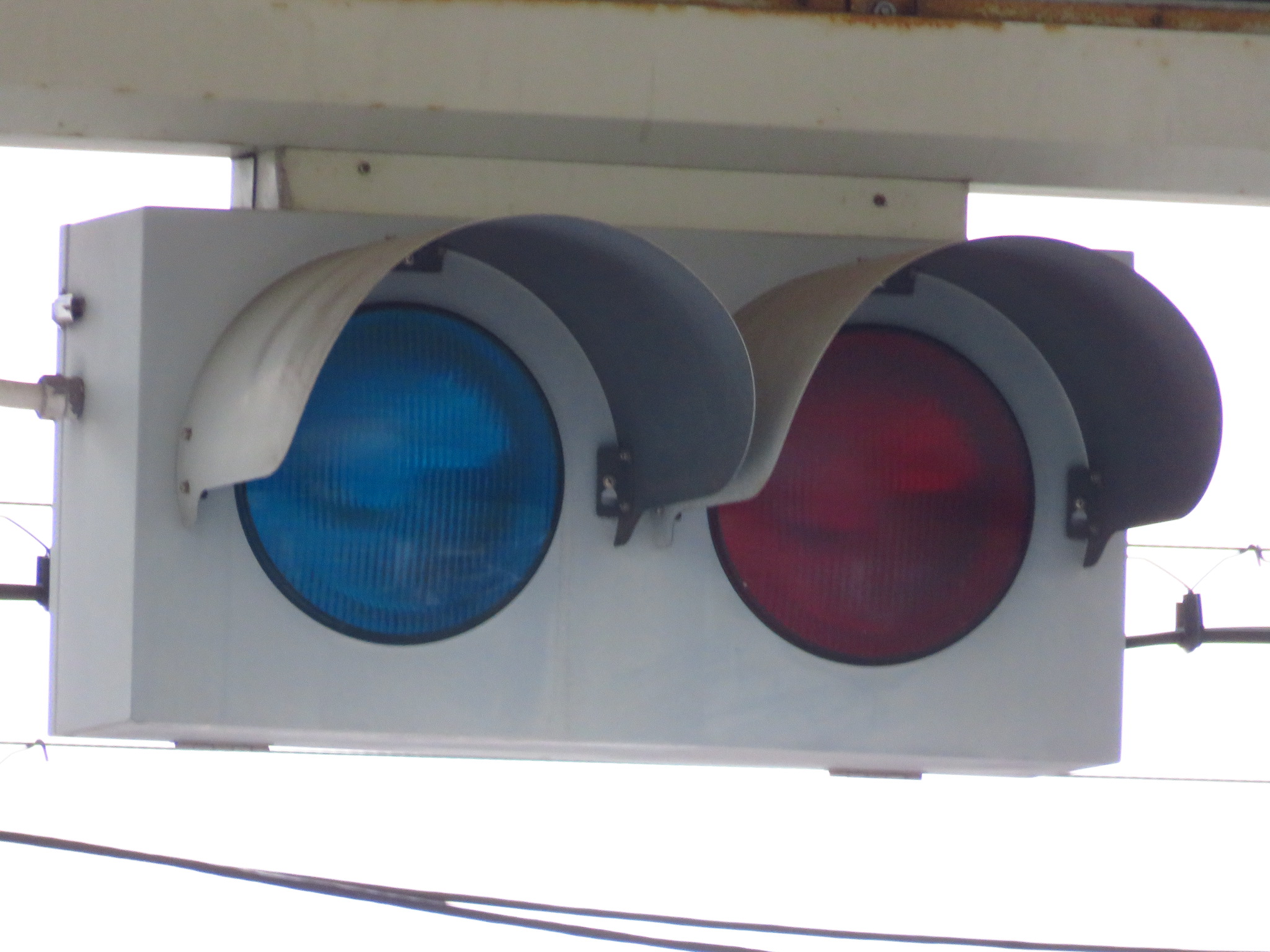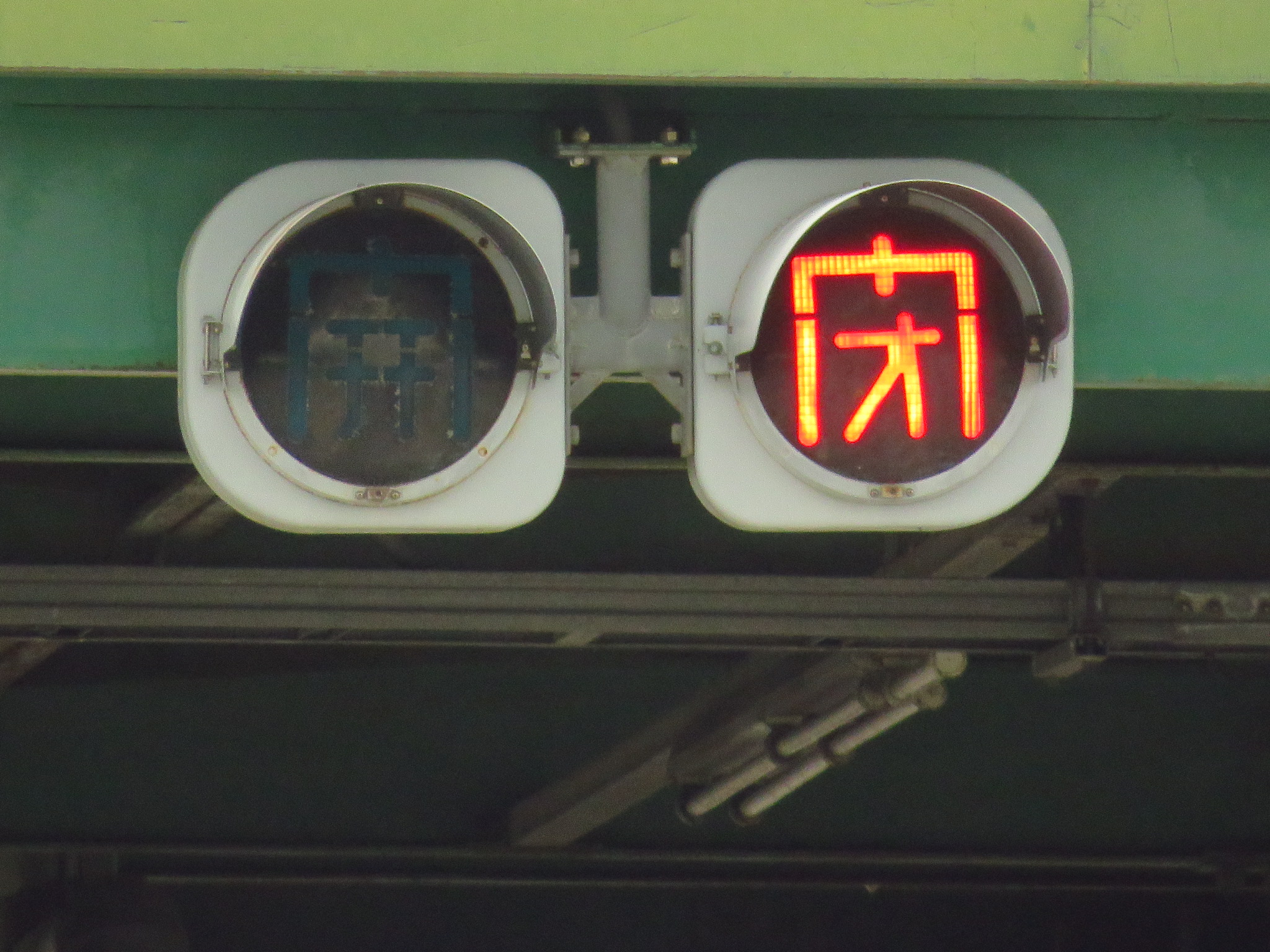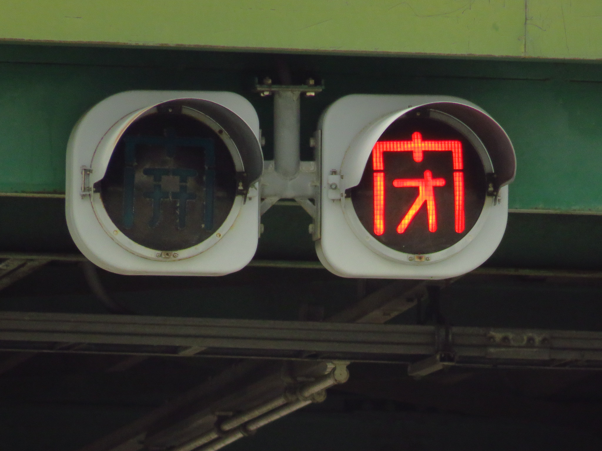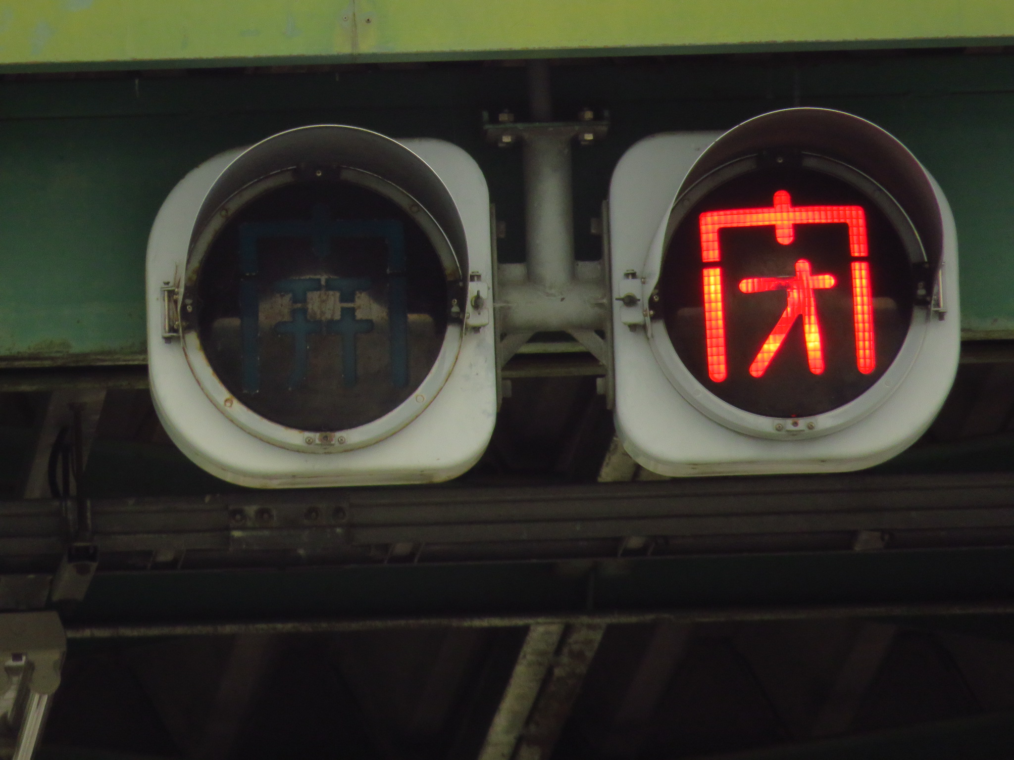 大阪では滅多に見られない変則配列灯器が東淀川にもありました。サイクルは右赤点滅⇄右赤点灯で左赤、黄はダミーですが、かつては左赤も点灯していたようです。