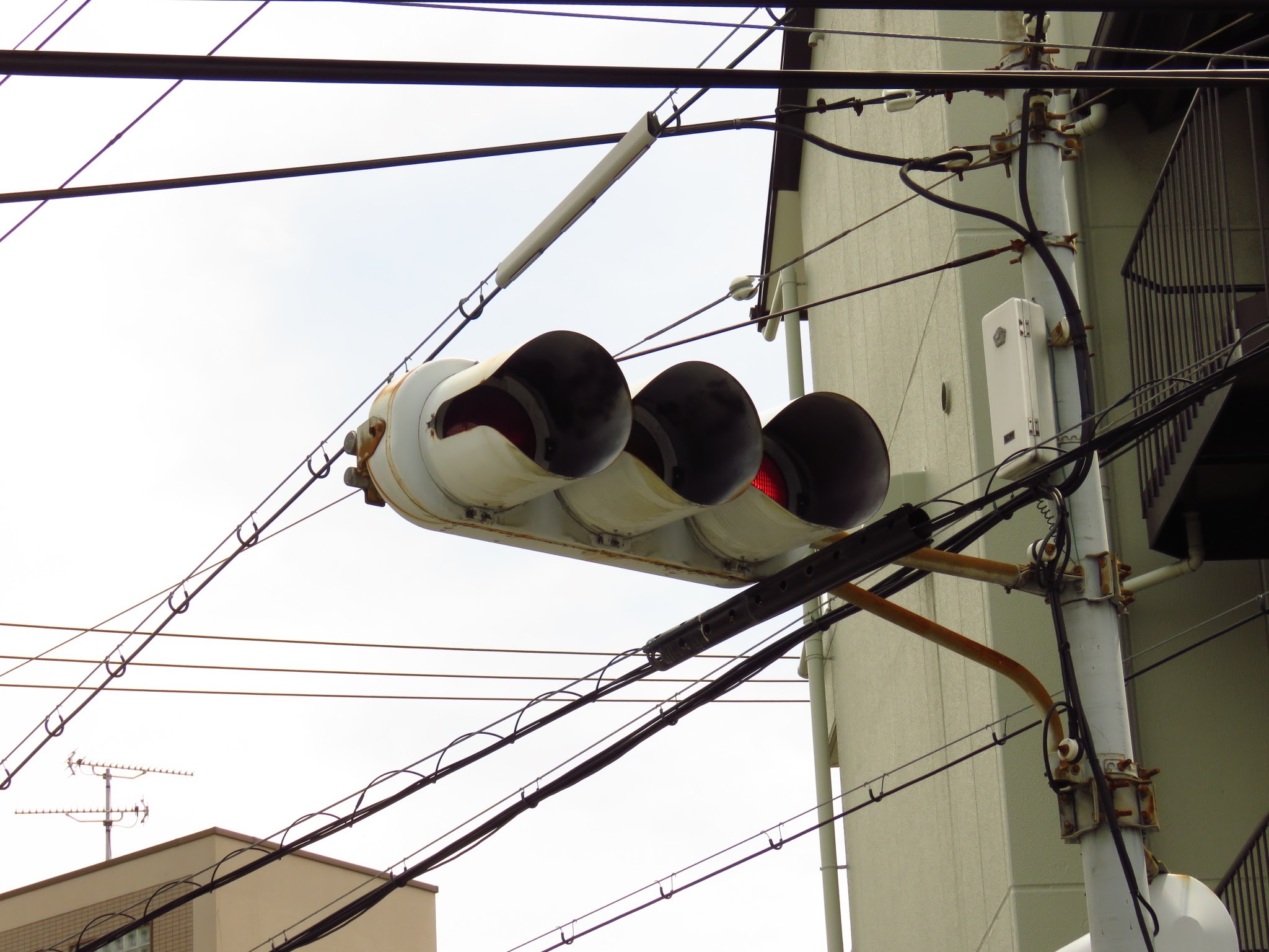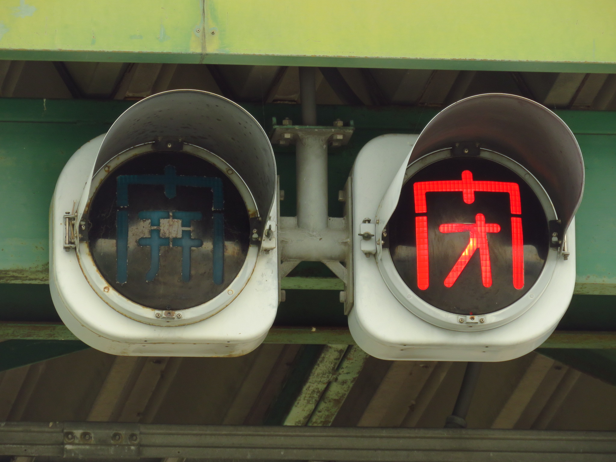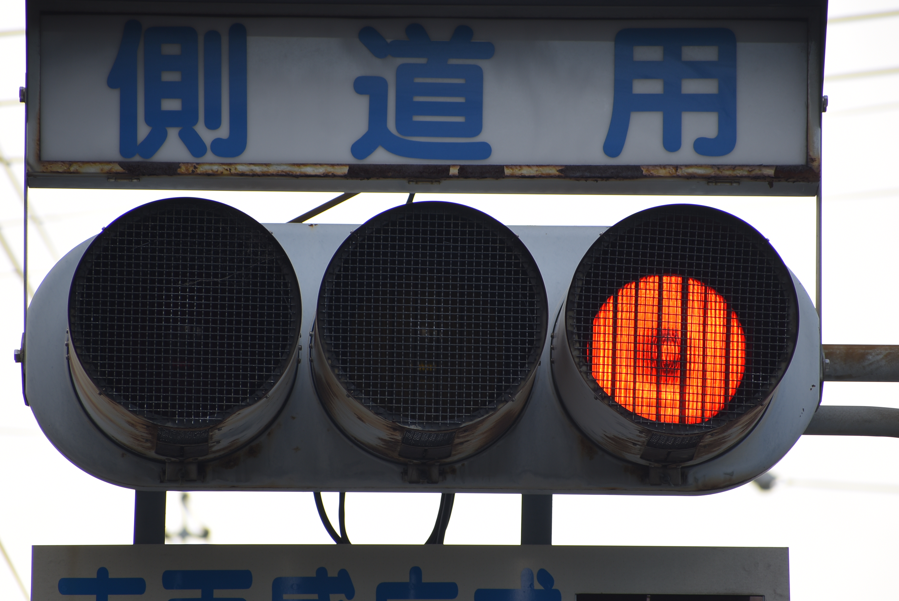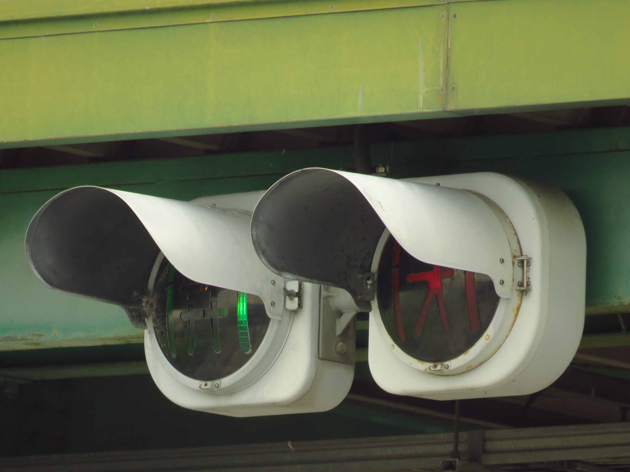 大阪では滅多に見られない変則配列灯器が東淀川にもありました。サイクルは右赤点滅⇄右赤点灯で左赤、黄はダミーですが、かつては左赤も点灯していたようです。