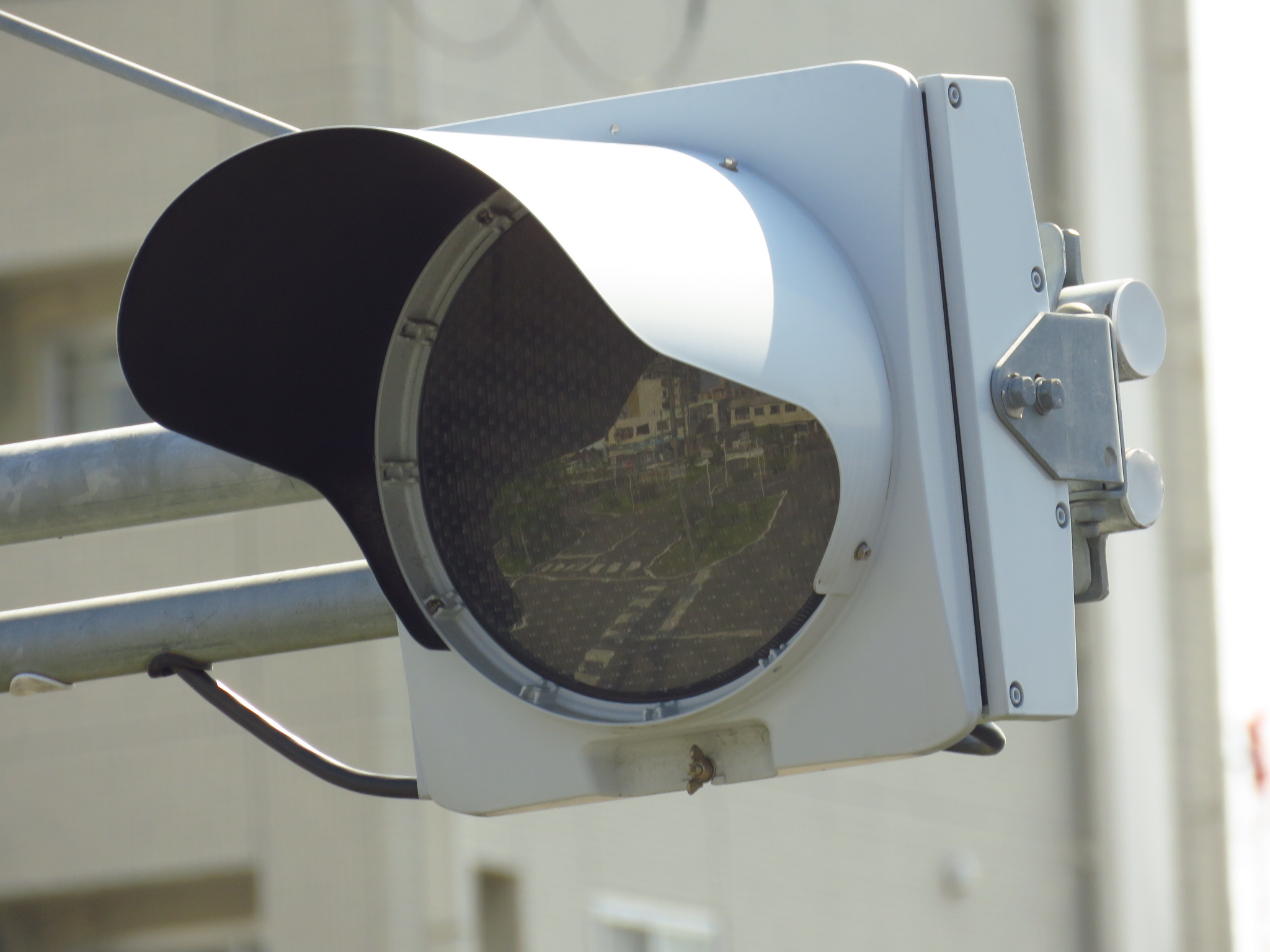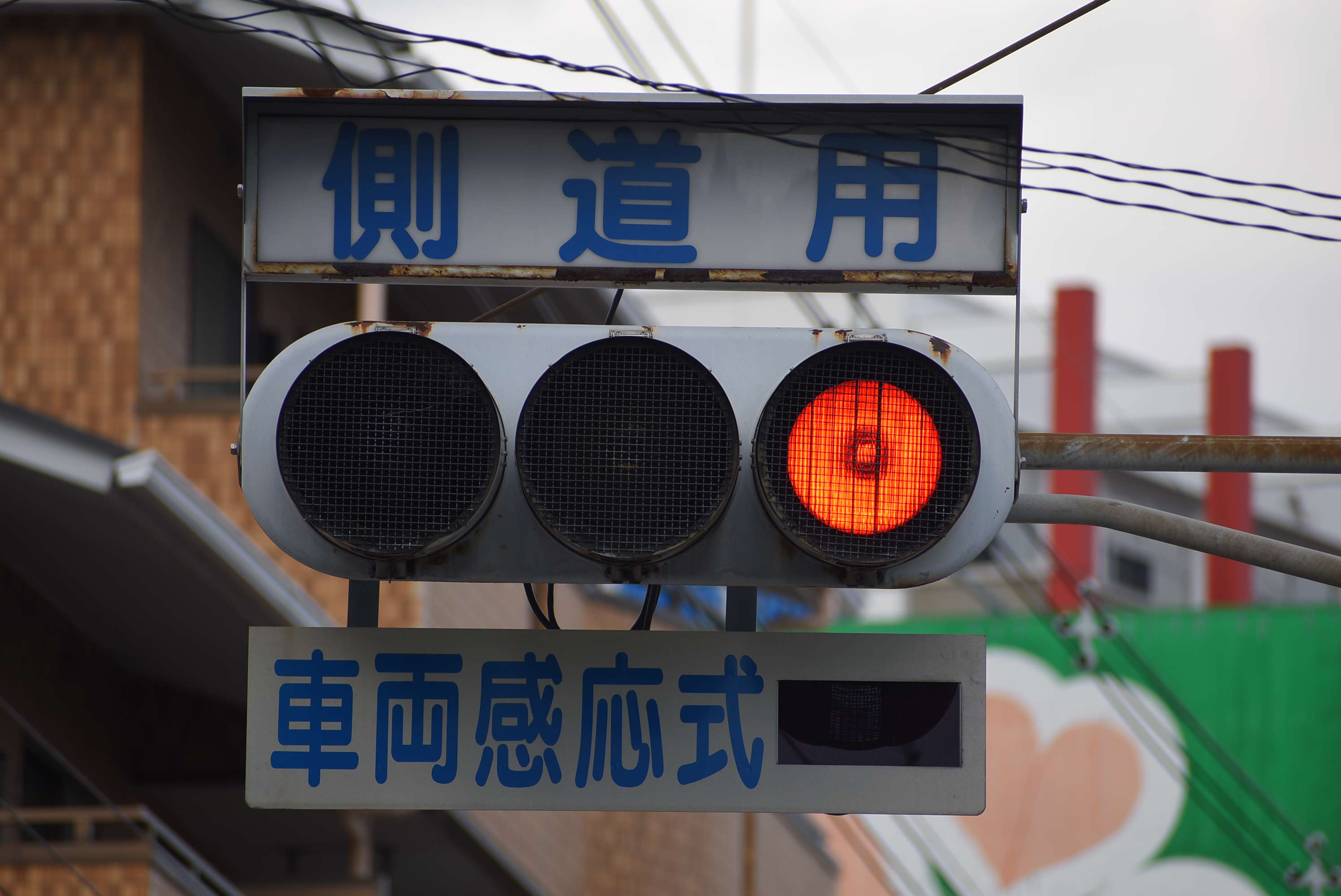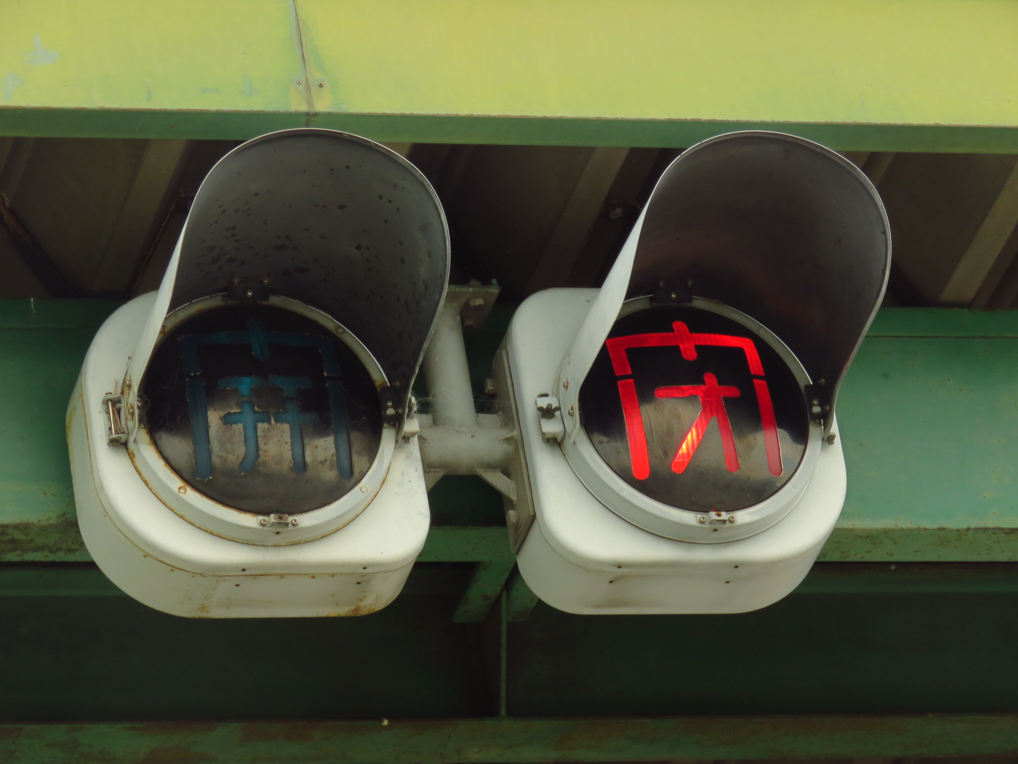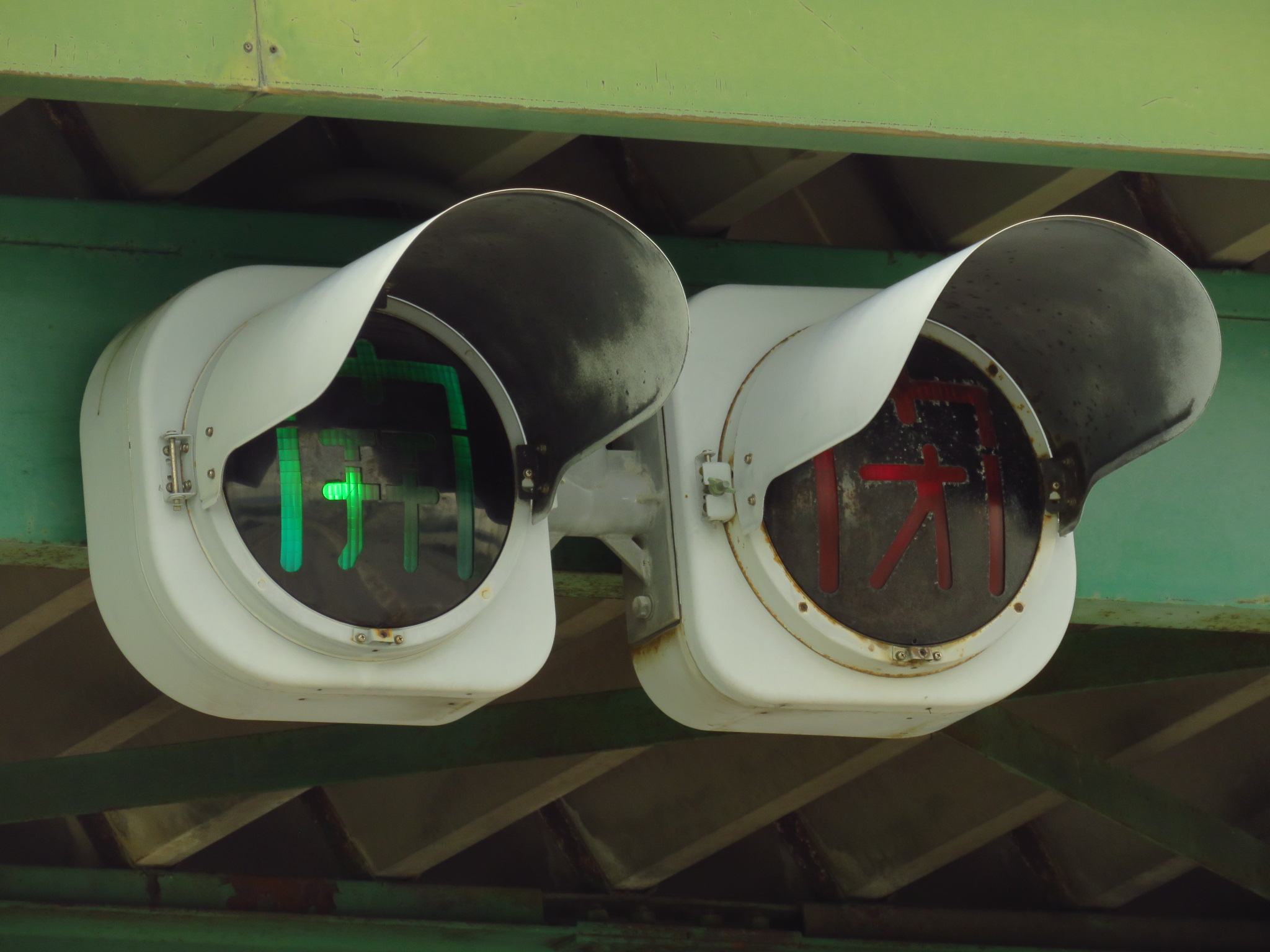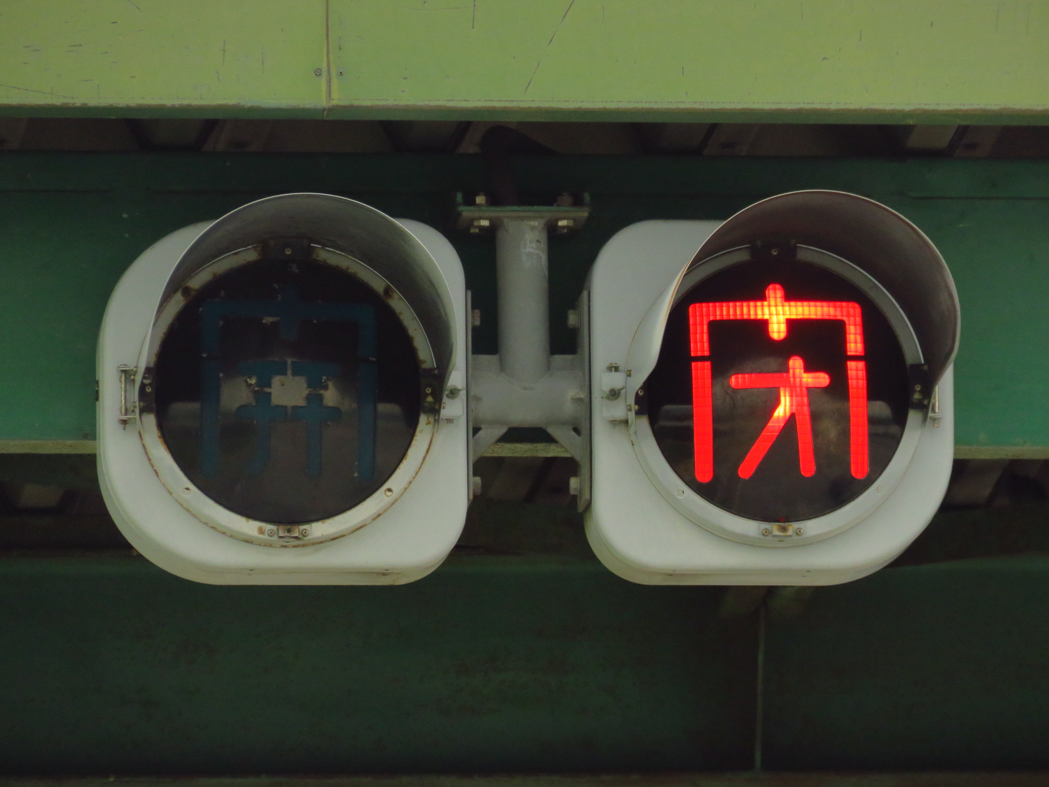 大阪では滅多に見られない変則配列灯器が東淀川にもありました。サイクルは右赤点滅⇄右赤点灯で左赤、黄はダミーですが、かつては左赤も点灯していたようです。