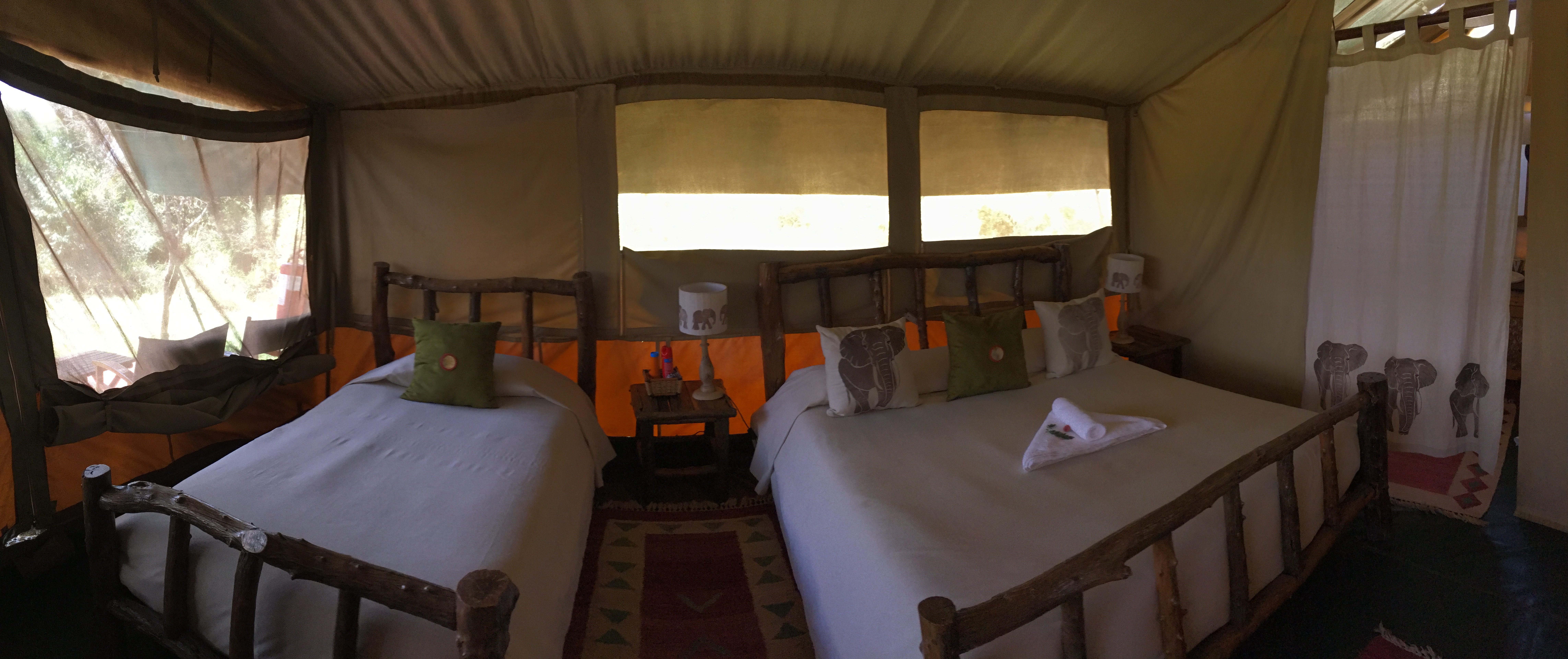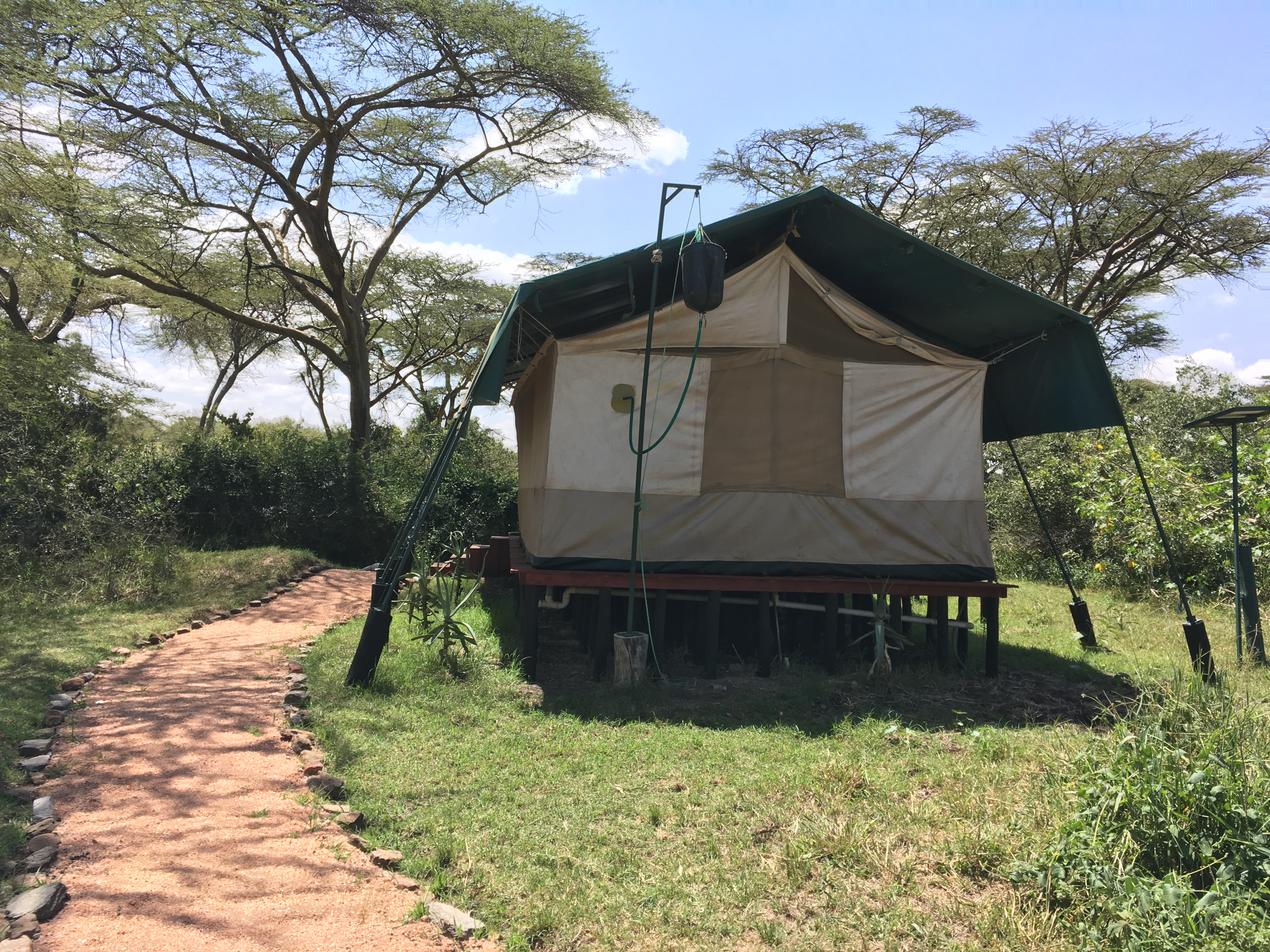 Everything about it was eco-friendly. No plastic water bottles - instead fresh, filtered water came from recycled wine bottles. The shower was heated water poured into a small tank outside the tent. The camp was not fenced off, so nature would pass through at night - you really feel in the middle of the wild when you hear elephant walking by the tent or hearing about the other wildlife that walked through the camp.