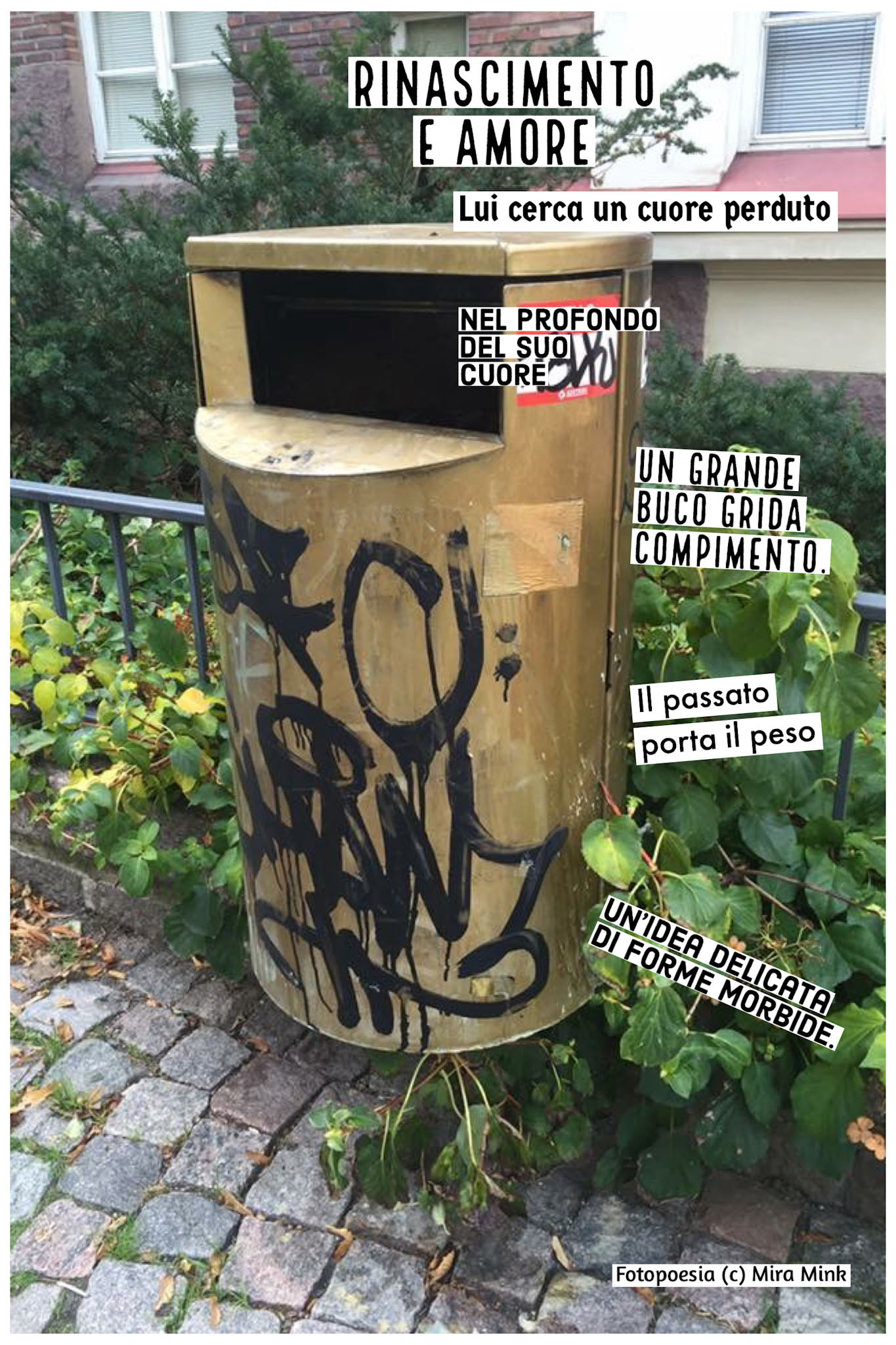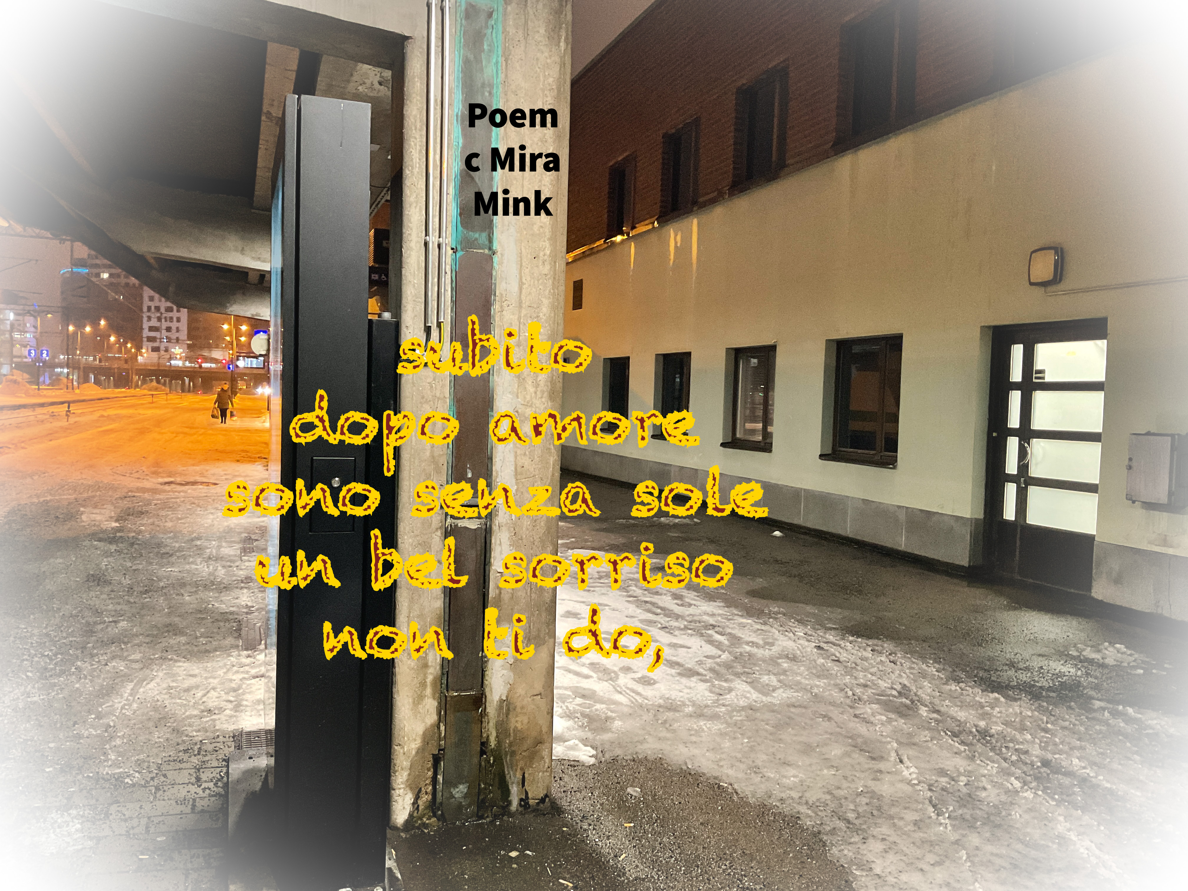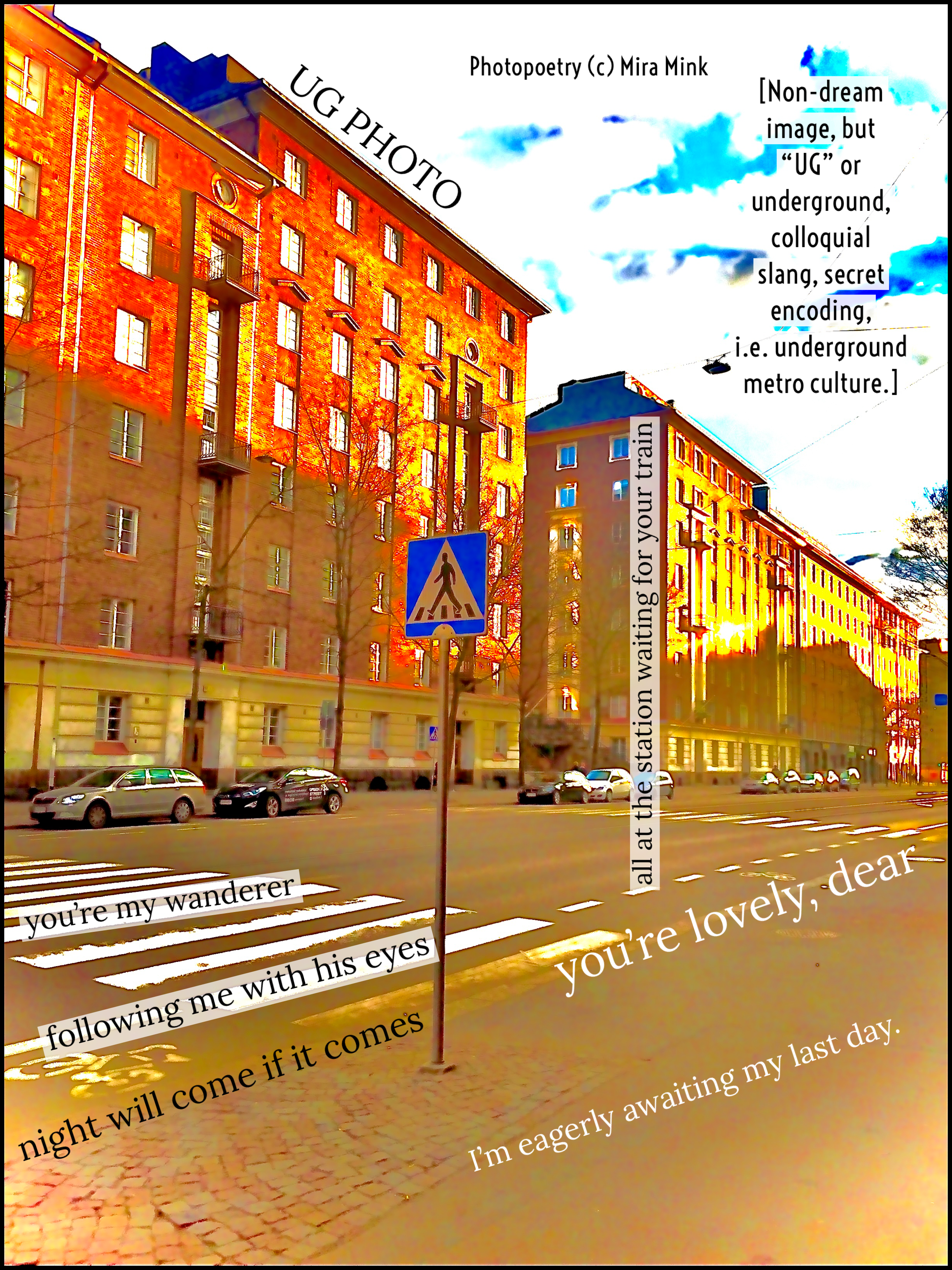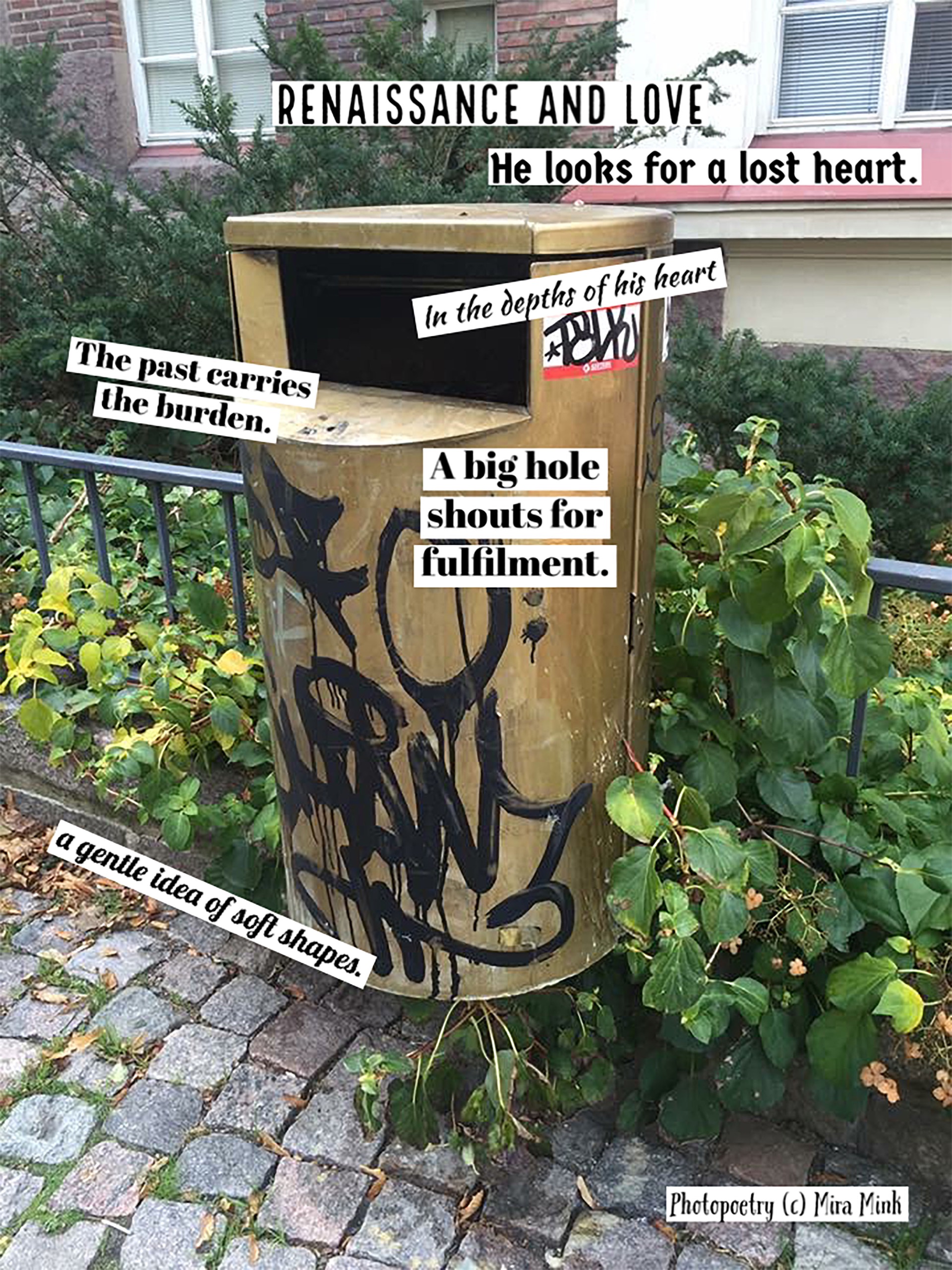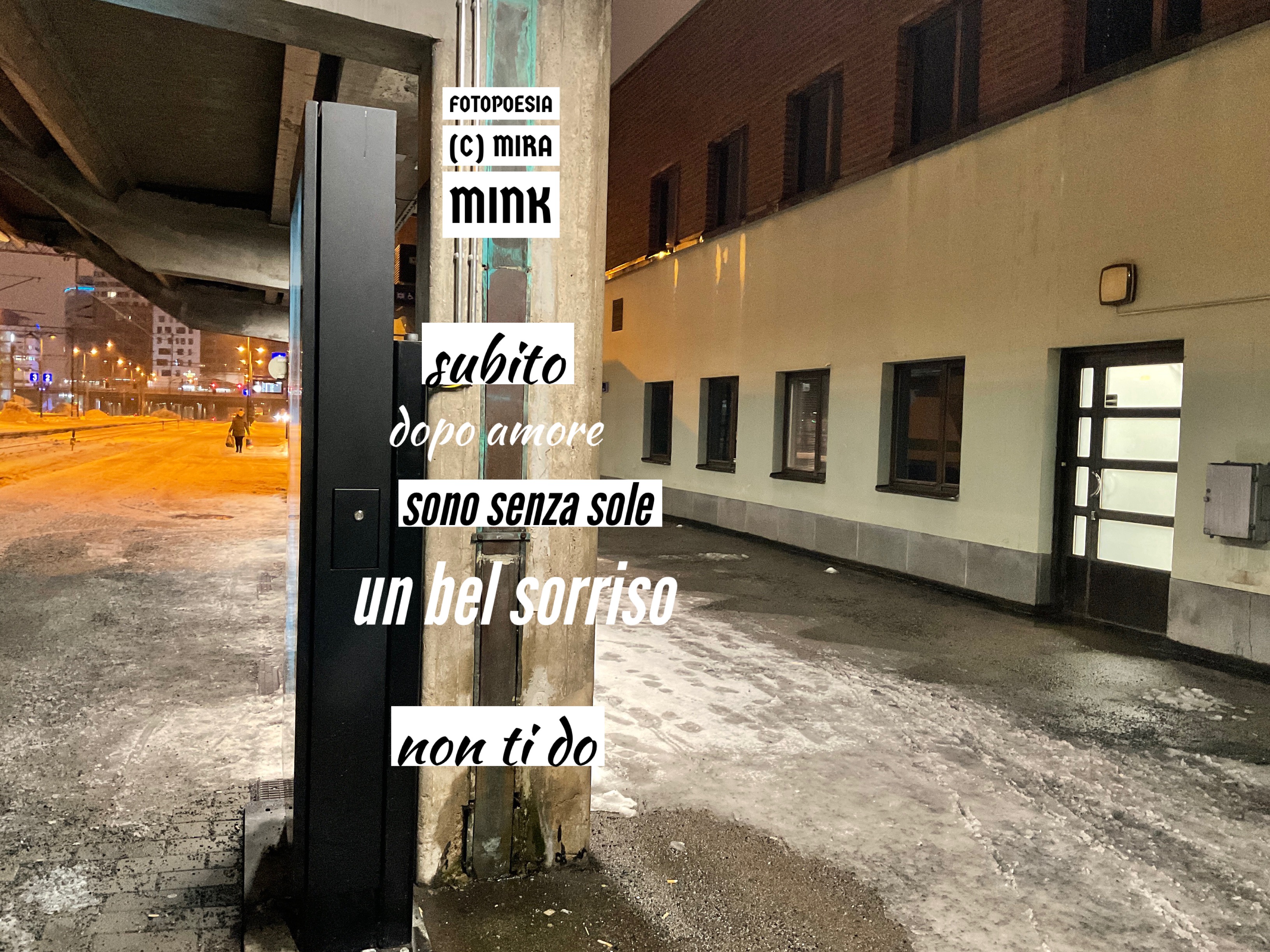 8.11.-13.11.21, Kalliolan setlementtitalon Mutterigalleria, ”Mira Mink Looking for a publisher”(streetart, painting and photopoetry)