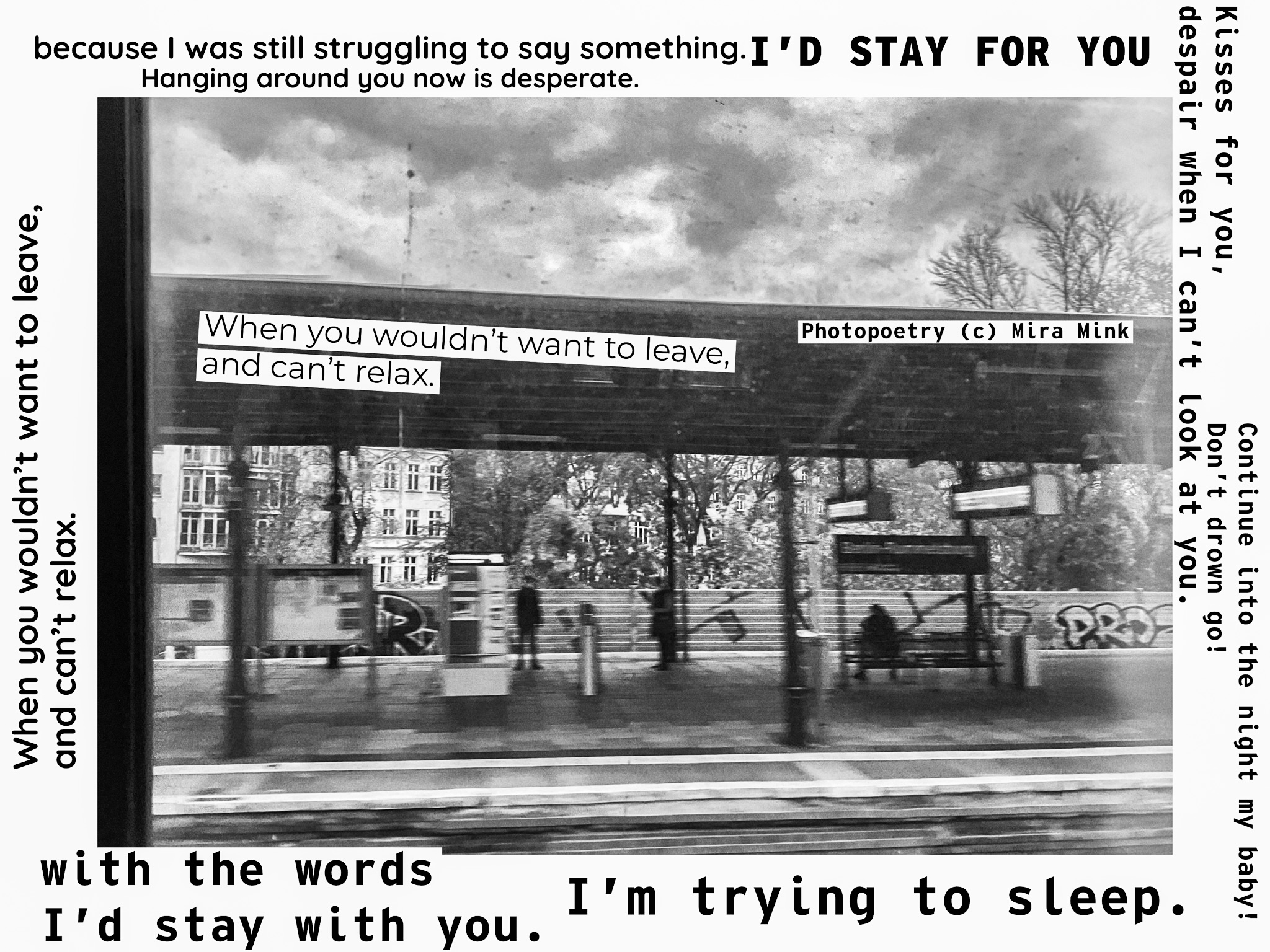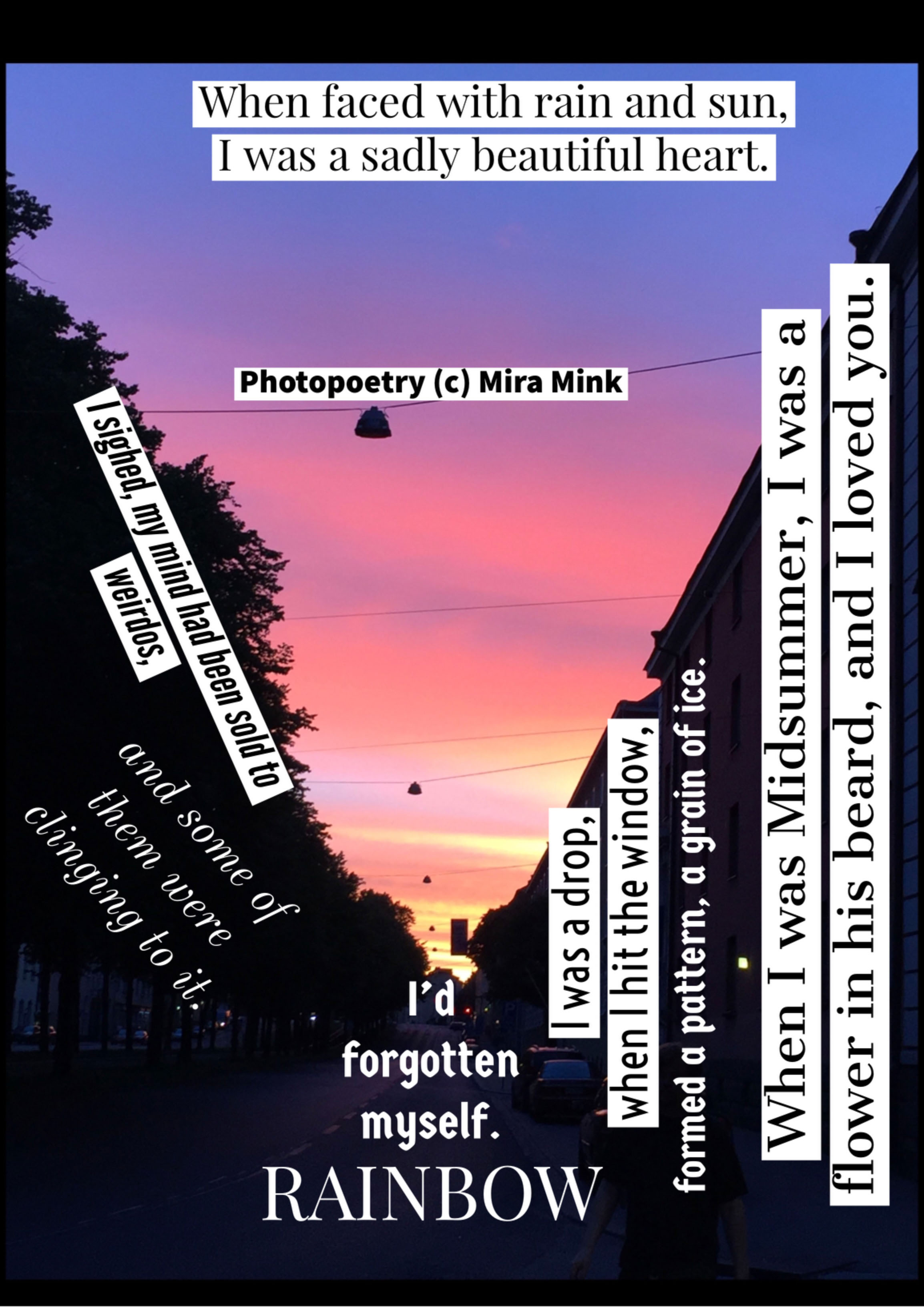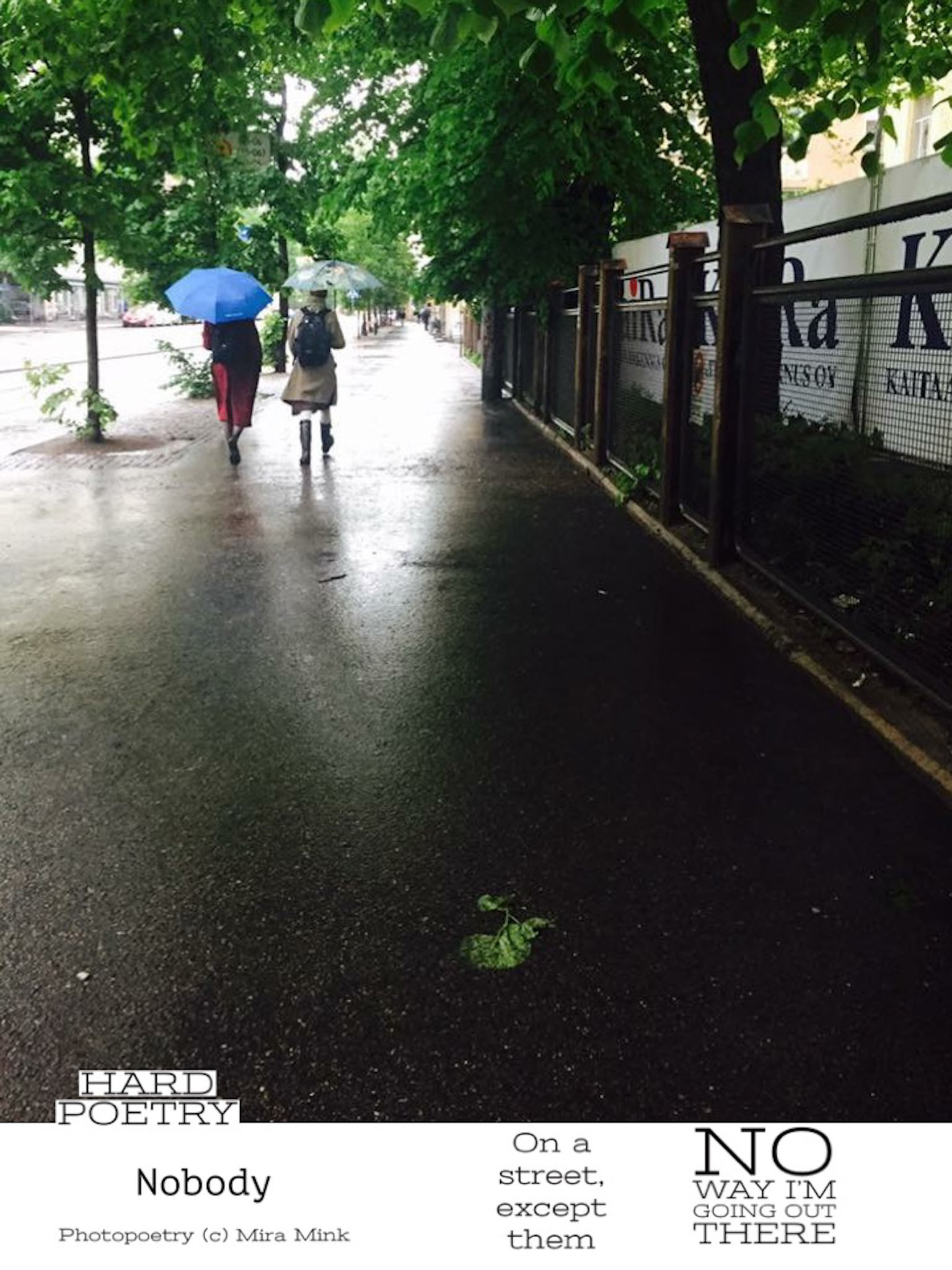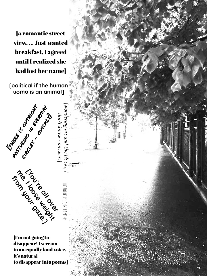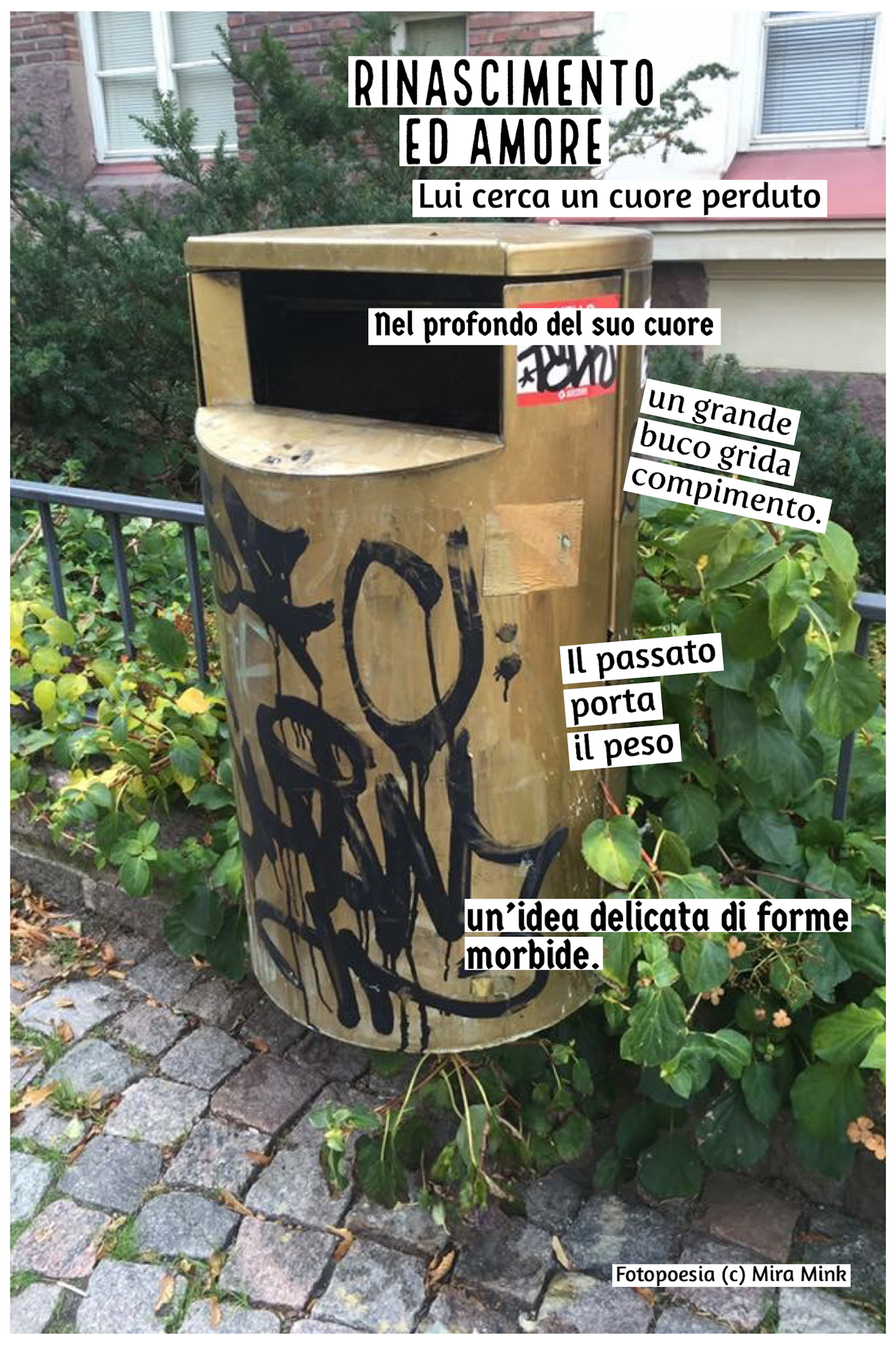 8.11.-13.11.21, Kalliolan setlementtitalon Mutterigalleria, ”Mira Mink Looking for a publisher”(streetart, painting and photopoetry)