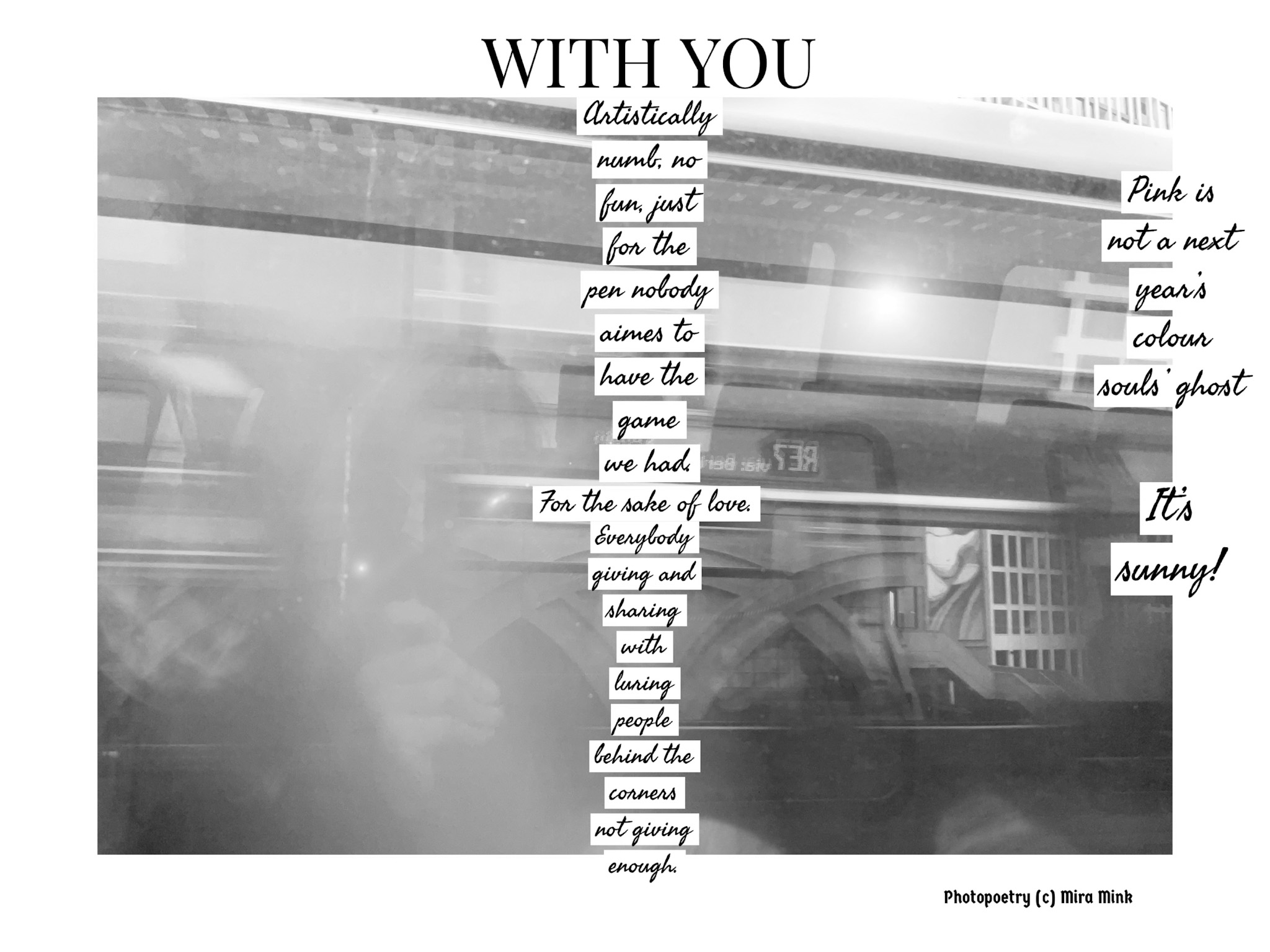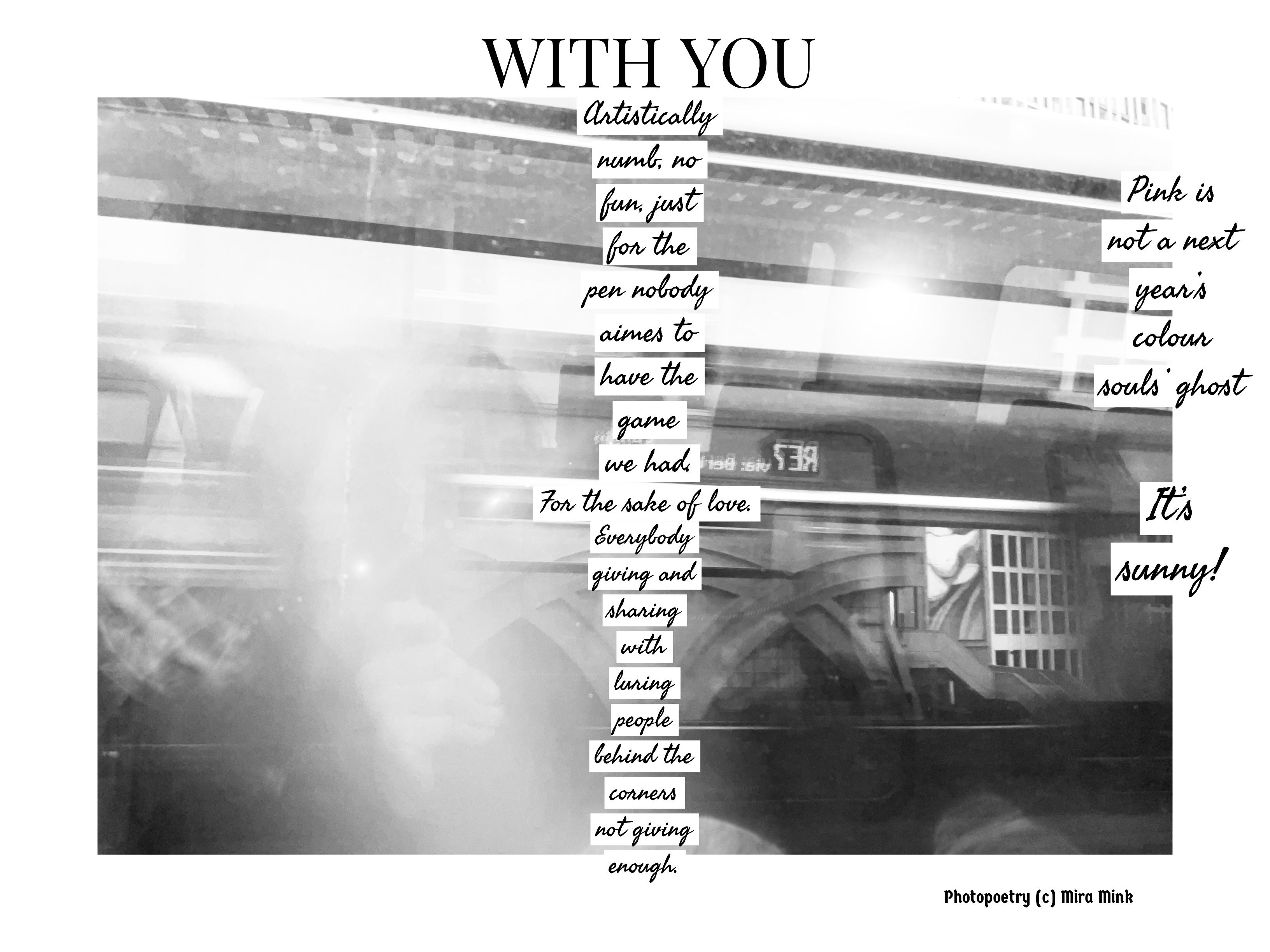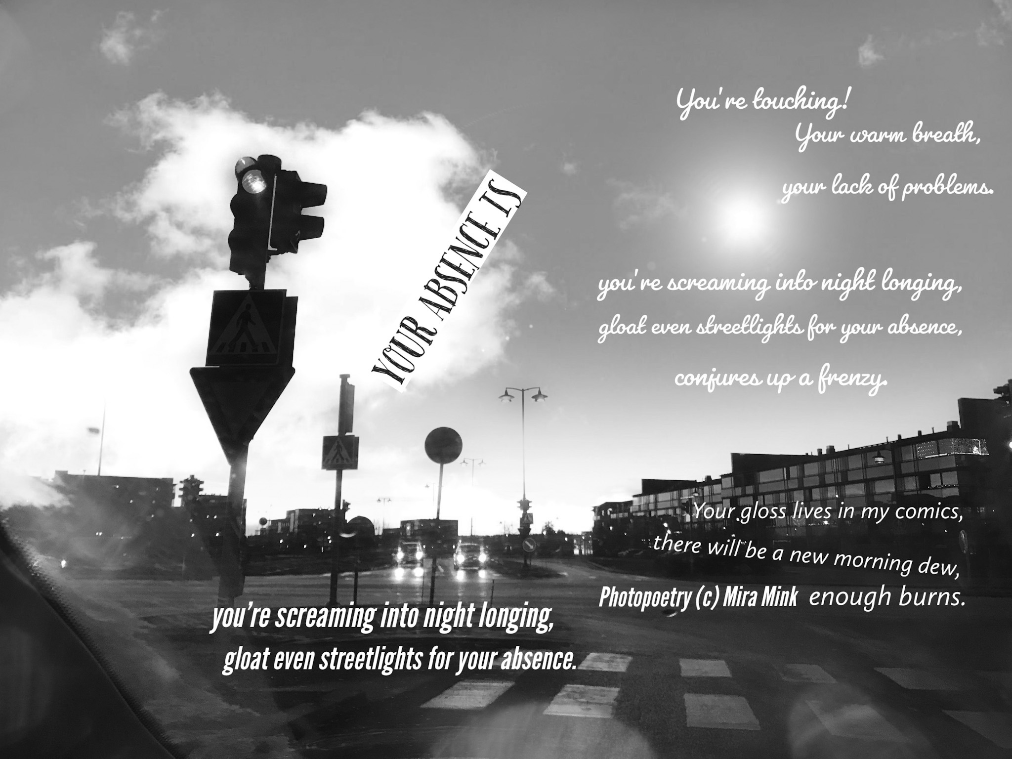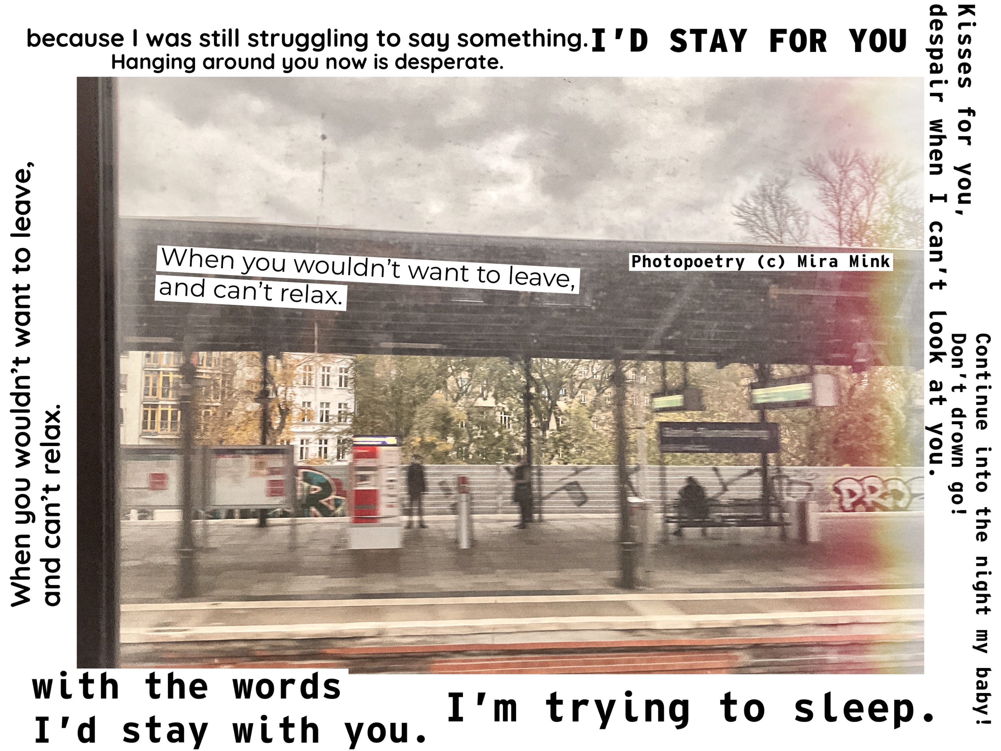 8.11.-13.11.21, Kalliolan setlementtitalon Mutterigalleria, ”Mira Mink Looking for a publisher”(streetart, painting and photopoetry)