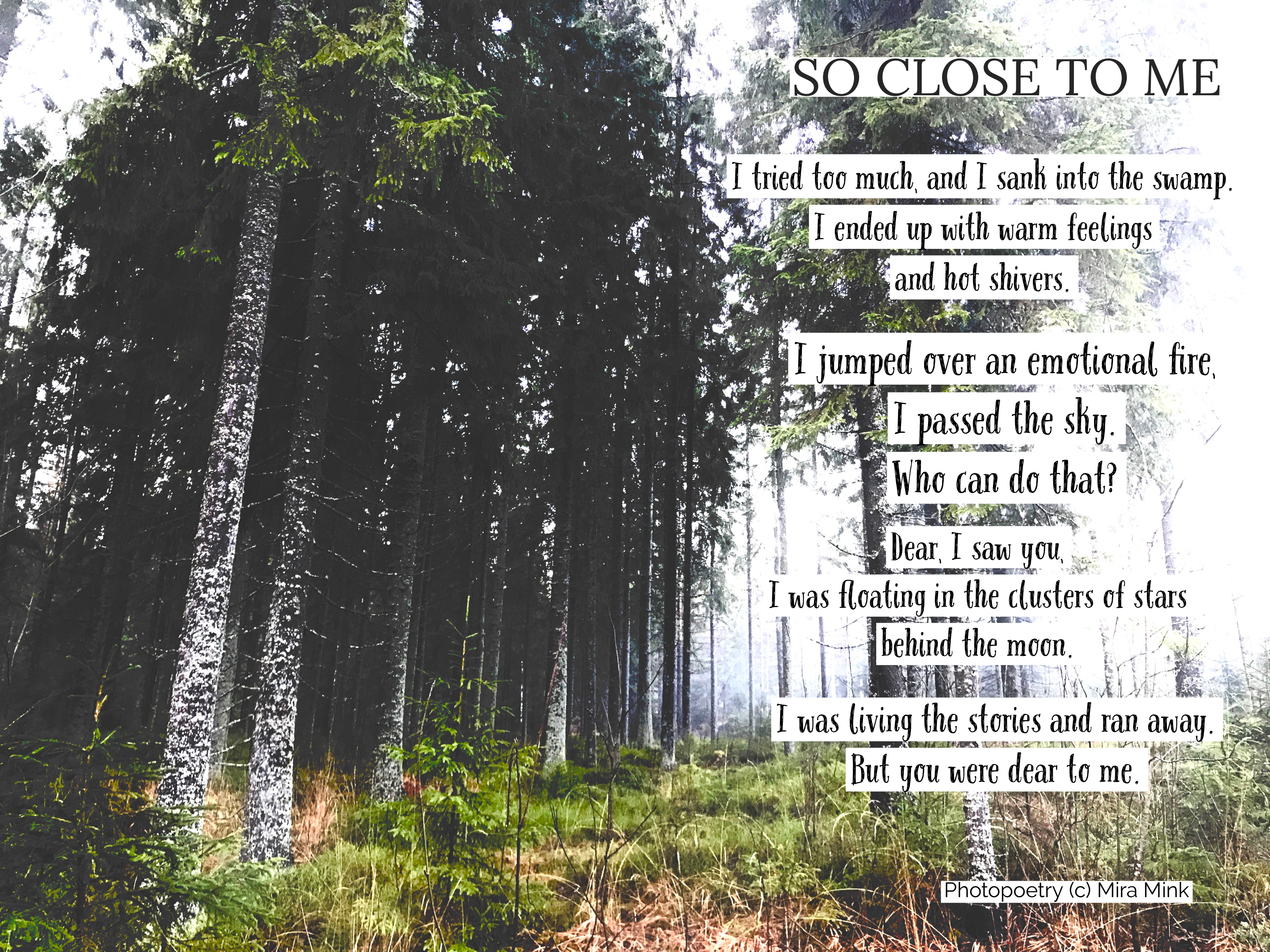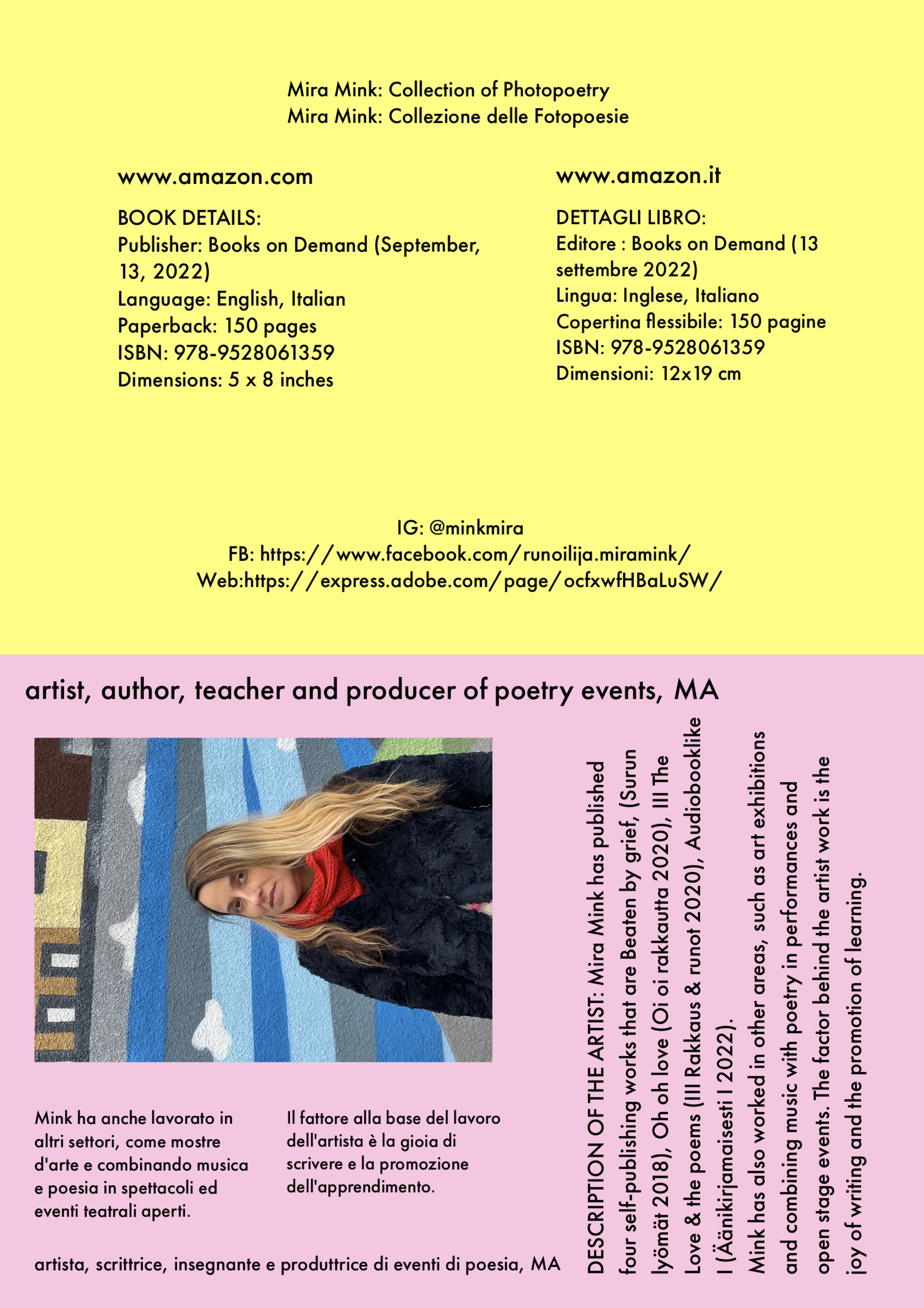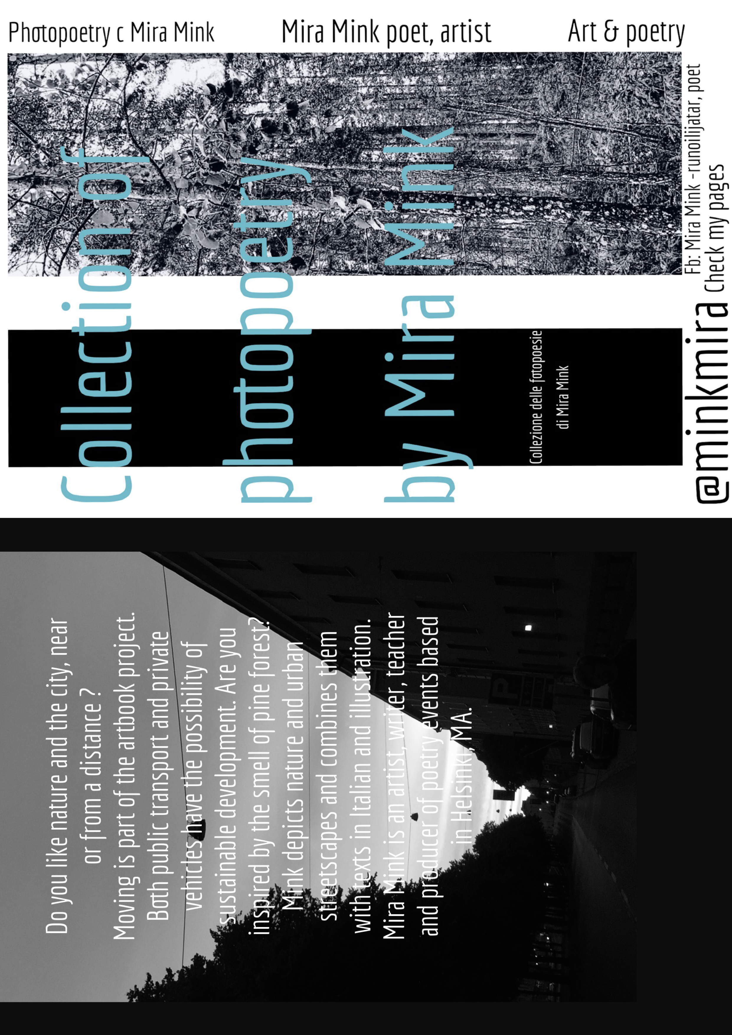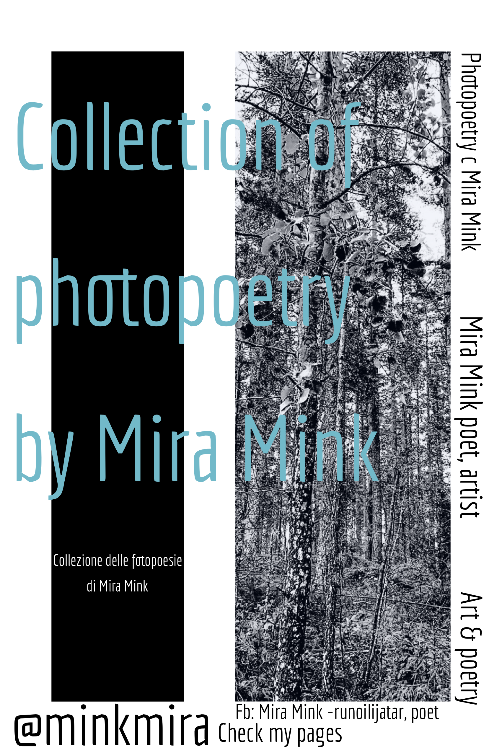 Mira Mink è un'artista di Helsinki, (FIN) scrittrice, insegnante e produttrice di eventi di poesia, MA (Università di Helsinki). Mira Mink ha pubblicato quattro lavori di auto-pubblicazione, l'ultimo si chiama Audiobooklike I 2022. Mira Mink è un nome d'artista di Mirka Leppänen. Le opere originali sono Battuti dal dolore, (Surun lyömät 2018), Oh oh amore (Oi oi rakkautta 2020), III L'amore e le poesie (III Rakkaus & runot 2020).