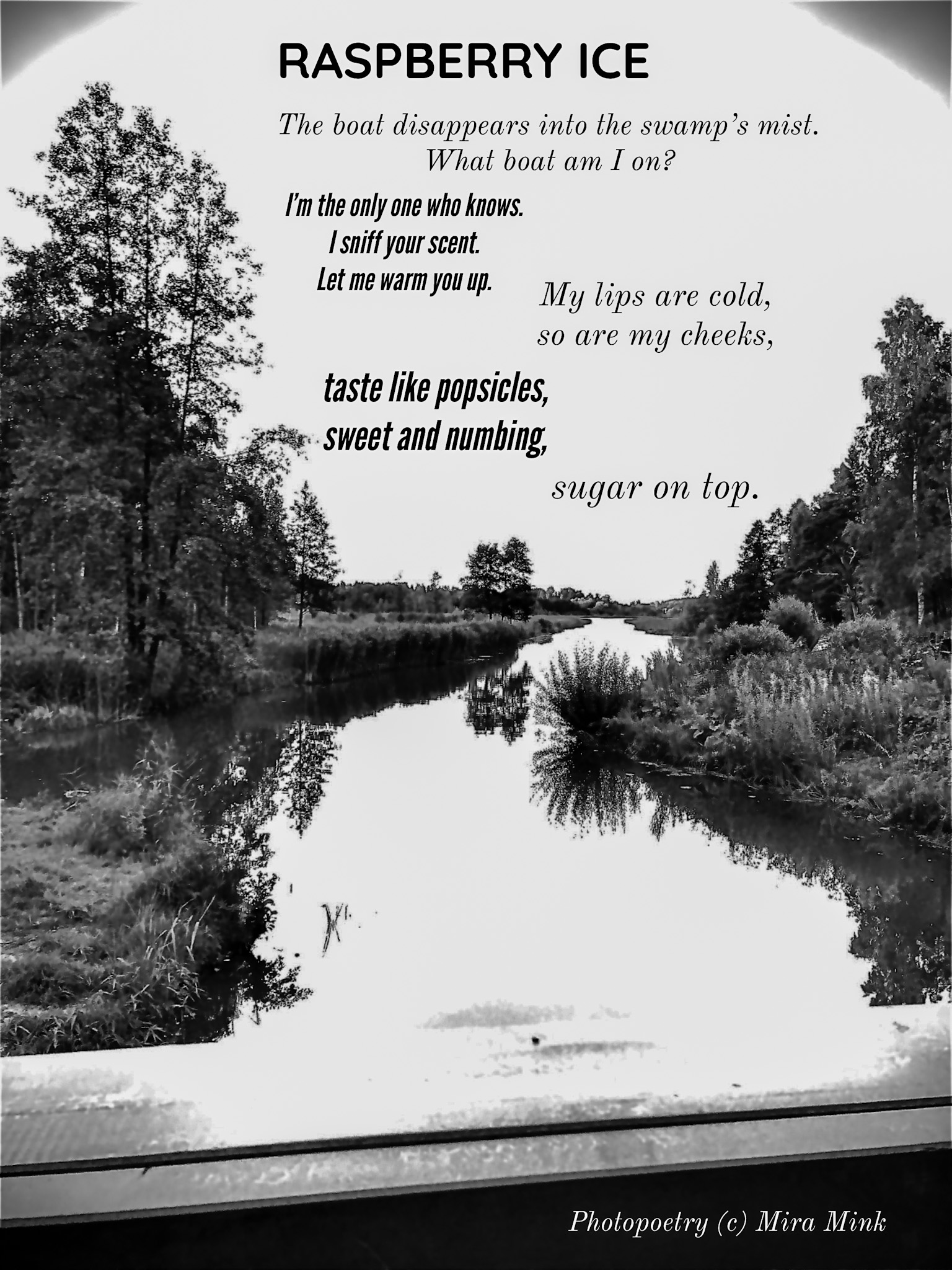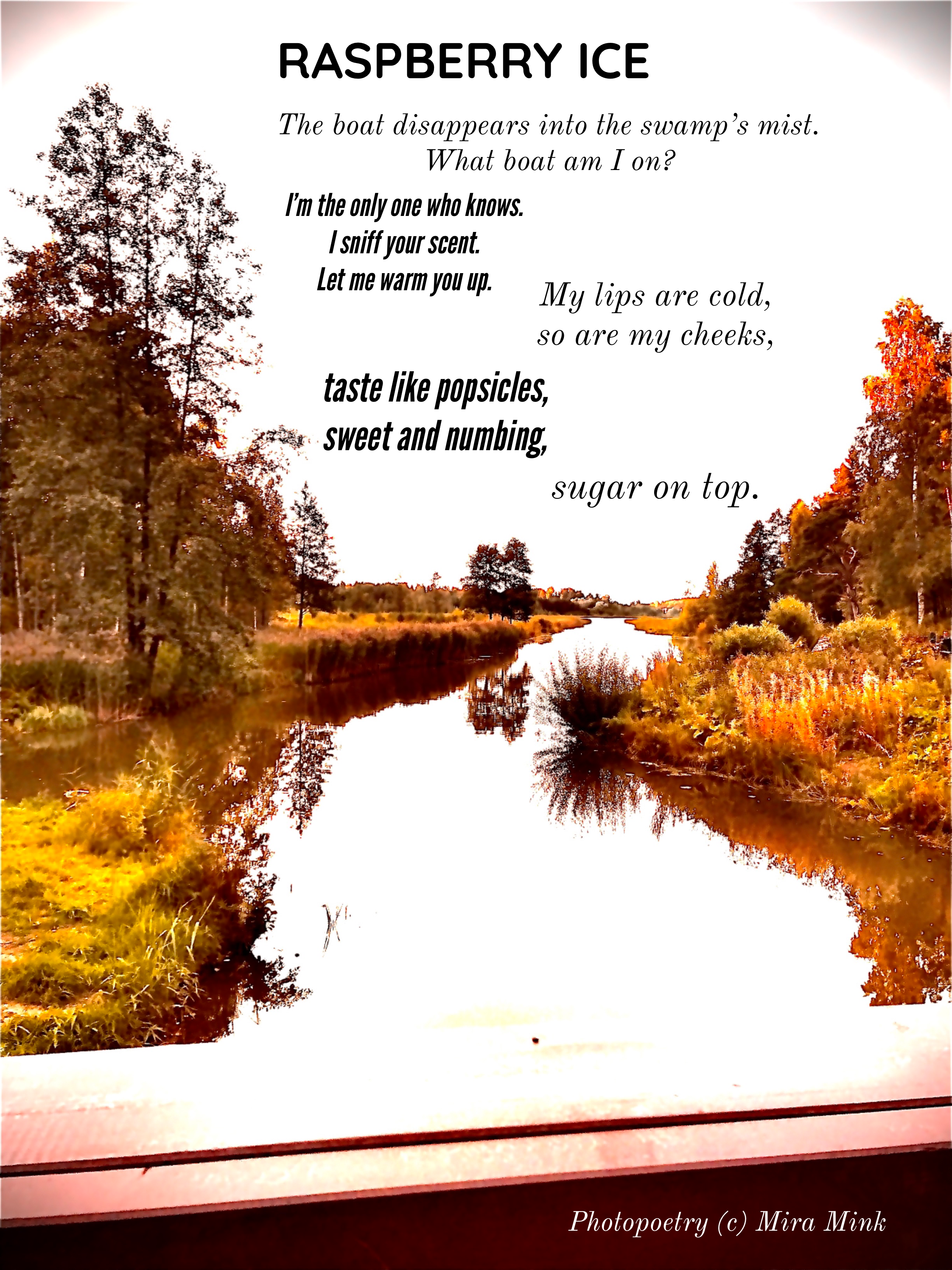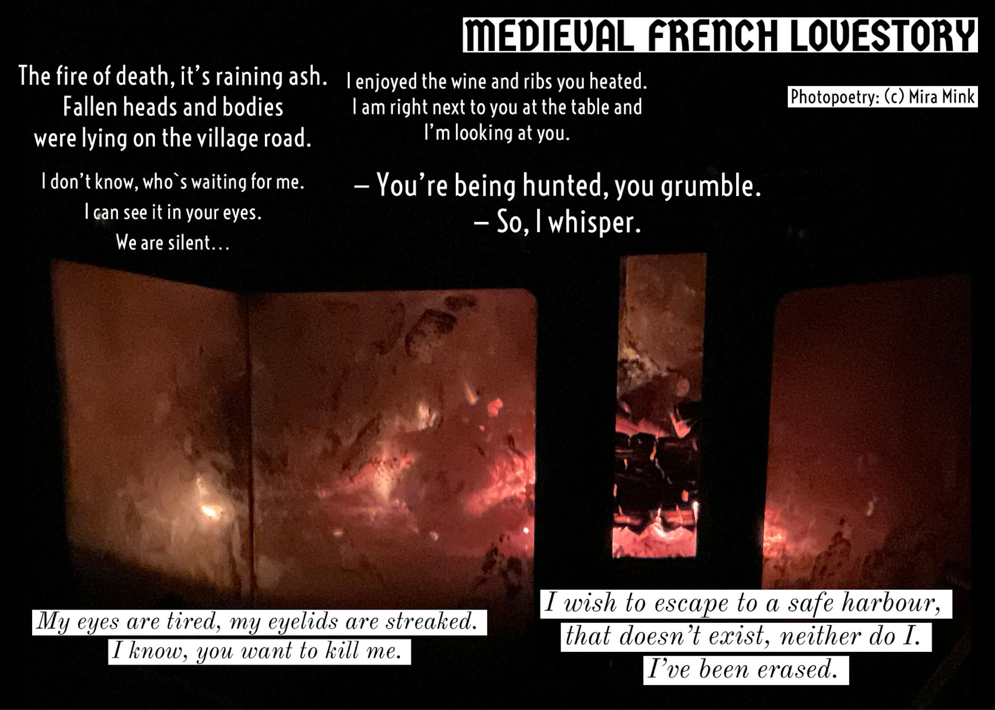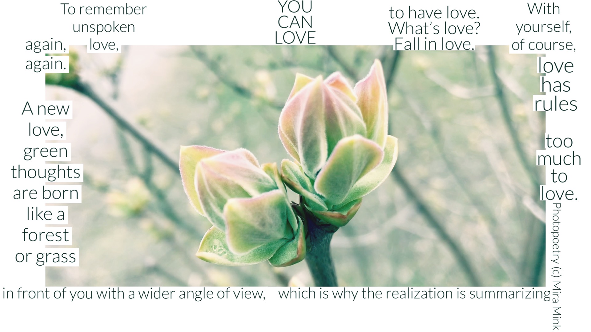 Mira Mink è un'artista di Helsinki, (FIN) scrittrice, insegnante e produttrice di eventi di poesia, MA (Università di Helsinki). Mira Mink ha pubblicato quattro lavori di auto-pubblicazione, l'ultimo si chiama Audiobooklike I 2022. Mira Mink è un nome d'artista di Mirka Leppänen. Le opere originali sono Battuti dal dolore, (Surun lyömät 2018), Oh oh amore (Oi oi rakkautta 2020), III L'amore e le poesie (III Rakkaus & runot 2020).