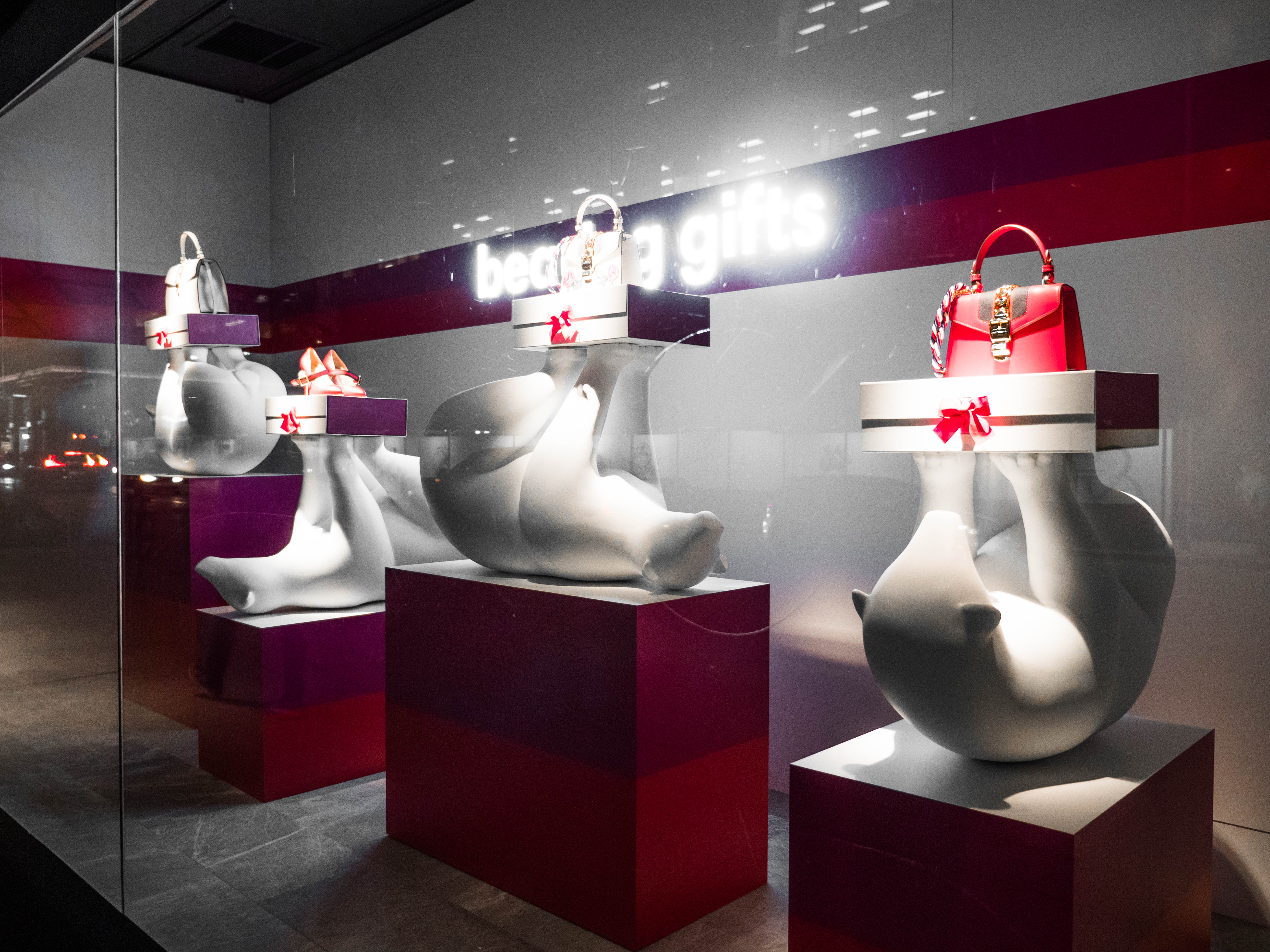 Holt Renfrew contacted BGI Retail after a referral from one of BGI's largest clients. They were interested in partnering with a total solutions provider that could produce and install their 2017 Holiday campaign “Bearing Gifts”. The design was created by a third party firm and provided to BGI. This design included window displays and in store props for their holiday campaign consisting of sculpted polar bears, backlit LED letters, laminated podiums, large mirror balls, and a lot of custom printed vinyl.