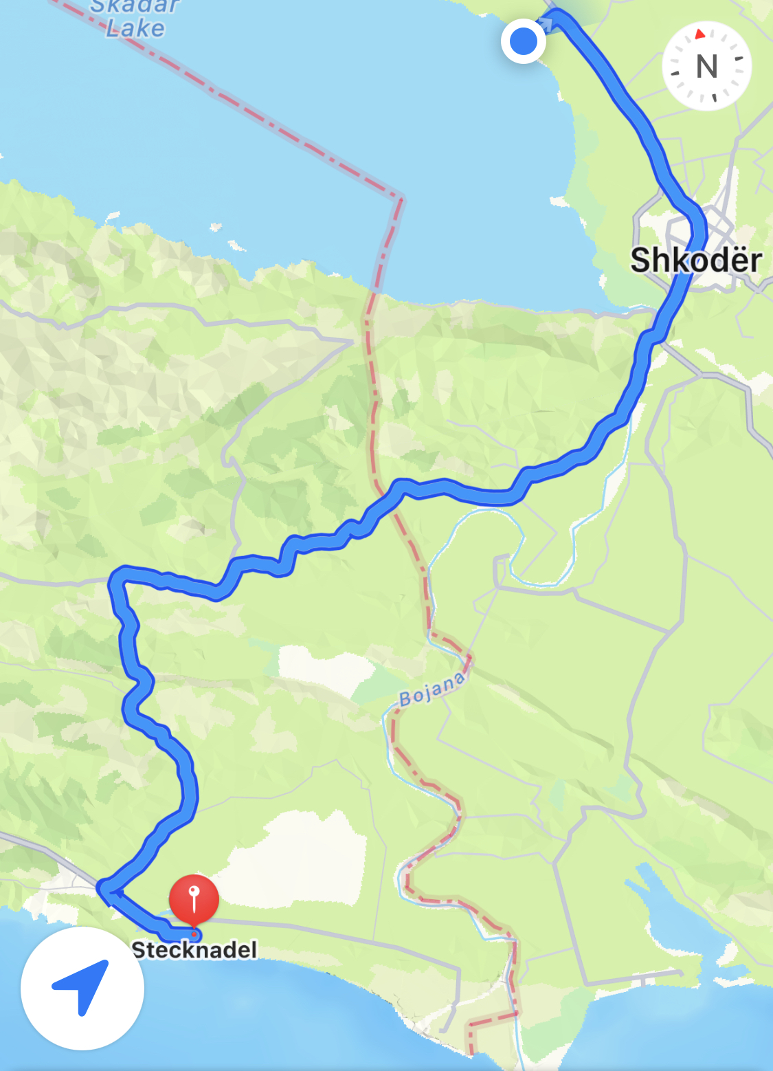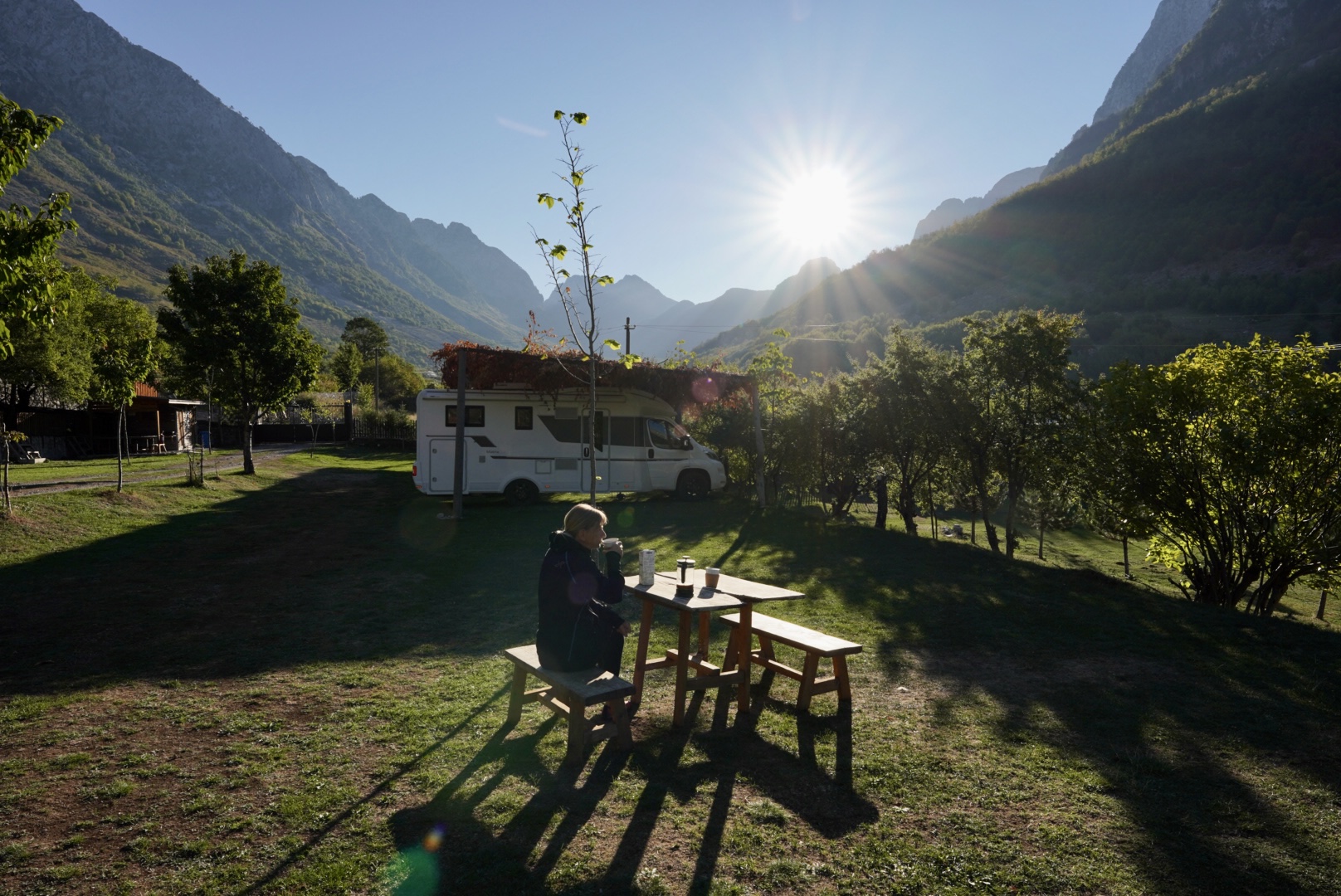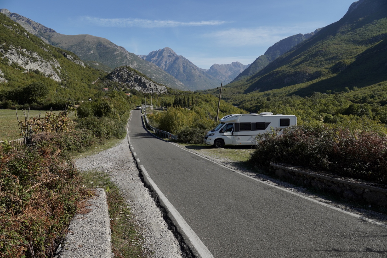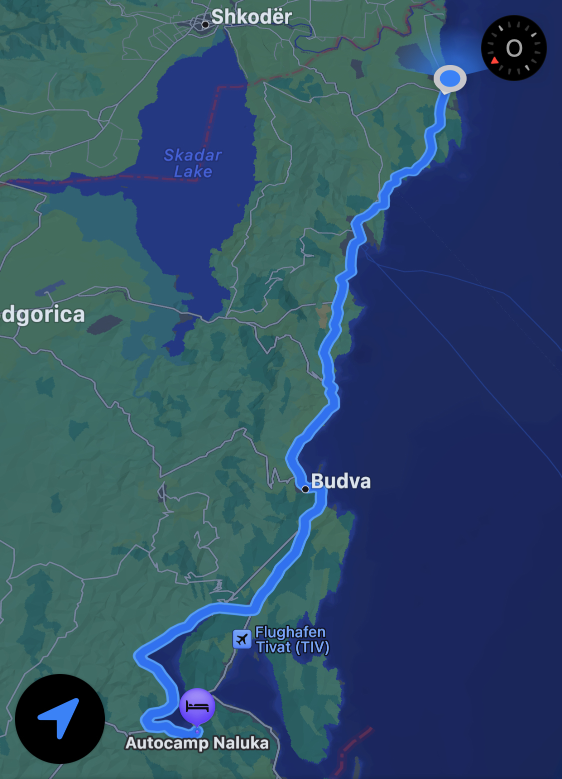 Erwachen im Thethi-Nationalpark. Wir machen nicht lange rum und starten gleich früh 07:15 Uhr. Der frühe Vogel…fährt erstmal 22 Kehren den Berg hoch, genießt am Pass die wunderbare Aussicht und trinkt einen Kaffee nach albanischer Art. Wie türkischer Kaffee aber in albanischer Tasse. Es geht weitere 21 Kehren wieder nach unten, vorbei an Bogë und in Richtung Shkodër. Am Straßenrand beratschlagen wir und entscheiden uns für die Richtung über die SH1 zur Grenze nach Montenegro. Grenzkontrolle, alles gut. 100 Meter weiter werden wir rausgewunken, nochmals Perso und Fahrzeugpapiere, zum Glück nicht den Führerschein, der liegt zu Hause im Ford. Aussteigen und einmal komplett dem Grenzer den Camper zeigen, er sucht nach großen Paketen Koks und Gras, sagt er. Kurzer Smalltalk über das Auto, das Wetter und wo wir hin wollen. Gute Weiterfahrt bekommen wir wirklich freundlich mit auf den Weg.