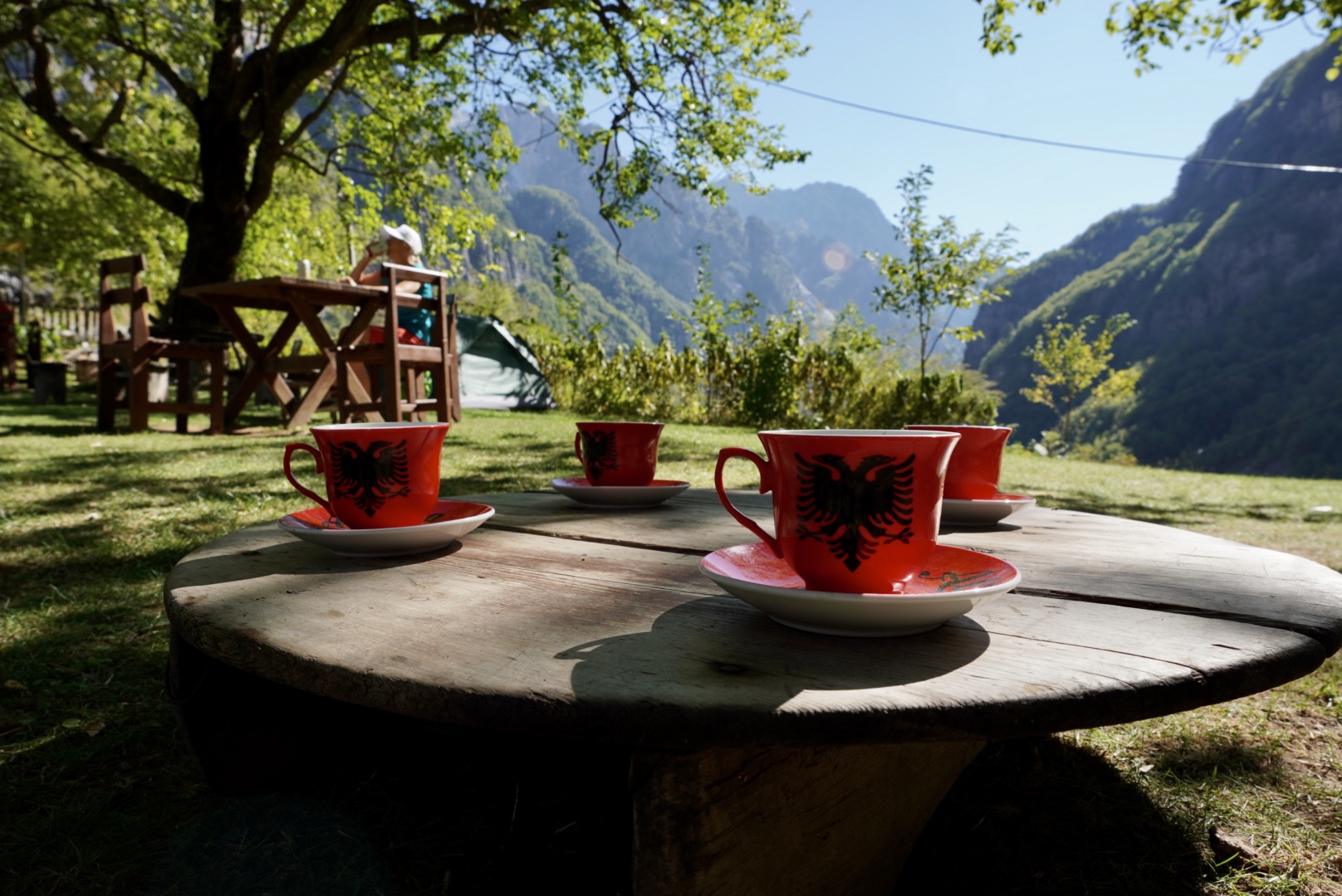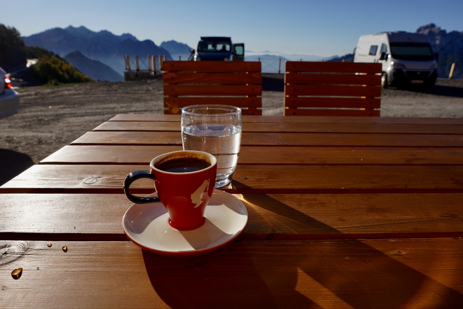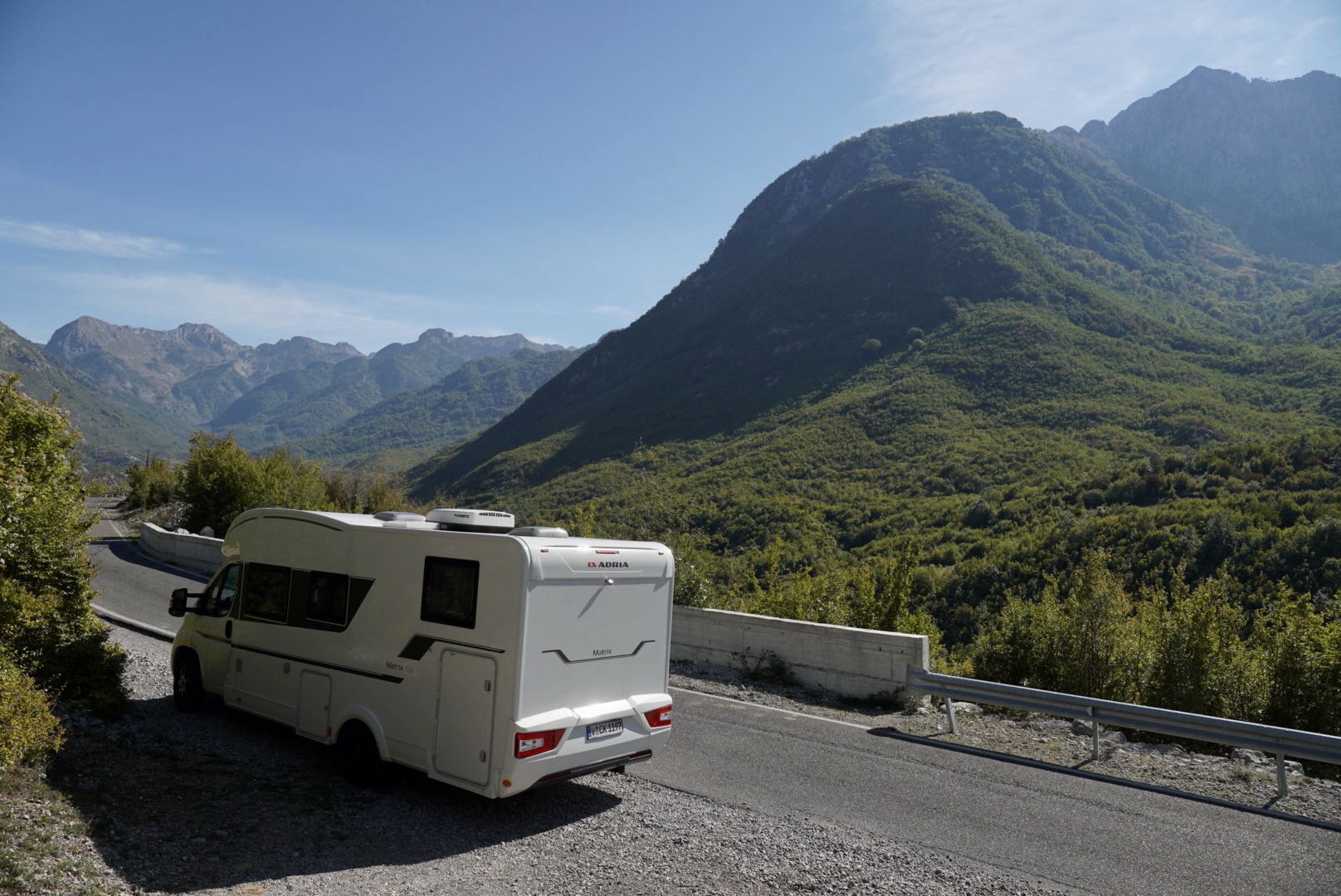 Erwachen im Thethi-Nationalpark. Wir machen nicht lange rum und starten gleich früh 07:15 Uhr. Der frühe Vogel…fährt erstmal 22 Kehren den Berg hoch, genießt am Pass die wunderbare Aussicht und trinkt einen Kaffee nach albanischer Art. Wie türkischer Kaffee aber in albanischer Tasse. Es geht weitere 21 Kehren wieder nach unten, vorbei an Bogë und in Richtung Shkodër. Am Straßenrand beratschlagen wir und entscheiden uns für die Richtung über die SH1 zur Grenze nach Montenegro. Grenzkontrolle, alles gut. 100 Meter weiter werden wir rausgewunken, nochmals Perso und Fahrzeugpapiere, zum Glück nicht den Führerschein, der liegt zu Hause im Ford. Aussteigen und einmal komplett dem Grenzer den Camper zeigen, er sucht nach großen Paketen Koks und Gras, sagt er. Kurzer Smalltalk über das Auto, das Wetter und wo wir hin wollen. Gute Weiterfahrt bekommen wir wirklich freundlich mit auf den Weg.