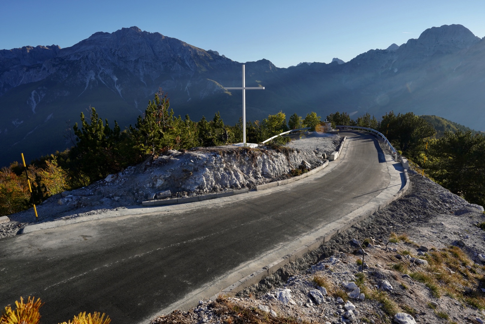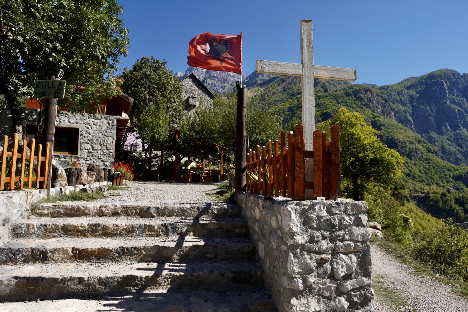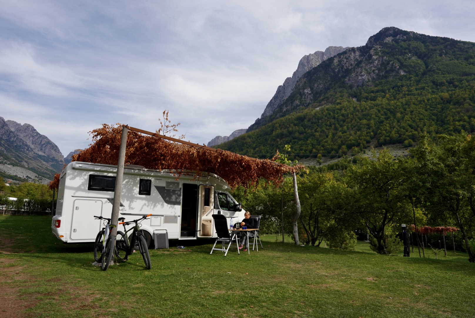Wir verlassen unseren Stellplatz zeitig am Morgen, da wir total neugierig auf Bogë sind. Die Strasse schlängelt sich ins Tal hinein und so erreichen wir recht zeitig gegen 11:00 Uhr den geplanten Stellplatz, das „Bogë Alpin Resort“. Der Name ist etwas hochtrabend aber es ist schön hier. Wir sind offenbar die einzigsten Gäste hier, alle anderen fahren rüber nach Theth in den Nationalpark. Wir haben gehört, dass die Schotterpiste befestigt wurde. Mit Teer und so…wir schwingen uns auf die Fahrräder und schauen uns das mal an. Wir radeln eine anderthalbe Stunde stetig bergauf und erreichen den Pass am Maja Buni i Thores. Siehe da die Strasse ist niegelnagelneu. Super, da können wir uns morgen mit dem WoMo rübertrauen. Früher ging das nur mit 4x4-Fahrzeugen (der steht zuhause). Also zurück zum Camper, dort check ich erstmal die Bremsbeläge an den Fahrrädern, lange halten die nicht mehr, wenn man 15km bergab fetzt. Wir dösen noch bischen und gehen 18:00 essen. 15€ für zwei Personen mit ½ Liter hausgemachten leckeren Wein (richtig wie früher, trüb und mit Satz von den Trauben), Risotto mit Gemüse für Katja und Salat mit Kartoffeln und Lamm für Christian. Zum Schluss noch hausgebrauten Raki. Wir hocken noch rum und da kam doch eine handvoll Katze angemauzt, konnte ich nicht widerstehen, die Kleine hat sich wohlgefühlt und ist auf mir eingeschlafen. Dann noch unser erster albanischer Stromausfall, alles zappenduster. Wir gehen zurück zum Camper und spielen noch zwei Partien Rummi. Um 21:00 gehen uns dann auch die „Lichter“ aus.