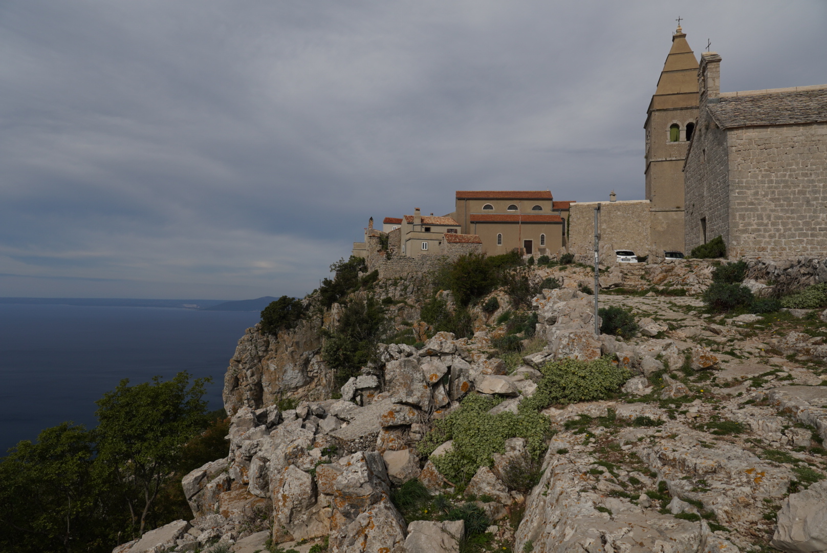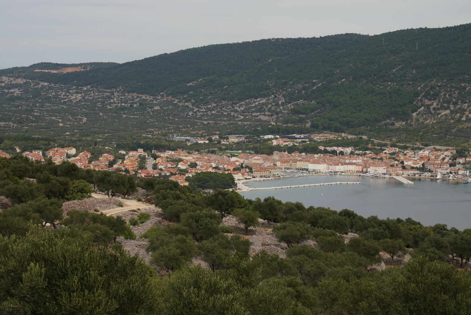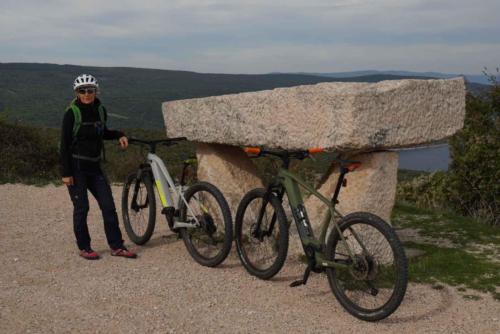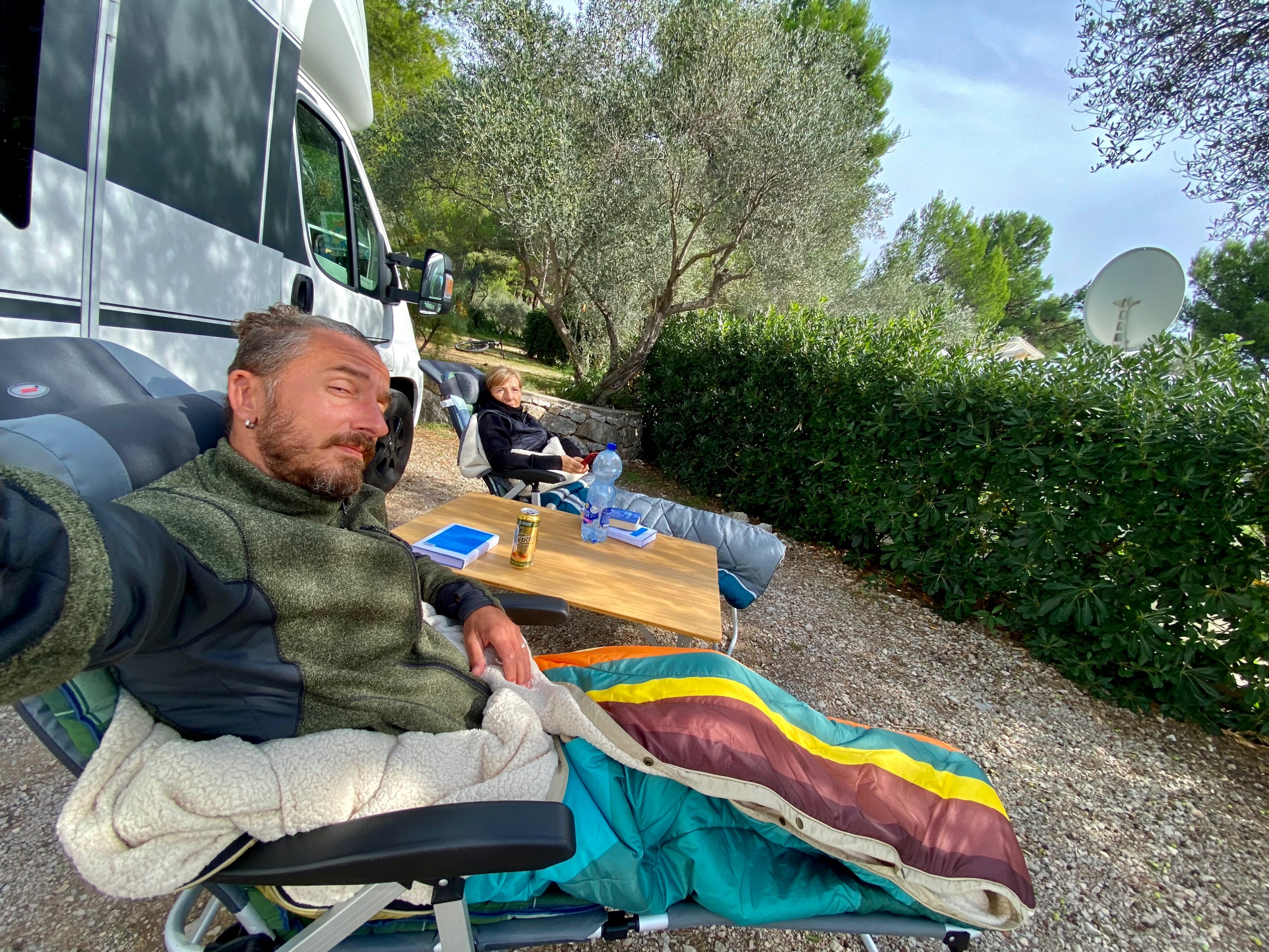 Der Morgen auf der Insel Cres begrüßt uns mit sehr wenigen Wolken. Dies wissen wir zu würdigen, zumal sogar die Sonne herausspitzelt. Wir schlüpfen 08:30 Uhr in unsere Badeklamotten und springen ins Meer, brrr…wie das auf der Haut prickelt, ist schon recht frisch. Wir gehen fix heiß duschen und ich koche schonmal Kaffee - die Dame des Hauses braucht mit fönen für den Morgenputz etwas länger. Wir trinken Kaffee und essen ein gefühltes Kilo Mandarienen. Sehr lecker. Da es heute schön zu werden scheint, hol ich die Fahrräder aus der Heckgarage und los geht es in Richtung Lubenice. Ein kleines fast verlassenes Bergdörfchen, das wollen wir uns mal anschauen. Wir radeln fast 2h stetig bergauf auf 350m ü. NN, insgesamt sind 800 Höhenmeter zu bewältigen auf 21,3 km. Lubenice ist tatsächlich fast verlassen, bis auf wenige Einwohner um eine kleine Kirche und eine jetzt geschlossene Konoba (Kneipe auf Kroatisch) herum. Wir haben einen tollen Ausblick auf die Insel Cres und die herannahenden Wolken, es zieht sich wieder zu und es wird kühler und windig. Wir treten den Rückweg an, diesmal über einen schotterigen Waldweg, hier wissen unsere Fahrräder wofür sie gebaut wurden - wir wünschen uns hier das erste mal ein vollgefedertes Rad (wer cooler sein will sagt „Fully“). Auf dem Campingplatz ist eine kleine Pizzeria, dort schauen wir vorbei und essen zu Mittag, um 15:00 Uhr - vegetarische Pizza für Katja und Čevapčići mit Pommes und Salat für Christian. Anschließend lassen wir uns vom Wirt seinem Kumpel einen Liter Olivenöl aufschwatzen, soll hier auf Cres wohl besonders gut sein - schauen wir mal. Zurück am WoMo huscheln wir uns in unsere Kuscheldecken und lesen, bis die ersten Regentropfen uns nach Drinnen vertreiben.