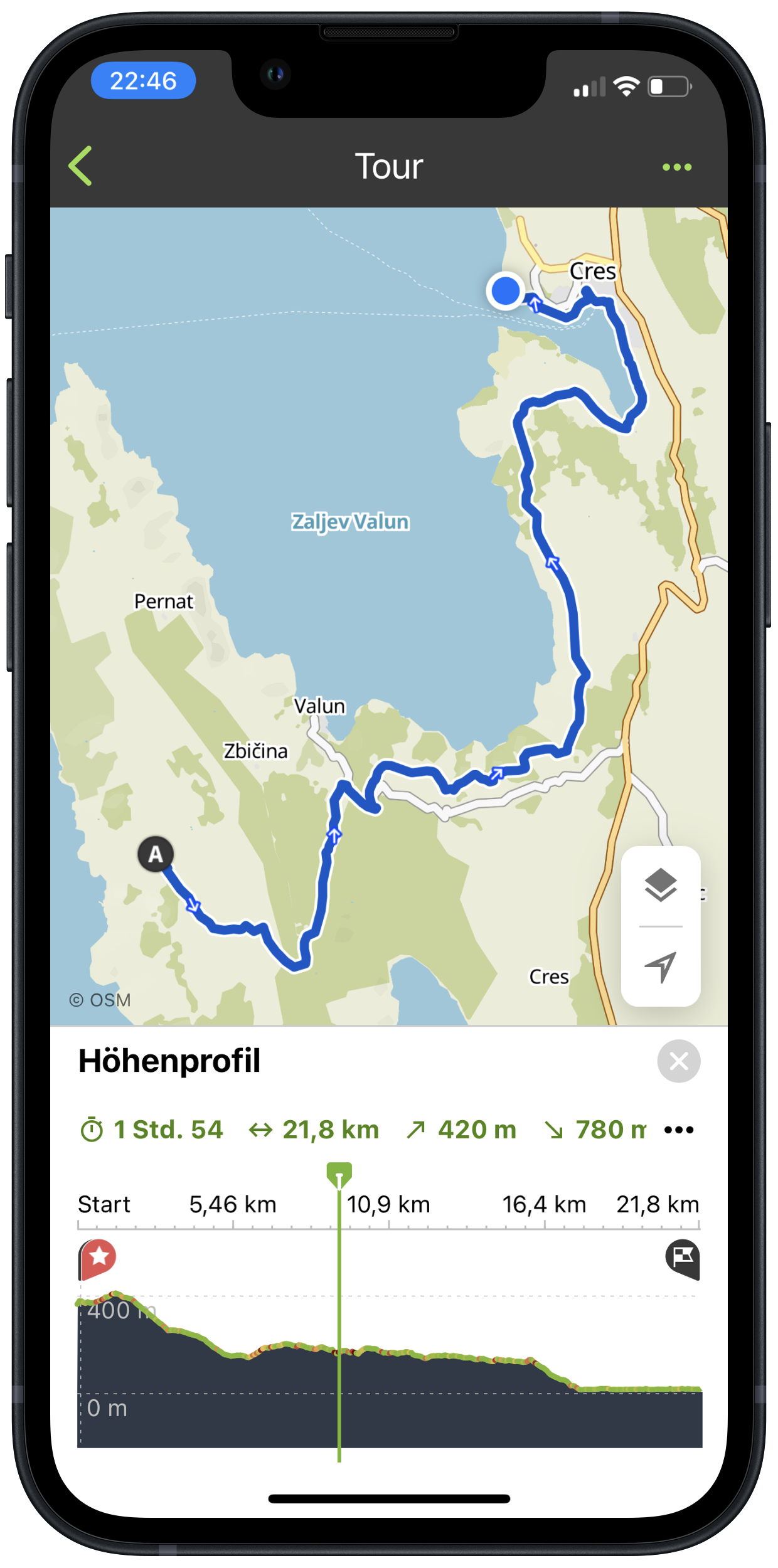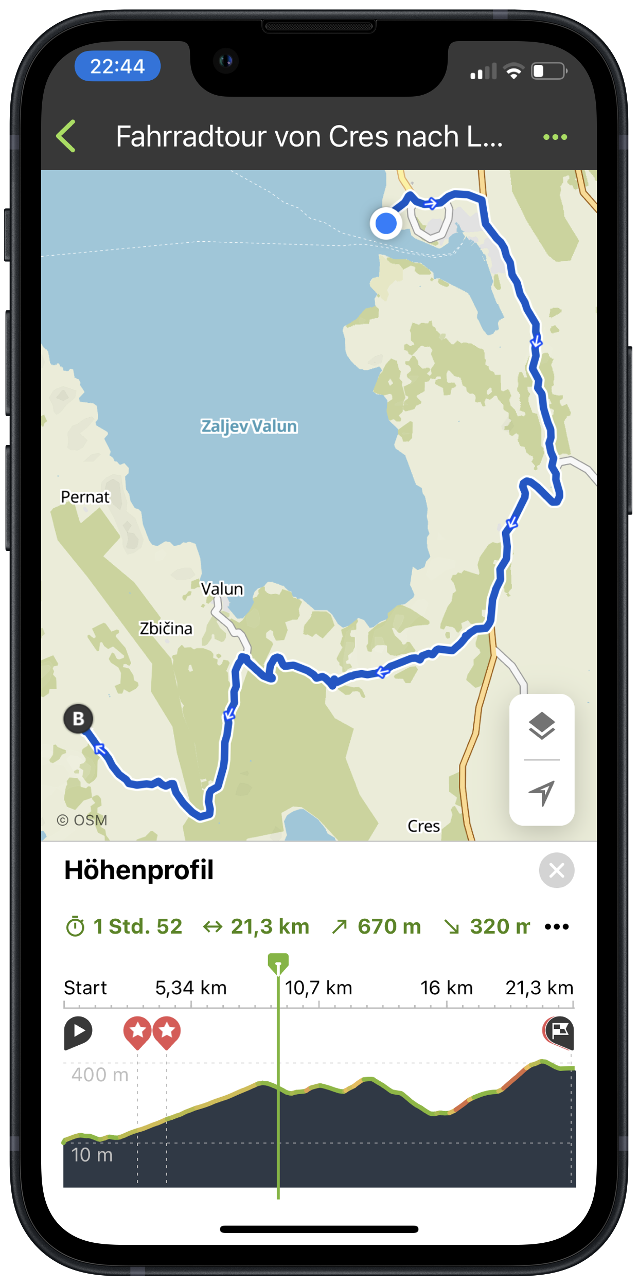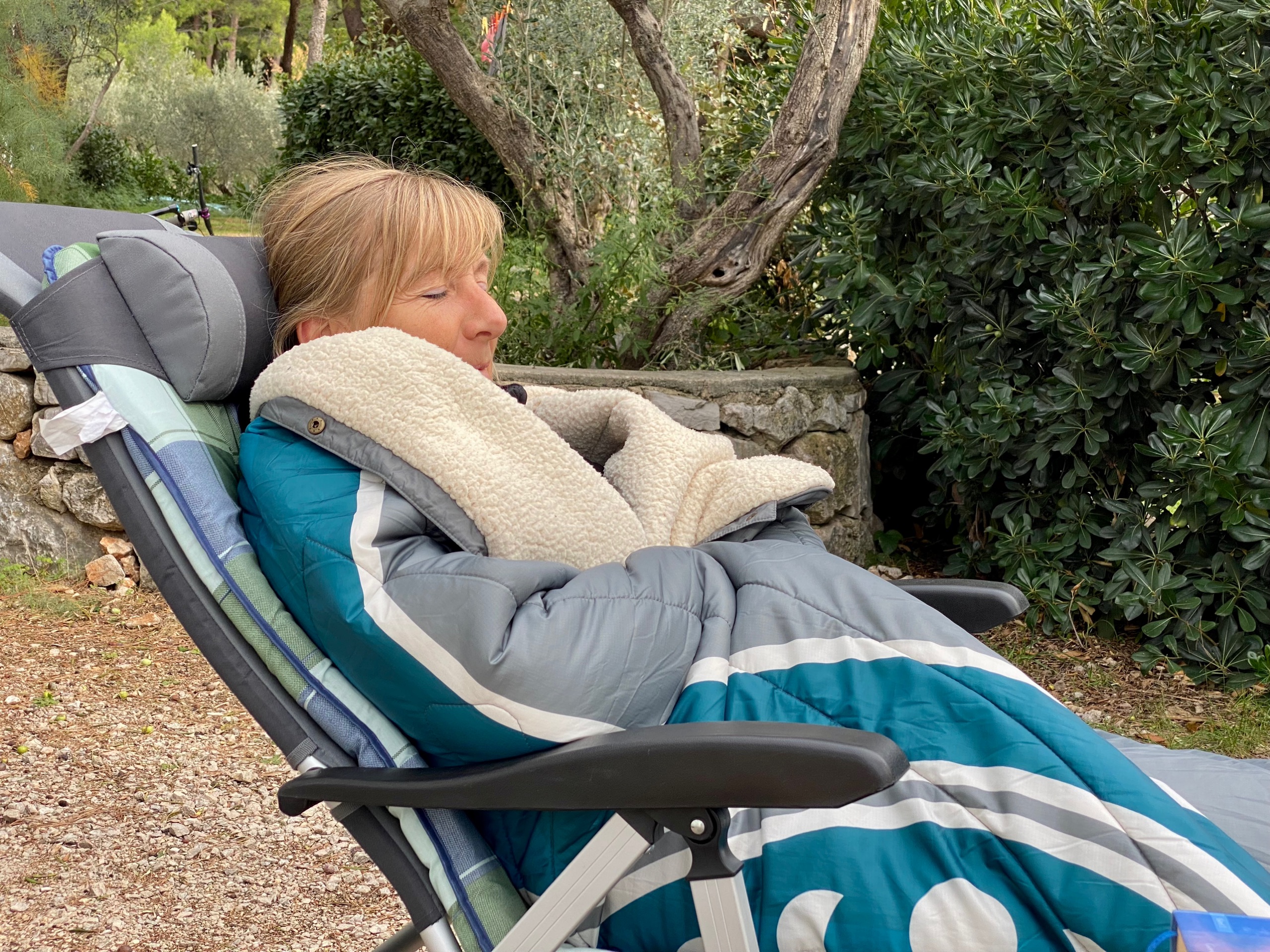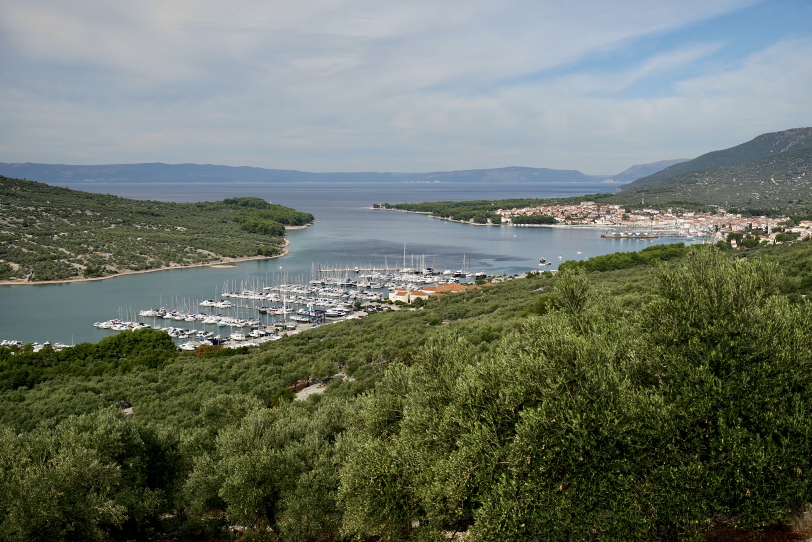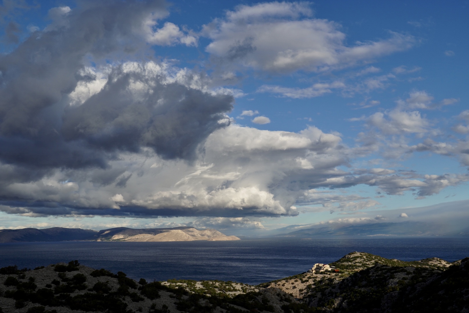 Der Morgen auf der Insel Cres begrüßt uns mit sehr wenigen Wolken. Dies wissen wir zu würdigen, zumal sogar die Sonne herausspitzelt. Wir schlüpfen 08:30 Uhr in unsere Badeklamotten und springen ins Meer, brrr…wie das auf der Haut prickelt, ist schon recht frisch. Wir gehen fix heiß duschen und ich koche schonmal Kaffee - die Dame des Hauses braucht mit fönen für den Morgenputz etwas länger. Wir trinken Kaffee und essen ein gefühltes Kilo Mandarienen. Sehr lecker. Da es heute schön zu werden scheint, hol ich die Fahrräder aus der Heckgarage und los geht es in Richtung Lubenice. Ein kleines fast verlassenes Bergdörfchen, das wollen wir uns mal anschauen. Wir radeln fast 2h stetig bergauf auf 350m ü. NN, insgesamt sind 800 Höhenmeter zu bewältigen auf 21,3 km. Lubenice ist tatsächlich fast verlassen, bis auf wenige Einwohner um eine kleine Kirche und eine jetzt geschlossene Konoba (Kneipe auf Kroatisch) herum. Wir haben einen tollen Ausblick auf die Insel Cres und die herannahenden Wolken, es zieht sich wieder zu und es wird kühler und windig. Wir treten den Rückweg an, diesmal über einen schotterigen Waldweg, hier wissen unsere Fahrräder wofür sie gebaut wurden - wir wünschen uns hier das erste mal ein vollgefedertes Rad (wer cooler sein will sagt „Fully“). Auf dem Campingplatz ist eine kleine Pizzeria, dort schauen wir vorbei und essen zu Mittag, um 15:00 Uhr - vegetarische Pizza für Katja und Čevapčići mit Pommes und Salat für Christian. Anschließend lassen wir uns vom Wirt seinem Kumpel einen Liter Olivenöl aufschwatzen, soll hier auf Cres wohl besonders gut sein - schauen wir mal. Zurück am WoMo huscheln wir uns in unsere Kuscheldecken und lesen, bis die ersten Regentropfen uns nach Drinnen vertreiben.
