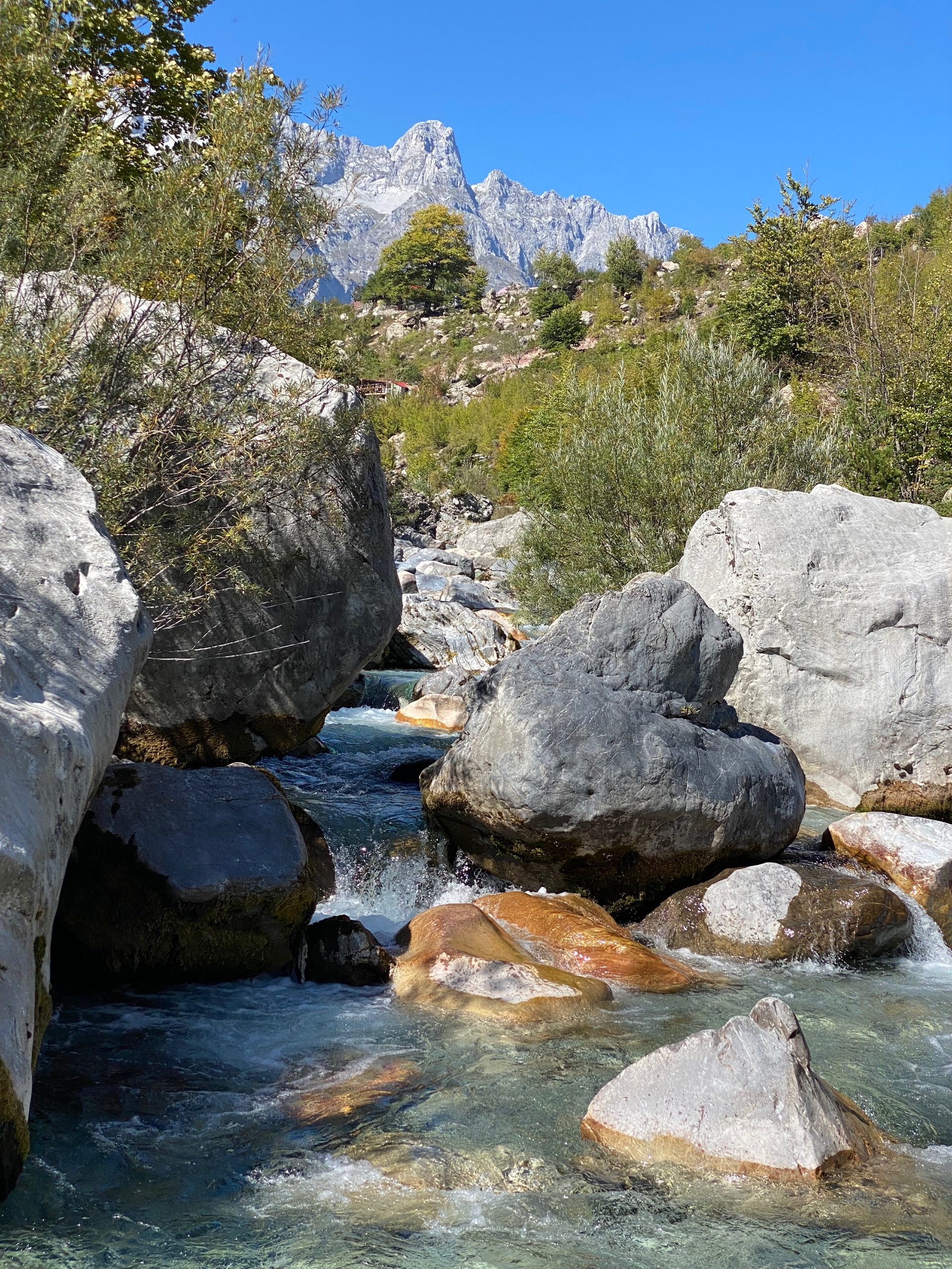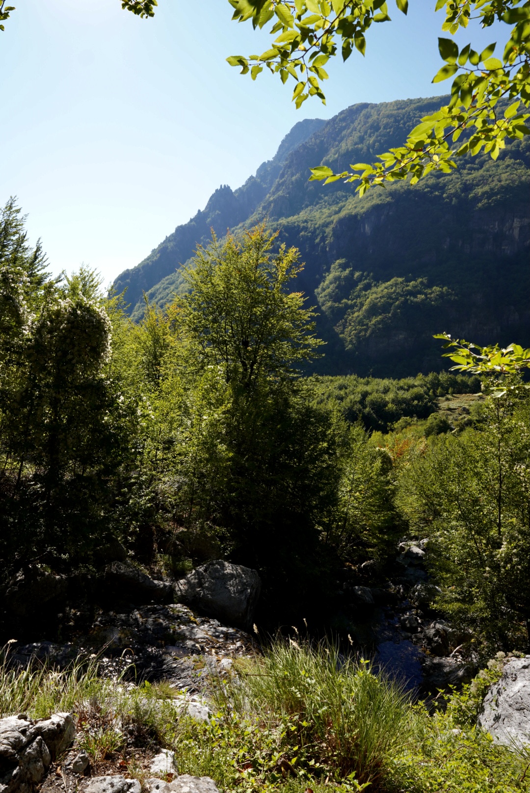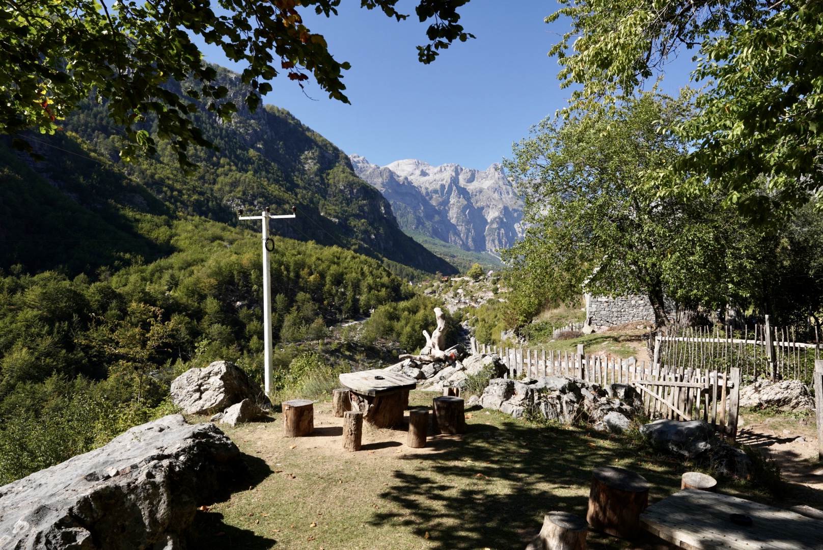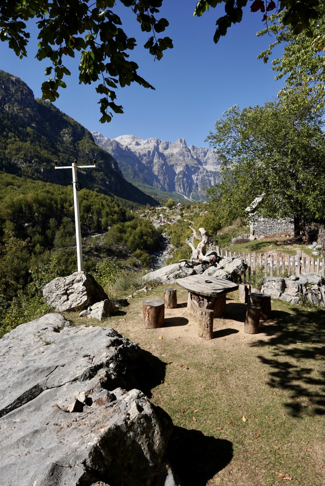 Da wir gestern zeitig zu Bett sind, waren wir heute Morgen natürlich auch zeitig wach. Wir trinken nur fix ein Käffchen und geniessen den stahlblauen Hinmel und die Aussicht. 08:45 starten wir in Richtung Thethi-Nationalpark. Wir brauchen eine dreiviertel Stunde bis hoch zum Pass und über eine Stunde runter ins Tal des Thehti-Nationalparks. Der anvisierte Campingplatz existiert nicht mehr, also suchen wir uns zu Fuß einen neuen. Gibt ja hier ein paar. Wir werden fündig, aber doll ist der nicht. Toilette echt mies und sonst nix ausser Aussicht. Stromanschluss ist da - geht aber nicht, also im Preis runterhandeln. Naja 10€/Nacht geht. Wir frühstücken gemütlich und wandern hinaus ins Tal. Eine echt fantastische Natur ist hier, nur leider fällt den Albanern dauernt der Rest ihres Proviants aus den Händen, leere Dosen und Tüten verzieren mit abwechselnder Farbigkeit den Wegesrand. Wir dösen im Flussbett und baden an einem kleinen Bachlauf. Herrlich. Auf dem Rückweg schlürfen wir unseren ersten albanischen Kaffee, eigentlich wie türkischer. Am Camper zurück erledigen wir den Tagesaufwasch. Katja jammert 17:30 bereits dass sie Hunger hat, wird wohl heute noch zeitiger mit Essen.