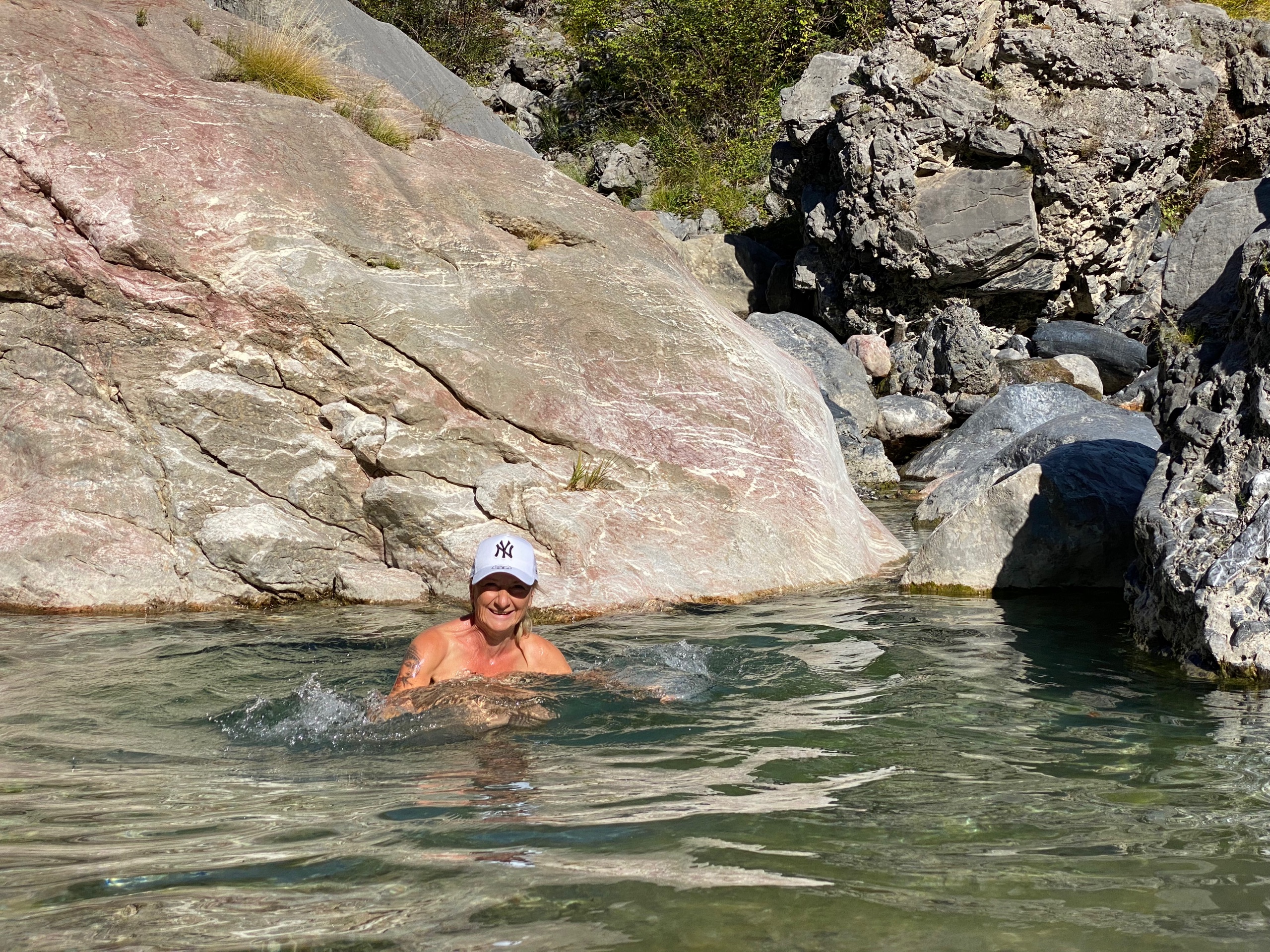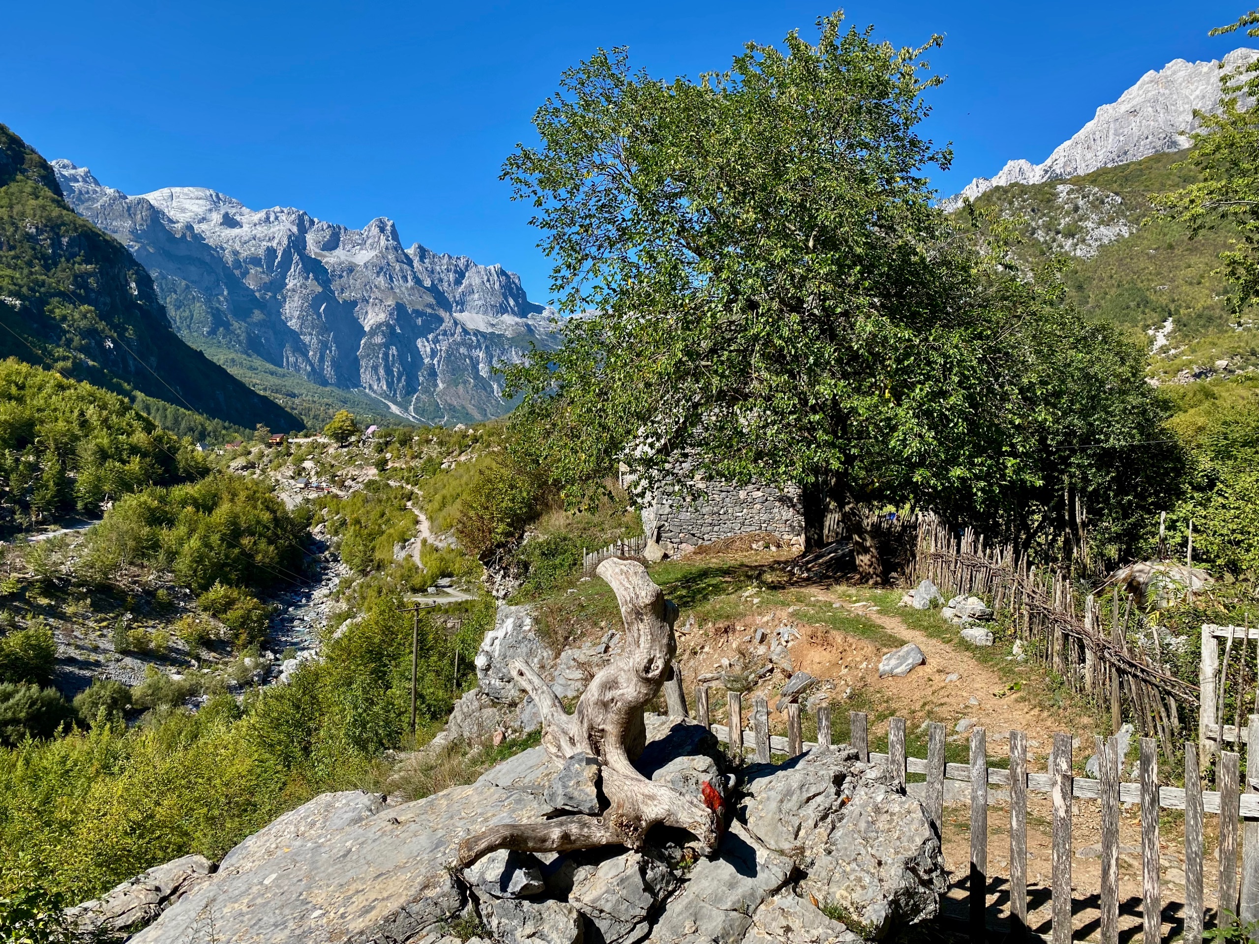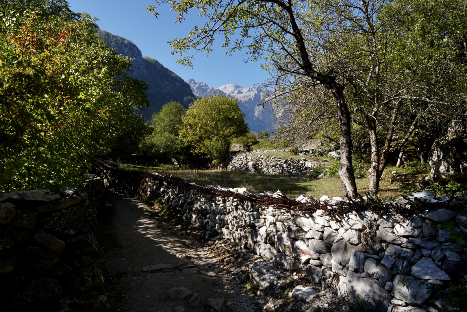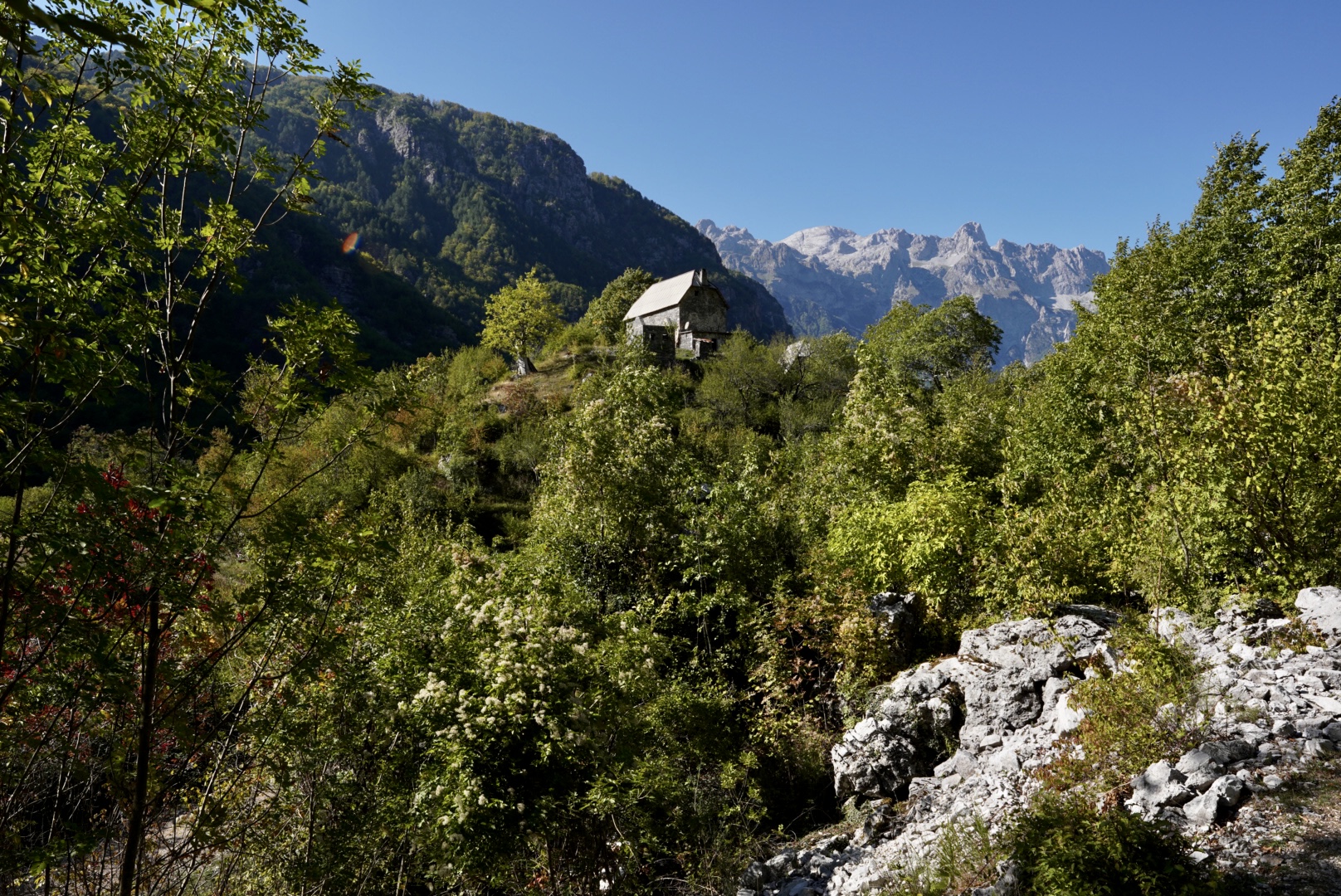 Da wir gestern zeitig zu Bett sind, waren wir heute Morgen natürlich auch zeitig wach. Wir trinken nur fix ein Käffchen und geniessen den stahlblauen Hinmel und die Aussicht. 08:45 starten wir in Richtung Thethi-Nationalpark. Wir brauchen eine dreiviertel Stunde bis hoch zum Pass und über eine Stunde runter ins Tal des Thehti-Nationalparks. Der anvisierte Campingplatz existiert nicht mehr, also suchen wir uns zu Fuß einen neuen. Gibt ja hier ein paar. Wir werden fündig, aber doll ist der nicht. Toilette echt mies und sonst nix ausser Aussicht. Stromanschluss ist da - geht aber nicht, also im Preis runterhandeln. Naja 10€/Nacht geht. Wir frühstücken gemütlich und wandern hinaus ins Tal. Eine echt fantastische Natur ist hier, nur leider fällt den Albanern dauernt der Rest ihres Proviants aus den Händen, leere Dosen und Tüten verzieren mit abwechselnder Farbigkeit den Wegesrand. Wir dösen im Flussbett und baden an einem kleinen Bachlauf. Herrlich. Auf dem Rückweg schlürfen wir unseren ersten albanischen Kaffee, eigentlich wie türkischer. Am Camper zurück erledigen wir den Tagesaufwasch. Katja jammert 17:30 bereits dass sie Hunger hat, wird wohl heute noch zeitiger mit Essen.