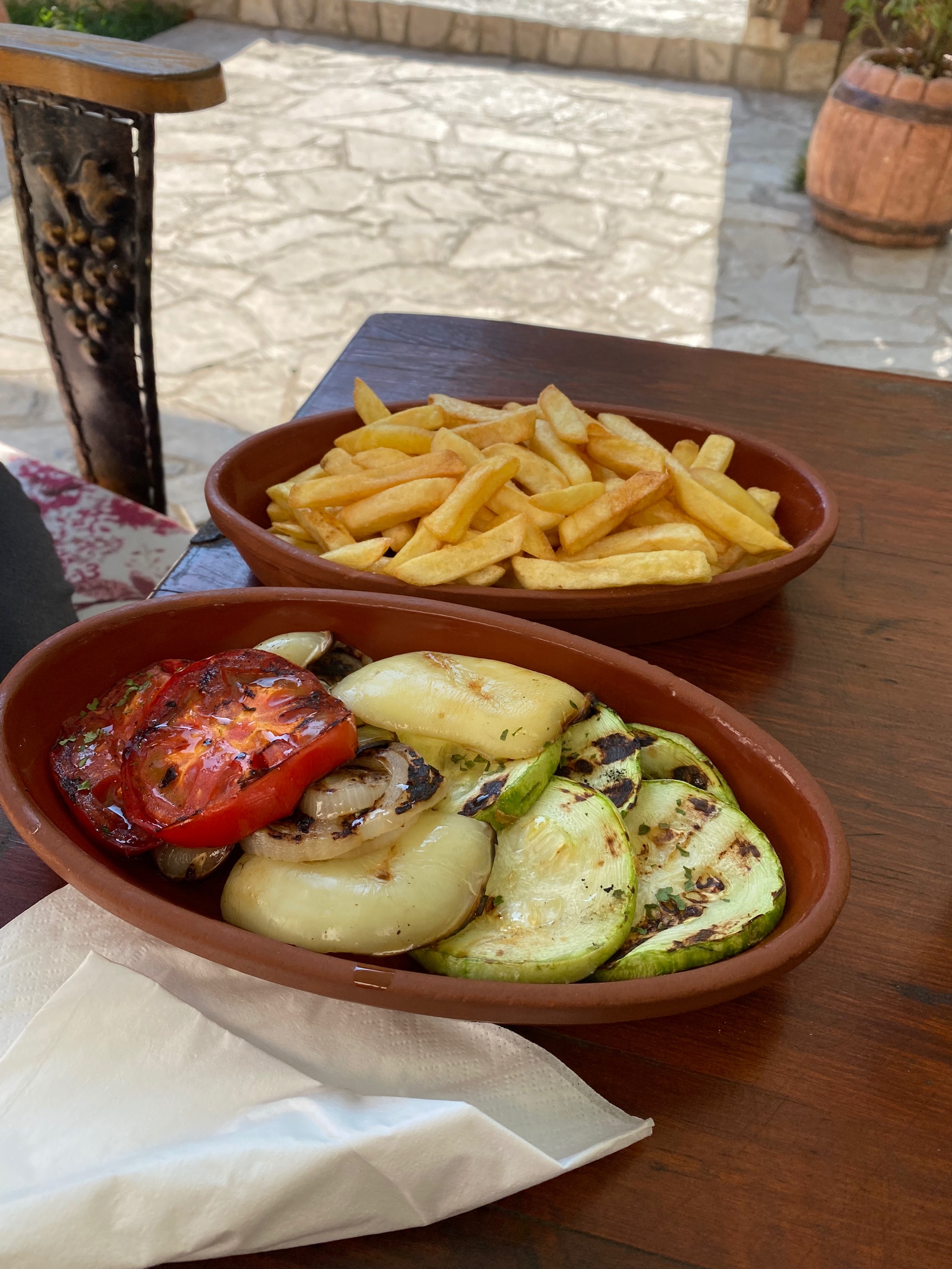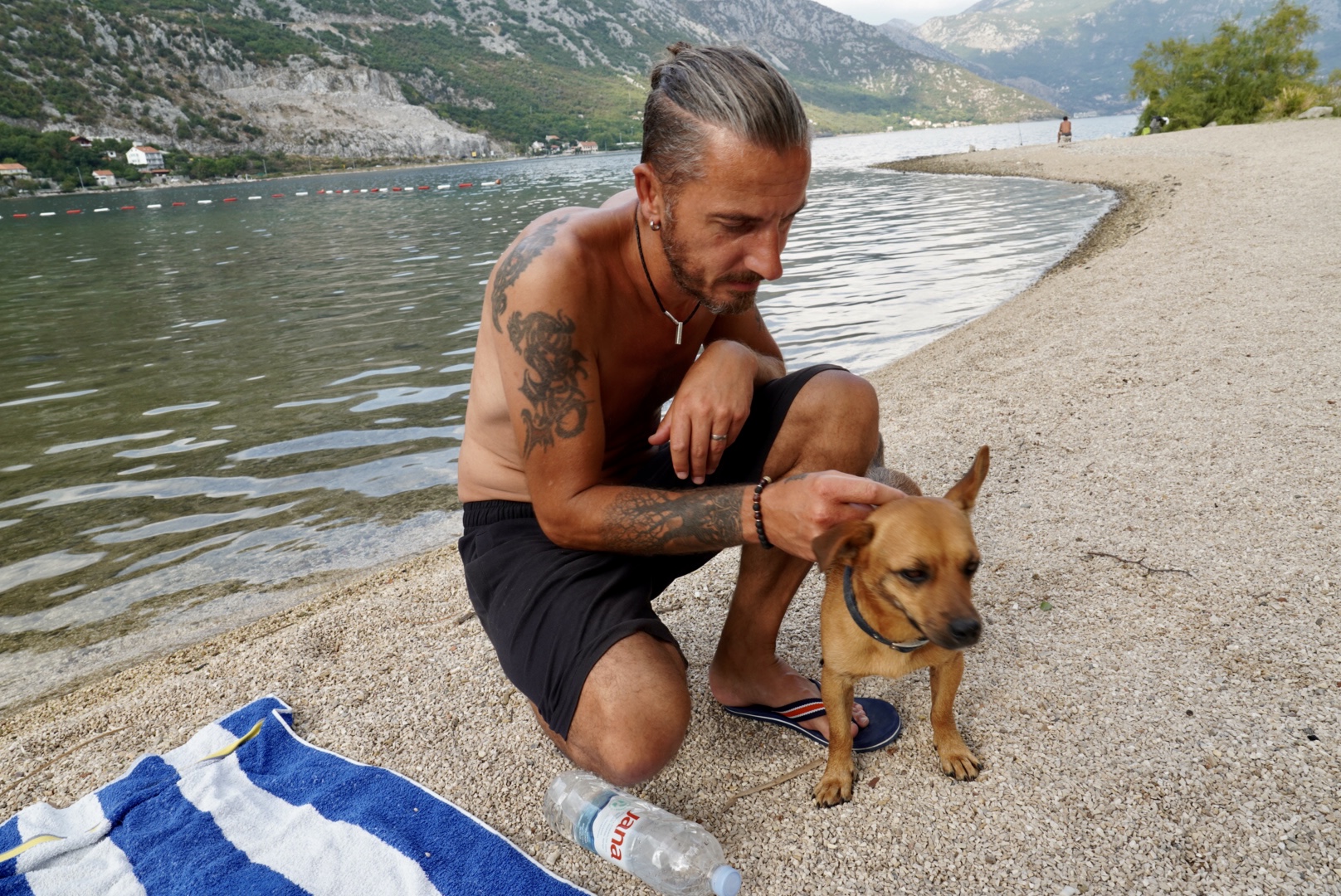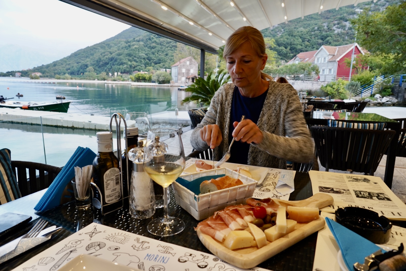 Verdammt ich glaube die haben mit 75% doch das Fett gemeint. Zweiter Nachteil, wir sind sofort abhängig. Der schmeckt so unverschämt lecker mit Knoblauch, Tomate und Zwiebeln. Frisch gestärkt schleppen wir uns mit einem Bier an den Strand und dösen. Später kommt ein kleiner Hund vorbei und findet uns als Spielkameraden ganz lustig. Am Abend machen wir uns bissl hübsch, so mit duschen und Jeans und Parfüm und so, und gehen Essen. Lokale Köstlichkeit - Käse und Schinken mit Honig. Das ist die Vorspeise. Als Hauptgang lassen wir uns gegrillten Tintenfisch mit Gemüse schmecken. Damit wir den Spaß nicht trocken runterwürchen müssen gibt es einen Chardonay aus Montenegro dazu. Pappsatt sitzen wir 20:30 Uhr wieder am Camper. Mal sehen was morgen so passiert.