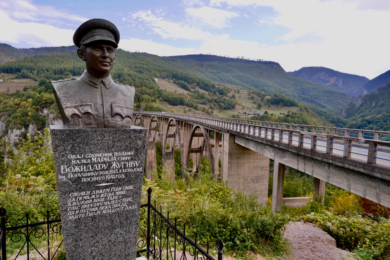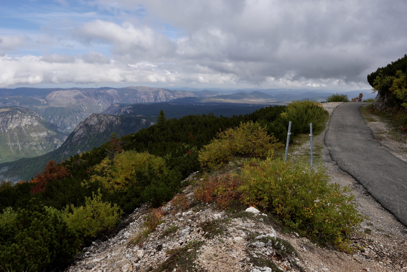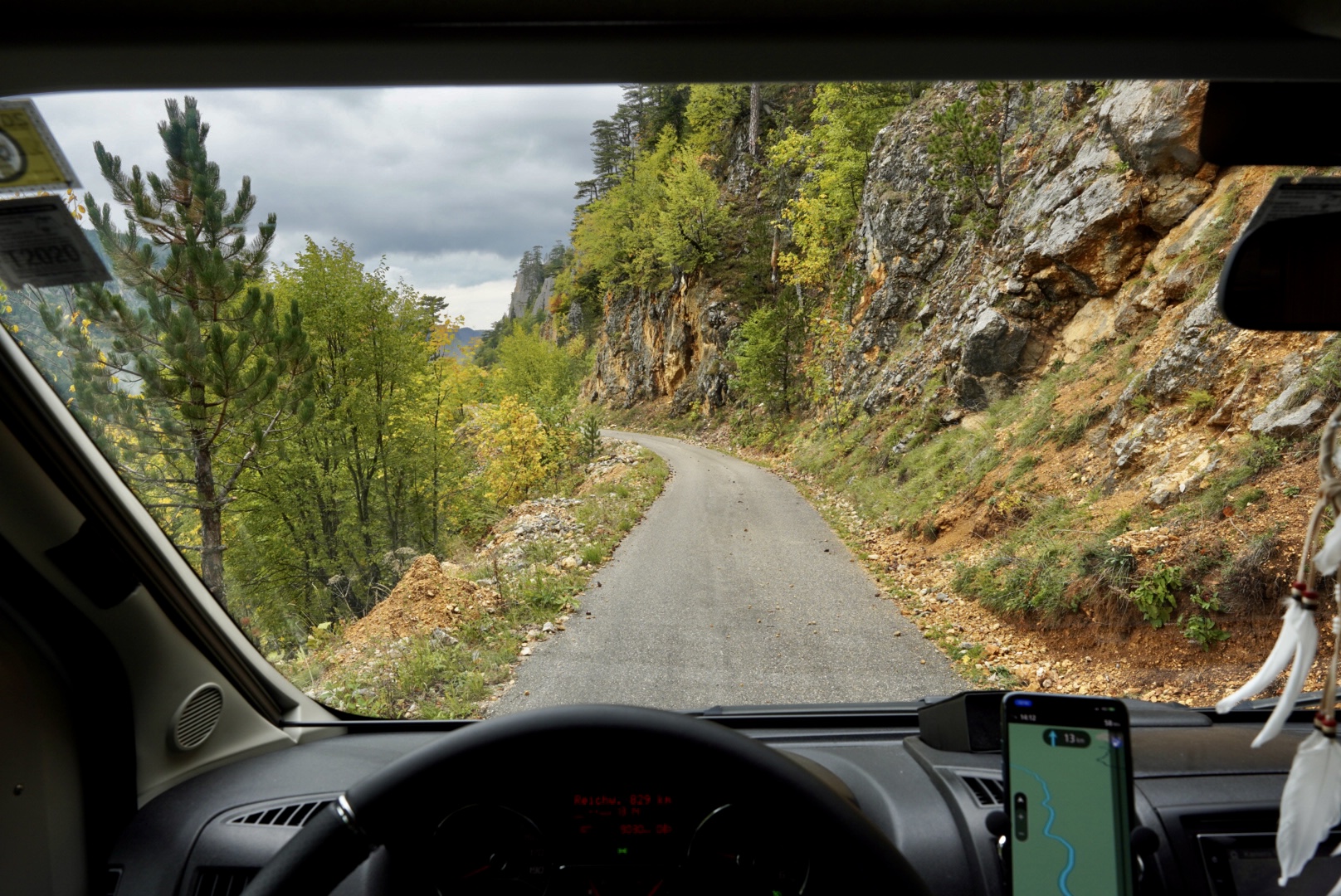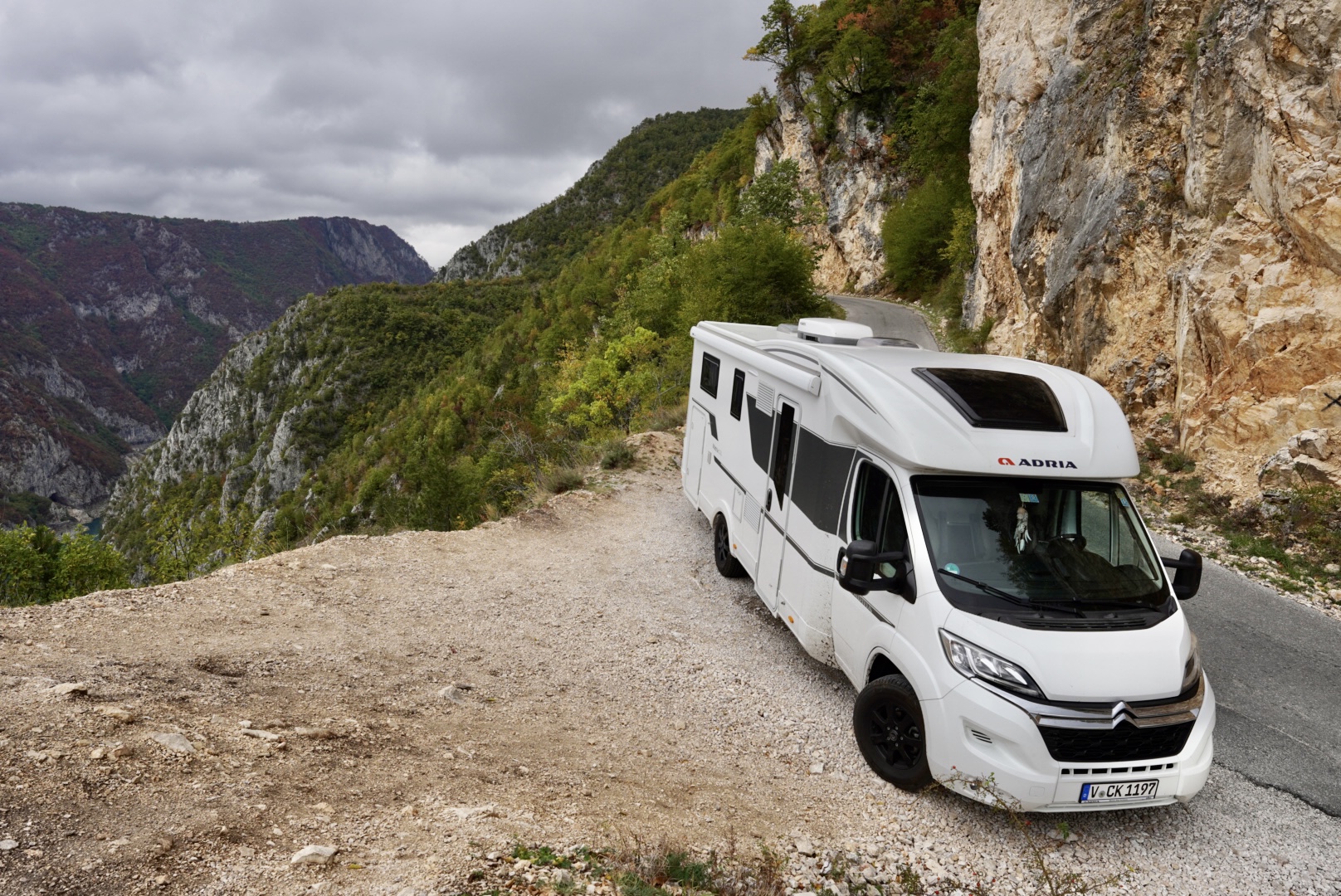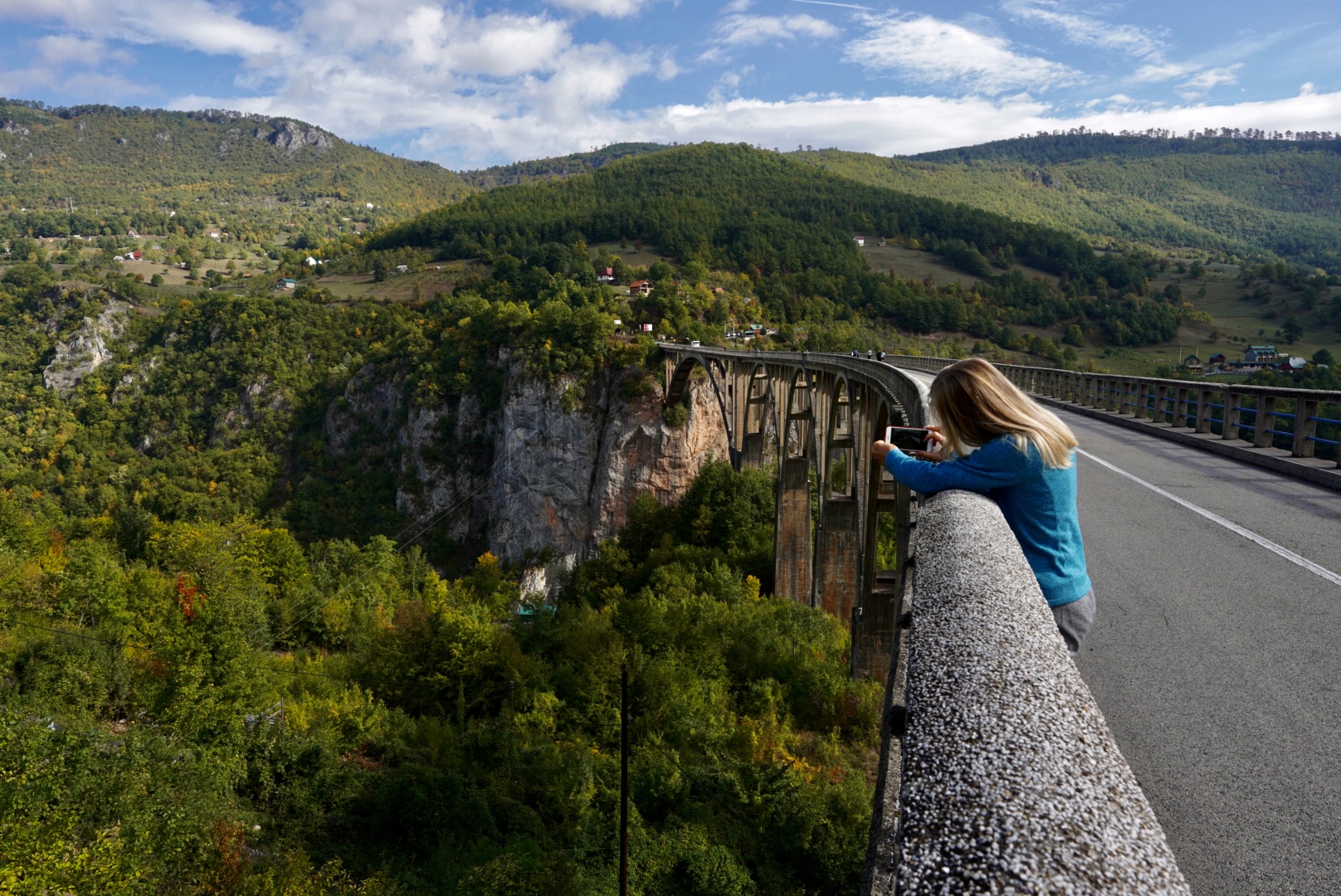 Unser erstes Tagesziel ist die Tara-Brücke. Uns erwartet, nach einer kurvenreichen Abfahrt, ein super Blick auf ein gigantisches Tal - mit Tara-Brücke. Wir spazieren einmal rüber und nüber und sind schwer beeindruckt. Wir fahren wieder zurück in Richtung Zabljak, hier soll uns ein weiterer Teil der „Panoramic Route N°1“ zur Taraschlucht im Dormitorgebirge bringen. Die Straße beginnt quasi einspurig und wird in ihrem 50 km langen Verlauf auch nicht wirklich breiter. Die Strasse ist so breit wie eine Kuh lang. Katja sagt: „…das ist wie Bergsteigen, nur eben mit Wohnmobil.“ Auf der echt abenteuerlichen Strecke kommen uns ausser zwei Bikern niemand entgegen, zum Glück, Platz zum ausweichen ist hier nicht wirklich. Wir genießen wunderbare Ausblicke, Katja produziert literweise Angstschweiß und reißt fast die Haltegriffe ab. Sonst schön und das Wetter spielt auch mit. Auf einem Hochplateau finden wir eine kleine Gaststätte die noch geöffnet hat und fragen nach Lamm, das soll hier eine lokale Köstlichkeit sein und wird überall angepriesen - hat aber keiner, auch hier nicht. Also die letzten Serpentinen runter ins Tal zur M-18 wieder Richtung Nikšić (wo das einzigste aber echt gute Bier Montenegro´s gebraut wird).