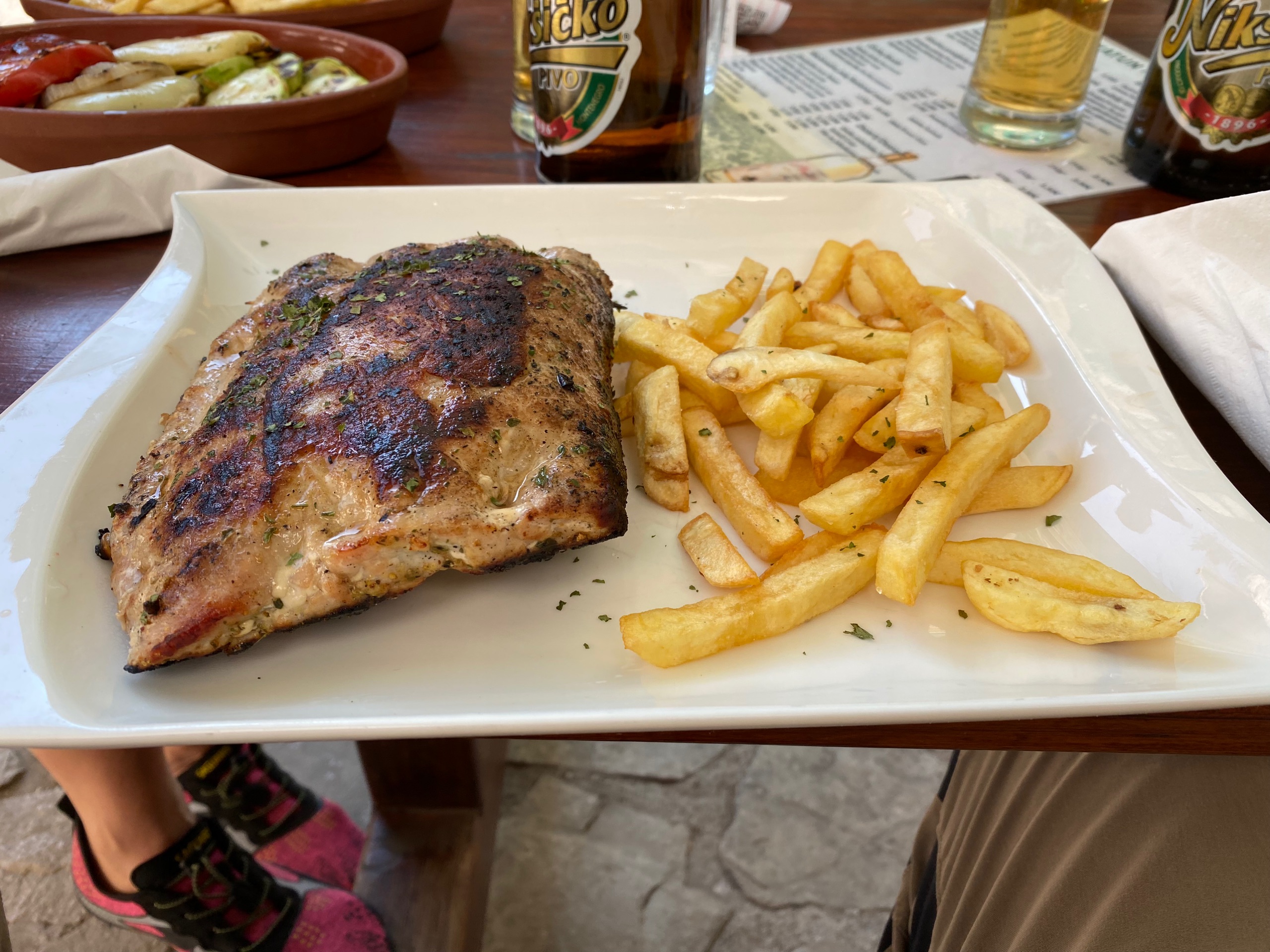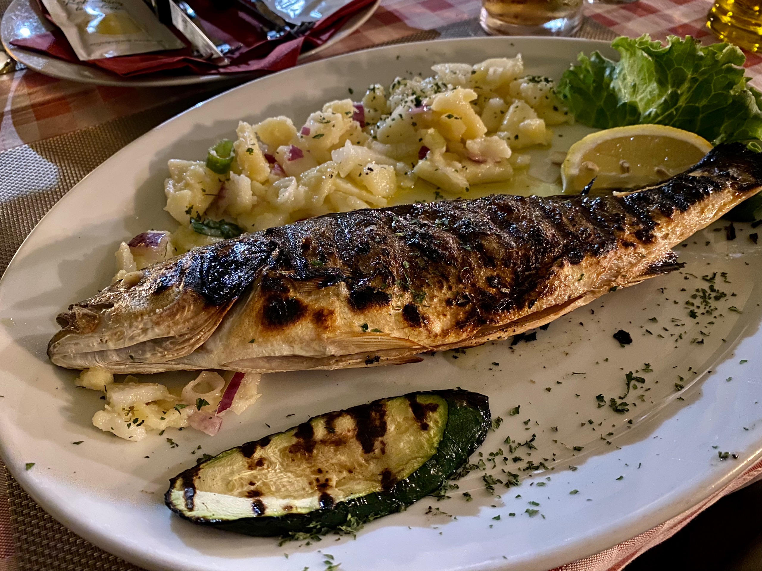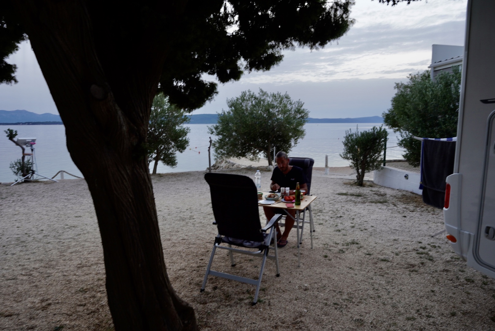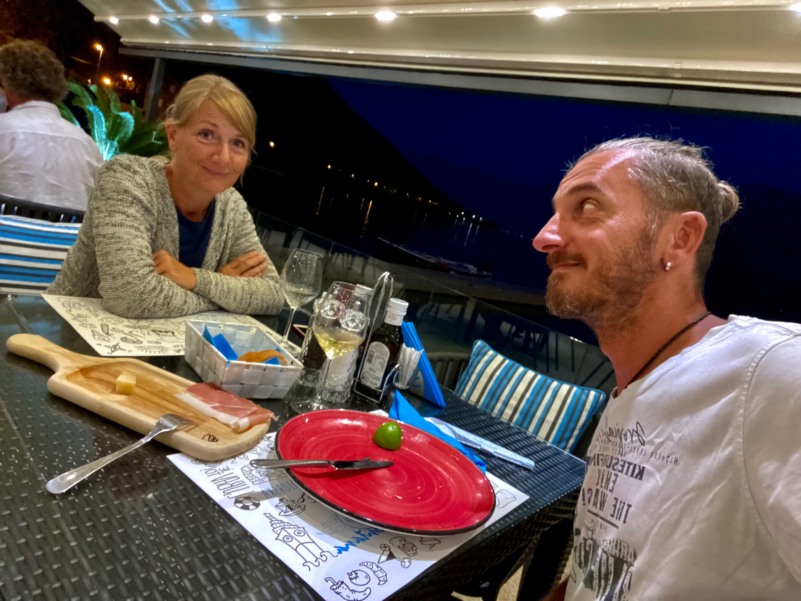 Der Platz ist schön, sehr gepflegt und noch ganz schön voll. Weil ja heute der Urlaub anfängt gehen wir essen. Gemütliche Grillterrasse mit dem Namen „Punta“ in einem Hinterhof ohne Blick auf‘s Meer oder die tolle Altstadt, dafür aber nahe am Campingplatz.