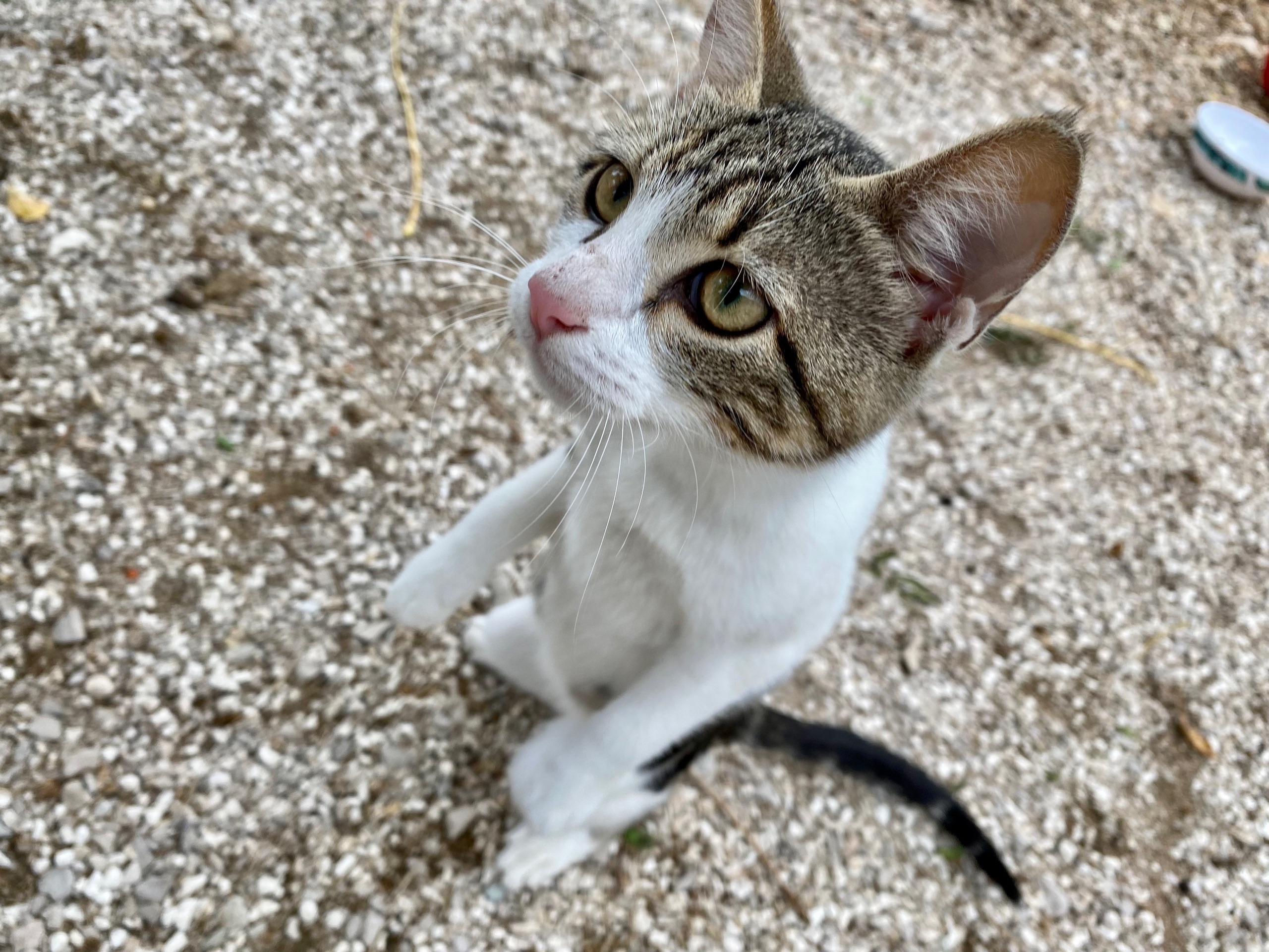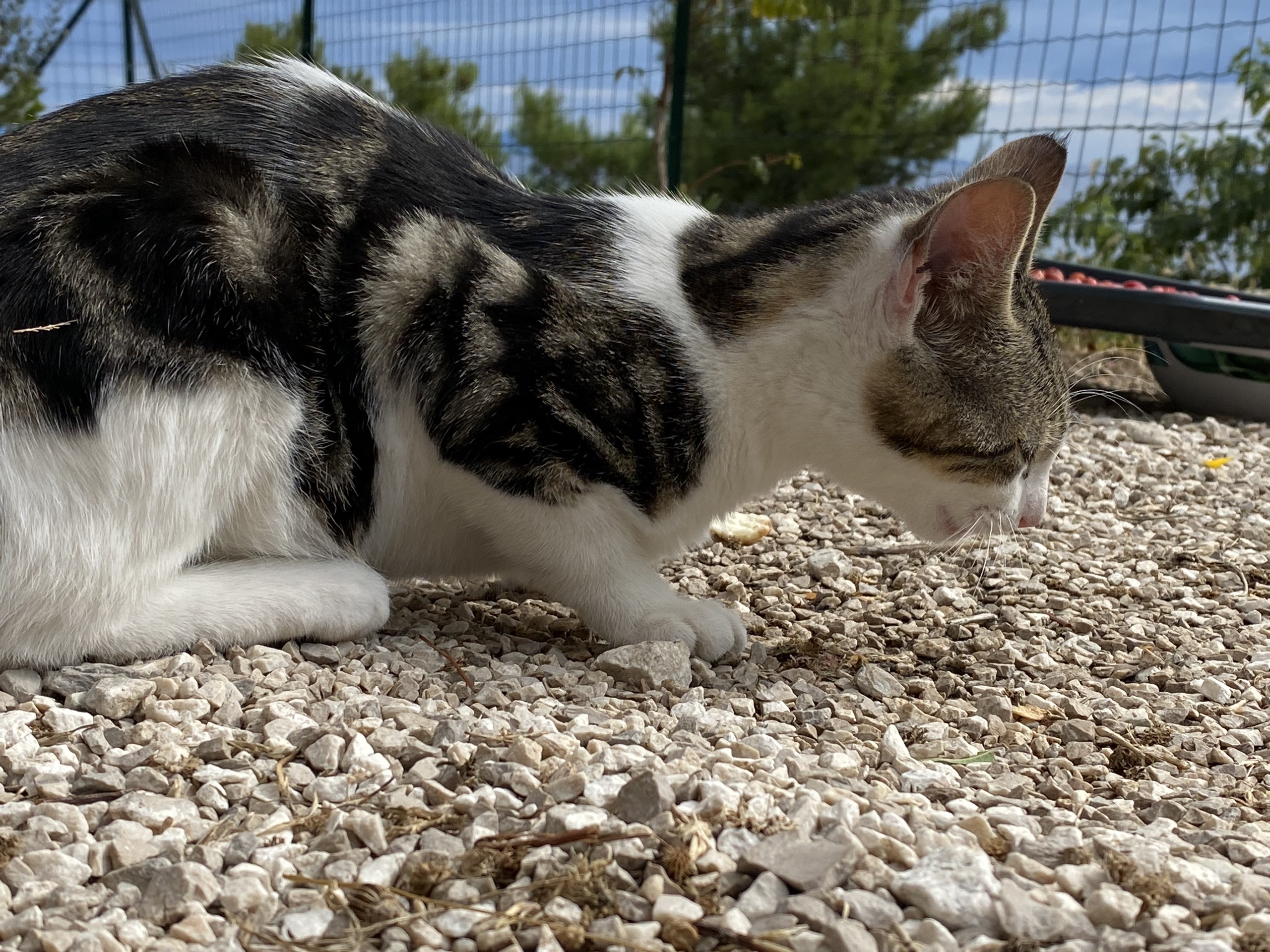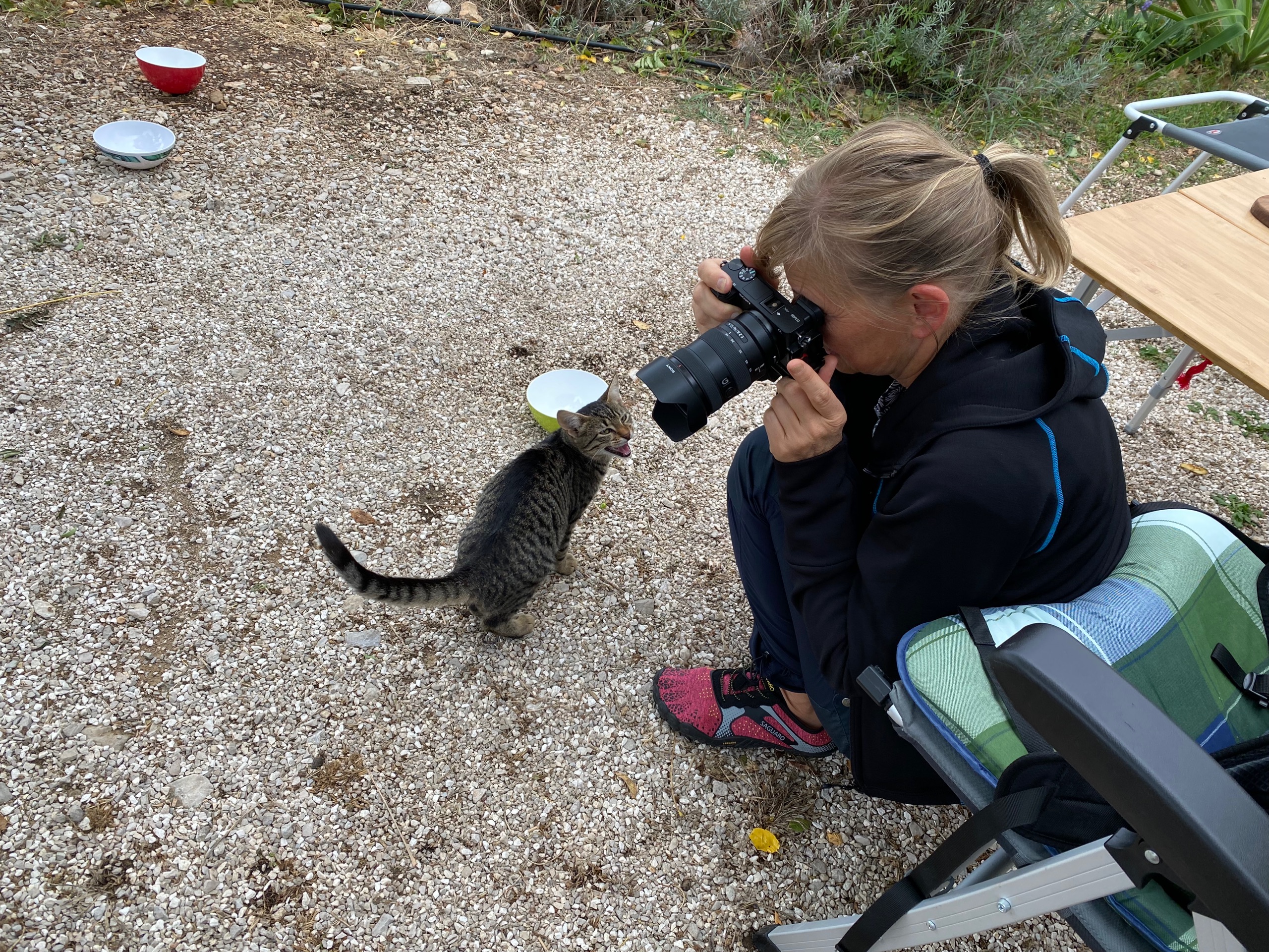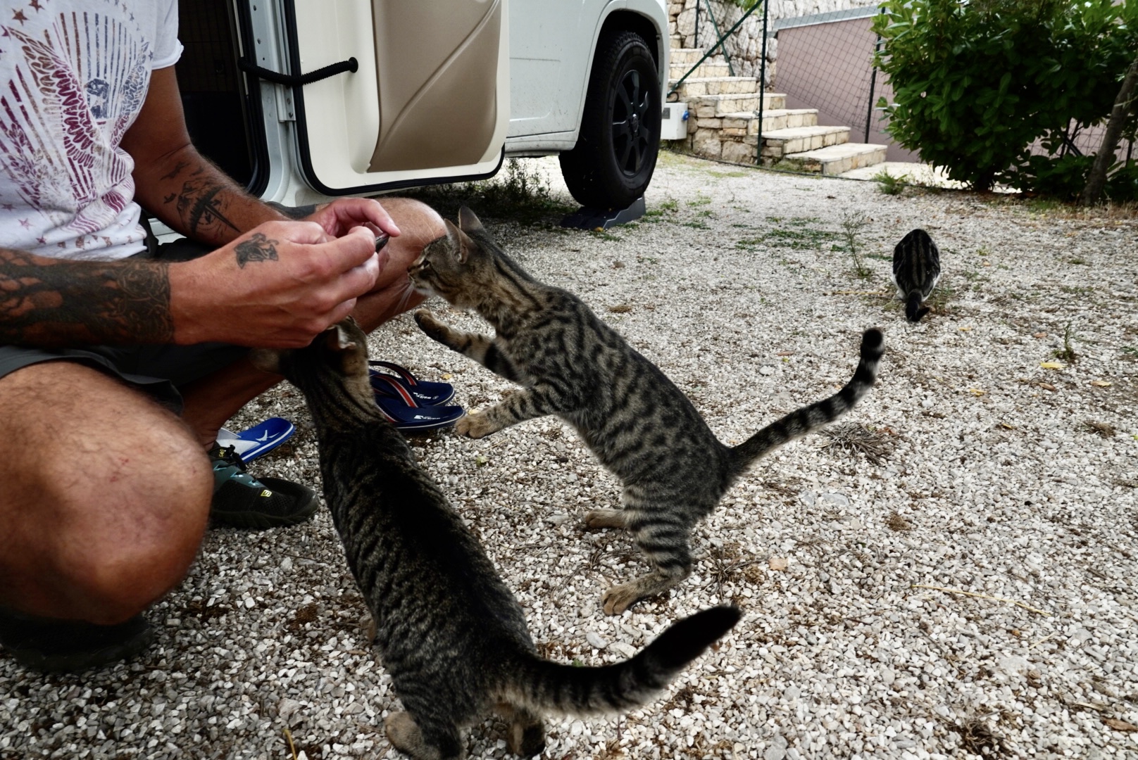 Wir frühstücken und bekommen Gesellschaft, drei Junge Katzen spielen ihren Charme aus - wir erliegen. Wir lassen uns Buttersemmel „abschwatzen“. Uns schwahnt, dass das wohl nicht so richtig gut ist für die Kleinen. Wir holen uns Rat bei Jana, die Katzenspezialistin empfiehlt Huhn. Wir satteln die Räder und fahren vor nach Orebić in den Supermarkt und erwerben also Huhn. Am Abend gehen wir ins Strandrestaurant Fischplatte essen. Danach füttern wir die Kätzchen.