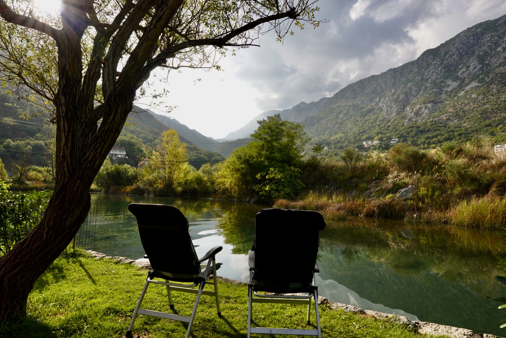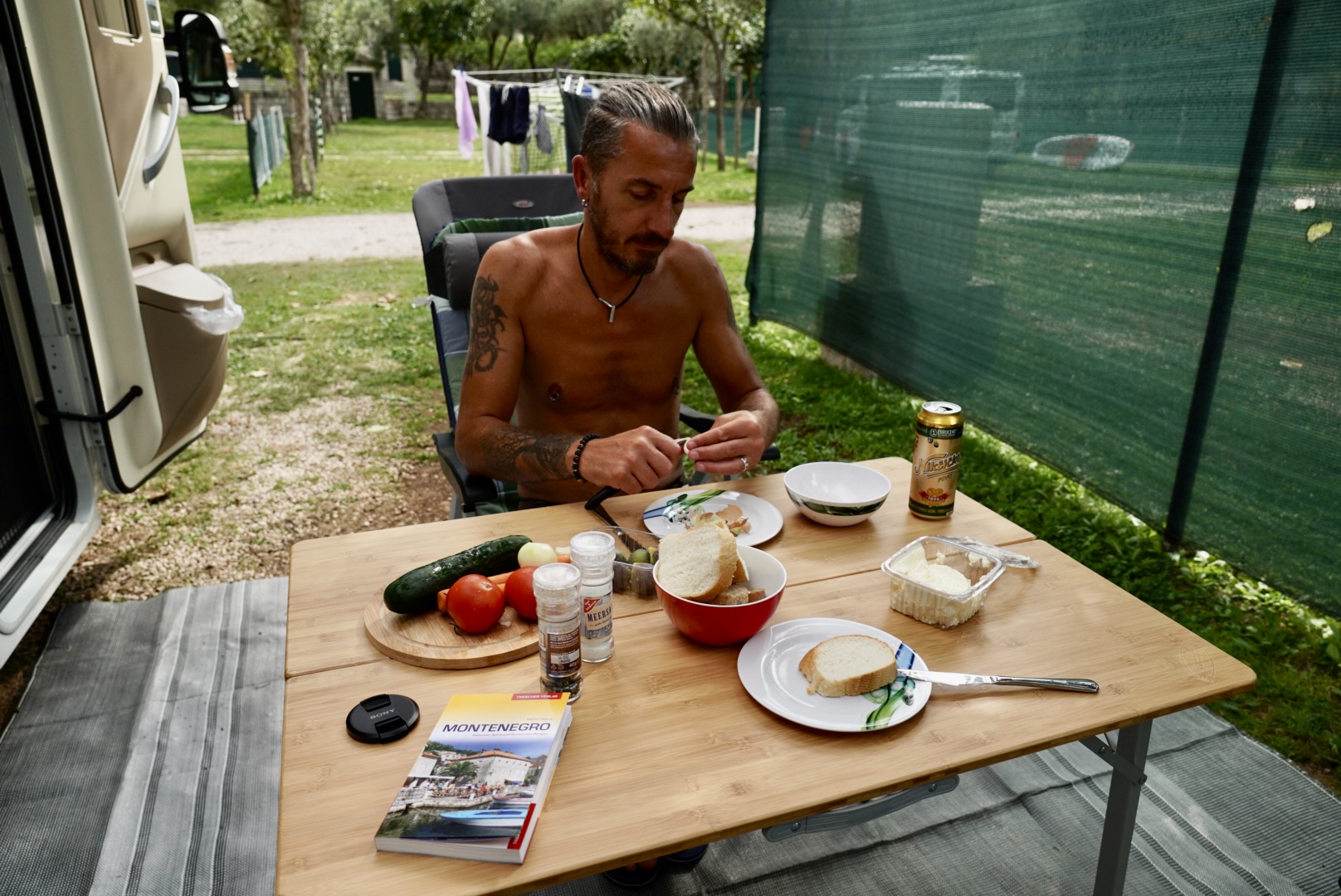 Wir passieren heute die Grenze nach Montenegro. Kein Test, kein Tamtam. Covid? Recovered! Ah okay alles klar, Zettel brauchen wir nicht. Supi. Erstmal tanken in Montenegro - wir freuen uns über 1,24€/l was heutzutage ja billig ist. Weiter in Richtung Herzeg Novi - hier wollten wir eigentlich mal halten, aber so recht haben wir keine Lust. Wir fahren die Panoramastrasse an der Bucht von Kotor entlang. Wir halten noch am Supermarkt und kaufen das Notwendigste und die lokale Köstlichkeit >> Kajmak<< - so ne Art Streichkäse, da stand was mit 75% - ich denke die meinen hoffentlich nicht Fett. Wir erreichen gegen 12:00 Uhr unser Ziel, das Autocamp Naluka. Hübscher kleiner Platz nahe der Strasse, dem Supermarkt, Strand, Restaurant, Fluss, Meer und Berge. Mega. Alles was das Camperherz begehrt ohne viel Schnick & Schnack. Wir essen erstmal Mittag und testen den Kajmak.