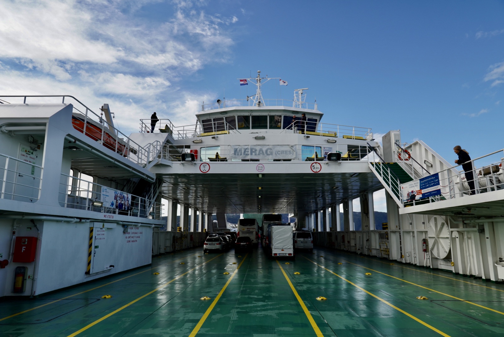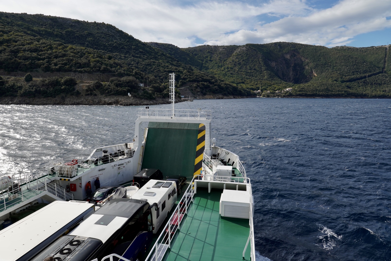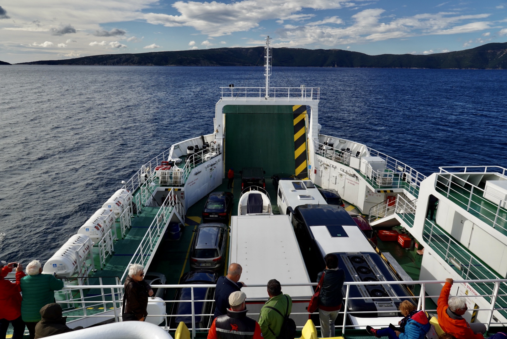 Wir haben sehr unruhig geschlafen, es hat die ganze Nacht wie verrückt gestürmt, und so verlassen wir Punkt 07:00 Uhr unseren Stellplatz und brechen auf. Noch schnell einen Kaffee gekocht - dafür muss Zeit bleiben. Heute haben wir Termine, also los. Das Navi sagt drei Stunden für 210km. Um 10:45 geht die Fähre von Valbiska auf der Insel Krk nach Merdag auf der Insel Cres. Wir fahren die wunderschöne Küstenstrasse N°8 nach Norden und geniessen tolle Blicke auf die Inseln Pag und Krk. Es stürmt noch immer wie verrückt, dass es teilweise schwer ist die Kiste auf dem Asphalt zu halten. Pünktlich um 10:25 Uhr kommen wir am kleinen Fährhafen in Valbiska an. Fix bezahlen wir 245kn (38,-€) und rauf auf den Kutter. Kutter ist gemein, es ist schon ein grösseres Fährschiff. Wir erreichen nach circa 25 Minuten und recht ruhiger See den Fährhafen Merdag. Noch 10km und wir sind auf dem Campingplatz „Camping Kovacine“. Wir suchen uns einen schönen Stellplatz raus, das ist leicht, da der Platz nur noch zu ⅓ belegt ist. Gelb/17 ist unser Favorit, nicht weit zum Strand, falls das Wetter wieder „Badetemperaturen“ annimmt, und in Toiletten/Sanitärnähe. Die Sonne scheint noch so leidlich. Wir schmeissen erstmal eine Spaghetti ins Wasser und 15 Minuten später gibt es „A Rabiata“. Die Sonne ist inzwischen hinter Schleierwolken - wir holen die Kuscheldecken und die Bücher raus und dösen in den Nachmittag. Katja holt Schlaf nach. 16:00 Uhr kochen wir uns ein wärmendes Käffchen. Wir schlendern am Strand rum und laufen nach Cres in die Stadt. Wir kommen nicht an einer Pizzeria am Hafen vorbei, also gibt es heute Abend Pizza mit Oziusko (kroatisches Bier). Fix zurück ins geheizte WoMo, es sind herbstliche 11°C draussen. Wir machen es uns mit Tee und Rakija gemütlich.