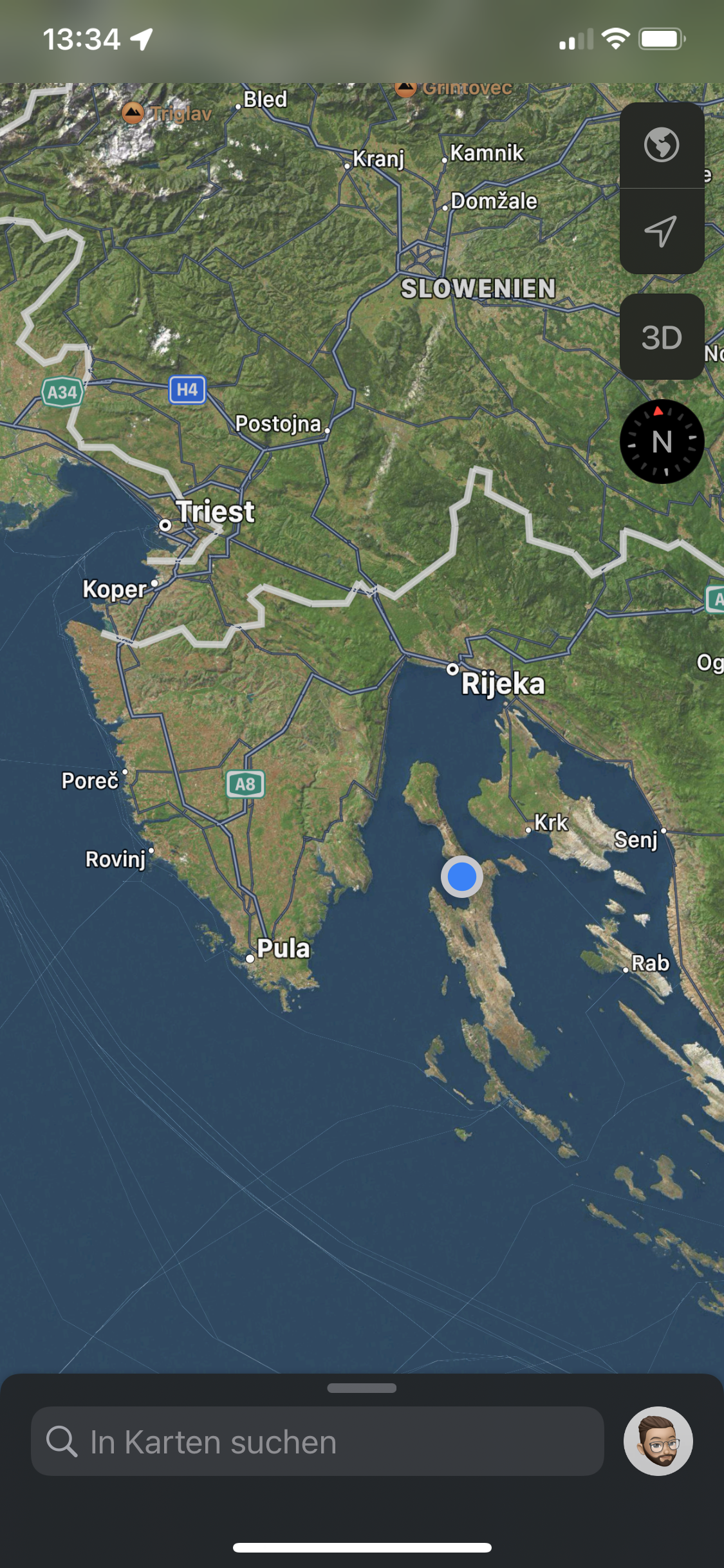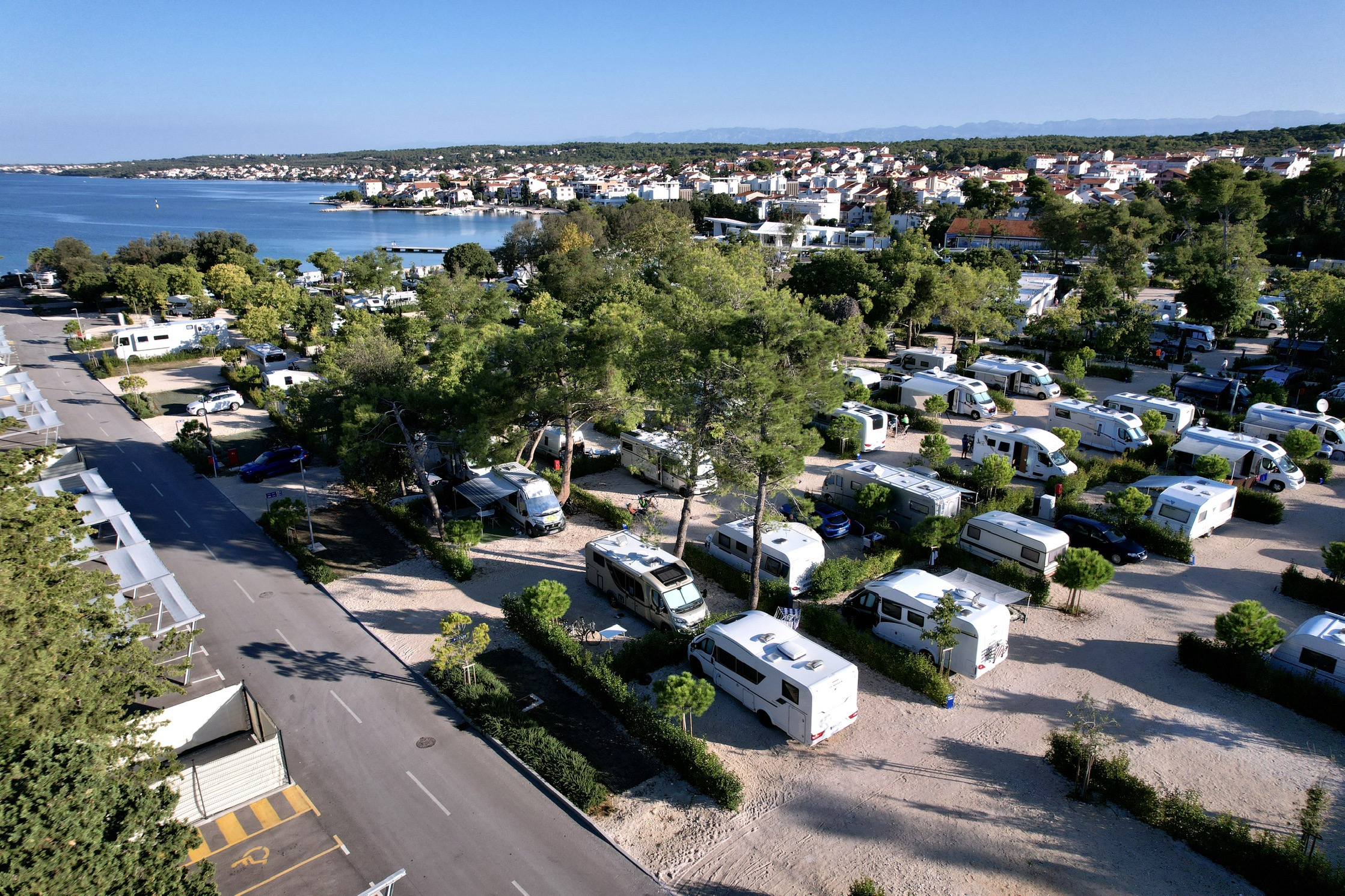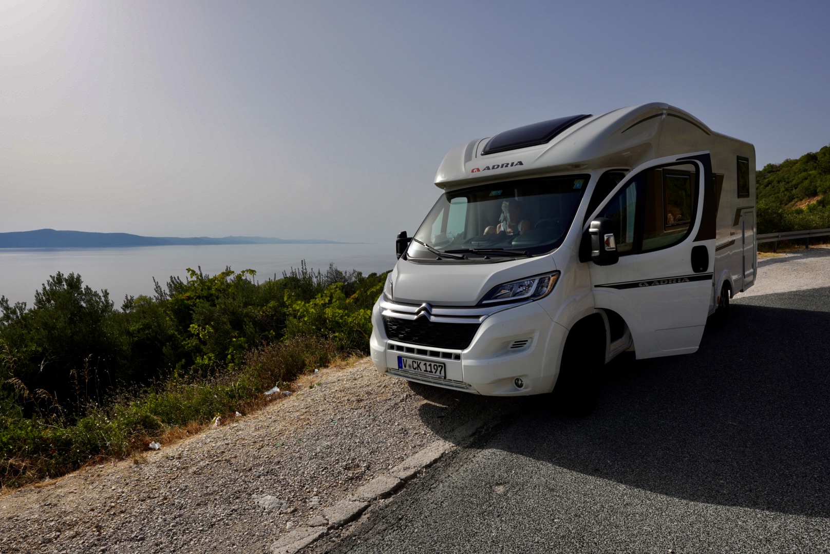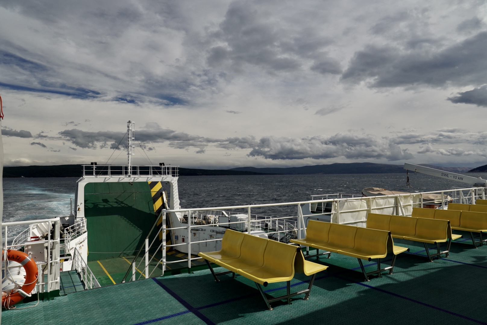 Wir haben sehr unruhig geschlafen, es hat die ganze Nacht wie verrückt gestürmt, und so verlassen wir Punkt 07:00 Uhr unseren Stellplatz und brechen auf. Noch schnell einen Kaffee gekocht - dafür muss Zeit bleiben. Heute haben wir Termine, also los. Das Navi sagt drei Stunden für 210km. Um 10:45 geht die Fähre von Valbiska auf der Insel Krk nach Merdag auf der Insel Cres. Wir fahren die wunderschöne Küstenstrasse N°8 nach Norden und geniessen tolle Blicke auf die Inseln Pag und Krk. Es stürmt noch immer wie verrückt, dass es teilweise schwer ist die Kiste auf dem Asphalt zu halten. Pünktlich um 10:25 Uhr kommen wir am kleinen Fährhafen in Valbiska an. Fix bezahlen wir 245kn (38,-€) und rauf auf den Kutter. Kutter ist gemein, es ist schon ein grösseres Fährschiff. Wir erreichen nach circa 25 Minuten und recht ruhiger See den Fährhafen Merdag. Noch 10km und wir sind auf dem Campingplatz „Camping Kovacine“. Wir suchen uns einen schönen Stellplatz raus, das ist leicht, da der Platz nur noch zu ⅓ belegt ist. Gelb/17 ist unser Favorit, nicht weit zum Strand, falls das Wetter wieder „Badetemperaturen“ annimmt, und in Toiletten/Sanitärnähe. Die Sonne scheint noch so leidlich. Wir schmeissen erstmal eine Spaghetti ins Wasser und 15 Minuten später gibt es „A Rabiata“. Die Sonne ist inzwischen hinter Schleierwolken - wir holen die Kuscheldecken und die Bücher raus und dösen in den Nachmittag. Katja holt Schlaf nach. 16:00 Uhr kochen wir uns ein wärmendes Käffchen. Wir schlendern am Strand rum und laufen nach Cres in die Stadt. Wir kommen nicht an einer Pizzeria am Hafen vorbei, also gibt es heute Abend Pizza mit Oziusko (kroatisches Bier). Fix zurück ins geheizte WoMo, es sind herbstliche 11°C draussen. Wir machen es uns mit Tee und Rakija gemütlich.
