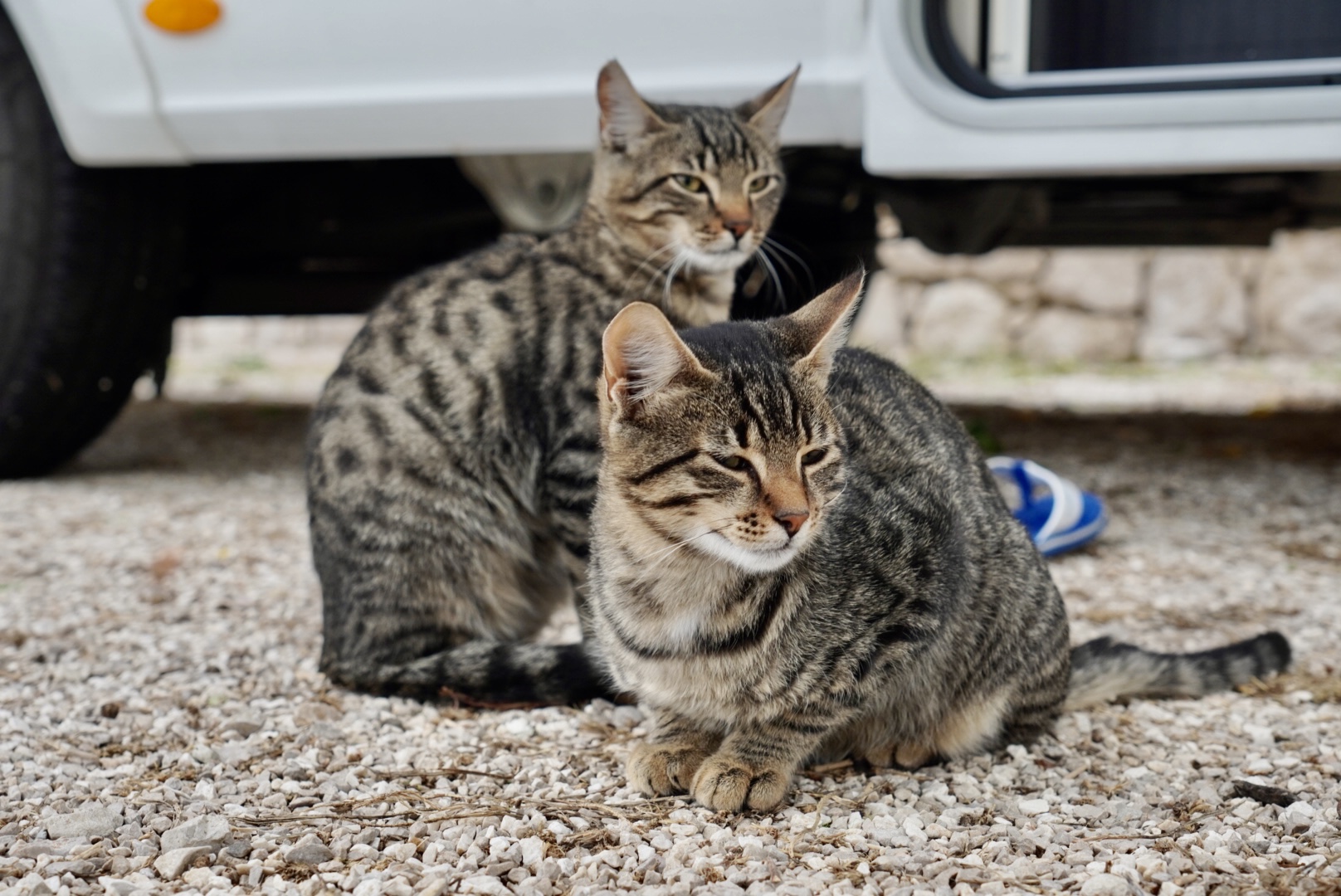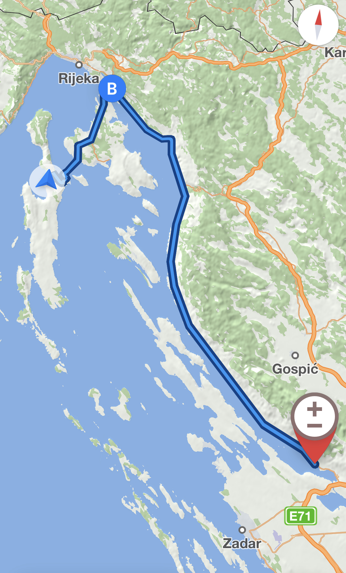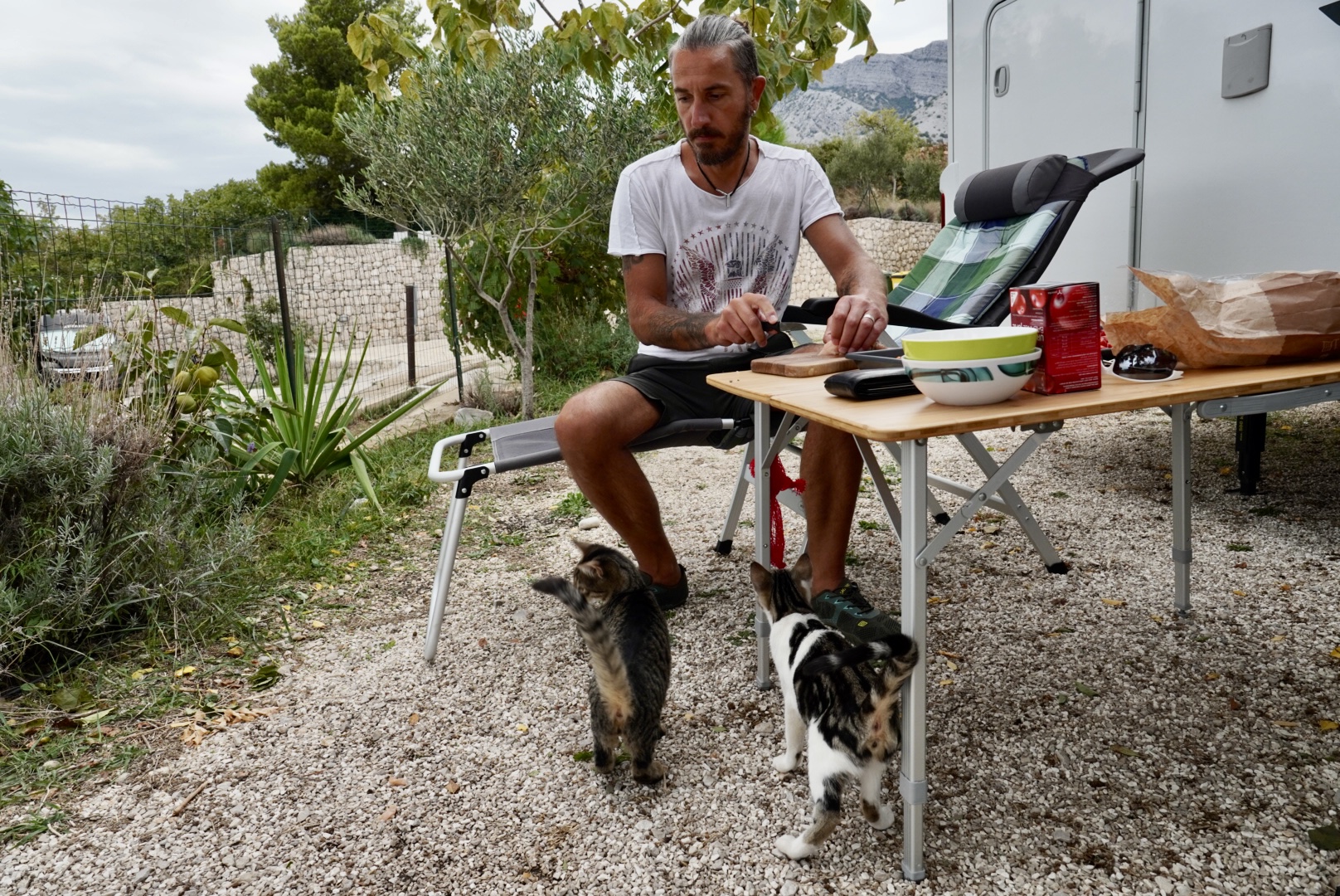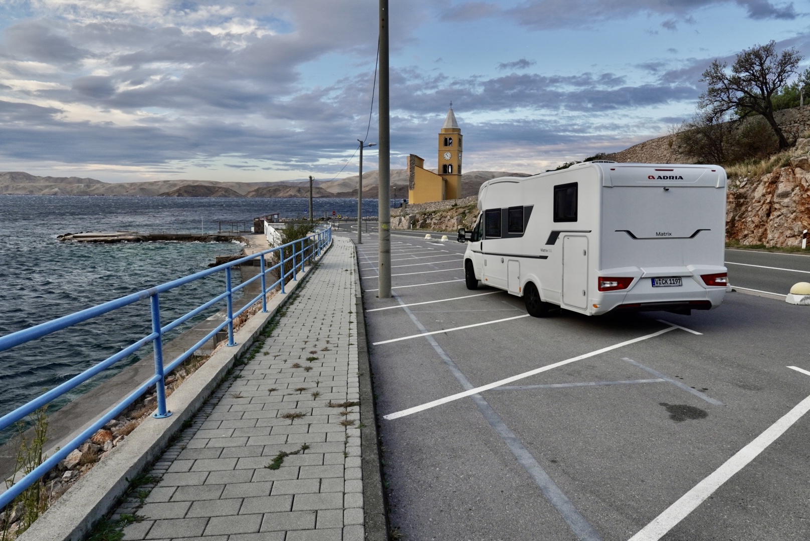 Das Wetter ist heute weiterhin kalt und regnerisch. Wir wollen aber Sonne. Wir wälzen die Wetterberichte und beschliessen abzureisen. Wir füttern nochmal die drei Kätzchen, die schlingen schneller als man das Huhn an der Supermarktkasse zahlen kann. Wir freuen uns, und die dreisten Drei denk ich auch. Ich überlege kurz ob Katja es merkt wenn ich die drei Fellbündel mitschmuggel. Wir verlassen gegen 10:00 Uhr dem Campingplatz und brechen auf, in Richtung der Insel Cres. Wir wissen dass wir die Strecke nicht an einem Tag schaffen und wälzen die Park4Night-App. Wir finden am Abend ein Restaurant mit kostenlosem Stellplatz und essen dort Lamm mit Mangold und Kartoffeln. Wir fahren doch noch ein Stündchen und stranden an einem verlassenem Hafen kurz hinter Zadar. Es stürmt inzwischen derartig dass wir Angst haben das uns das WoMo über Nacht umkippt. 9 km weiter stürmt es immernoch, aber wir finden Zuflucht im Windschatten einer kleinen Bude auf dem kostenlosen Stellplatz kurz vor Starigrad.