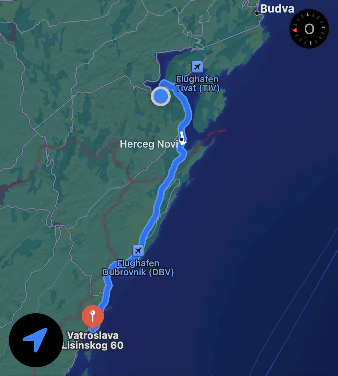 Wir sind zeitig wach und stellen fest, dass heute nicht das super mega Wetter ist. Leicht bewölkt, aber schon am Morgen ca 25°C - super zum fahren. Wir frühstücken eine handvoll Mandarienen und Kaffee. Noch fix bezahlen wir die 214,05 KN (29,-€) für die Nacht, entsorgen ordentlich unseren Müll und los geht es nach Montenegro. Die Bucht von Kotor wartet. Wir haben uns einen Stellplatz am Wasser ausgesucht und sind gespannt.