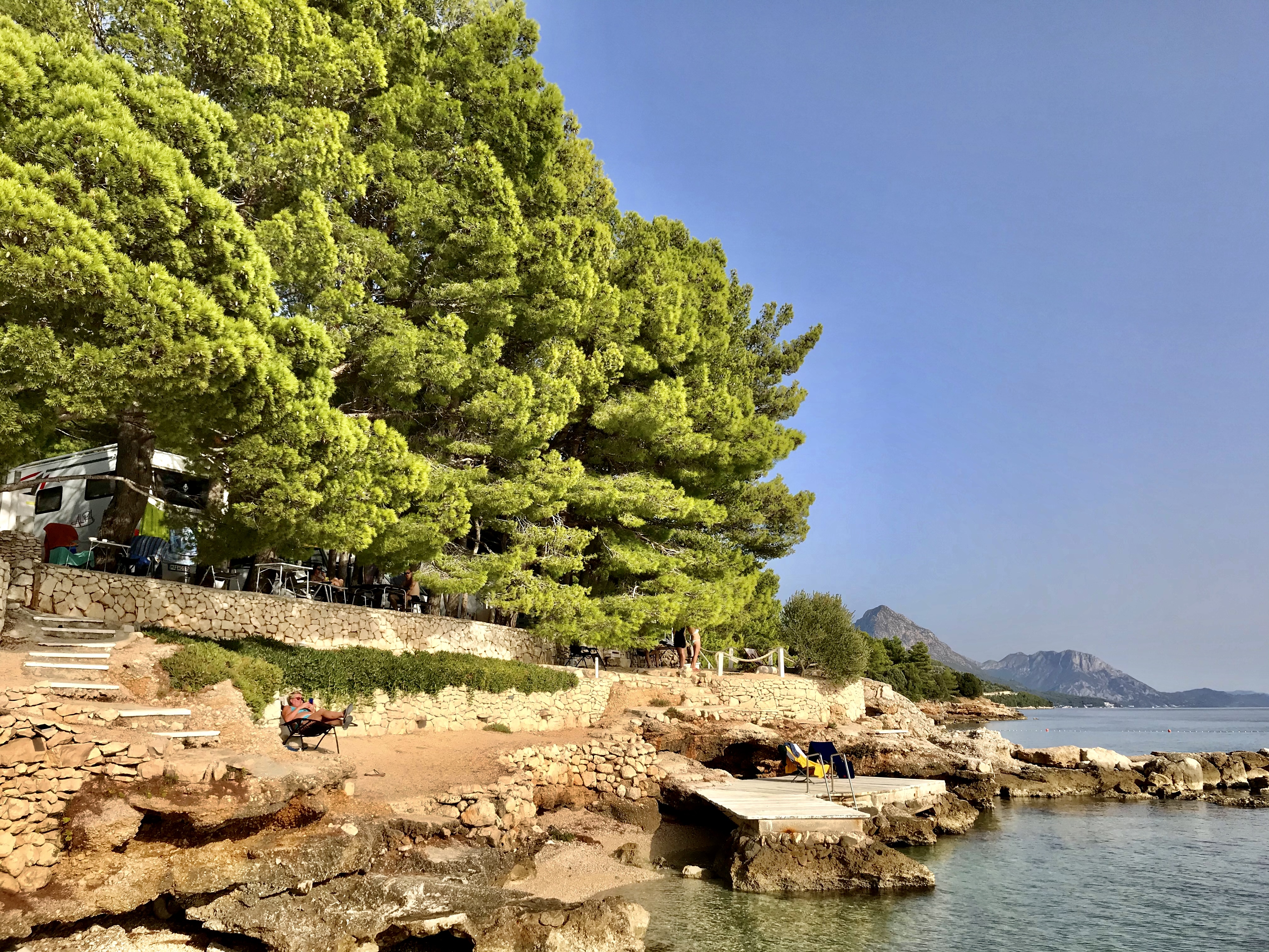 Wir essen unterwegs in einer Konoba und erliegen dem Charme der kleinen Autocamps in Drvenik. Wir bleiben im Camp Male Čiste. Sehr kleiner Platz den wir in der Park4Night-App gefunden haben. Hier sind wir knapp neben der Strasse aber man bemerkt die nahe D8 überhaupt nicht. Ganz familiär und supergemütlich. Wir haben direkten Meerblick und nutzen das auch direkt aus. Kaum geparkt springen wir erstmal in die frischen Fluten. Wir geniessen ein kühles Karlovačko und den Blick auf die Insel Hvar. Für heute haben wir keine Lust mehr weiter zu fahren…müssen wir ja nicht. 😊 Morgen geht es weiter nach Dubrovnik, wir sind ganz gespannt auf den Drehort von „Game of Thrones“ - hier wurden die Szenen in „Königsmund“ gedreht. 🥰 Wir sind ja Fans von „GOT“ und wenn man da schon mal in der Gegend ist, dann muss man schon mal schauen.