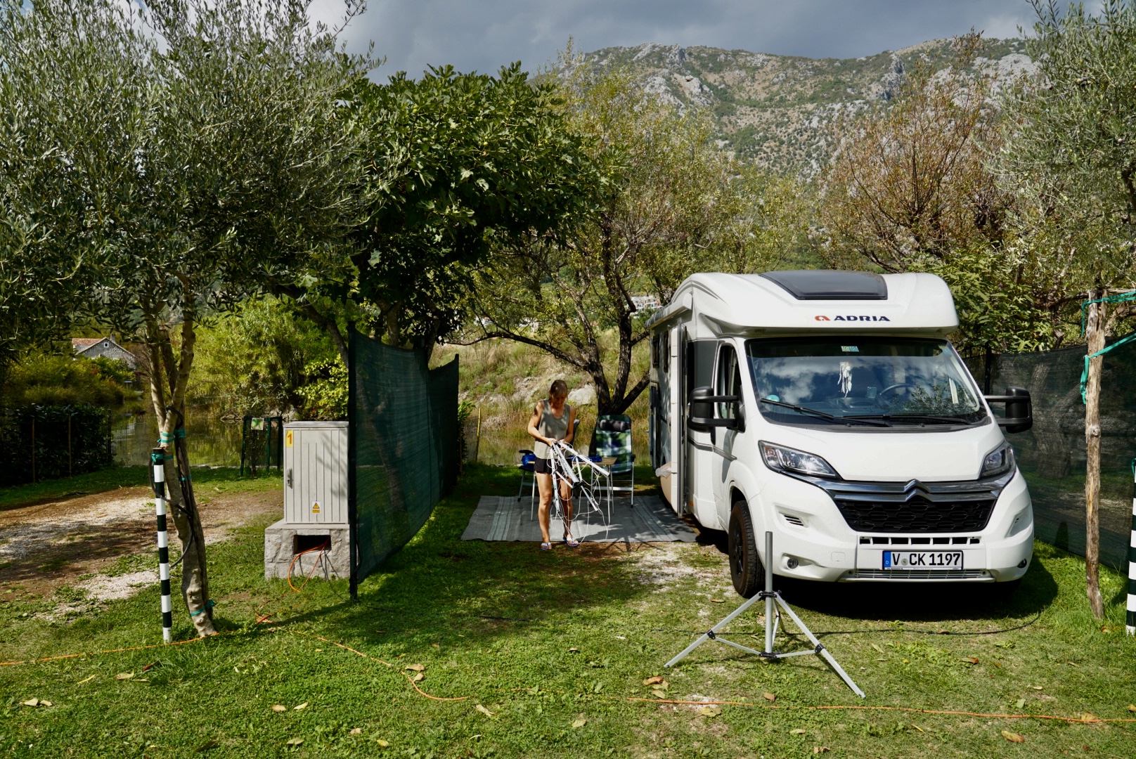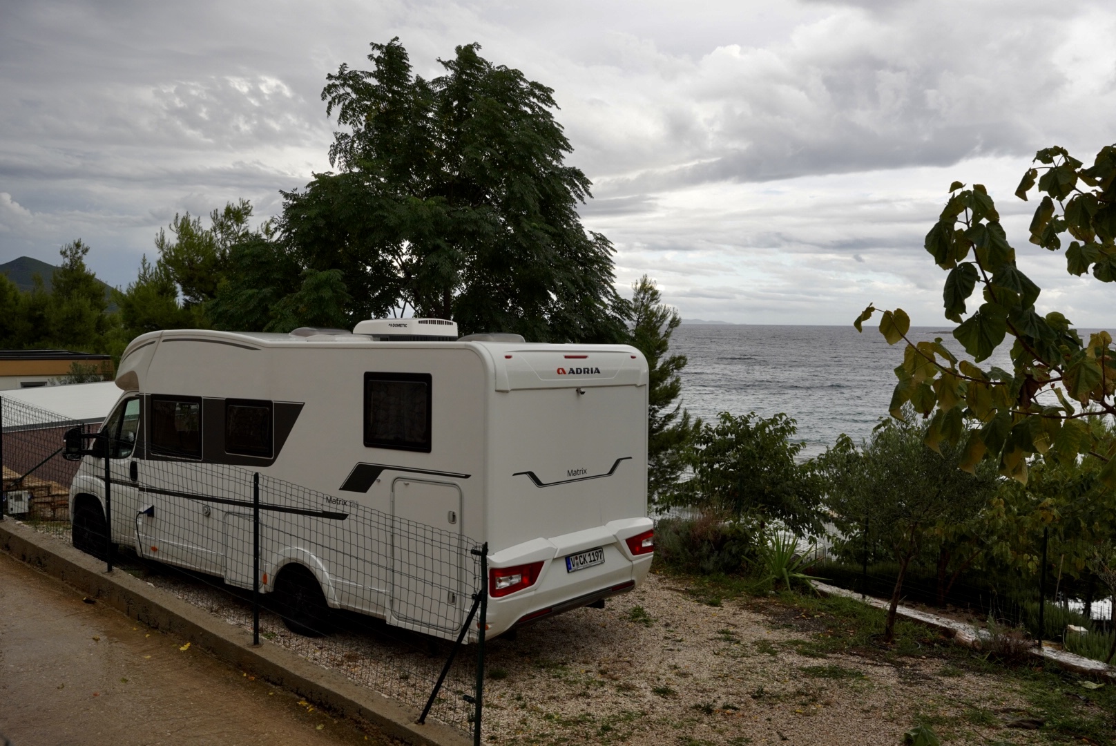 Guten Morgen Regen. Und es ist nicht weniger geworden. Wir brechen nach einem Kaffee auf und verlassen den Garten an Floyd‘s Food Factory. Zwei Hunde haben bei dem Mistwetter unter unserem Camper übernachtet und sind von unserer Abreise etwas enttäuscht. Unser heutiges Tagesziel heisst SONNE. Wir fahren in Richtung Nikšić und biegen dort auf die M-6 und kurz vor Vilusi geht es links auf die R-11. Bei Donji Morinj stossen wir auf die M-2 an der Bucht von Kotor. Der Stellplatz hier, vom 30.09. das Autocamp Naluka, ist inzwischen leer und das Schild „Sorry- we are closed“ weißt auf die bevorstehende Winterruhe hin. Es geht weiter in Richtung Herzeg Novi und kurz vor der Grenze in Igalo werden Lebensmittel nachgefüllt. Wir passieren problemlos die Grenze von Montenegro nach Kroatien. Es regnet. Inzwischen ändern wir das Ziel von Sonne auf den Ort Orebić auf der kroatischen Halbinsel Pelješac. Pelješac ist quasi komplett Wein und Olivenanbaugebiet - wir sind also schonmal richtig. Pläne für Radtouren werden geschmiedet. Wir statten kurz der verregneten Stadt Ston einen Besuch ab und verleihen dem Regenschirm seine Daseinsberechtigung. Es giesst wie aus Eimern. Also weiter zum Campingplatz „Camp Lavanda“. Der Platz ist steil und wir wollen erst einen Platz am Meer, weiter oben sieht man aber besser - also dann in der goldenen Mitte.