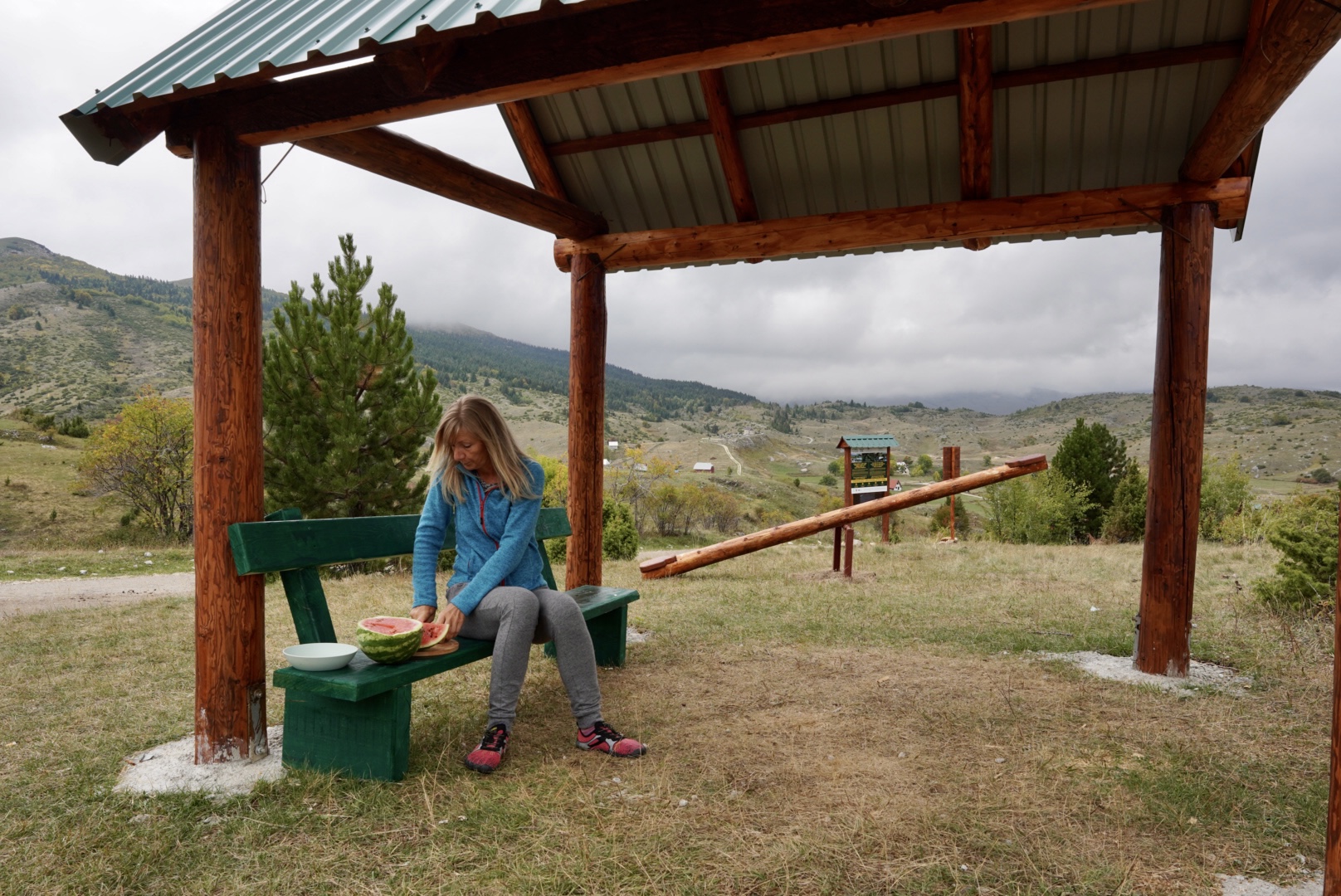 Weiter geht es über Podgorica, Danilovgrad, Nikšić in Richtung Dormitorgebirge. Hinter Jasenovo Polje verlassen wir die M-18 in Richtung Šavnik bis nach Zabljak. Wir wollen auf den Stellplatz „Camp Kod Boce“. Unterwegs finden wir am Straßenrand eine hübsche Gaststätte, Lamm haben sie leider nicht, ist alle, aber dafür ein gebirgsgewaltiges Dormitorsteak für 9€, Essen gehen ist hier für unsere Verhältnisse günstig. Katja muss dauernd auf die Hütte, Blasenentzündung. das baden im kalten Bergbach gestern ist ihr auf die Blase geschlagen. In Zabljak suchen wir ne Apotheke und werden fündig. Kräuter werden verschrieben und das Internet hält gute Tipps bereit: Rotwein kochen mit Honig und Pillen von Hildegard von Bingen (das hilft und wird morgen besser sein). Ankunft im Camp Kod Boce gegen 16:00 Uhr. Wir sind wohl die einzigsten hier, die auf diese Idee kommen, also stehen wir heute volle quer über den Platz ganz alleine. Essen fällt wegen des doch mächtigen Dormitorsteaks aus.